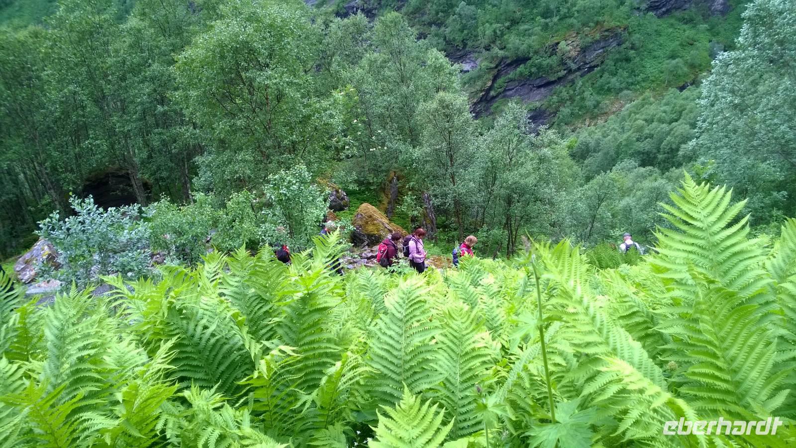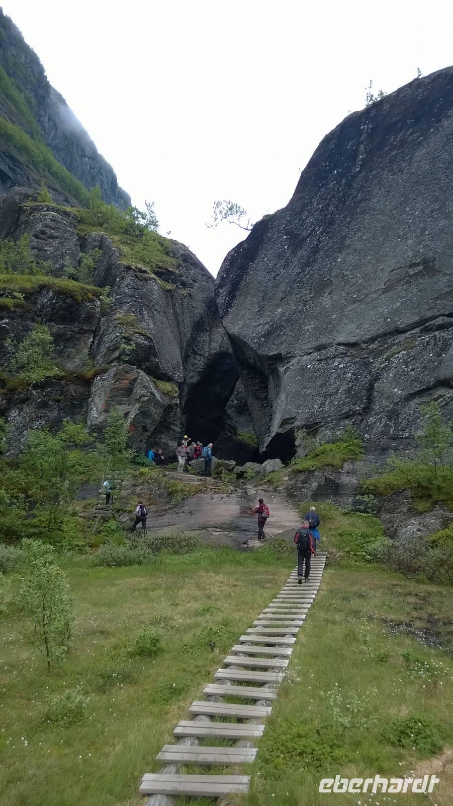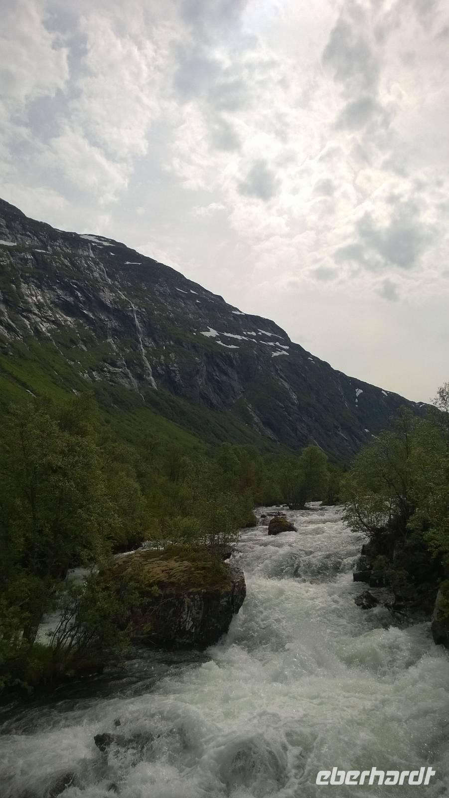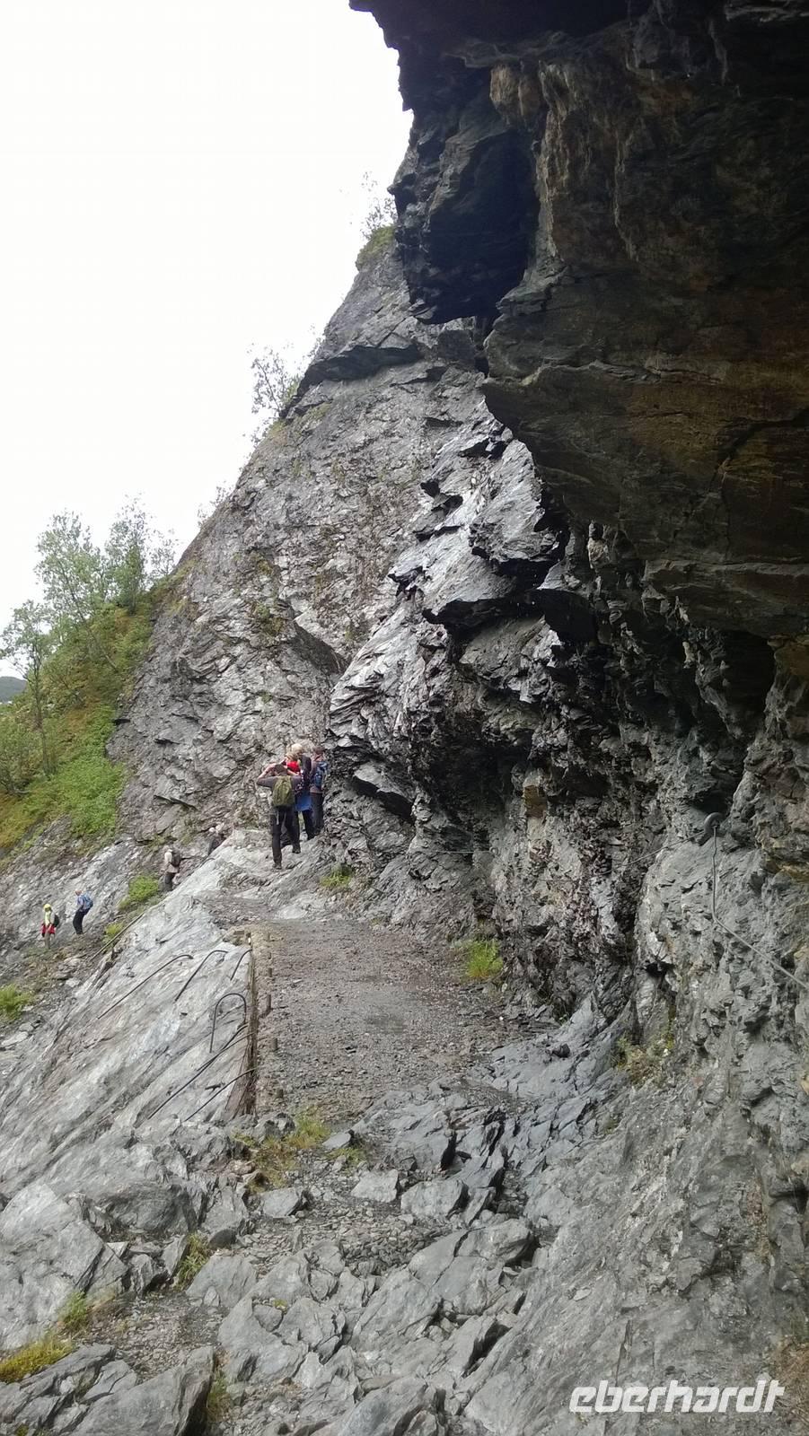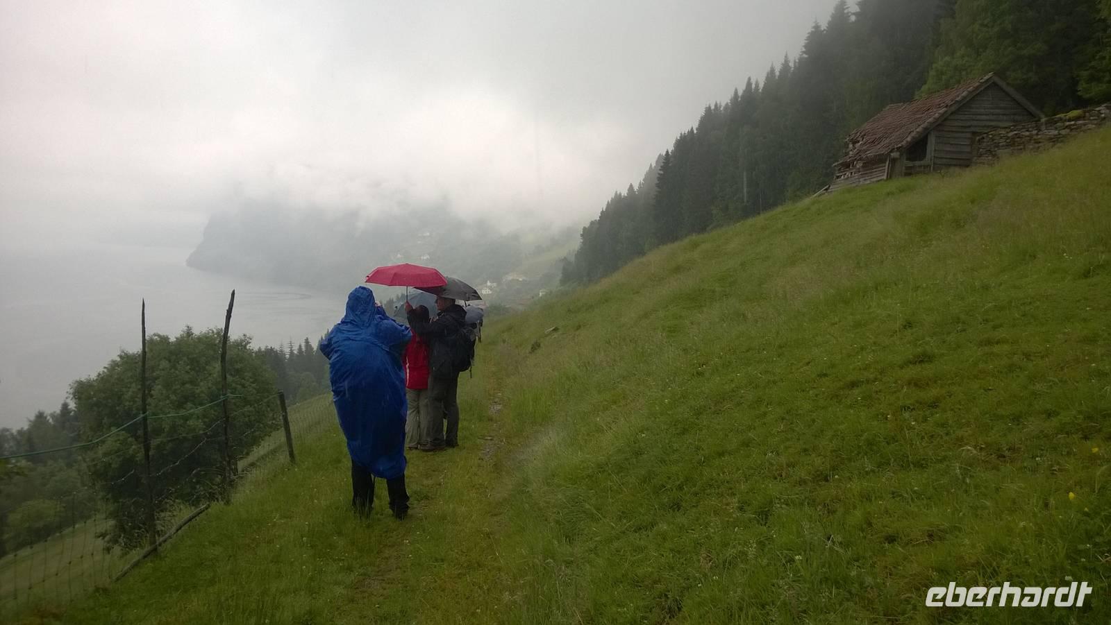Zunächst wandern wir in atemberaumbend schöner Berglandschaft auf halber Höhe zwischen Fluss und Bergkuppen. Theoretisch müssen wir immer nur bergab gehen, schließlich sollen wir heute von 900 m.o.h. auf quasi Meereshöhe kommen. Doch soviel wir auch hinuntersteigen, gleich um die Ecke findet sich immer wieder eine Anhöhe, die wir bergauf wandern. Hoch und runter, runter und hoch, an steilen Felswänden entlang, über Wasserströme, auf eine Bergkuppe und durch den Wald. Abstecher machen wir zu einer Hängebrücke, wo man seinen Mut für ein Foto mal beweisen kann und zu einer imposanten Höhle. Doch weiter geht's, die 19km ziehen sich hin. Es sind viele kleine Überraschungen, die uns auf diesem Wanderweg herausfordern. Die größte Herausforderung ist sicherlich der Wasserfall, der noch so viel Schmelzwasser führt, dass wir nicht mit trockener Haut daran vorbei kommen. Regensachen an, Zähne zusammen beißen und zügig durchwaten heißt es dort. Ob unsere Outdoor-Kleidung auch für Wasserfälle präpariert ist? Der Bürgermeister von Aurland begleitet uns für die letzten 2 Stunden und hat sicherheitshalber auch gleich ein neues Seil zum Entlanghangeln gespannt.