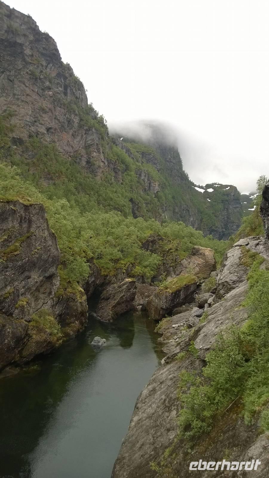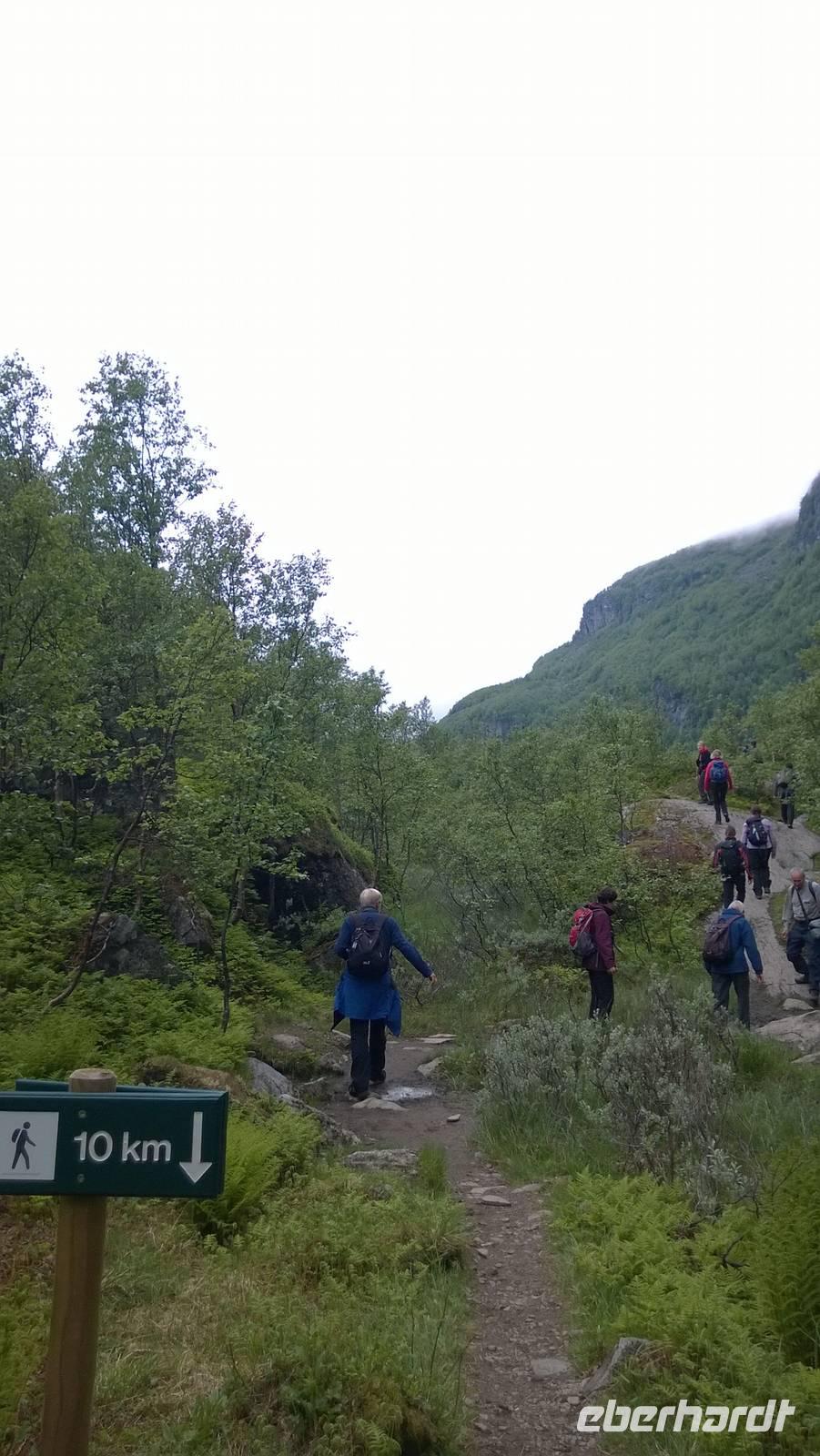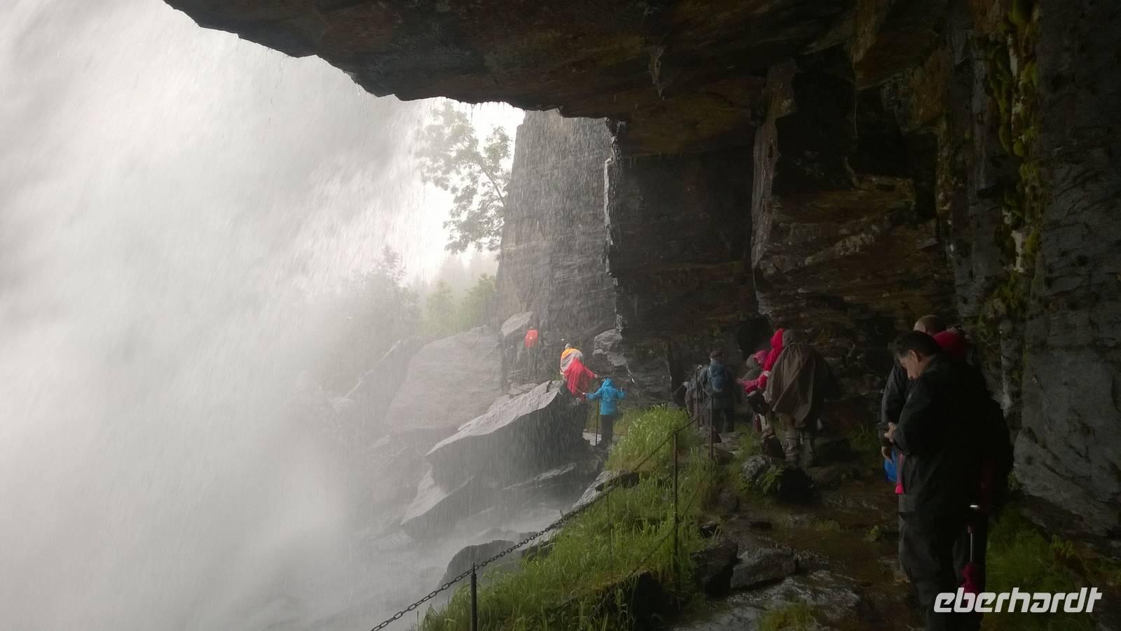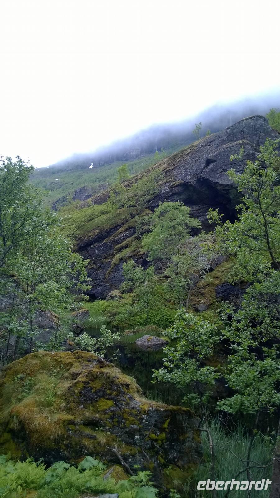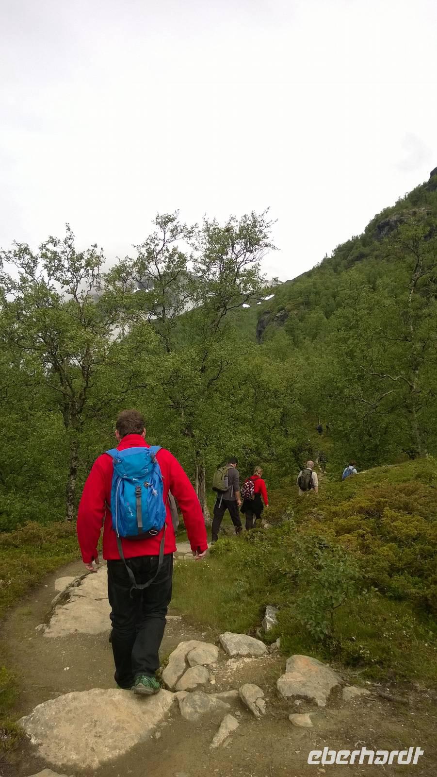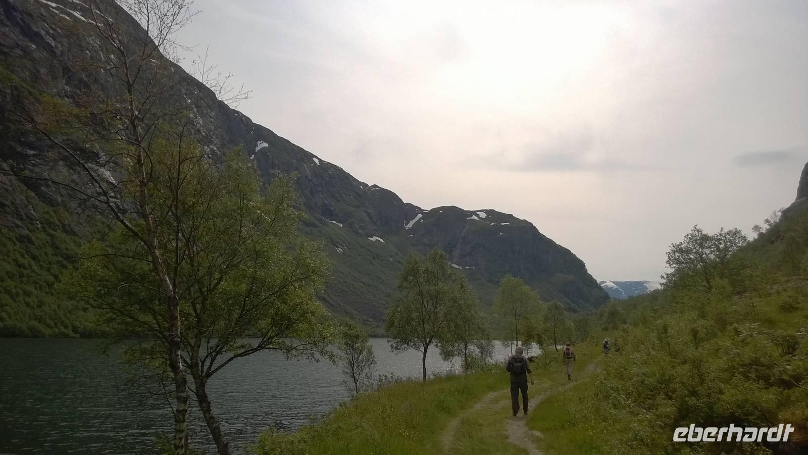 Zunächst wandern wir in atemberaumbend schöner Berglandschaft auf halber Höhe zwischen Fluss und Bergkuppen. Theoretisch müssen wir immer nur bergab gehen, schließlich sollen wir heute von 900 m.o.h. auf quasi Meereshöhe kommen. Doch soviel wir auch hinuntersteigen, gleich um die Ecke findet sich immer wieder eine Anhöhe, die wir bergauf wandern. Hoch und runter, runter und hoch, an steilen Felswänden entlang, über Wasserströme, auf eine Bergkuppe und durch den Wald. Abstecher machen wir zu einer Hängebrücke, wo man seinen Mut für ein Foto mal beweisen kann und zu einer imposanten Höhle. Doch weiter geht's, die 19km ziehen sich hin. Es sind viele kleine Überraschungen, die uns auf diesem Wanderweg herausfordern. Die größte Herausforderung ist sicherlich der Wasserfall, der noch so viel Schmelzwasser führt, dass wir nicht mit trockener Haut daran vorbei kommen. Regensachen an, Zähne zusammen beißen und zügig durchwaten heißt es dort. Ob unsere Outdoor-Kleidung auch für Wasserfälle präpariert ist? Der Bürgermeister von Aurland begleitet uns für die letzten 2 Stunden und hat sicherheitshalber auch gleich ein neues Seil zum Entlanghangeln gespannt.
