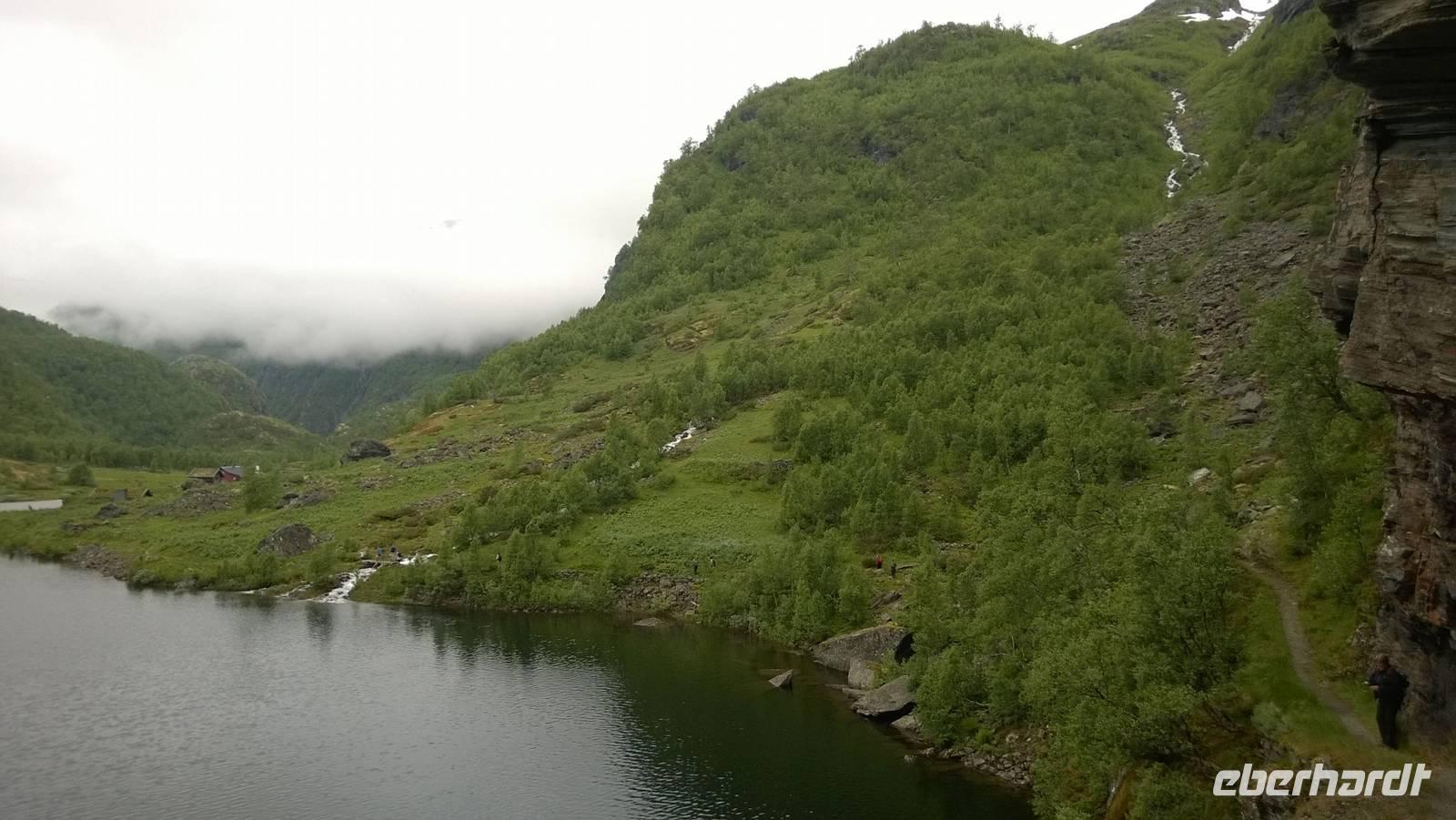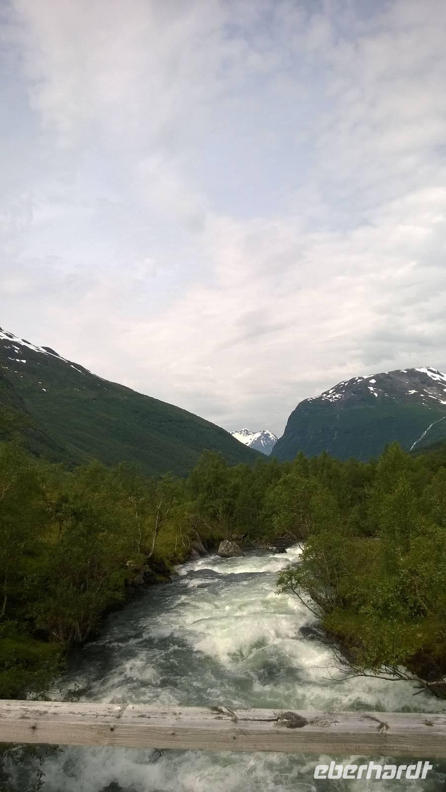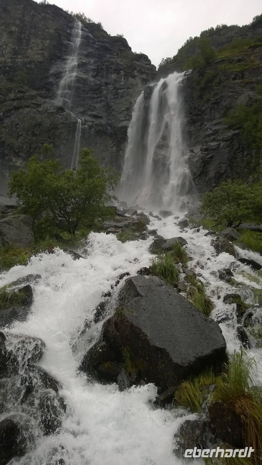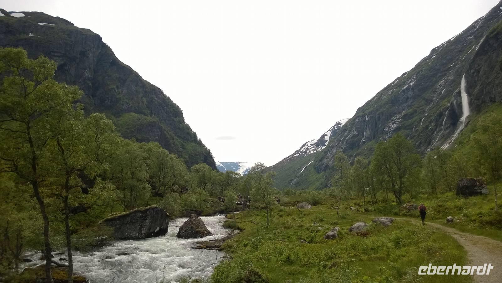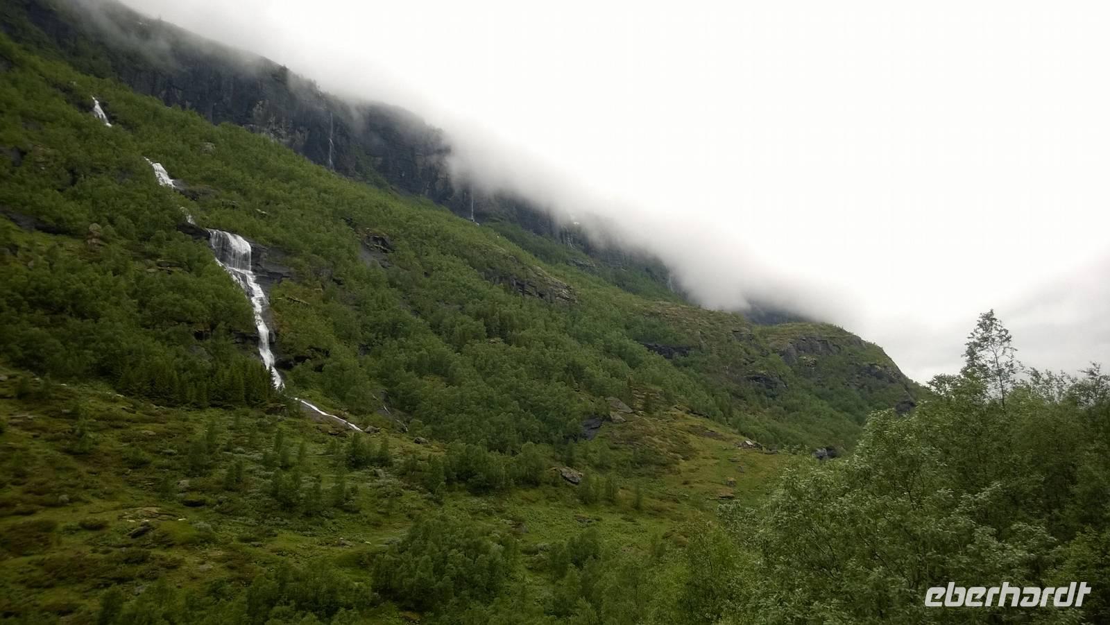 Zunächst wandern wir in atemberaumbend schöner Berglandschaft auf halber Höhe zwischen Fluss und Bergkuppen. Theoretisch müssen wir immer nur bergab gehen, schließlich sollen wir heute von 900 m.o.h. auf quasi Meereshöhe kommen. Doch soviel wir auch hinuntersteigen, gleich um die Ecke findet sich immer wieder eine Anhöhe, die wir bergauf wandern. Hoch und runter, runter und hoch, an steilen Felswänden entlang, über Wasserströme, auf eine Bergkuppe und durch den Wald. Abstecher machen wir zu einer Hängebrücke, wo man seinen Mut für ein Foto mal beweisen kann und zu einer imposanten Höhle. Doch weiter geht's, die 19km ziehen sich hin. Es sind viele kleine Überraschungen, die uns auf diesem Wanderweg herausfordern. Die größte Herausforderung ist sicherlich der Wasserfall, der noch so viel Schmelzwasser führt, dass wir nicht mit trockener Haut daran vorbei kommen. Regensachen an, Zähne zusammen beißen und zügig durchwaten heißt es dort. Ob unsere Outdoor-Kleidung auch für Wasserfälle präpariert ist? Der Bürgermeister von Aurland begleitet uns für die letzten 2 Stunden und hat sicherheitshalber auch gleich ein neues Seil zum Entlanghangeln gespannt.