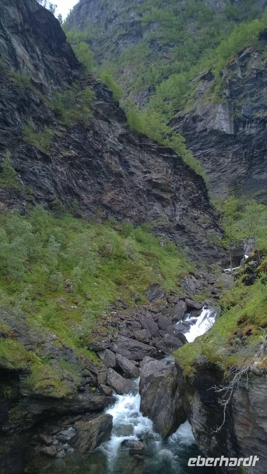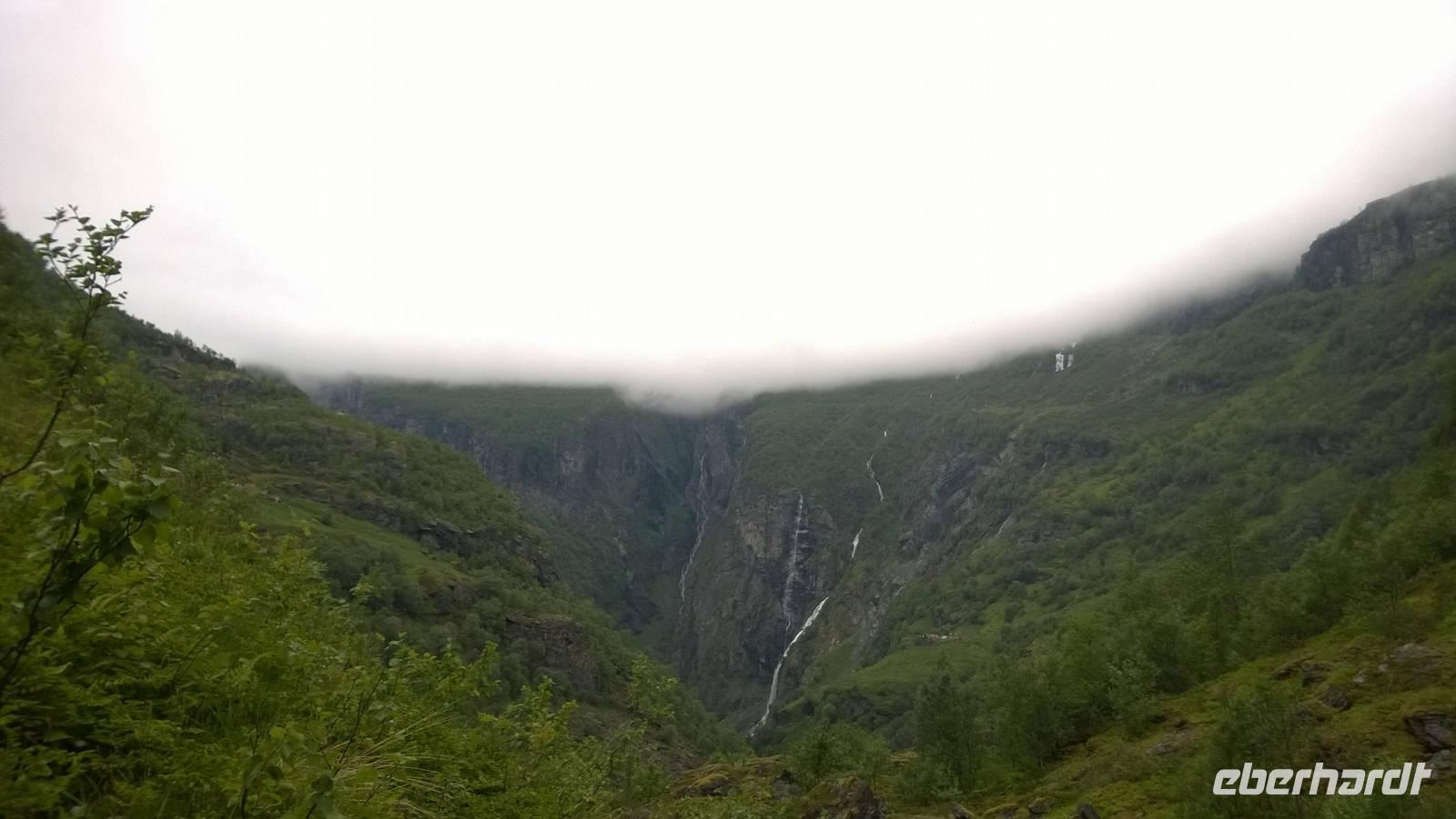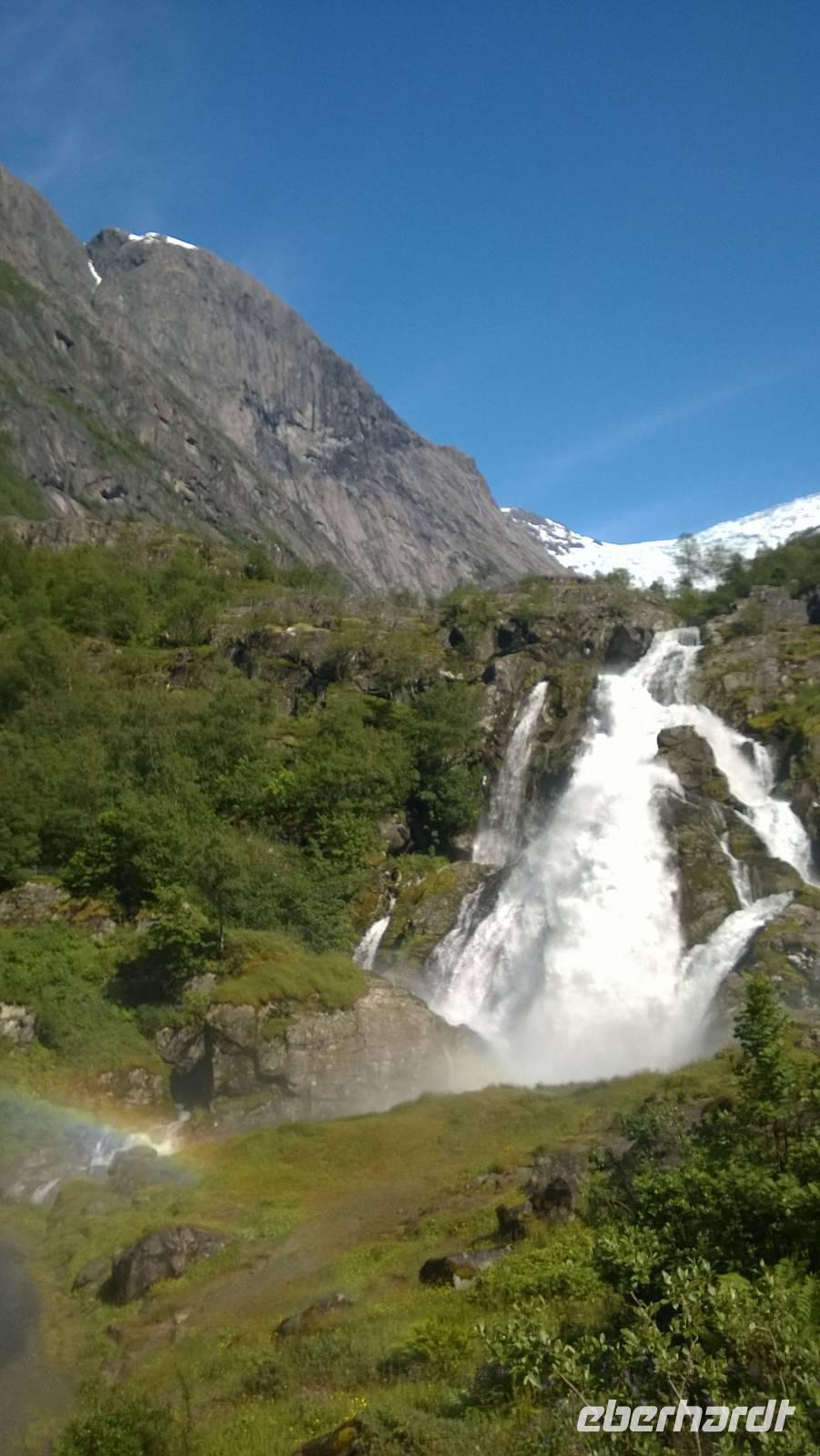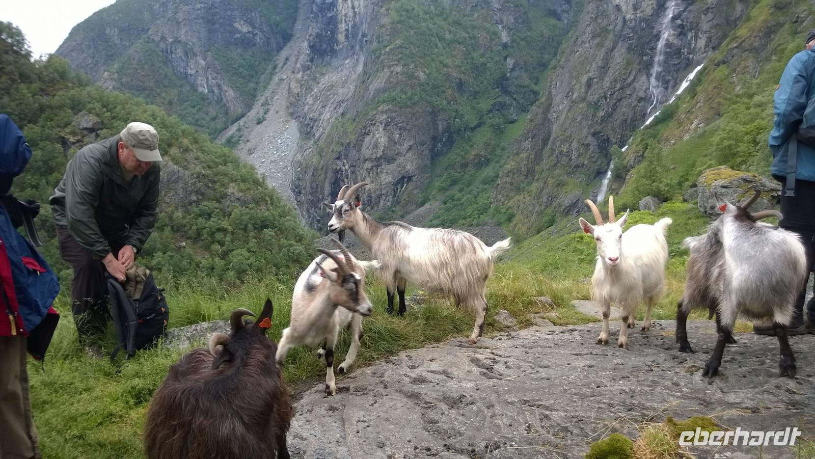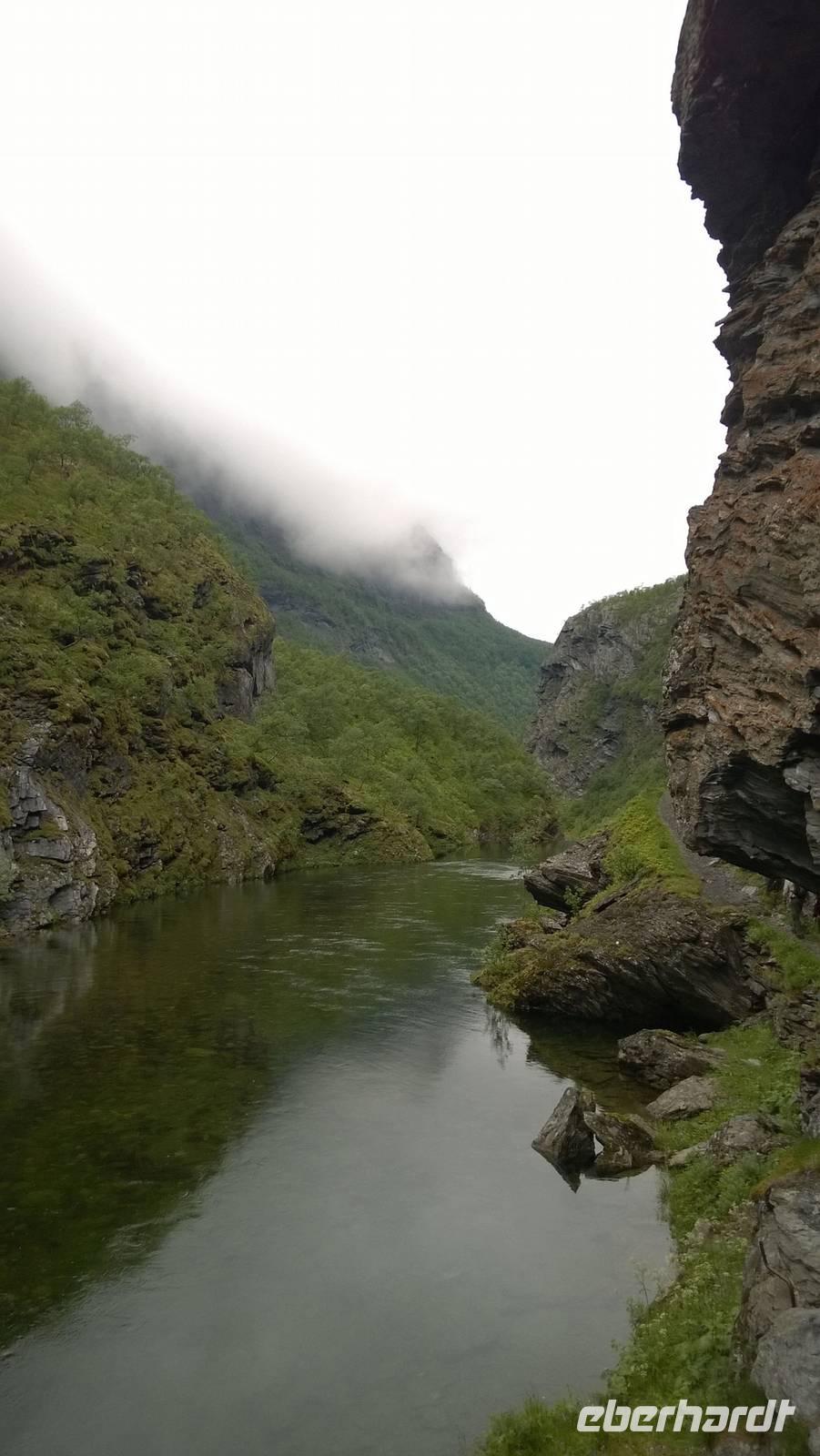Zunächst wandern wir in atemberaumbend schöner Berglandschaft auf halber Höhe zwischen Fluss und Bergkuppen. Theoretisch müssen wir immer nur bergab gehen, schließlich sollen wir heute von 900 m.o.h. auf quasi Meereshöhe kommen. Doch soviel wir auch hinuntersteigen, gleich um die Ecke findet sich immer wieder eine Anhöhe, die wir bergauf wandern. Hoch und runter, runter und hoch, an steilen Felswänden entlang, über Wasserströme, auf eine Bergkuppe und durch den Wald. Abstecher machen wir zu einer Hängebrücke, wo man seinen Mut für ein Foto mal beweisen kann und zu einer imposanten Höhle. Doch weiter geht's, die 19km ziehen sich hin. Es sind viele kleine Überraschungen, die uns auf diesem Wanderweg herausfordern. Die größte Herausforderung ist sicherlich der Wasserfall, der noch so viel Schmelzwasser führt, dass wir nicht mit trockener Haut daran vorbei kommen. Regensachen an, Zähne zusammen beißen und zügig durchwaten heißt es dort. Ob unsere Outdoor-Kleidung auch für Wasserfälle präpariert ist? Der Bürgermeister von Aurland begleitet uns für die letzten 2 Stunden und hat sicherheitshalber auch gleich ein neues Seil zum Entlanghangeln gespannt.