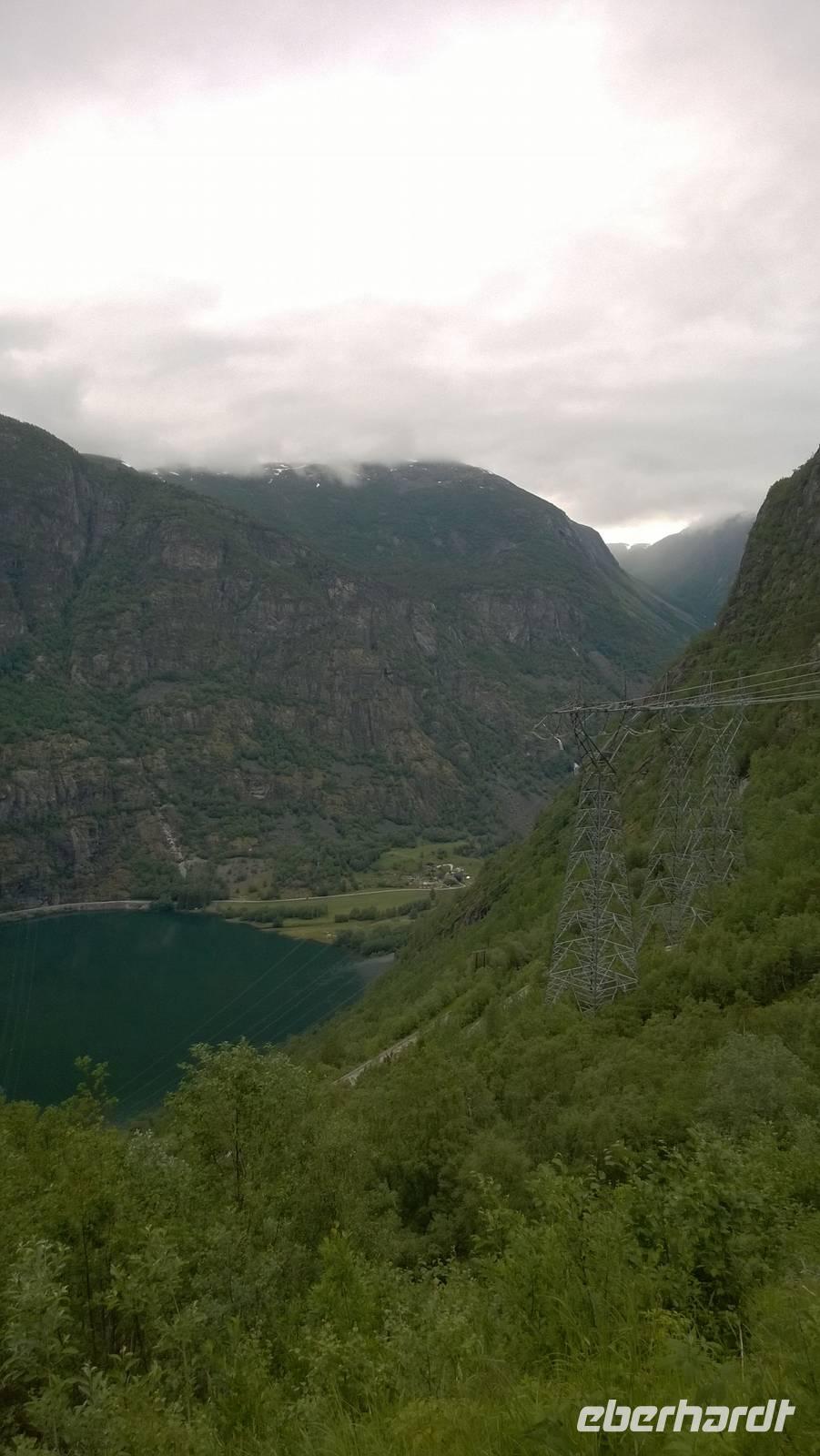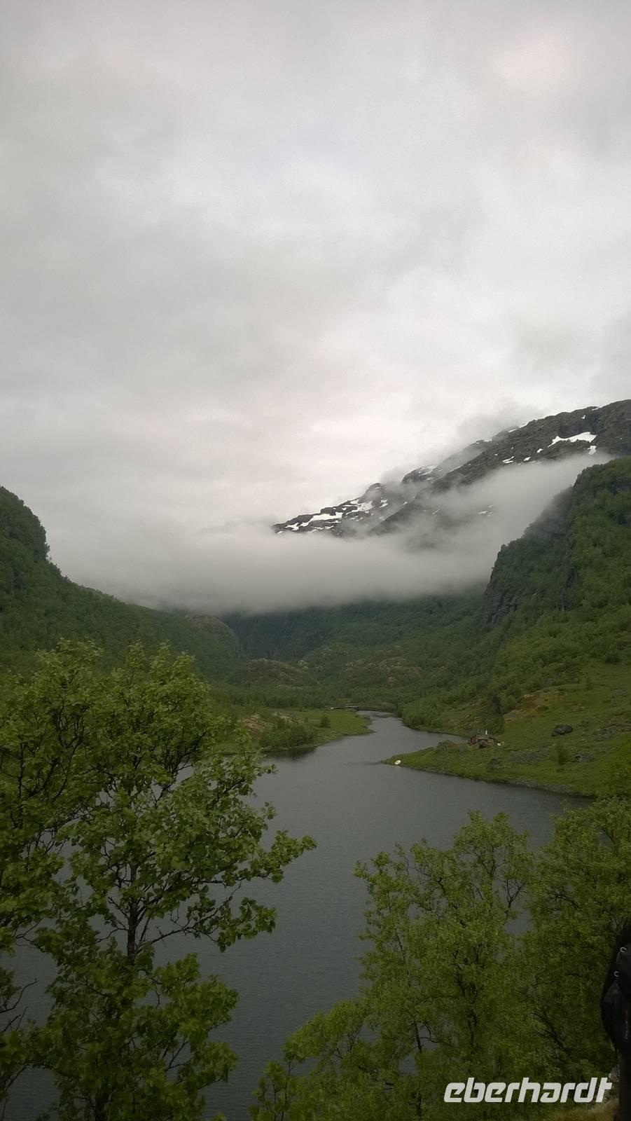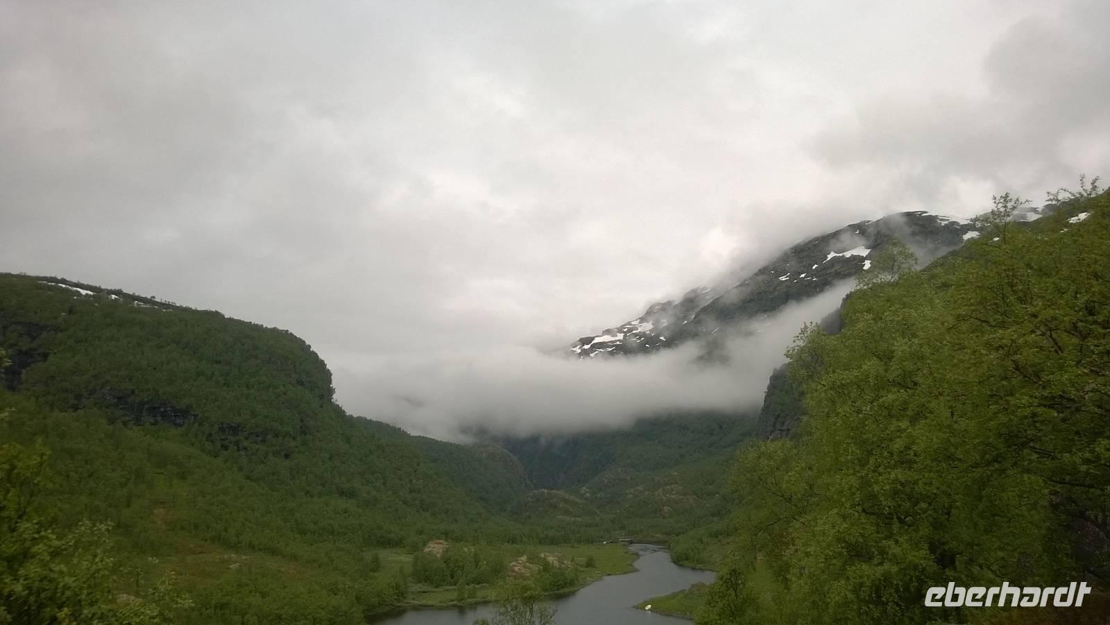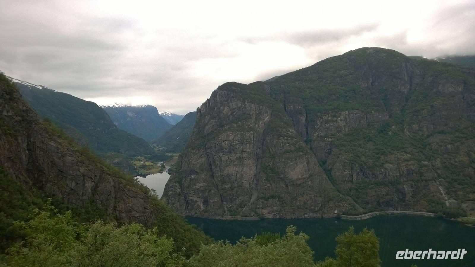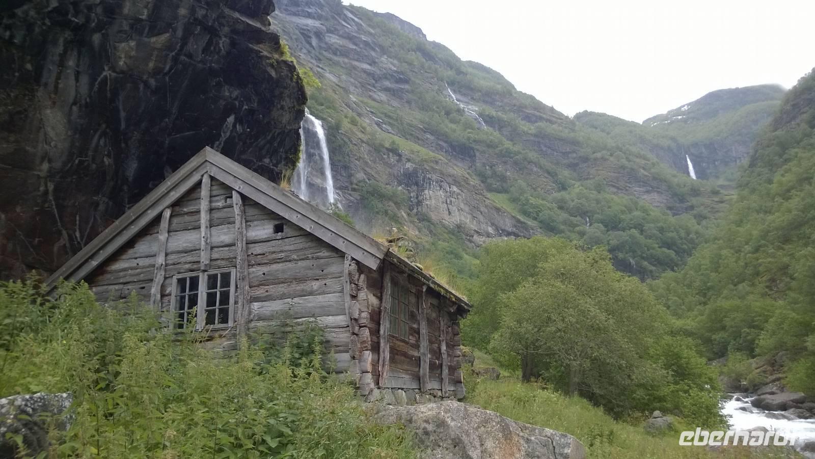 Zunächst wandern wir in atemberaumbend schöner Berglandschaft auf halber Höhe zwischen Fluss und Bergkuppen. Theoretisch müssen wir immer nur bergab gehen, schließlich sollen wir heute von 900 m.o.h. auf quasi Meereshöhe kommen. Doch soviel wir auch hinuntersteigen, gleich um die Ecke findet sich immer wieder eine Anhöhe, die wir bergauf wandern. Hoch und runter, runter und hoch, an steilen Felswänden entlang, über Wasserströme, auf eine Bergkuppe und durch den Wald. Abstecher machen wir zu einer Hängebrücke, wo man seinen Mut für ein Foto mal beweisen kann und zu einer imposanten Höhle. Doch weiter geht's, die 19km ziehen sich hin. Es sind viele kleine Überraschungen, die uns auf diesem Wanderweg herausfordern. Die größte Herausforderung ist sicherlich der Wasserfall, der noch so viel Schmelzwasser führt, dass wir nicht mit trockener Haut daran vorbei kommen. Regensachen an, Zähne zusammen beißen und zügig durchwaten heißt es dort. Ob unsere Outdoor-Kleidung auch für Wasserfälle präpariert ist? Der Bürgermeister von Aurland begleitet uns für die letzten 2 Stunden und hat sicherheitshalber auch gleich ein neues Seil zum Entlanghangeln gespannt.