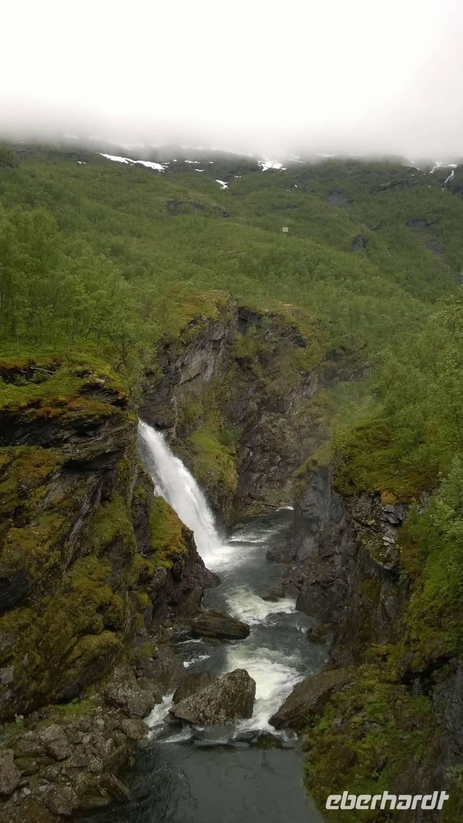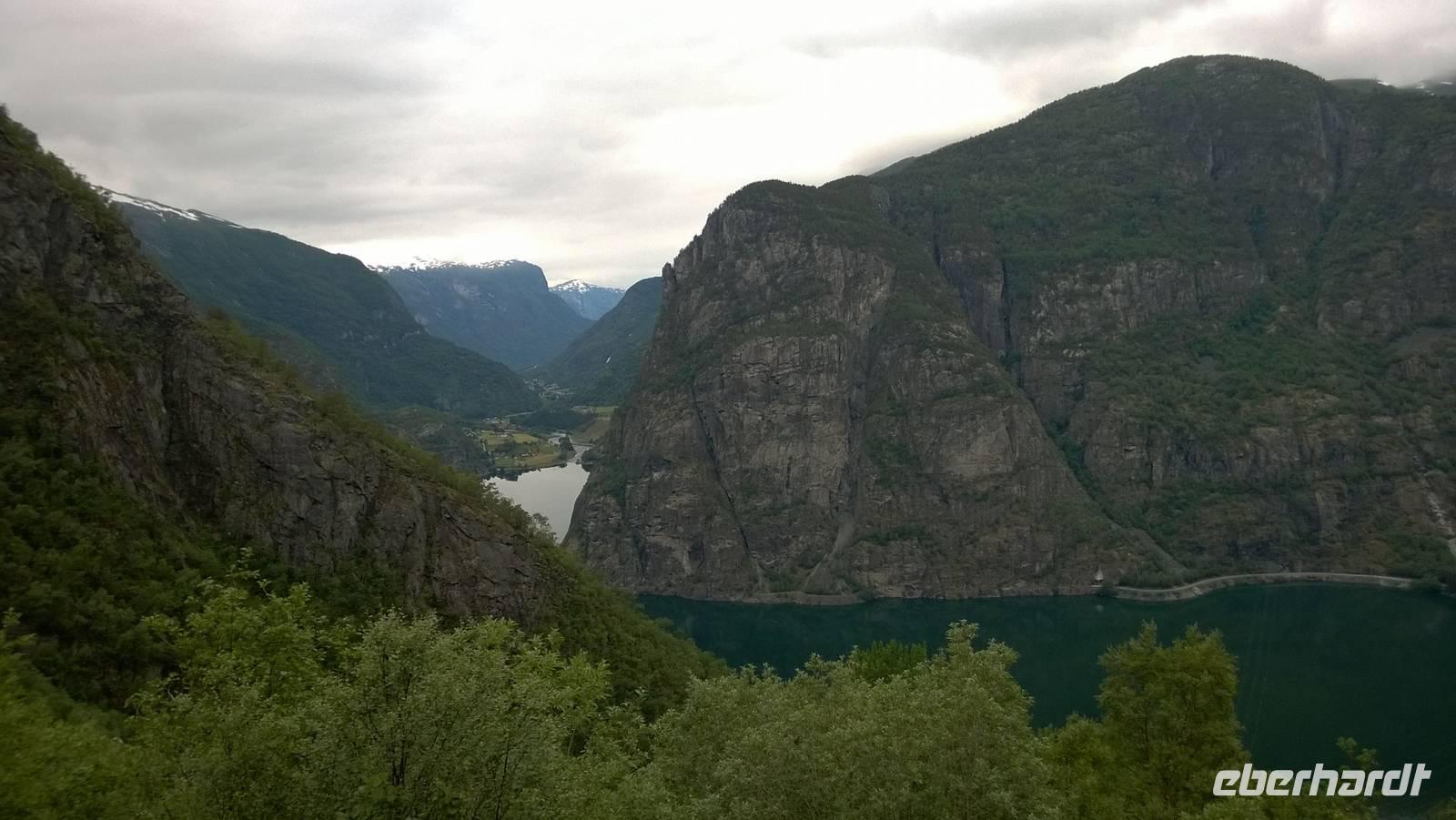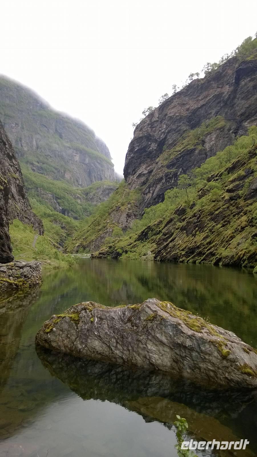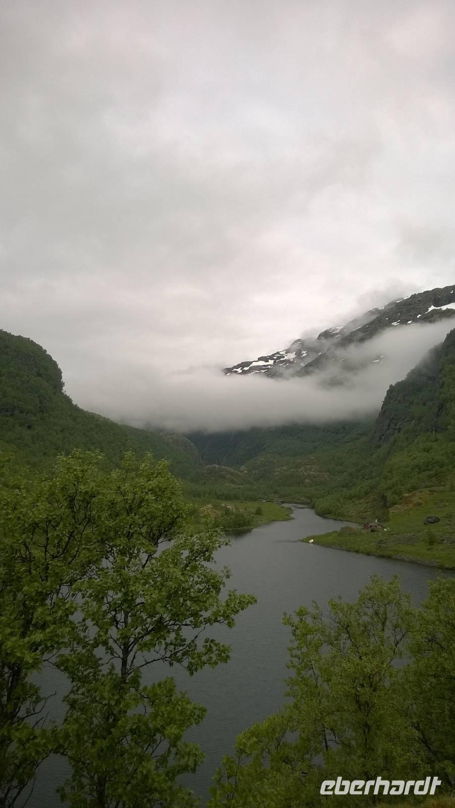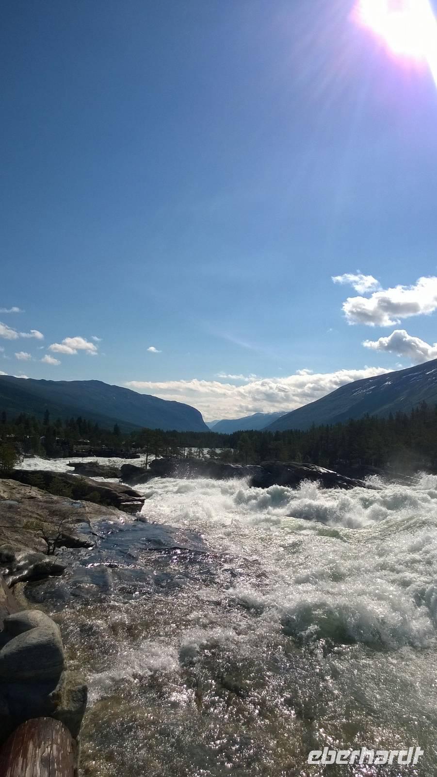 Zunächst wandern wir in atemberaumbend schöner Berglandschaft auf halber Höhe zwischen Fluss und Bergkuppen. Theoretisch müssen wir immer nur bergab gehen, schließlich sollen wir heute von 900 m.o.h. auf quasi Meereshöhe kommen. Doch soviel wir auch hinuntersteigen, gleich um die Ecke findet sich immer wieder eine Anhöhe, die wir bergauf wandern. Hoch und runter, runter und hoch, an steilen Felswänden entlang, über Wasserströme, auf eine Bergkuppe und durch den Wald. Abstecher machen wir zu einer Hängebrücke, wo man seinen Mut für ein Foto mal beweisen kann und zu einer imposanten Höhle. Doch weiter geht's, die 19km ziehen sich hin. Es sind viele kleine Überraschungen, die uns auf diesem Wanderweg herausfordern. Die größte Herausforderung ist sicherlich der Wasserfall, der noch so viel Schmelzwasser führt, dass wir nicht mit trockener Haut daran vorbei kommen. Regensachen an, Zähne zusammen beißen und zügig durchwaten heißt es dort. Ob unsere Outdoor-Kleidung auch für Wasserfälle präpariert ist? Der Bürgermeister von Aurland begleitet uns für die letzten 2 Stunden und hat sicherheitshalber auch gleich ein neues Seil zum Entlanghangeln gespannt.
