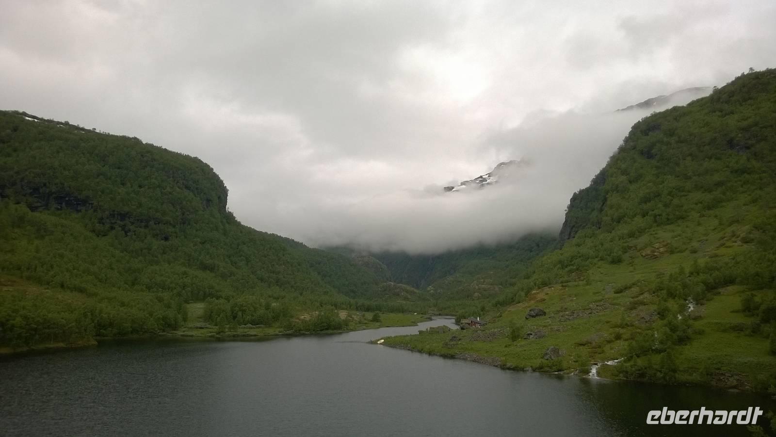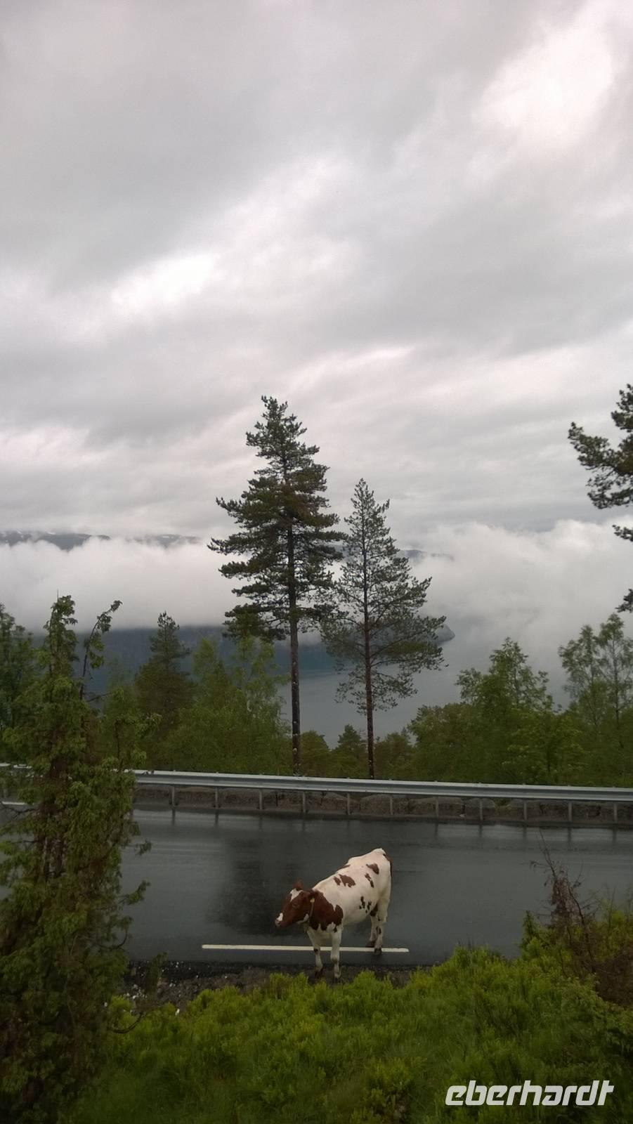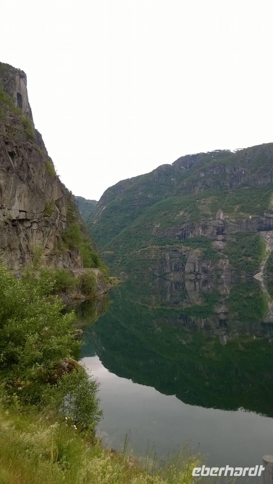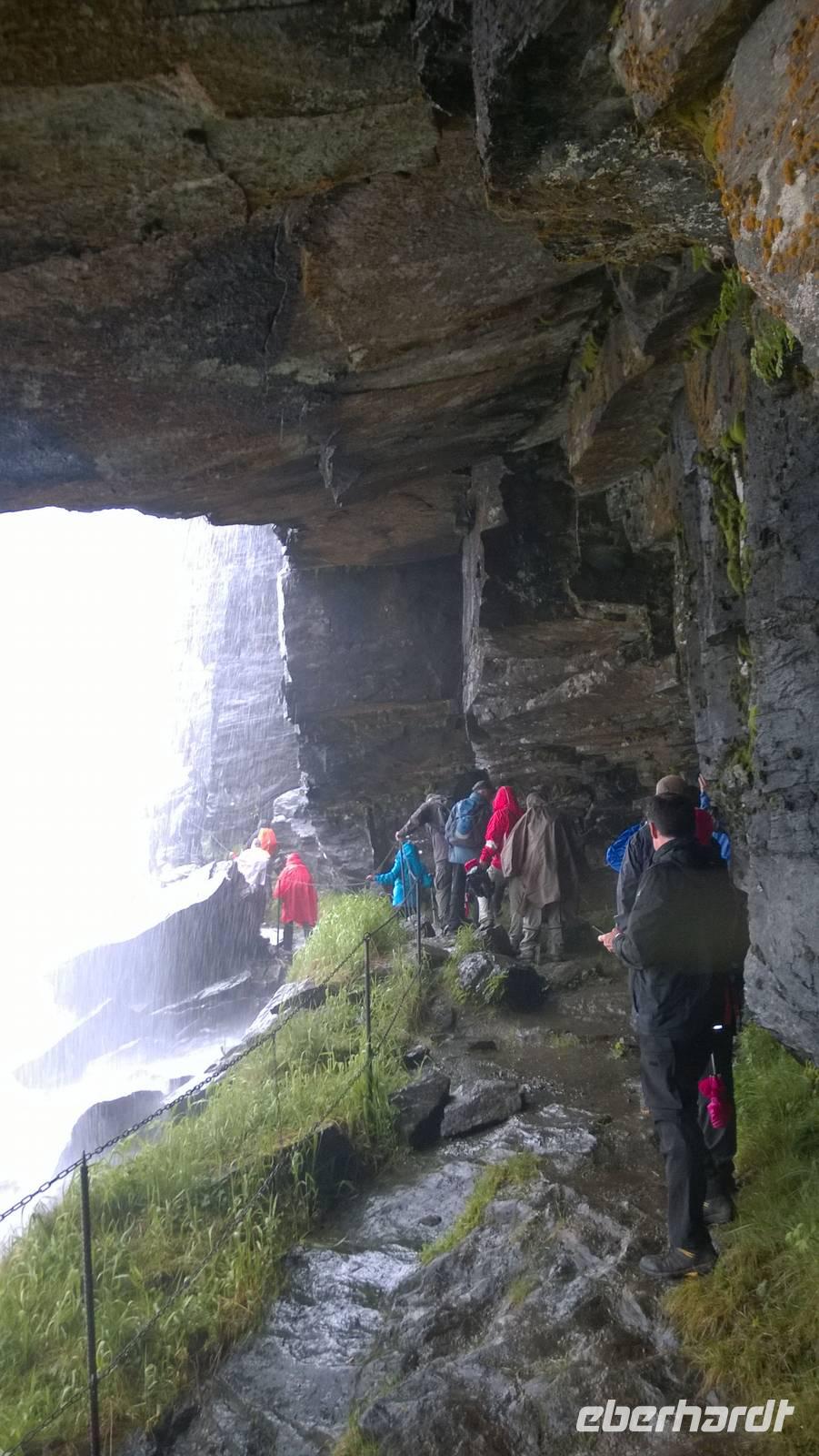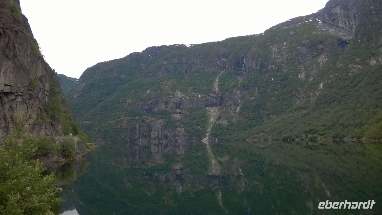Zunächst wandern wir in atemberaumbend schöner Berglandschaft auf halber Höhe zwischen Fluss und Bergkuppen. Theoretisch müssen wir immer nur bergab gehen, schließlich sollen wir heute von 900 m.o.h. auf quasi Meereshöhe kommen. Doch soviel wir auch hinuntersteigen, gleich um die Ecke findet sich immer wieder eine Anhöhe, die wir bergauf wandern. Hoch und runter, runter und hoch, an steilen Felswänden entlang, über Wasserströme, auf eine Bergkuppe und durch den Wald. Abstecher machen wir zu einer Hängebrücke, wo man seinen Mut für ein Foto mal beweisen kann und zu einer imposanten Höhle. Doch weiter geht's, die 19km ziehen sich hin. Es sind viele kleine Überraschungen, die uns auf diesem Wanderweg herausfordern. Die größte Herausforderung ist sicherlich der Wasserfall, der noch so viel Schmelzwasser führt, dass wir nicht mit trockener Haut daran vorbei kommen. Regensachen an, Zähne zusammen beißen und zügig durchwaten heißt es dort. Ob unsere Outdoor-Kleidung auch für Wasserfälle präpariert ist? Der Bürgermeister von Aurland begleitet uns für die letzten 2 Stunden und hat sicherheitshalber auch gleich ein neues Seil zum Entlanghangeln gespannt.