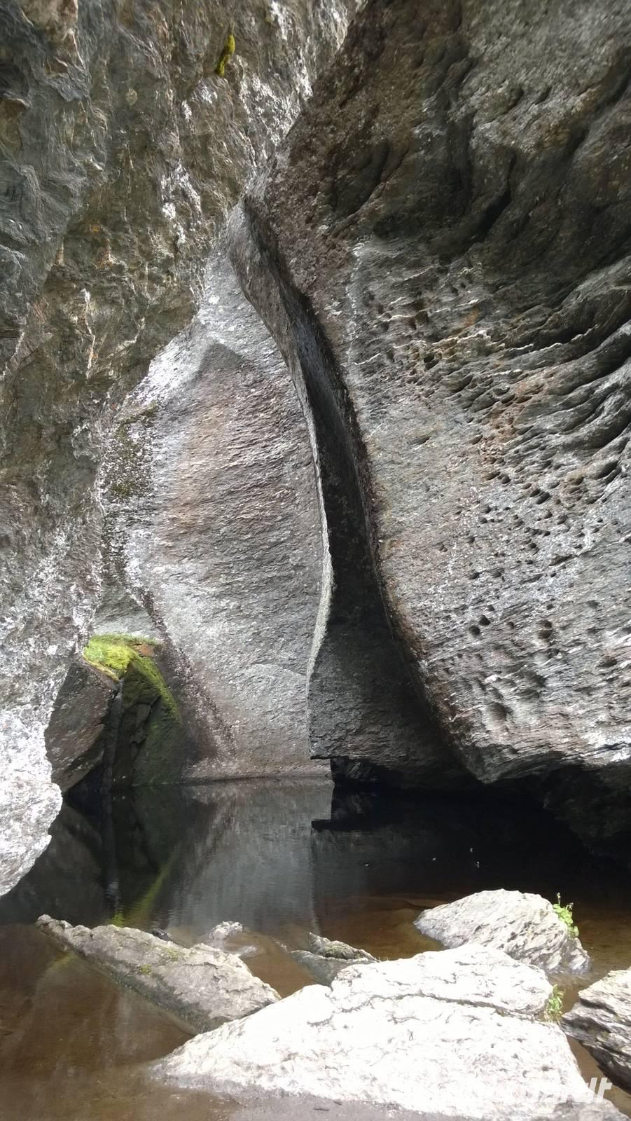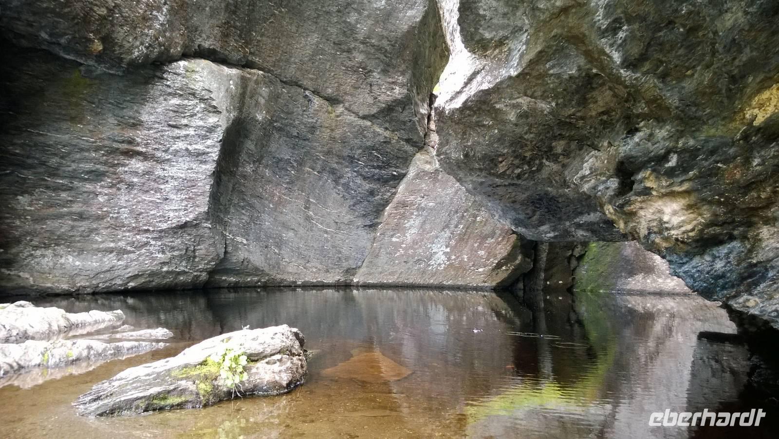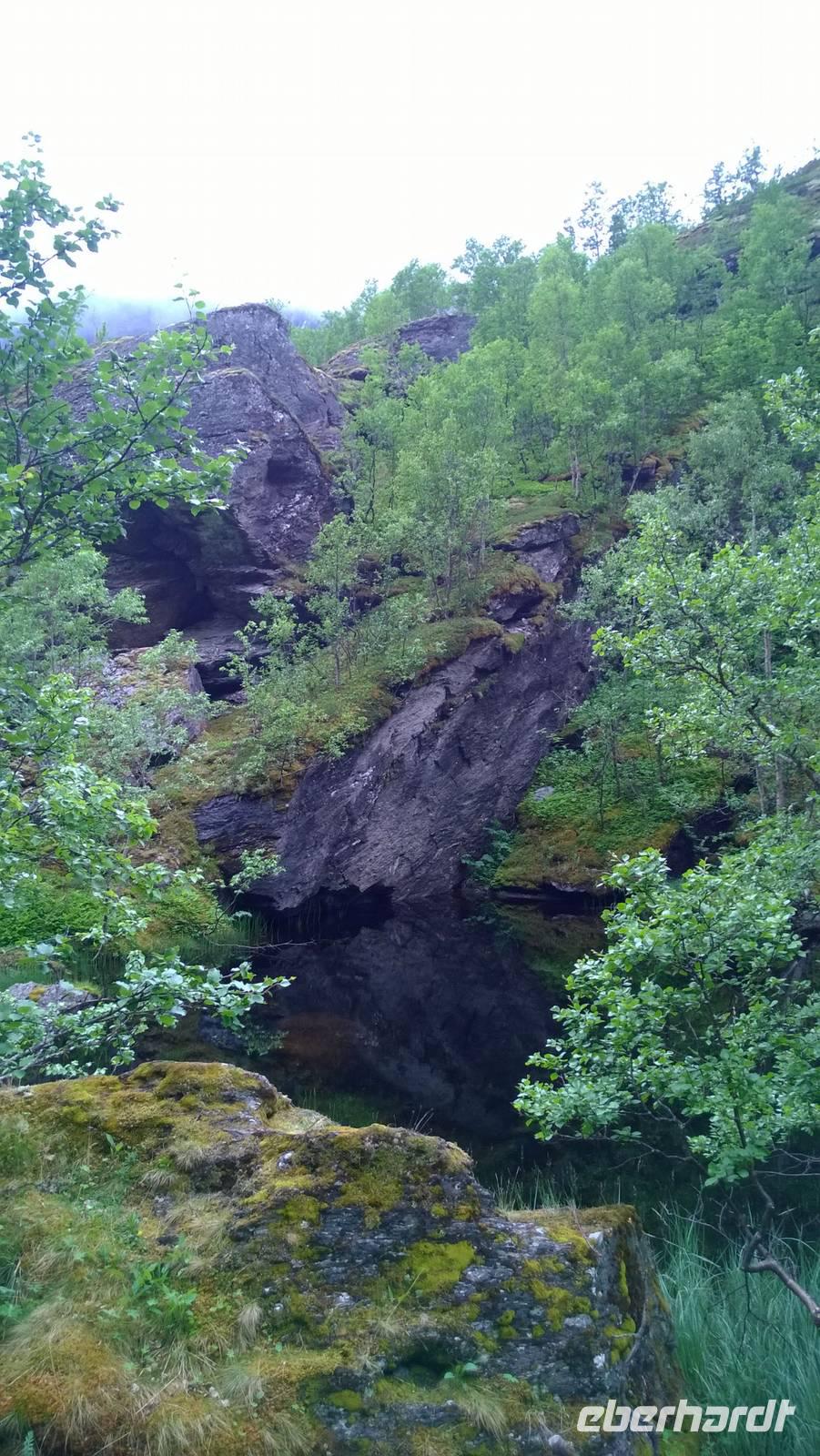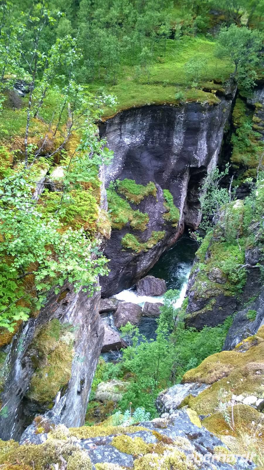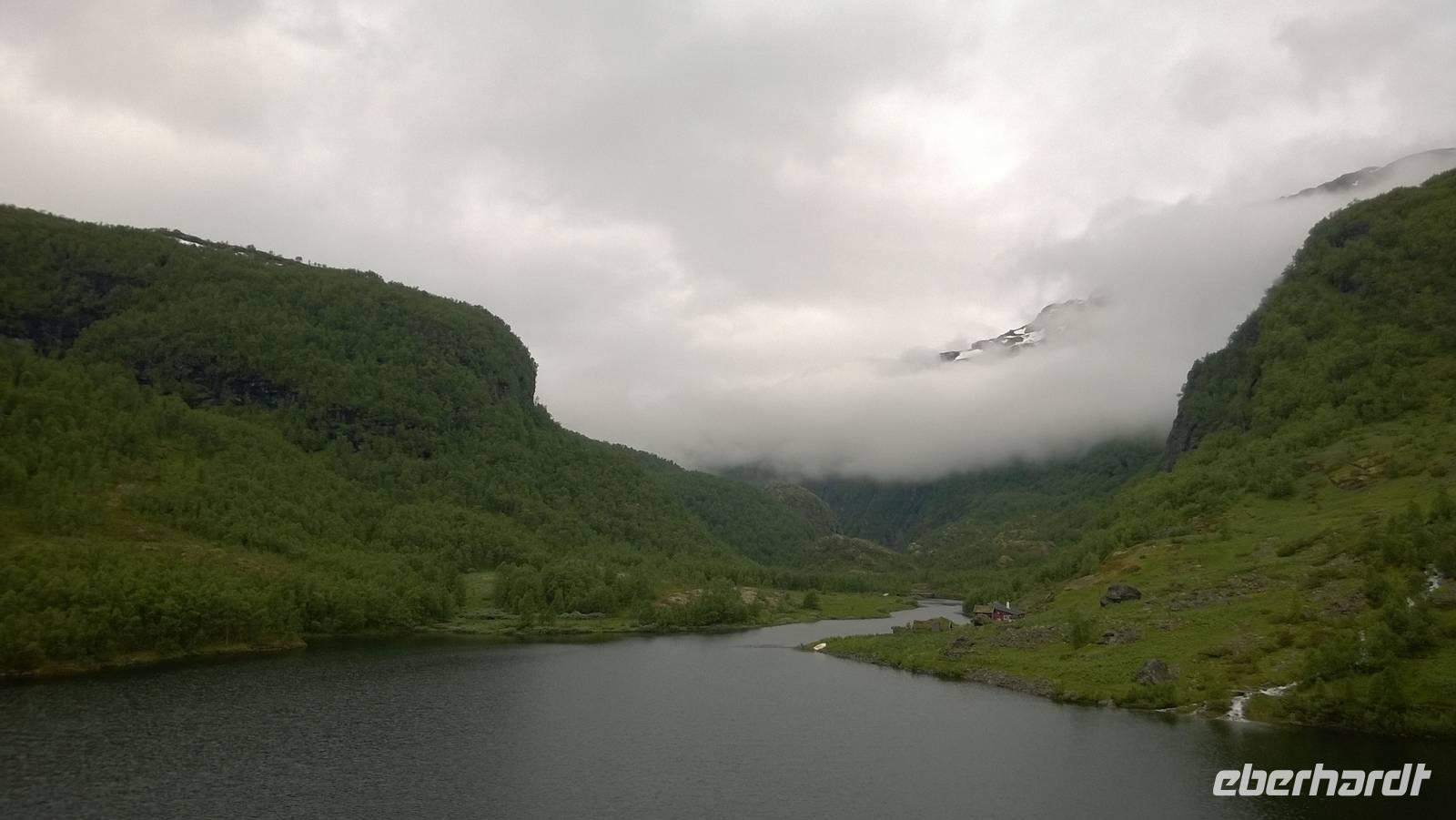 Zunächst wandern wir in atemberaumbend schöner Berglandschaft auf halber Höhe zwischen Fluss und Bergkuppen. Theoretisch müssen wir immer nur bergab gehen, schließlich sollen wir heute von 900 m.o.h. auf quasi Meereshöhe kommen. Doch soviel wir auch hinuntersteigen, gleich um die Ecke findet sich immer wieder eine Anhöhe, die wir bergauf wandern. Hoch und runter, runter und hoch, an steilen Felswänden entlang, über Wasserströme, auf eine Bergkuppe und durch den Wald. Abstecher machen wir zu einer Hängebrücke, wo man seinen Mut für ein Foto mal beweisen kann und zu einer imposanten Höhle. Doch weiter geht's, die 19km ziehen sich hin. Es sind viele kleine Überraschungen, die uns auf diesem Wanderweg herausfordern. Die größte Herausforderung ist sicherlich der Wasserfall, der noch so viel Schmelzwasser führt, dass wir nicht mit trockener Haut daran vorbei kommen. Regensachen an, Zähne zusammen beißen und zügig durchwaten heißt es dort. Ob unsere Outdoor-Kleidung auch für Wasserfälle präpariert ist? Der Bürgermeister von Aurland begleitet uns für die letzten 2 Stunden und hat sicherheitshalber auch gleich ein neues Seil zum Entlanghangeln gespannt.