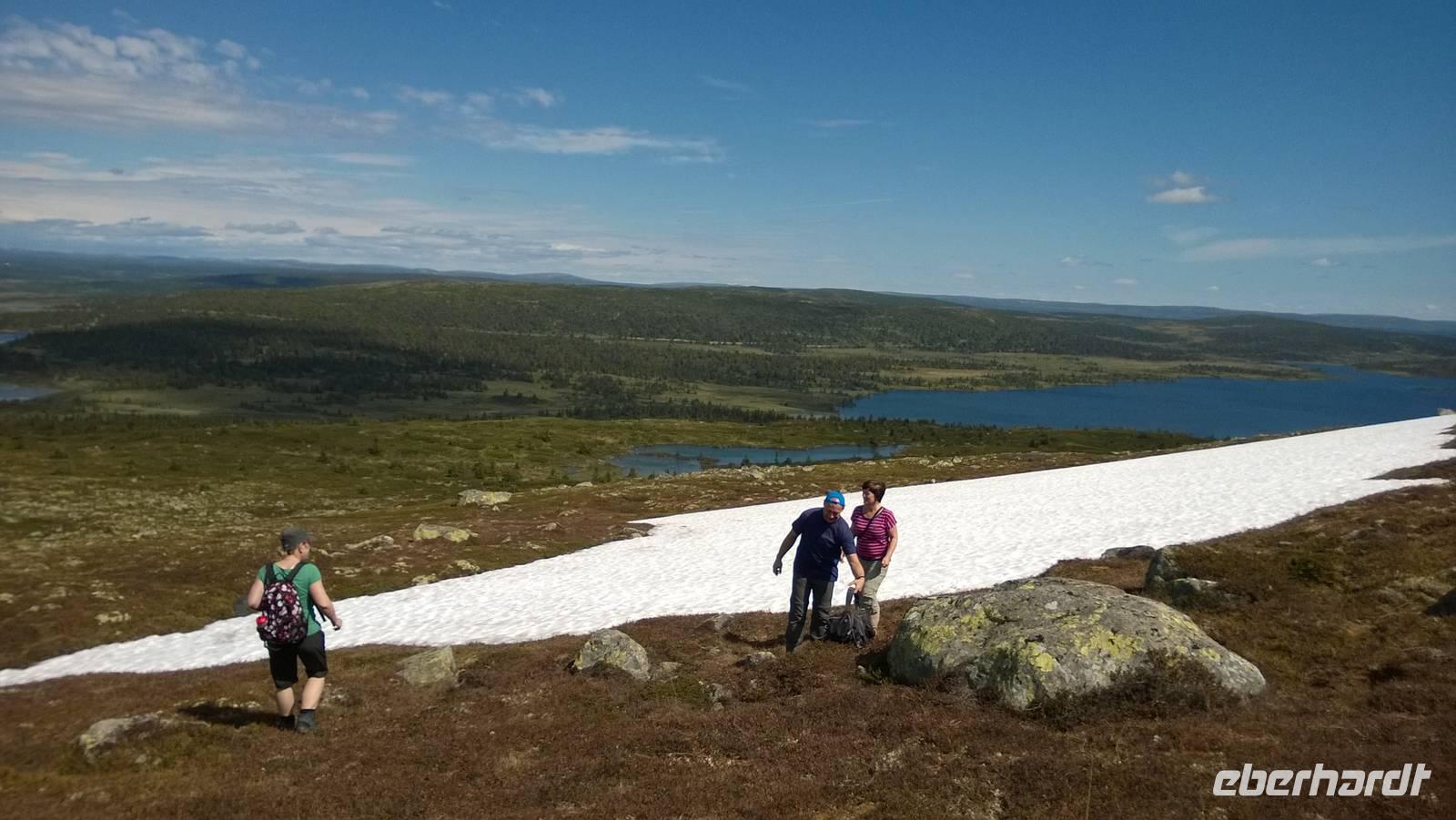 Gemütlich nach dem Frühstück fährt uns Kai im kleinen, mintgrünen Mercedes Tourino nach Lillehammer. Dort treffen wir Marit, unsere Wanderführerin. In Stockholm und in der Schweiz hat sie Kunstgeschichte und Literatur studiert und neben den Wandertouren, führt sie auch deutsche Reisegruppen durch die Museen Lillehammers. Das kommt auch auf dieser Tour zu Tage, denn noch bevor wir in die Berge zum Wandern fahren, streifen wir das kleine Städtchen Lillehammer und Marit erzählt von den Schriftstellern und Künstlern, die hierher kamen. Es liegt ihr am Herzen, zu zeigen, dass ihre Wahlheimat nicht nur für die olympischen Winterspiele bekannt und von Bedeutung ist. Schließlich fahren wir aber aus der Stadt heraus, durch Tannenwald und immer schön bergauf. Auf einem kleinen Parkplatz bei Nordseter (seter = Alm) sagen wir unserem Busfahrer Kai „Adieu", kramen die Wanderstöcke aus dem Gepäck und schnüren die Schuhe fest. Nun geht sie also los, unsere erste Wanderung für diese Reise. In schönstem Sonnenschein wandern wir über Stock und Stein auf immer schmaler werdenden Pfaden. Über Schneefelder und durch Schmelzwasserströme führt unser Weg. Mittagspause machen wir auf dem Nebelberg in 900m Höhe. Bessere Sicht kann man sich nicht vorstellen! Von hier aus sehen wir das schneebedeckte Rondanegebirge, welches gute 130 km von uns entfernt ist. Schließlich, nach circa 10 Kilometern und dreieinhalb Stunden gemächlichen Wanderns, treffen wir in Pellestova wieder auf unseren Bus. Eine Verschnaufpause haben wir auf der Fahrt zum Hotel, dort werden Wanderstiefel gegen Stadtsandalen eingetauscht und sogleich machen wir uns wieder auf ins Städtchen. Während manche doch lieber im Hotel bleiben und dort die Umgebung erkunden, bummeln die anderen durchs „Klein Hamar". Im Kunstmuseum der Stadt lässt Marit uns noch einmal an ihrem umfassenden kulturhistorischen Wissen teilhaben, danach bleibt Zeit für ein Eis in der Fußgängerzone.