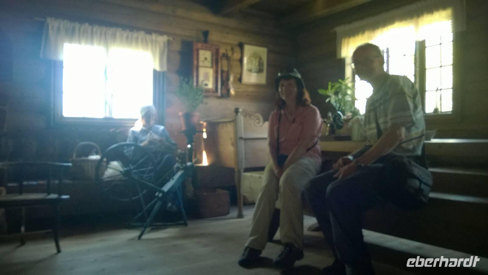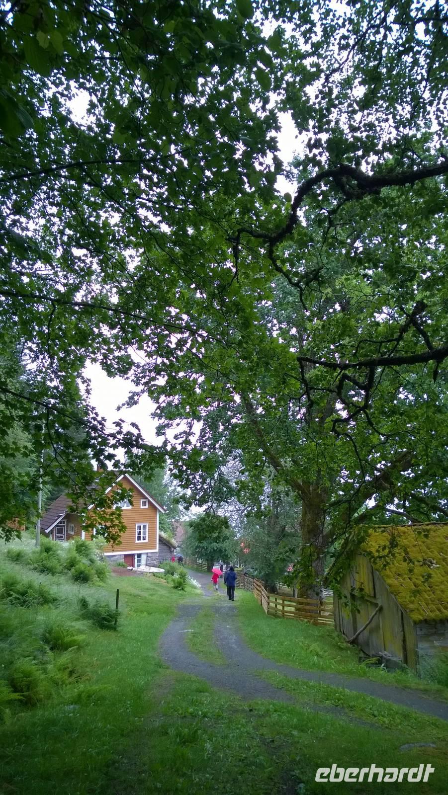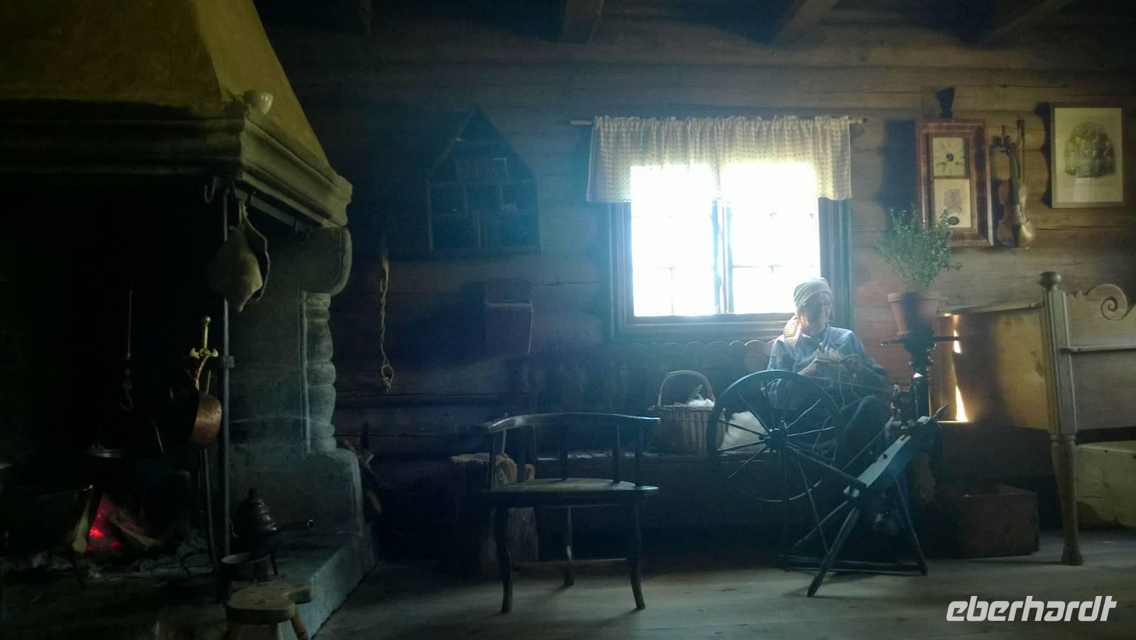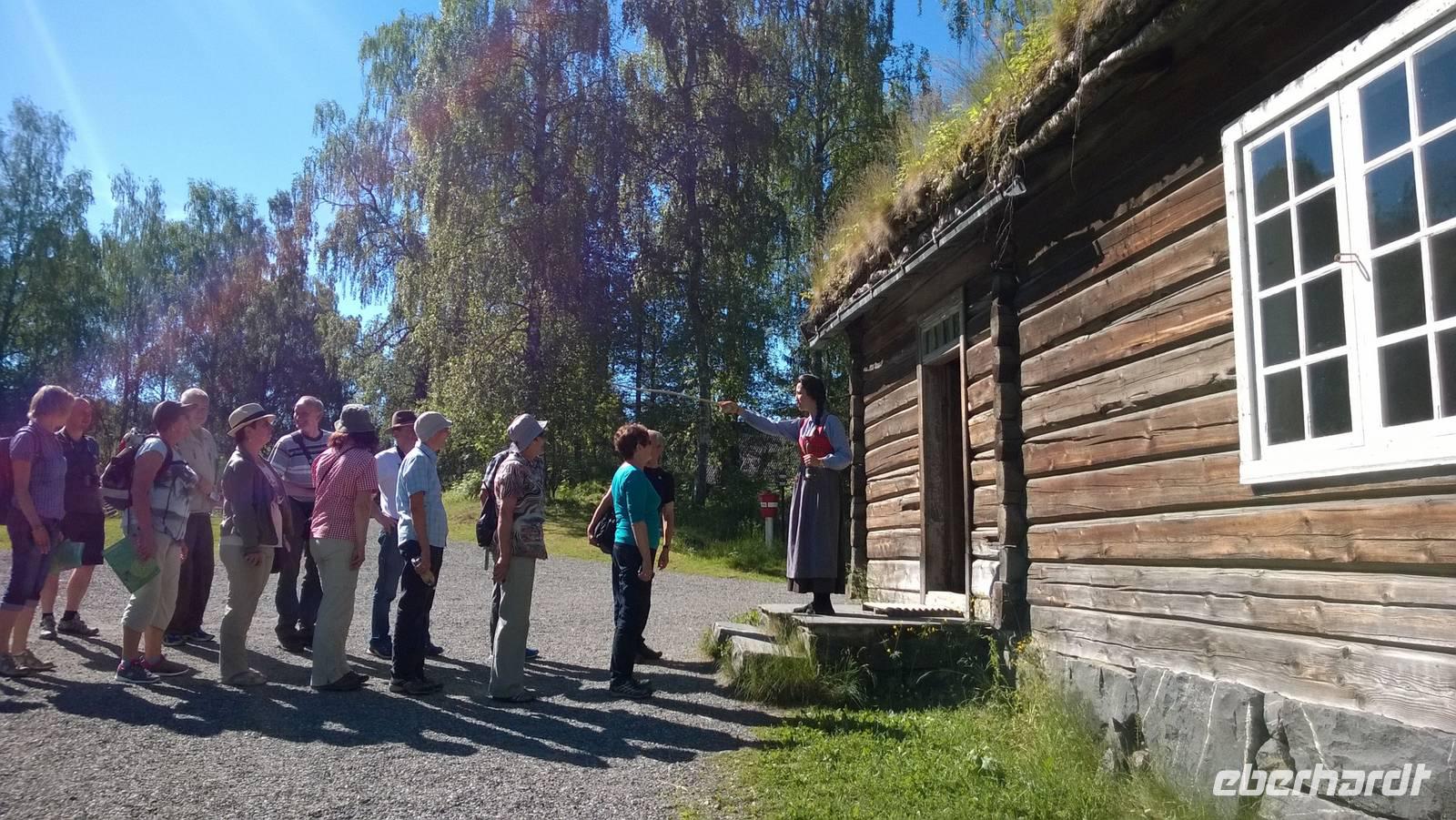 Das Freilichtmuseum Maihaugen in Lillehammer ist wirklich idyllisch! Unsere Museumsführerin Sarah bringt mit uns zusammen Leben in die alten, traditionellen Häuser. In der Schule sitzen wir geordnet nach Mädels und Buben, lernen etwas über die Besonderheiten des norwegischen Alphabets und singen „Bruder Jakob". Später im großen Wohnzimmer einer Bauernstube gruppieren wir uns um den langen Esstisch. Der Hausherr an der Stirnseite, die Mägde und Burschen ganz unten. Was für eine ulkige Rollenverteilung! Jedenfalls ist das wohl der unterhaltsamste Museumsbesuch seit Langem.