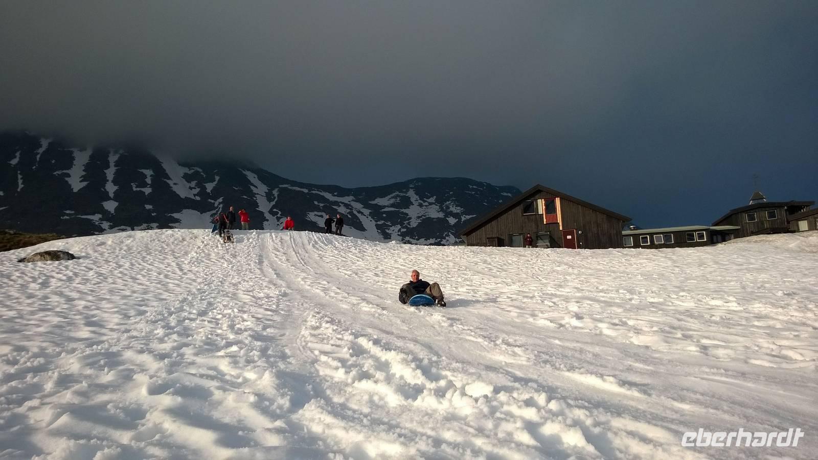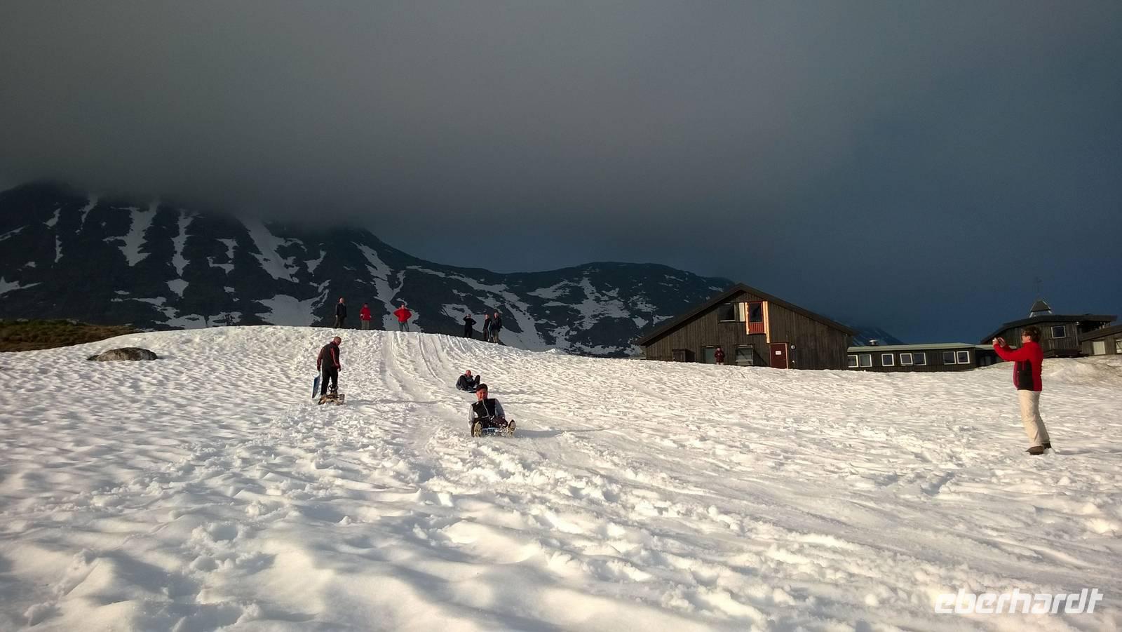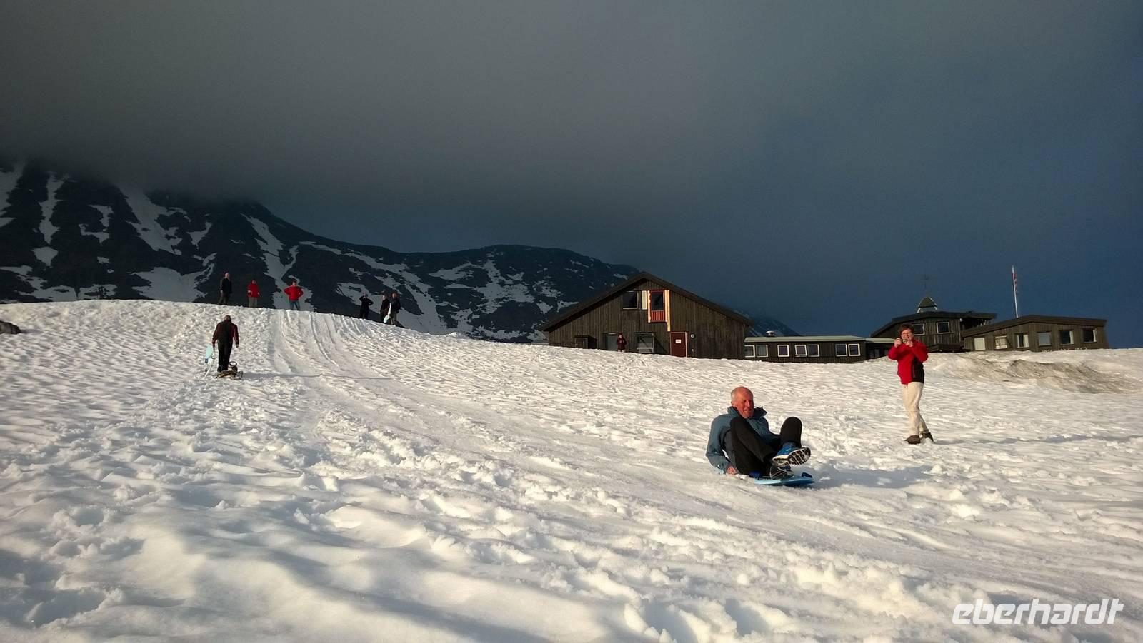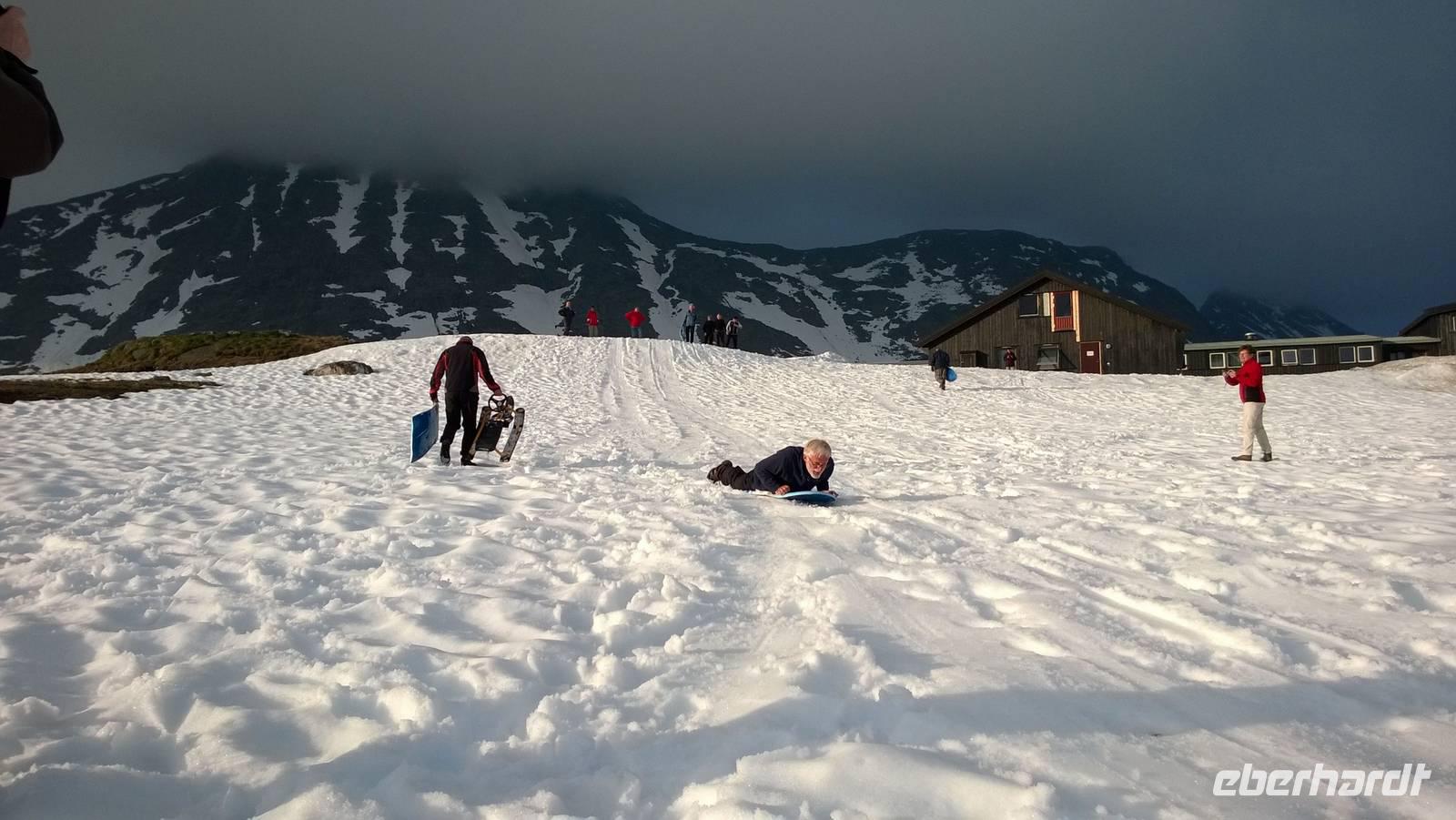 Was für ein Tag! Auf ein Neues fahren wir die abenteuerliche Straße durchs Gebirge, Schafe rechts und links der Fahrbahn und machmal auch direkt darauf. Unsere sympathische Wanderführerin Marit erwartet uns am Beginn der „richtigen Straße". Mit ihrer wunderbar offenen und herzlichen Art nimmt sie uns sofort für sich ein. Während unserer Wanderung um Spiterstulen wird sie uns allerhand „Blümli" in ihrem köstlichen norwegischen Schwyzerdytsch erklären. Aber erst einmal müssen wir zum Ausgangsort unserer Wandertour gelangen. Und das ist gar nicht so einfach. Dachte man, dass die Straße zu unserem Hotel schon eine Herausforderung sei, so war das nur möglich, weil wir diese hier noch nicht kannten. Eine enge Straße schlängelt sich durchs Gebirge und immer wieder führen Brücken, die genauso breit sind wie der Bus, über reißende Schmelzwasserströme. So manch einem stockt der Atem bei dieser Fahrt.Die Wanderung führt uns über Rentierpfade, Endmoränen, Bergbäche (elver, wie Marit sie nennt), Geröllhalden und schöne Blumenwiesen. Wir haben beste Sicht auf den Gletscher namens „Eventyris" (Abenteuereis) auf der anderen Seite des Tales, sowie die höchsten Berge der Umgebung (allen voran der Galdhöppigen mit 2469m). Nach einer anspruchsvollen Wanderung entspannen wir erst einmal in der Sonne bei Eis und Kaffee. Vor uns liegt noch eine abenteuerliche Rückfahrt. Und zu diesem Zeitpunkt wissen wir noch gar nicht, dass auch der Abend mit einem Abenteuer lockt. Denn während des Abendessens schmieden Busfahrer und Reiseleiterin einen Plan: Schlitten fahren ist angesagt! Nach so einem guten Essen muss man sich doch noch einmal bewegen und den Winter hier oben gut ausnutzen! Also rodeln wir allesamt auf dem Hausberg. Am 3.Juli 2015, wo in Deutschland 35 Grad Celsius sind, wir selbst schon eine mordsmäßige Wandertour hinter uns haben und es eigentlich Zeit ist, um gemütlich den Tag ausklingen zu lassen, schlittern wir um die Wette den Schneehügel hinunter! Wenn das nichts ist!