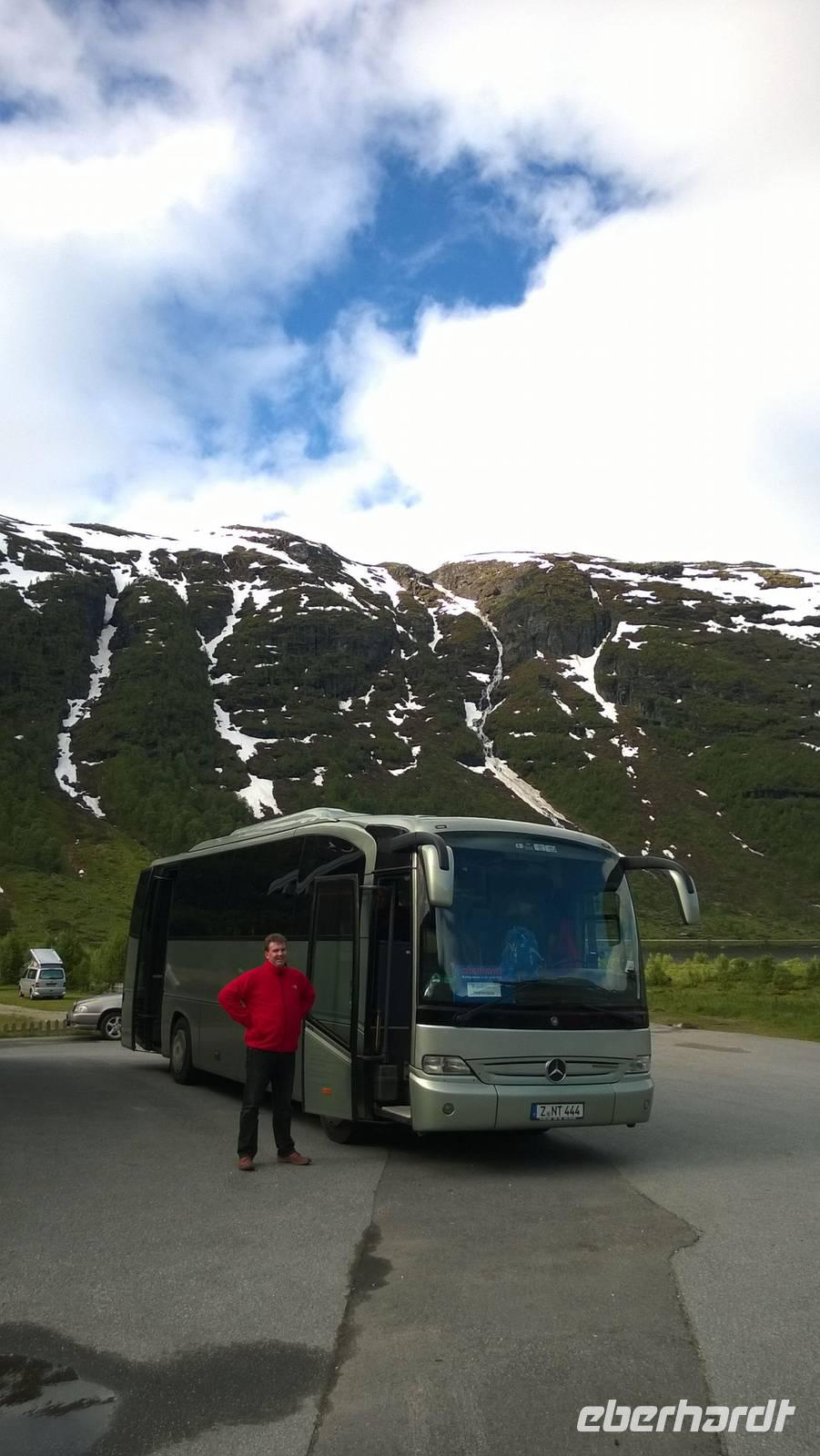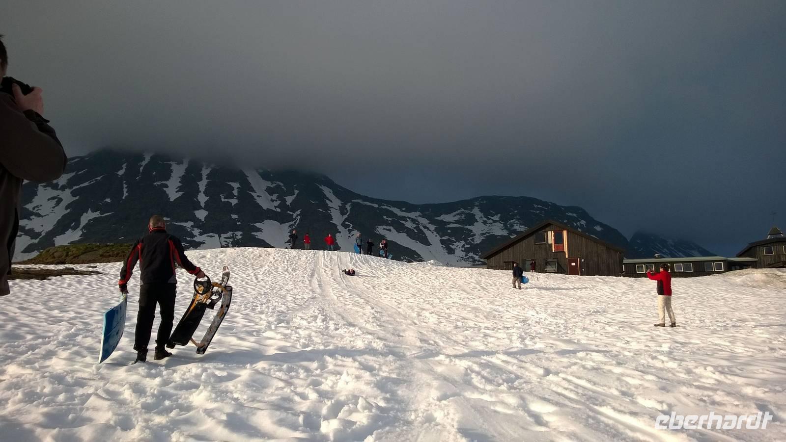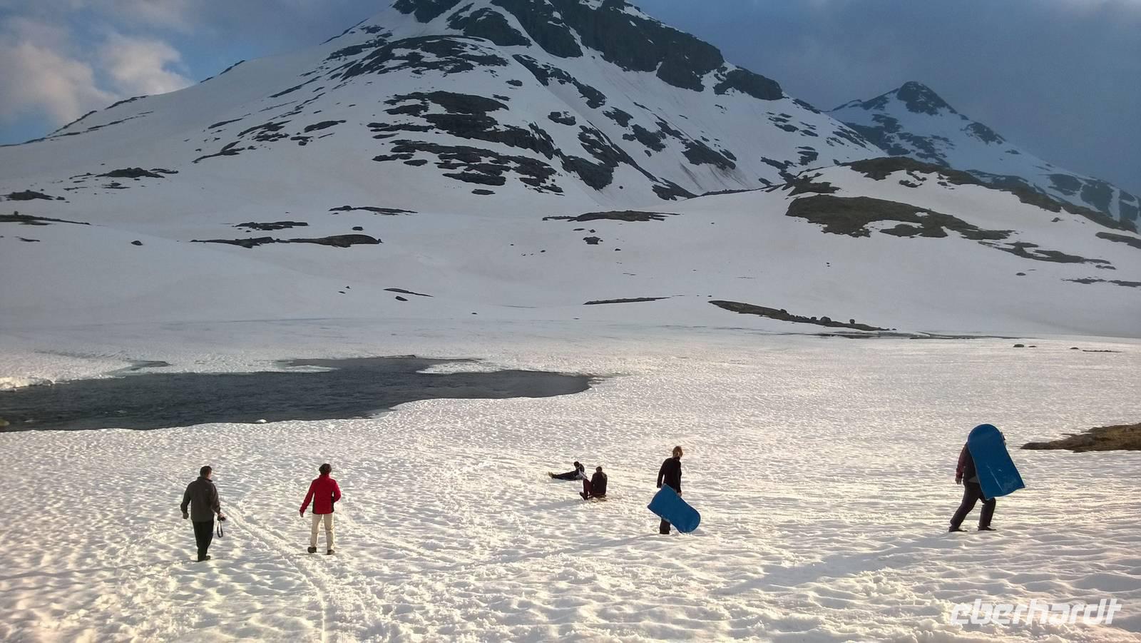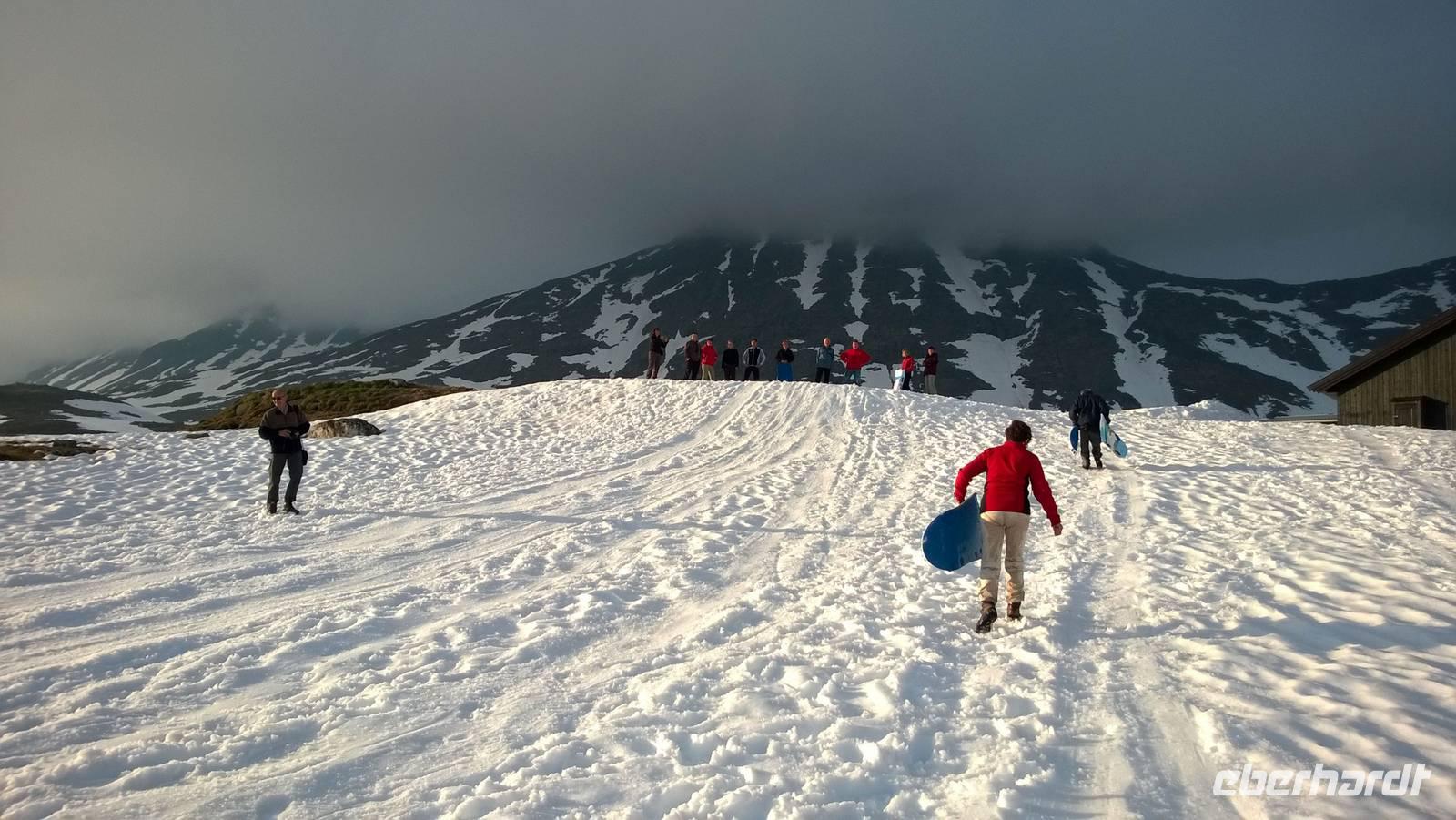 Was für ein Tag! Auf ein Neues fahren wir die abenteuerliche Straße durchs Gebirge, Schafe rechts und links der Fahrbahn und machmal auch direkt darauf. Unsere sympathische Wanderführerin Marit erwartet uns am Beginn der „richtigen Straße". Mit ihrer wunderbar offenen und herzlichen Art nimmt sie uns sofort für sich ein. Während unserer Wanderung um Spiterstulen wird sie uns allerhand „Blümli" in ihrem köstlichen norwegischen Schwyzerdytsch erklären. Aber erst einmal müssen wir zum Ausgangsort unserer Wandertour gelangen. Und das ist gar nicht so einfach. Dachte man, dass die Straße zu unserem Hotel schon eine Herausforderung sei, so war das nur möglich, weil wir diese hier noch nicht kannten. Eine enge Straße schlängelt sich durchs Gebirge und immer wieder führen Brücken, die genauso breit sind wie der Bus, über reißende Schmelzwasserströme. So manch einem stockt der Atem bei dieser Fahrt.Die Wanderung führt uns über Rentierpfade, Endmoränen, Bergbäche (elver, wie Marit sie nennt), Geröllhalden und schöne Blumenwiesen. Wir haben beste Sicht auf den Gletscher namens „Eventyris" (Abenteuereis) auf der anderen Seite des Tales, sowie die höchsten Berge der Umgebung (allen voran der Galdhöppigen mit 2469m). Nach einer anspruchsvollen Wanderung entspannen wir erst einmal in der Sonne bei Eis und Kaffee. Vor uns liegt noch eine abenteuerliche Rückfahrt. Und zu diesem Zeitpunkt wissen wir noch gar nicht, dass auch der Abend mit einem Abenteuer lockt. Denn während des Abendessens schmieden Busfahrer und Reiseleiterin einen Plan: Schlitten fahren ist angesagt! Nach so einem guten Essen muss man sich doch noch einmal bewegen und den Winter hier oben gut ausnutzen! Also rodeln wir allesamt auf dem Hausberg. Am 3.Juli 2015, wo in Deutschland 35 Grad Celsius sind, wir selbst schon eine mordsmäßige Wandertour hinter uns haben und es eigentlich Zeit ist, um gemütlich den Tag ausklingen zu lassen, schlittern wir um die Wette den Schneehügel hinunter! Wenn das nichts ist!