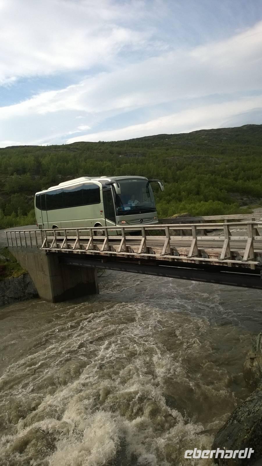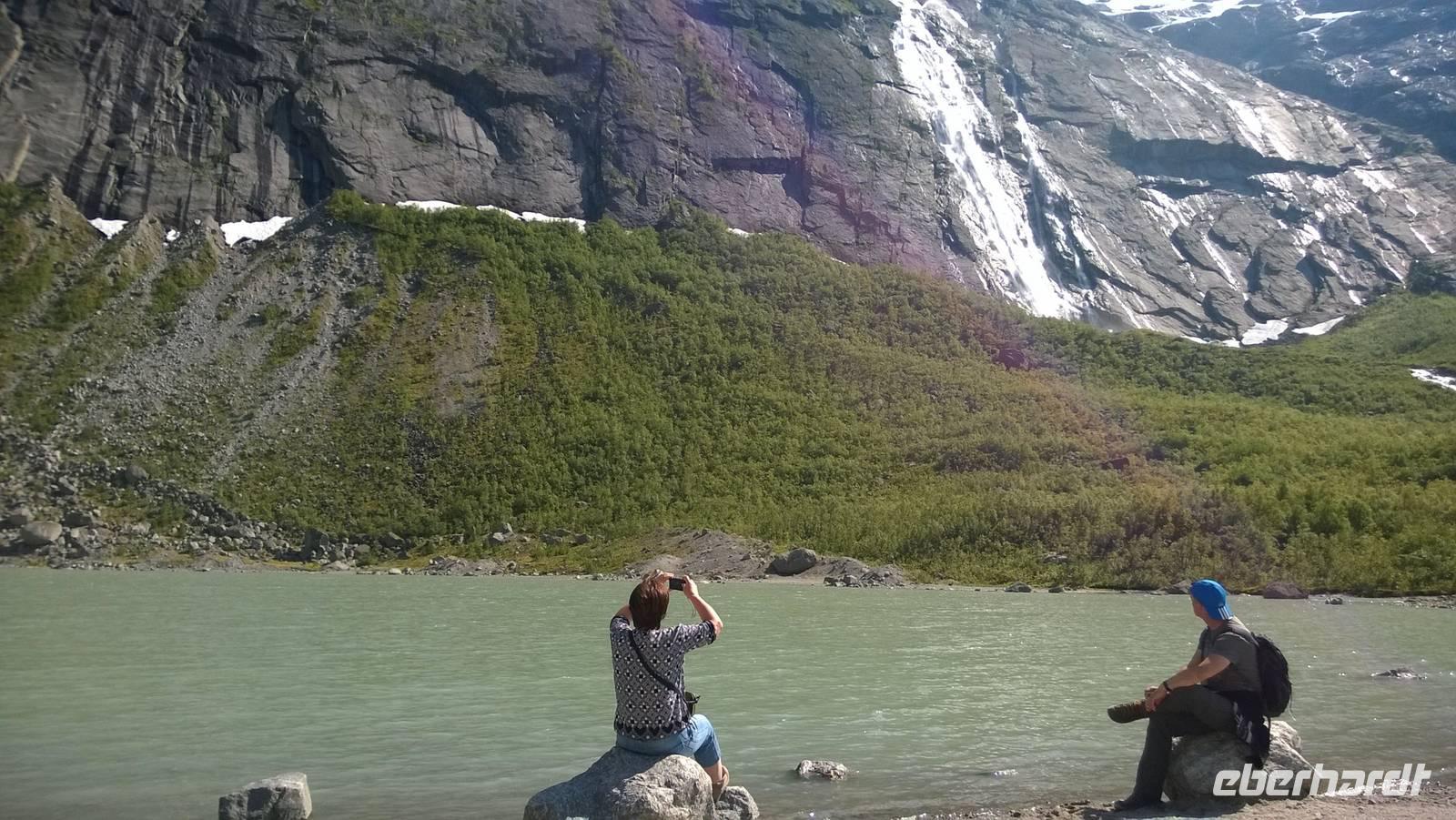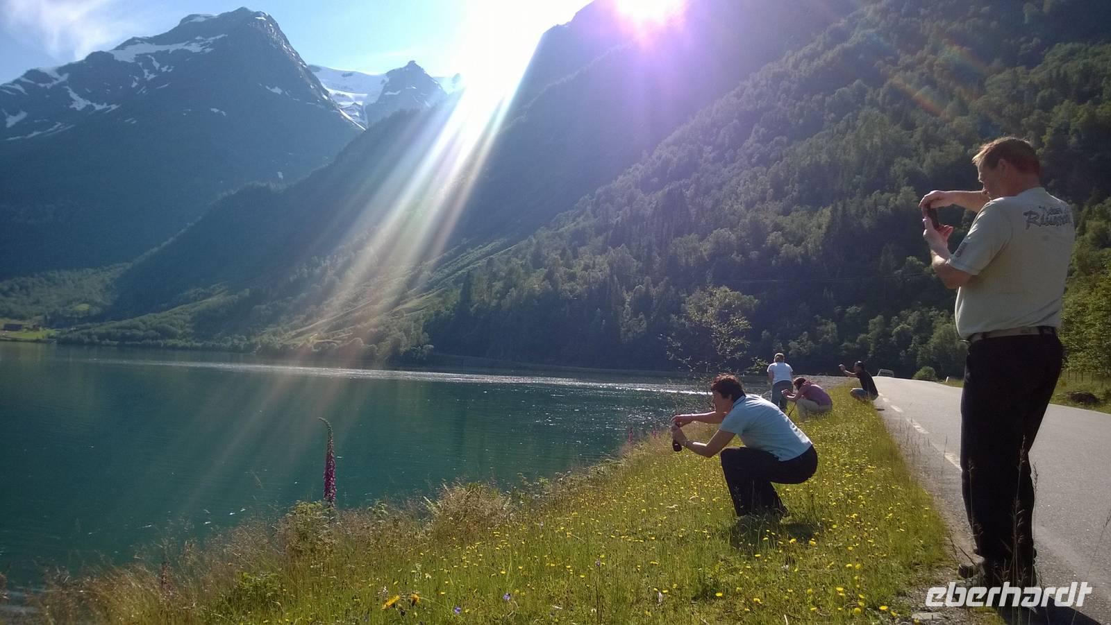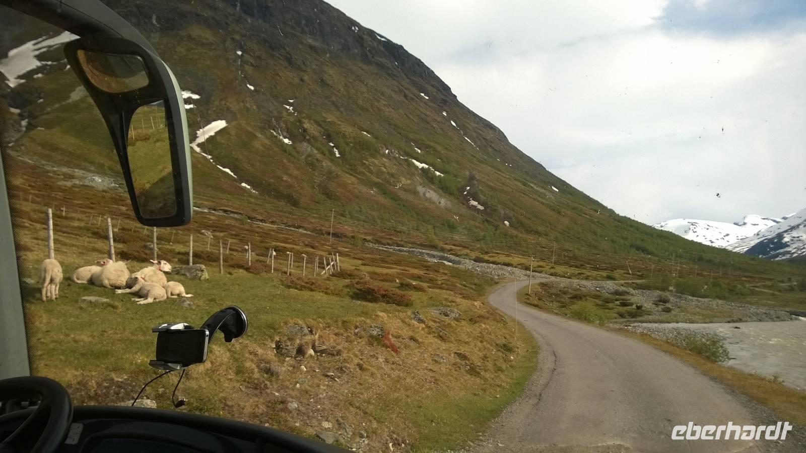 Was für ein Tag! Auf ein Neues fahren wir die abenteuerliche Straße durchs Gebirge, Schafe rechts und links der Fahrbahn und machmal auch direkt darauf. Unsere sympathische Wanderführerin Marit erwartet uns am Beginn der „richtigen Straße". Mit ihrer wunderbar offenen und herzlichen Art nimmt sie uns sofort für sich ein. Während unserer Wanderung um Spiterstulen wird sie uns allerhand „Blümli" in ihrem köstlichen norwegischen Schwyzerdytsch erklären. Aber erst einmal müssen wir zum Ausgangsort unserer Wandertour gelangen. Und das ist gar nicht so einfach. Dachte man, dass die Straße zu unserem Hotel schon eine Herausforderung sei, so war das nur möglich, weil wir diese hier noch nicht kannten. Eine enge Straße schlängelt sich durchs Gebirge und immer wieder führen Brücken, die genauso breit sind wie der Bus, über reißende Schmelzwasserströme. So manch einem stockt der Atem bei dieser Fahrt.Die Wanderung führt uns über Rentierpfade, Endmoränen, Bergbäche (elver, wie Marit sie nennt), Geröllhalden und schöne Blumenwiesen. Wir haben beste Sicht auf den Gletscher namens „Eventyris" (Abenteuereis) auf der anderen Seite des Tales, sowie die höchsten Berge der Umgebung (allen voran der Galdhöppigen mit 2469m). Nach einer anspruchsvollen Wanderung entspannen wir erst einmal in der Sonne bei Eis und Kaffee. Vor uns liegt noch eine abenteuerliche Rückfahrt. Und zu diesem Zeitpunkt wissen wir noch gar nicht, dass auch der Abend mit einem Abenteuer lockt. Denn während des Abendessens schmieden Busfahrer und Reiseleiterin einen Plan: Schlitten fahren ist angesagt! Nach so einem guten Essen muss man sich doch noch einmal bewegen und den Winter hier oben gut ausnutzen! Also rodeln wir allesamt auf dem Hausberg. Am 3.Juli 2015, wo in Deutschland 35 Grad Celsius sind, wir selbst schon eine mordsmäßige Wandertour hinter uns haben und es eigentlich Zeit ist, um gemütlich den Tag ausklingen zu lassen, schlittern wir um die Wette den Schneehügel hinunter! Wenn das nichts ist!
