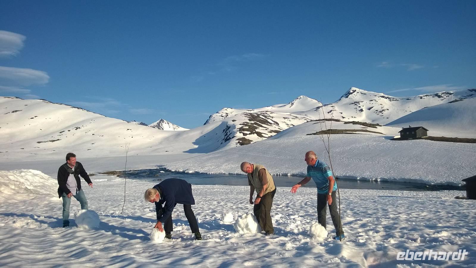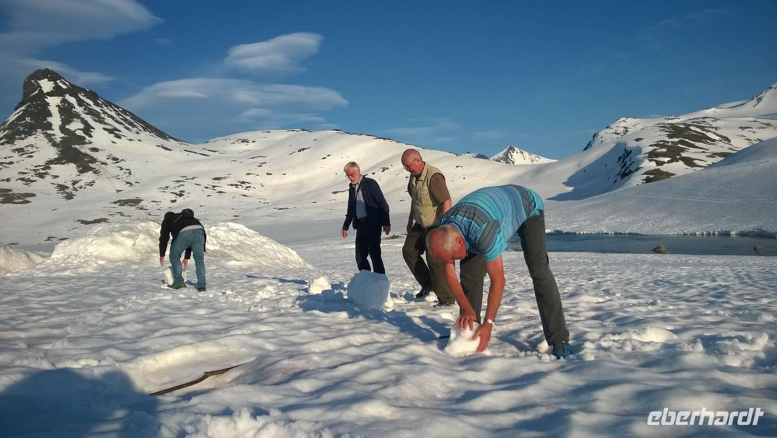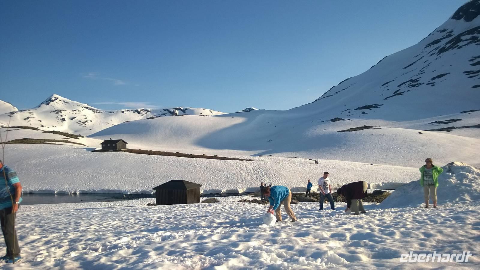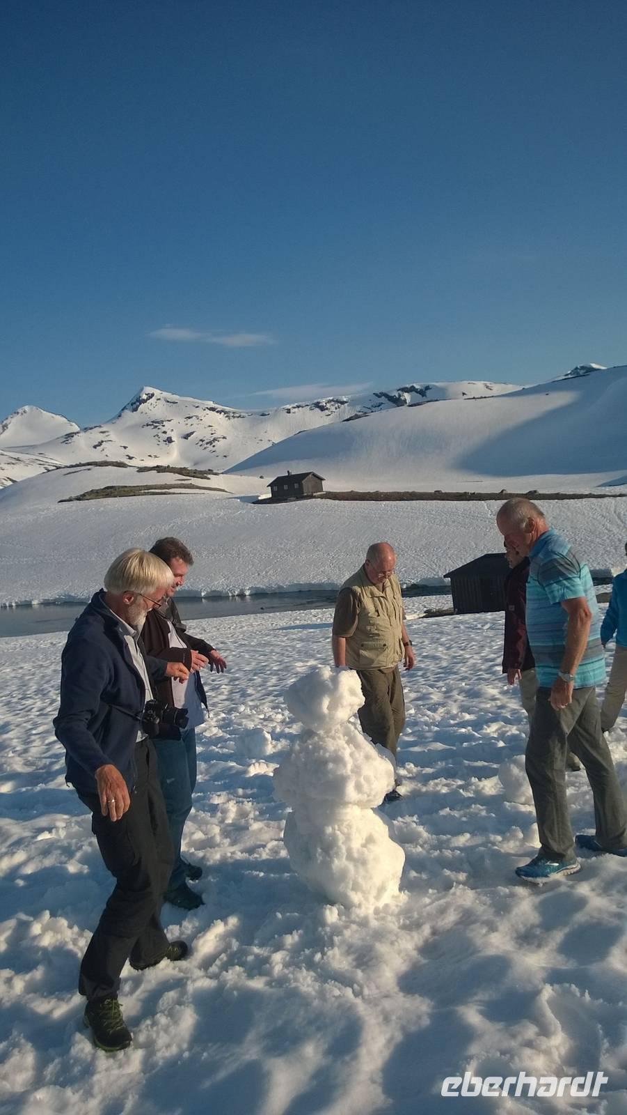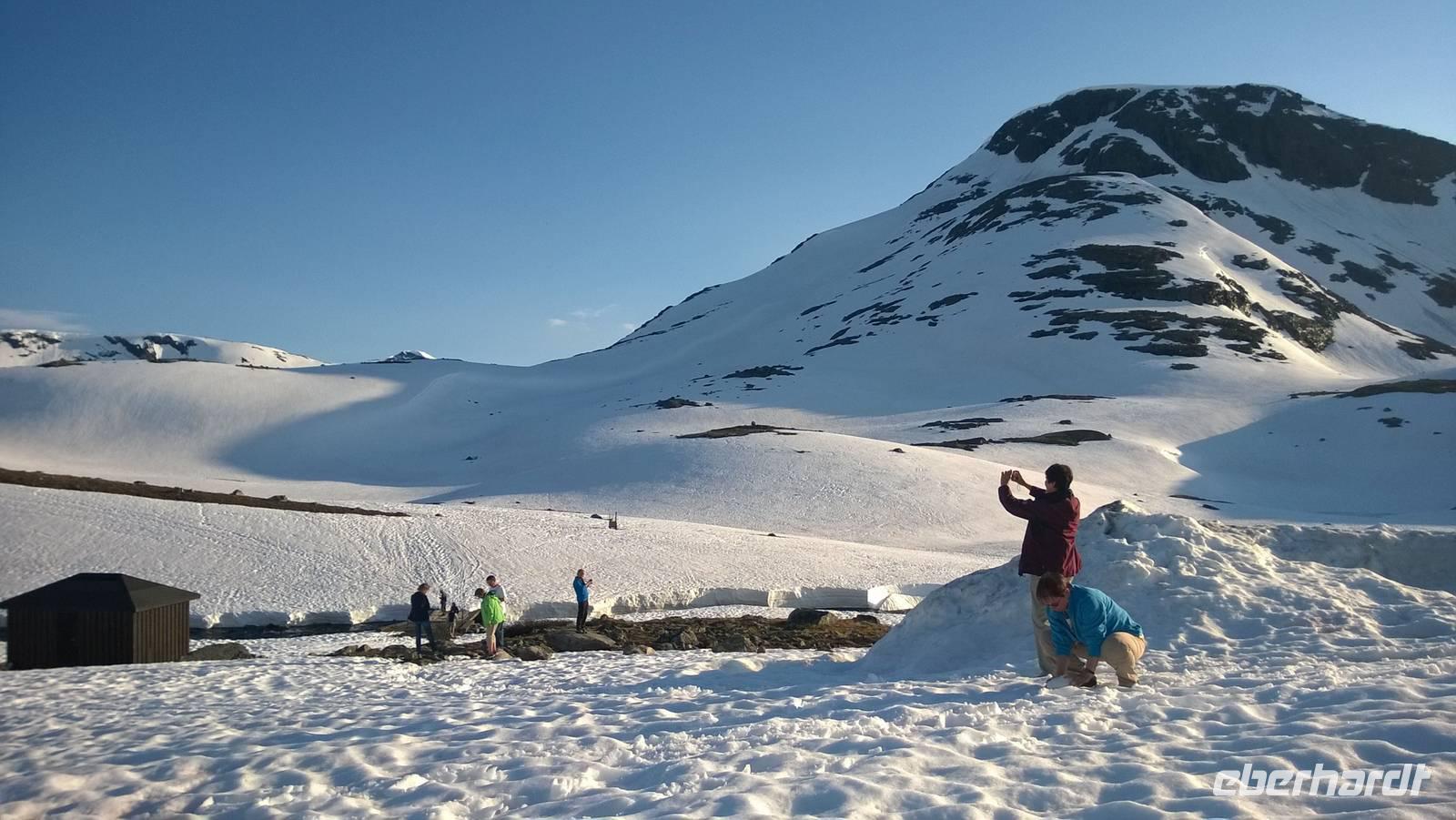 Aber schon bald führt uns die Reise gen Norden. Noch herrschen hochsommerliche Temperaturen. In Lom können wir noch einmal nach der Besichtigung der Stabkirche Sonne tanken und Eis schlecken. Aber schon 26 km später sieht das Eis ganz anders aus - waschechtes Eis und richtiger Schnee erwarten uns in den Bergen. Plötzlich biegt der Bus von der Panoramastraße „Sognefjellsvegen" scharf nach links ab, der Weg wird eng und holprig. Das sieht eher nach einem Witz aus! Hier sollen wir lang? Mit dem Bus? Eine Schranke wird für uns geöffnet und weiter fahren wir immer weiter nach oben, immer weiter in die Berge hinein. Schafe tummeln sich am Wegesrand, ab und an abenteuerlustige Camper, ansonsten keine Spuren mehr von Zivilisation. Schon die Anfahrt zu unserem Hotel ist ein kleines Abenteuer. Und als wir dann letzten Endes ankommen, stockt uns der Atem, so schön ist es hier! Die Berge, der Schnee, dazu scheint die Sonne und es ist warm! Nach dem Abendessen setzen wir doch tatsächlich eine Schnapsidee in die Tat um: Wir bauen Trolle aus Schnee und machen ein (unvollständiges) Gruppenfoto mit drei Trollen. Was für ein Spaß! Und was für ein schöner Blick!