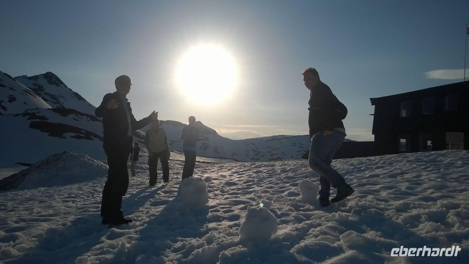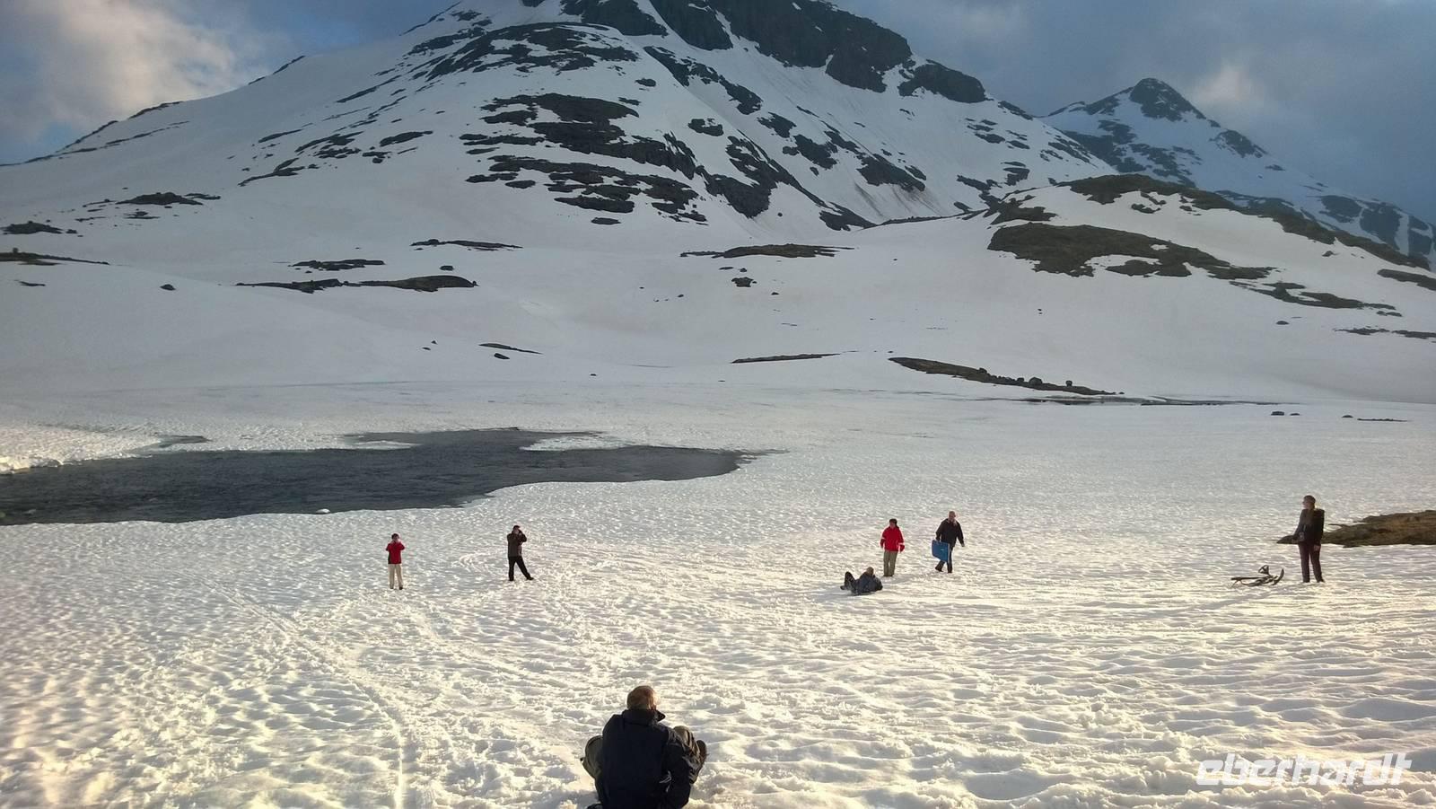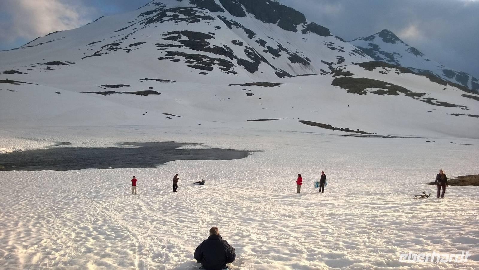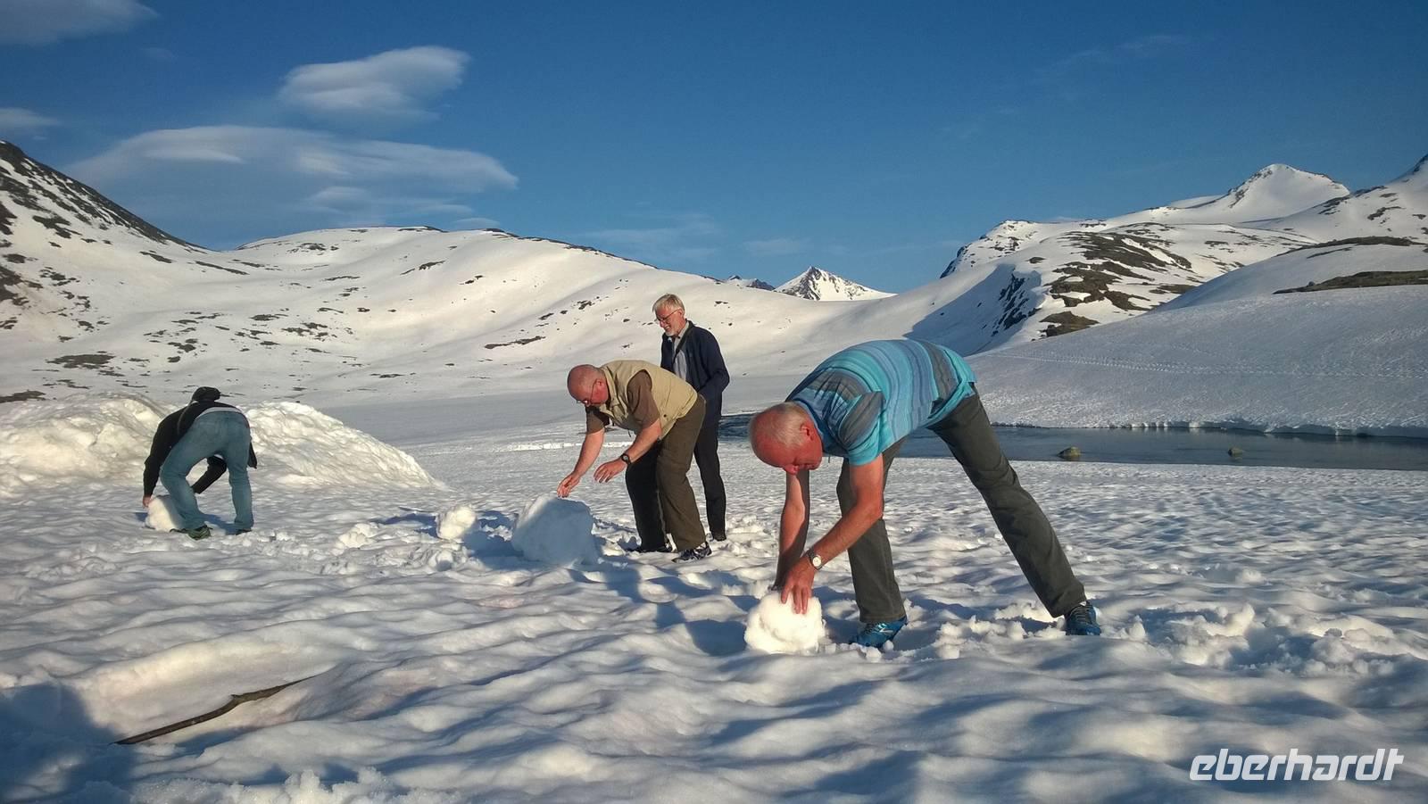 Aber schon bald führt uns die Reise gen Norden. Noch herrschen hochsommerliche Temperaturen. In Lom können wir noch einmal nach der Besichtigung der Stabkirche Sonne tanken und Eis schlecken. Aber schon 26 km später sieht das Eis ganz anders aus - waschechtes Eis und richtiger Schnee erwarten uns in den Bergen. Plötzlich biegt der Bus von der Panoramastraße „Sognefjellsvegen" scharf nach links ab, der Weg wird eng und holprig. Das sieht eher nach einem Witz aus! Hier sollen wir lang? Mit dem Bus? Eine Schranke wird für uns geöffnet und weiter fahren wir immer weiter nach oben, immer weiter in die Berge hinein. Schafe tummeln sich am Wegesrand, ab und an abenteuerlustige Camper, ansonsten keine Spuren mehr von Zivilisation. Schon die Anfahrt zu unserem Hotel ist ein kleines Abenteuer. Und als wir dann letzten Endes ankommen, stockt uns der Atem, so schön ist es hier! Die Berge, der Schnee, dazu scheint die Sonne und es ist warm! Nach dem Abendessen setzen wir doch tatsächlich eine Schnapsidee in die Tat um: Wir bauen Trolle aus Schnee und machen ein (unvollständiges) Gruppenfoto mit drei Trollen. Was für ein Spaß! Und was für ein schöner Blick!