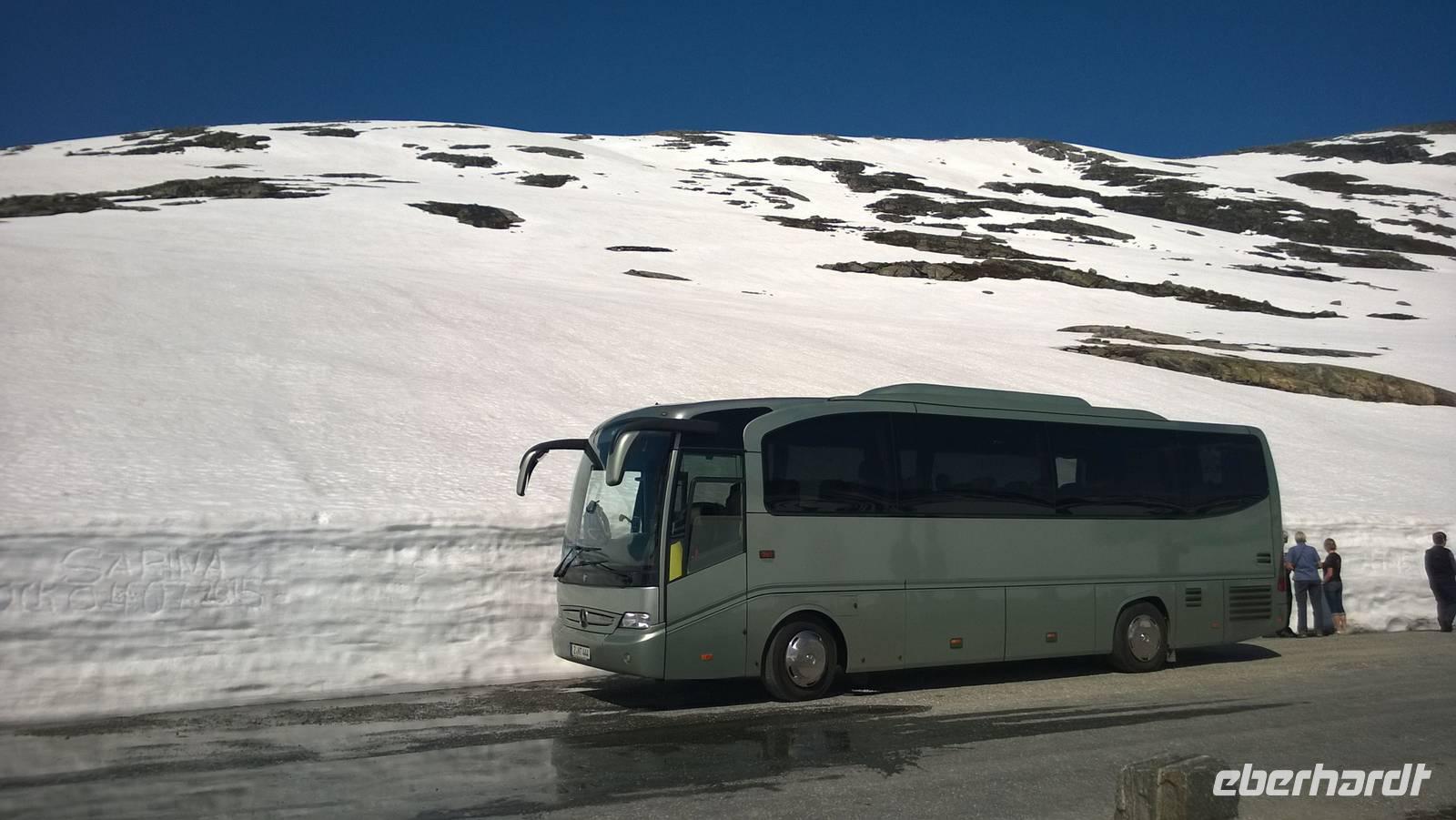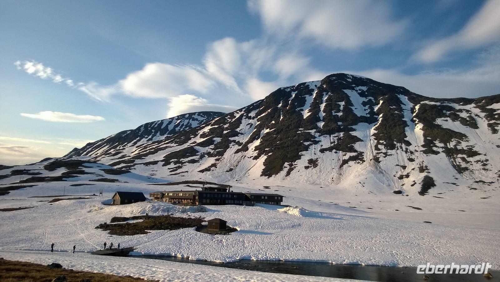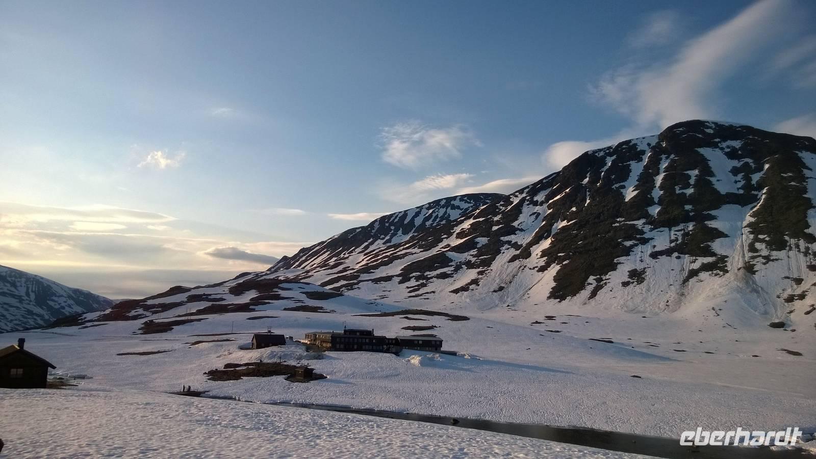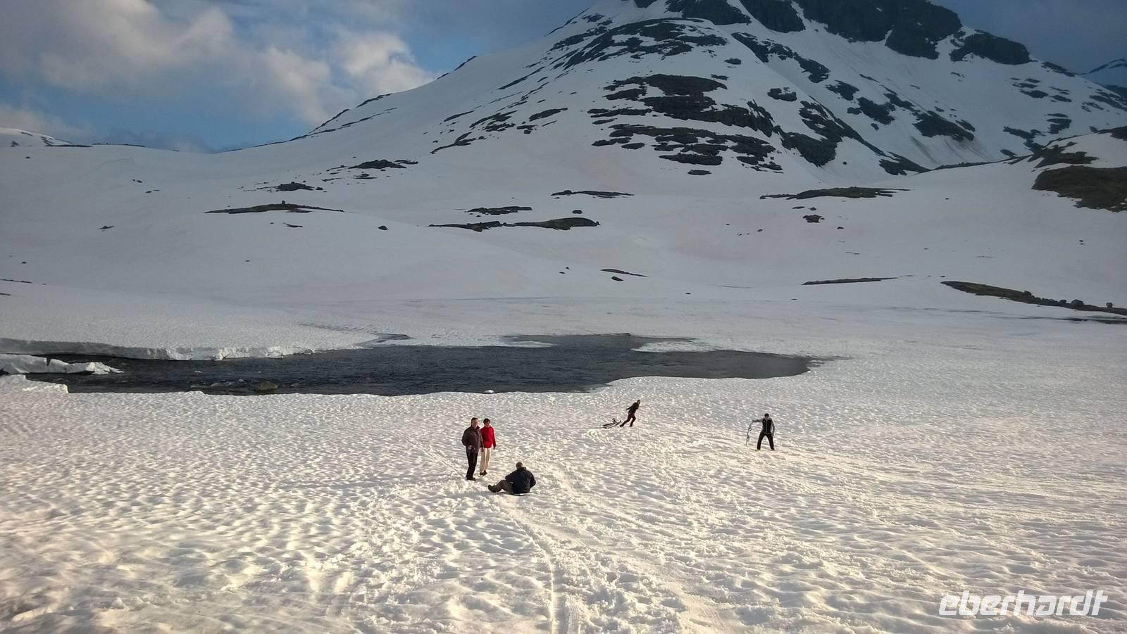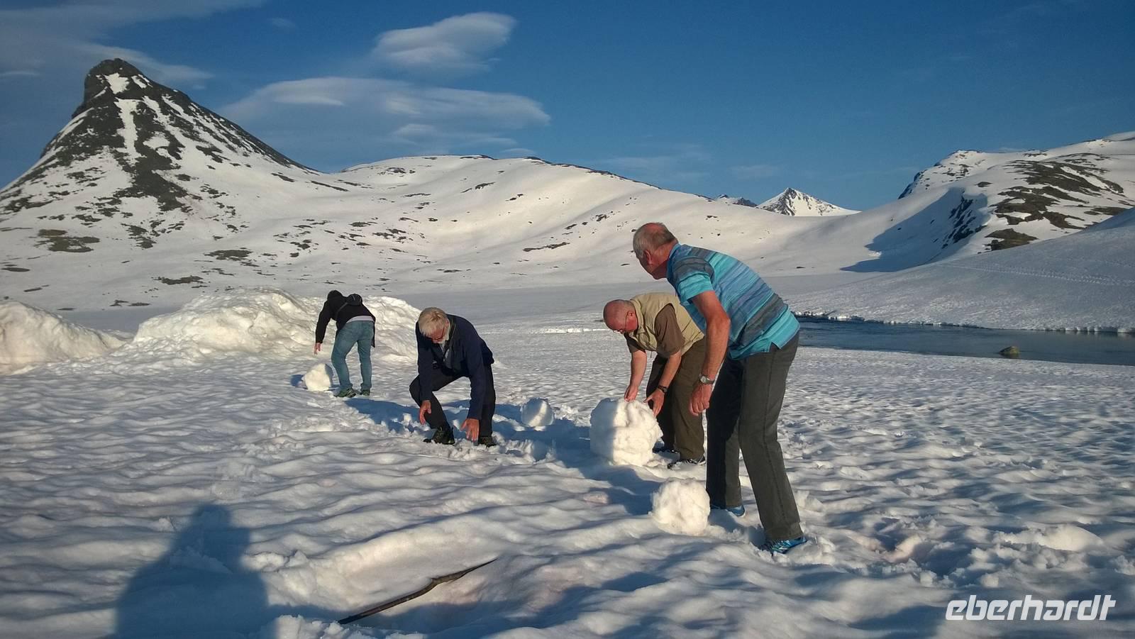 Aber schon bald führt uns die Reise gen Norden. Noch herrschen hochsommerliche Temperaturen. In Lom können wir noch einmal nach der Besichtigung der Stabkirche Sonne tanken und Eis schlecken. Aber schon 26 km später sieht das Eis ganz anders aus - waschechtes Eis und richtiger Schnee erwarten uns in den Bergen. Plötzlich biegt der Bus von der Panoramastraße „Sognefjellsvegen" scharf nach links ab, der Weg wird eng und holprig. Das sieht eher nach einem Witz aus! Hier sollen wir lang? Mit dem Bus? Eine Schranke wird für uns geöffnet und weiter fahren wir immer weiter nach oben, immer weiter in die Berge hinein. Schafe tummeln sich am Wegesrand, ab und an abenteuerlustige Camper, ansonsten keine Spuren mehr von Zivilisation. Schon die Anfahrt zu unserem Hotel ist ein kleines Abenteuer. Und als wir dann letzten Endes ankommen, stockt uns der Atem, so schön ist es hier! Die Berge, der Schnee, dazu scheint die Sonne und es ist warm! Nach dem Abendessen setzen wir doch tatsächlich eine Schnapsidee in die Tat um: Wir bauen Trolle aus Schnee und machen ein (unvollständiges) Gruppenfoto mit drei Trollen. Was für ein Spaß! Und was für ein schöner Blick!