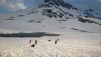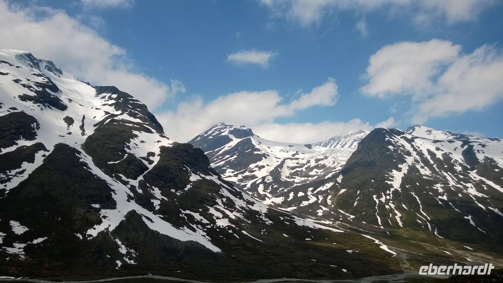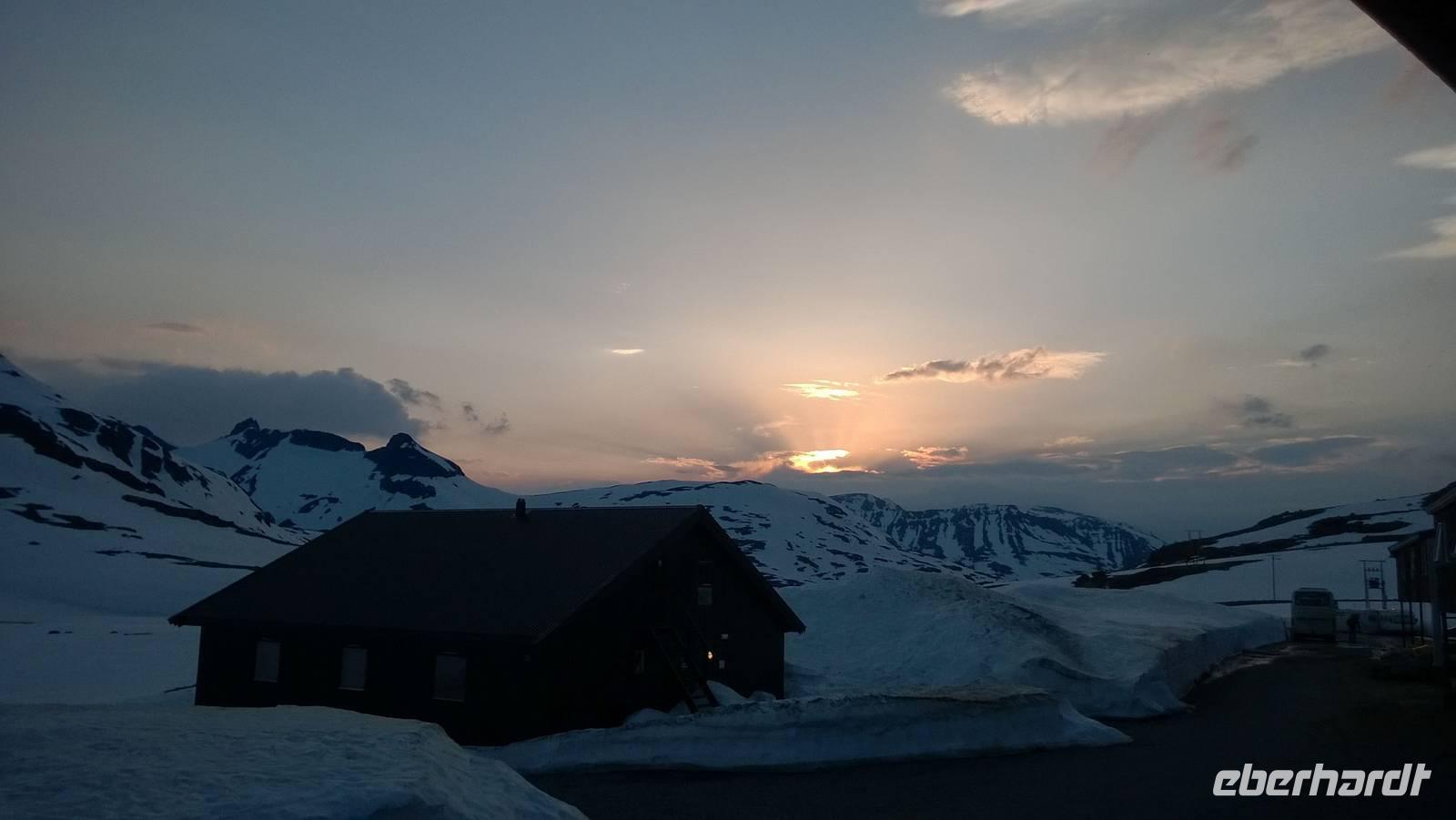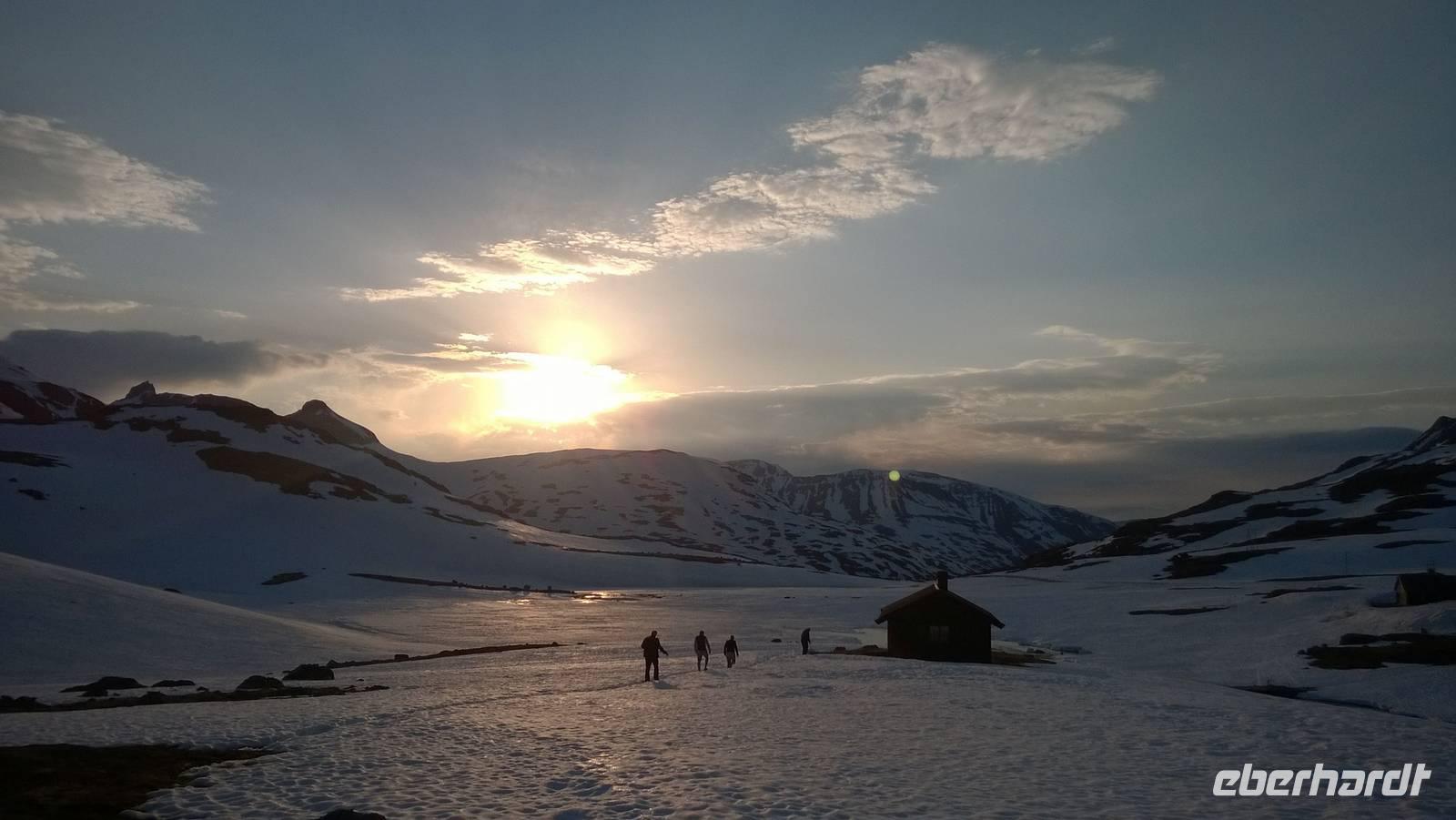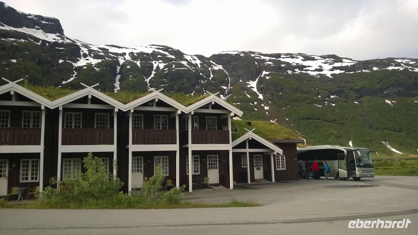 Aber schon bald führt uns die Reise gen Norden. Noch herrschen hochsommerliche Temperaturen. In Lom können wir noch einmal nach der Besichtigung der Stabkirche Sonne tanken und Eis schlecken. Aber schon 26 km später sieht das Eis ganz anders aus - waschechtes Eis und richtiger Schnee erwarten uns in den Bergen. Plötzlich biegt der Bus von der Panoramastraße „Sognefjellsvegen" scharf nach links ab, der Weg wird eng und holprig. Das sieht eher nach einem Witz aus! Hier sollen wir lang? Mit dem Bus? Eine Schranke wird für uns geöffnet und weiter fahren wir immer weiter nach oben, immer weiter in die Berge hinein. Schafe tummeln sich am Wegesrand, ab und an abenteuerlustige Camper, ansonsten keine Spuren mehr von Zivilisation. Schon die Anfahrt zu unserem Hotel ist ein kleines Abenteuer. Und als wir dann letzten Endes ankommen, stockt uns der Atem, so schön ist es hier! Die Berge, der Schnee, dazu scheint die Sonne und es ist warm! Nach dem Abendessen setzen wir doch tatsächlich eine Schnapsidee in die Tat um: Wir bauen Trolle aus Schnee und machen ein (unvollständiges) Gruppenfoto mit drei Trollen. Was für ein Spaß! Und was für ein schöner Blick!