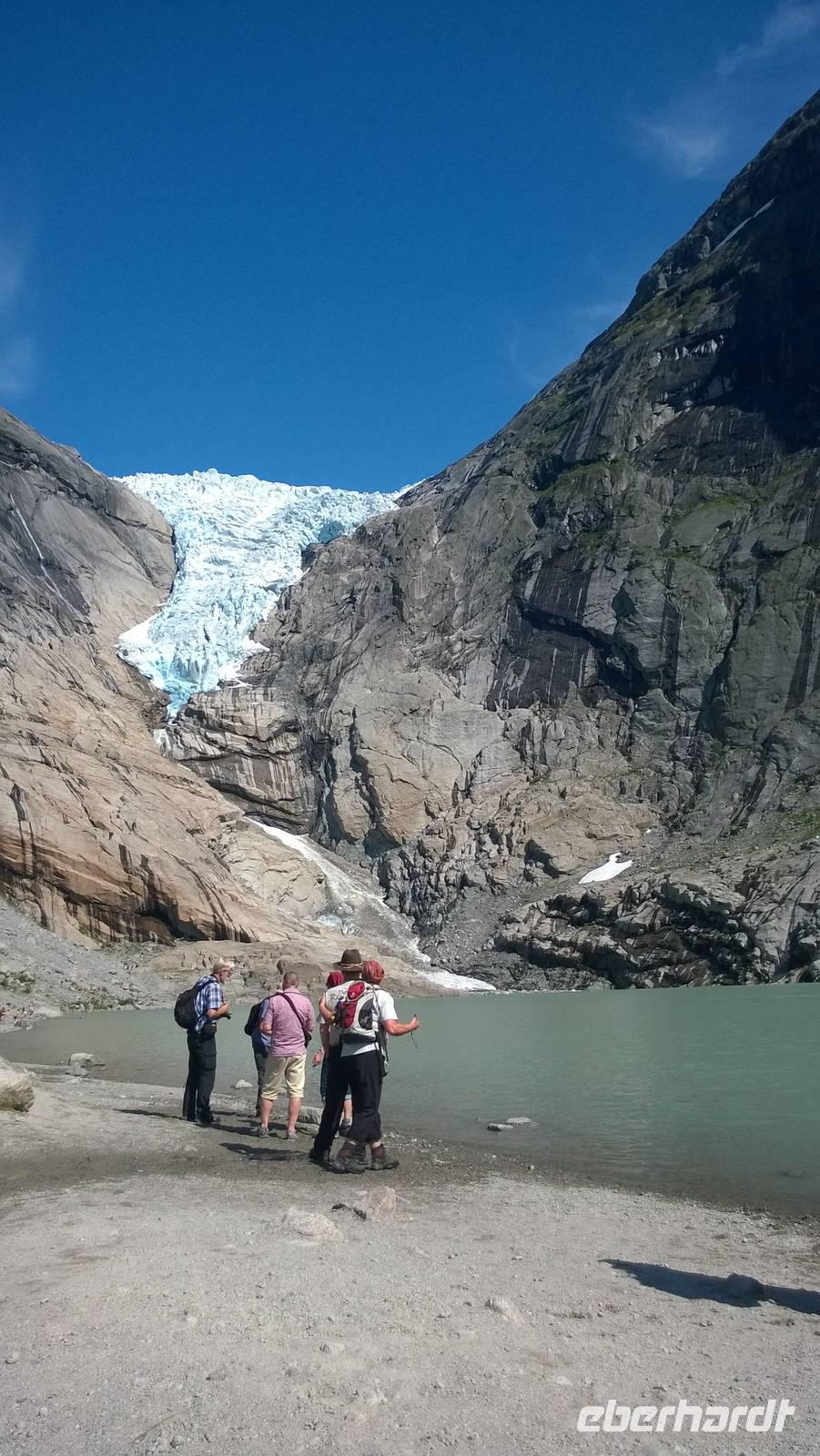 Der Abschied von unserem Heim in den weißen Bergen fällt schwer. Doch neue Erlebnisse locken und so fahren wir über verschlungene Wege durch allerschönste Landschaft. Der „Gamle Strynsfjellsvegen" führt durch eine weiße Bergwelt. Rechts des Busses türmen sich die Schneewände teilweise höher als der Bus, links von uns vermuten wir Bergseen unter einer dicken Schneeschicht und später passieren wir noch ein Sommerskigebiet. Doch irgendwann sind die hohen Berge überquert und wir fahren ins Tal zum Fjord. Immer am Innviksfjord vorbei geht's zum Briskedalsbreen, einer Gletscherzunge, die zum großen Jostedalsbreen gehört. Hier wandern wir ein Stück zum Gletscher und genießen dort die Sonne und gleichzeitig, die kühle Luft. Schließlich fahren wir gemächlich durch diese Traumlandschaft zu unserem Hotel in Loen, welches direkt am Wasser liegt und uns für die nächsten drei Tage ein komfortables Heim bietet.