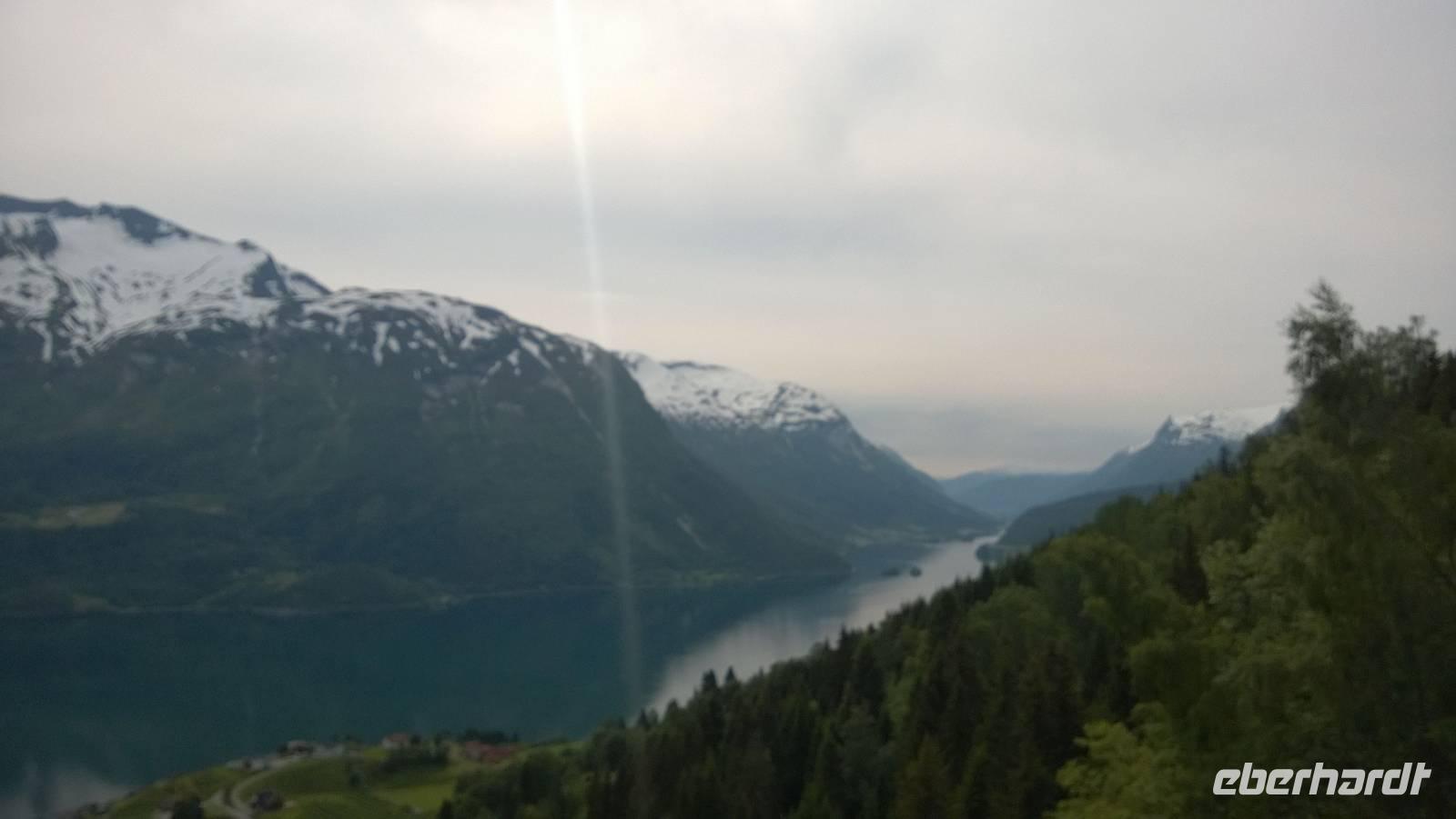 Höhepunkte hat unsere Reise ja viele, aber die heutige Fahrt über den Geiranger-Fjord hat den Superlativ, die Nummer 1 aller Höhepunkte zu sein, wohl verdient. Schon früh machen wir uns auf die Socken, um vom Aussichtspunkt Dalsnibba auf die Fjordlandschaft zu schauen. Während der kleinen Fjordkreuzfahrt kommen wir dann aus dem Staunen und Schauen und Fotos schießen nicht mehr heraus. Unglaublich schön ist es hier! Doch alles hat ein Ende und so gehen wir in Hellesylt an Land, um nach Videseter zu fahren. Von hier starten wir eine eher leichte Wanderung auf dem Flofjellweg ins kleine Örtchen Flo. Bis kurz vor dem Ziel ist es eigentlich eher ein entspannender Spaziergang, doch dann wartet doch noch mal eine Herausforderung auf uns. Der Weg geht steil bergab ins Tal und wir laufen und schlittern über Geröll und mit murrenden Knien.