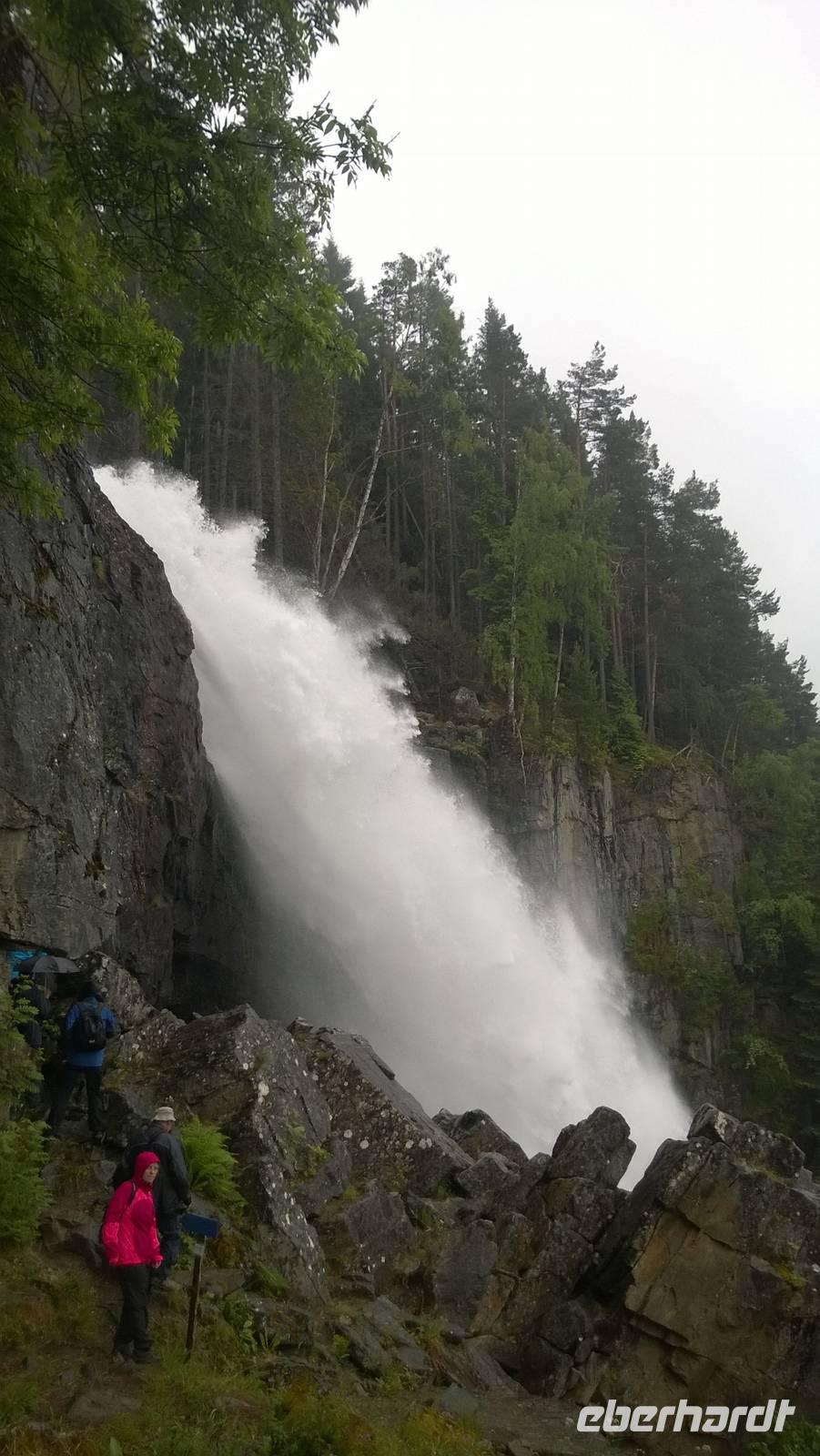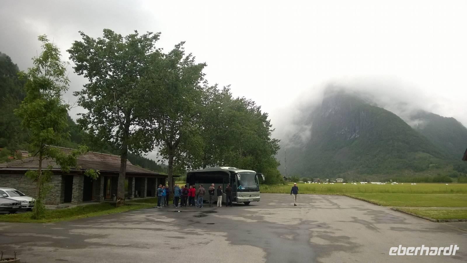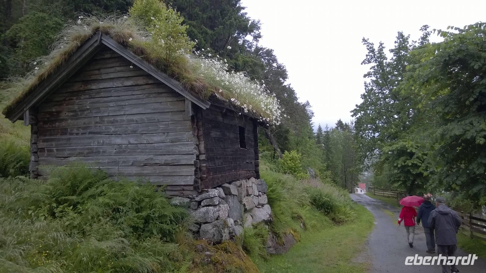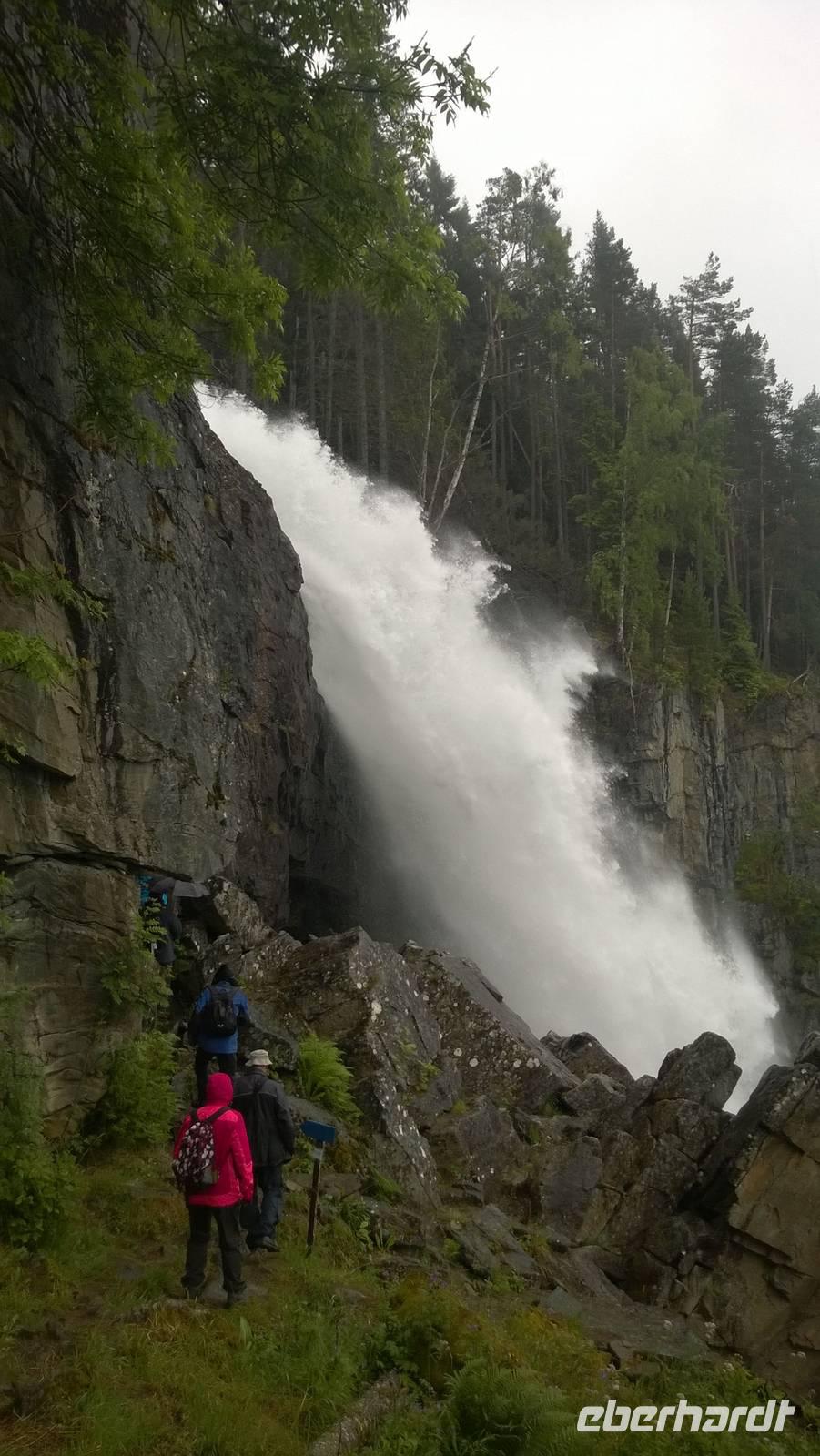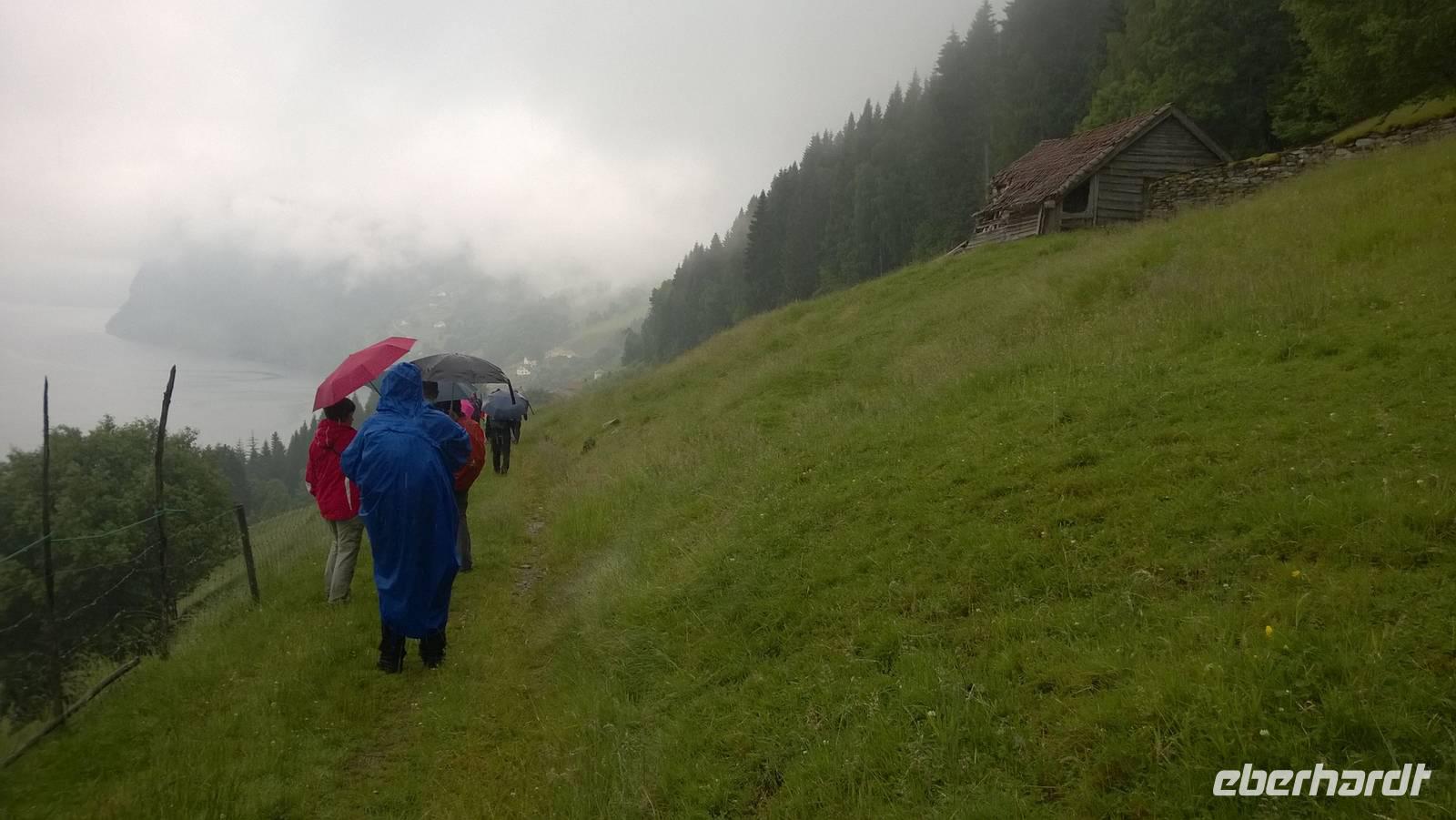 Welch ein Glück wir bis jetzt mit dem Wetter hatten, merken wir besonders heute, wo es beinah ohne Unterbrechung regnet und kühl ist. Wandern im Regen ist so eine Sache. Wir haben unsere Wanderstiefel aber trotz allem fest geschnürt und sind für jedes Wetter gewappnet. Zunächst erwandern wir den Wasserfall Tvinnefossen, hinter den man auch gehen kann. Ganz schön beeindruckend, diese Wassermassen! Von dort aus wagen wir ein kleines, matschiges Abenteuer: auf einem Waldweg schlittern wir den Berg heraub und hangeln uns von Baum zu Baum. Schließlich erwartet uns der Bauer Jakob schon am Hintereingang seines Grundstücks und führt uns über seine Wiesen auf den Hof. Er zeigt und erklärt viel darüber, wie hier früher und teilweise auch noch heute gewirtschaftet wurde. Als Belohnung für die mutige Wanderung wartet eine Dame aus dem Ort weiter unten am Kai schon mit Svele - eine Mischung aus Waffeln und Pfannkuchen - und Kaffee auf uns. Die lassen wir uns gut schmecken und wärmen uns derweil gut auf, denn unser Wandertag ist noch nicht beendet. Noch zwei kleine Wanderungen am alten Sägewerk und auf dem ehemaligen Postweg unternehmen wir trotz des Regens. Am Ende des Tages sind dann aber alle heilfroh, im warmen und trockenen Hotel anzukommen.
