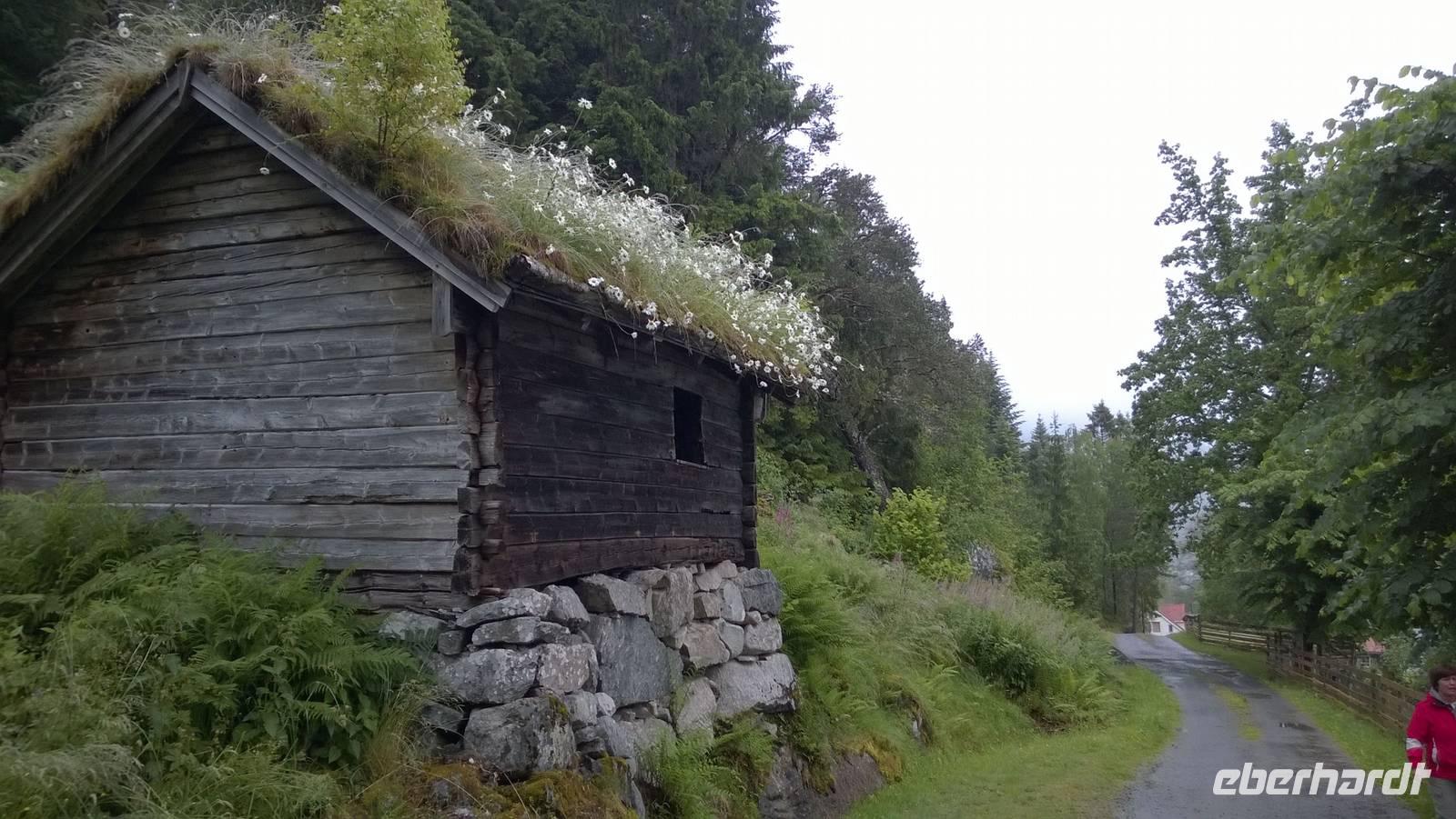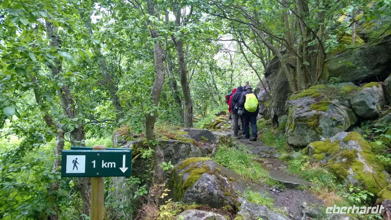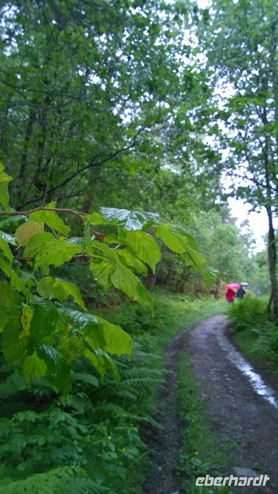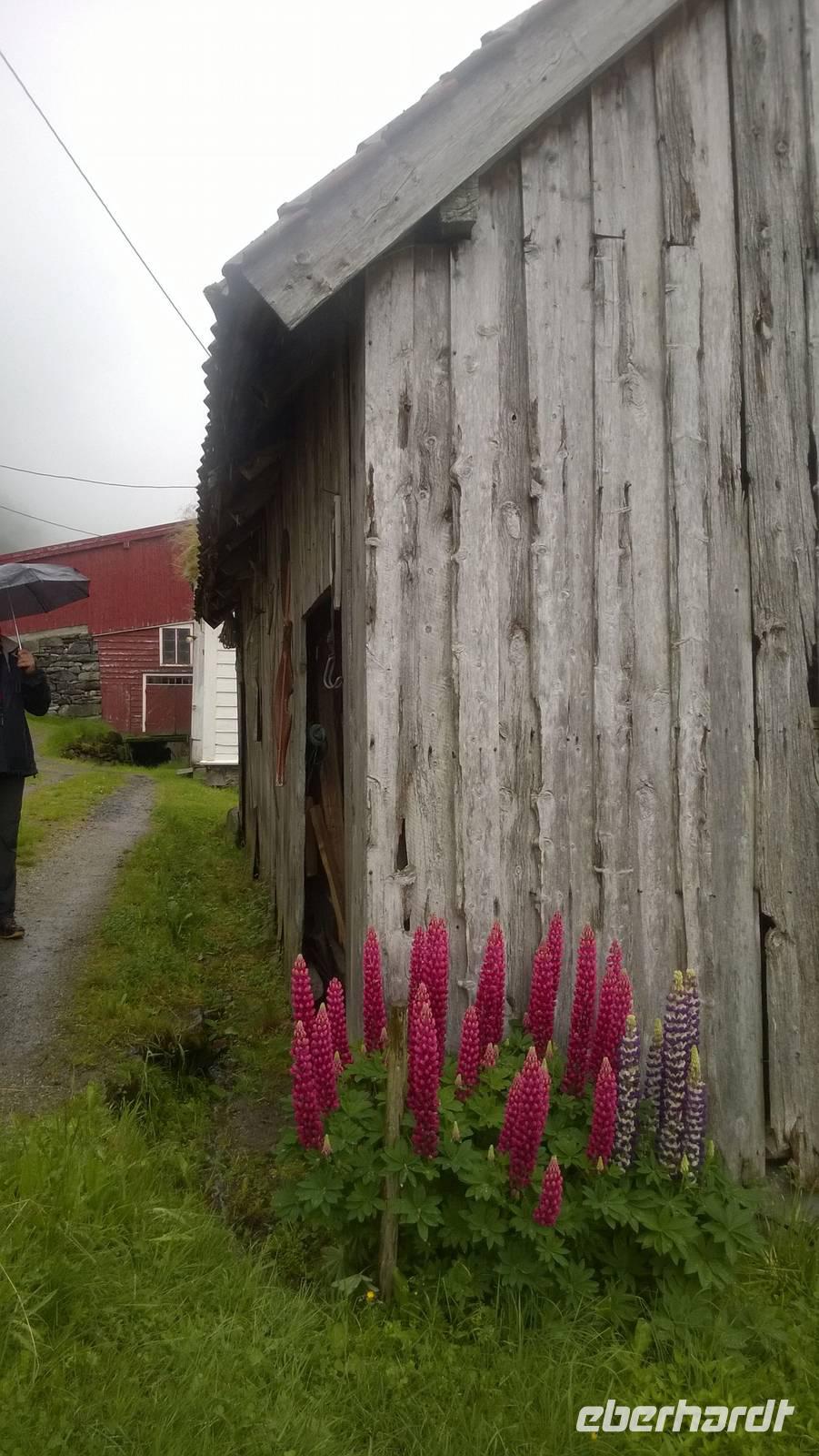 Welch ein Glück wir bis jetzt mit dem Wetter hatten, merken wir besonders heute, wo es beinah ohne Unterbrechung regnet und kühl ist. Wandern im Regen ist so eine Sache. Wir haben unsere Wanderstiefel aber trotz allem fest geschnürt und sind für jedes Wetter gewappnet. Zunächst erwandern wir den Wasserfall Tvinnefossen, hinter den man auch gehen kann. Ganz schön beeindruckend, diese Wassermassen! Von dort aus wagen wir ein kleines, matschiges Abenteuer: auf einem Waldweg schlittern wir den Berg heraub und hangeln uns von Baum zu Baum. Schließlich erwartet uns der Bauer Jakob schon am Hintereingang seines Grundstücks und führt uns über seine Wiesen auf den Hof. Er zeigt und erklärt viel darüber, wie hier früher und teilweise auch noch heute gewirtschaftet wurde. Als Belohnung für die mutige Wanderung wartet eine Dame aus dem Ort weiter unten am Kai schon mit Svele - eine Mischung aus Waffeln und Pfannkuchen - und Kaffee auf uns. Die lassen wir uns gut schmecken und wärmen uns derweil gut auf, denn unser Wandertag ist noch nicht beendet. Noch zwei kleine Wanderungen am alten Sägewerk und auf dem ehemaligen Postweg unternehmen wir trotz des Regens. Am Ende des Tages sind dann aber alle heilfroh, im warmen und trockenen Hotel anzukommen.
