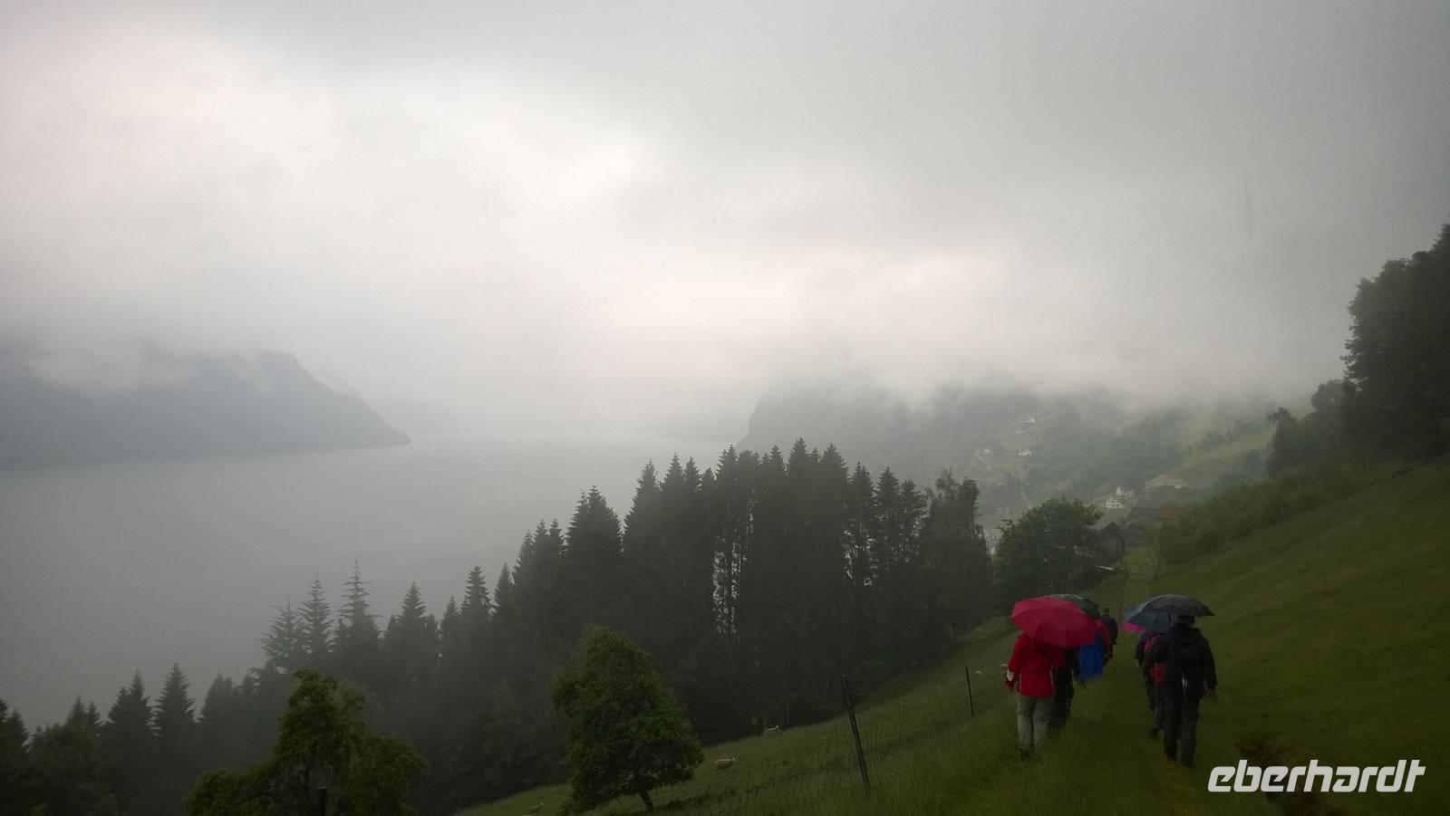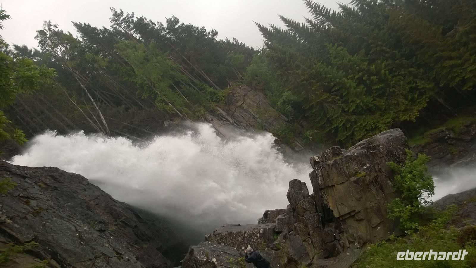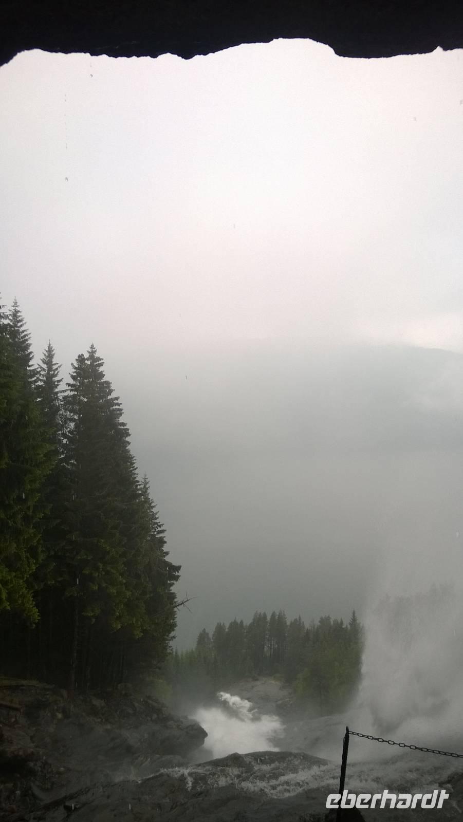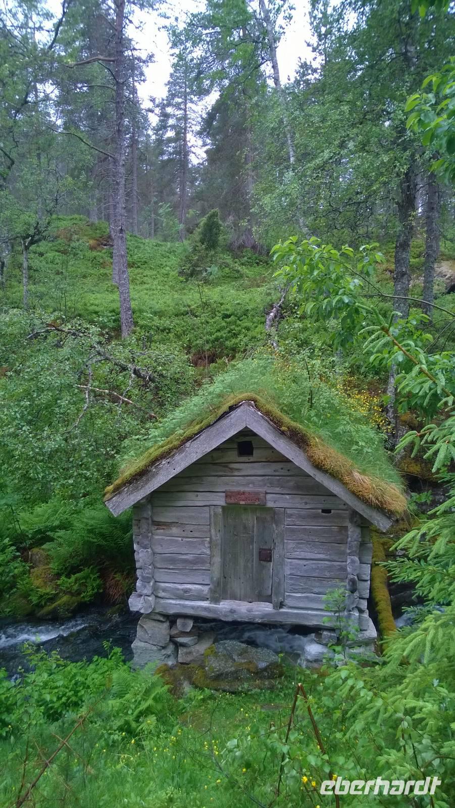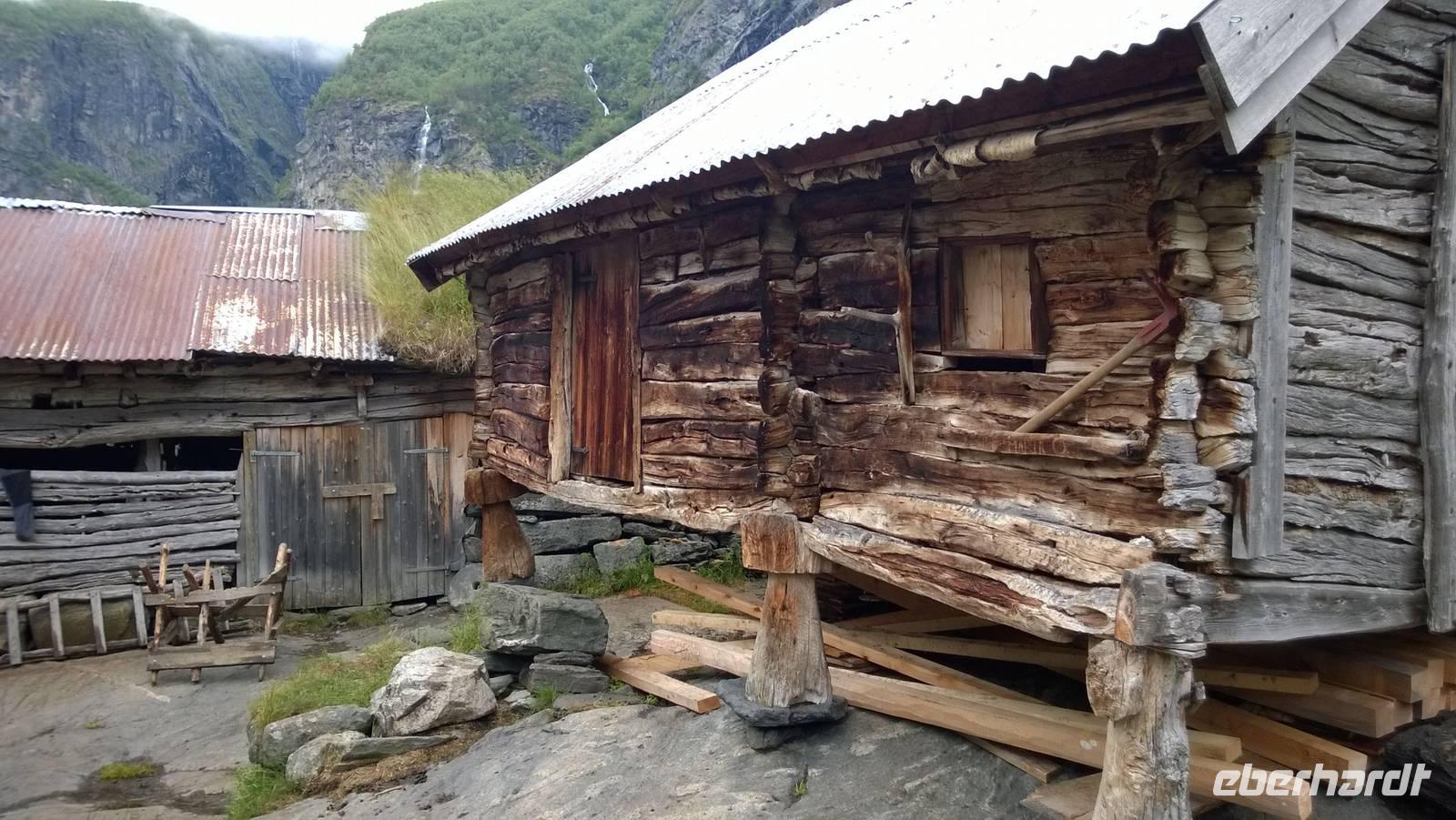 Welch ein Glück wir bis jetzt mit dem Wetter hatten, merken wir besonders heute, wo es beinah ohne Unterbrechung regnet und kühl ist. Wandern im Regen ist so eine Sache. Wir haben unsere Wanderstiefel aber trotz allem fest geschnürt und sind für jedes Wetter gewappnet. Zunächst erwandern wir den Wasserfall Tvinnefossen, hinter den man auch gehen kann. Ganz schön beeindruckend, diese Wassermassen! Von dort aus wagen wir ein kleines, matschiges Abenteuer: auf einem Waldweg schlittern wir den Berg heraub und hangeln uns von Baum zu Baum. Schließlich erwartet uns der Bauer Jakob schon am Hintereingang seines Grundstücks und führt uns über seine Wiesen auf den Hof. Er zeigt und erklärt viel darüber, wie hier früher und teilweise auch noch heute gewirtschaftet wurde. Als Belohnung für die mutige Wanderung wartet eine Dame aus dem Ort weiter unten am Kai schon mit Svele - eine Mischung aus Waffeln und Pfannkuchen - und Kaffee auf uns. Die lassen wir uns gut schmecken und wärmen uns derweil gut auf, denn unser Wandertag ist noch nicht beendet. Noch zwei kleine Wanderungen am alten Sägewerk und auf dem ehemaligen Postweg unternehmen wir trotz des Regens. Am Ende des Tages sind dann aber alle heilfroh, im warmen und trockenen Hotel anzukommen.