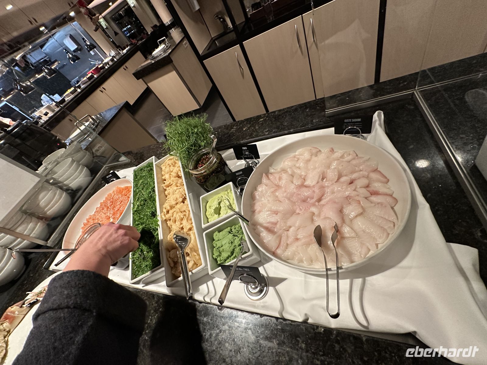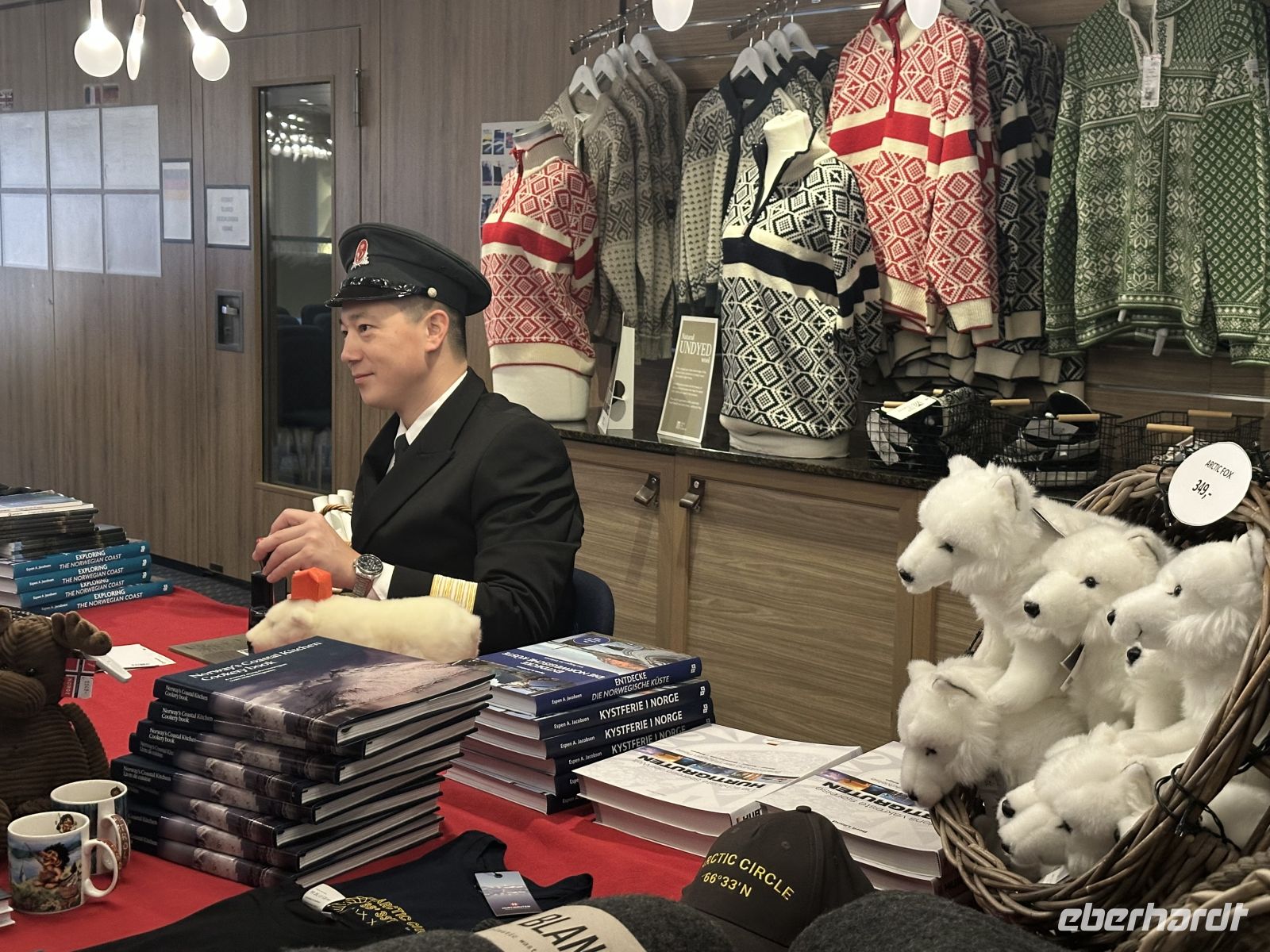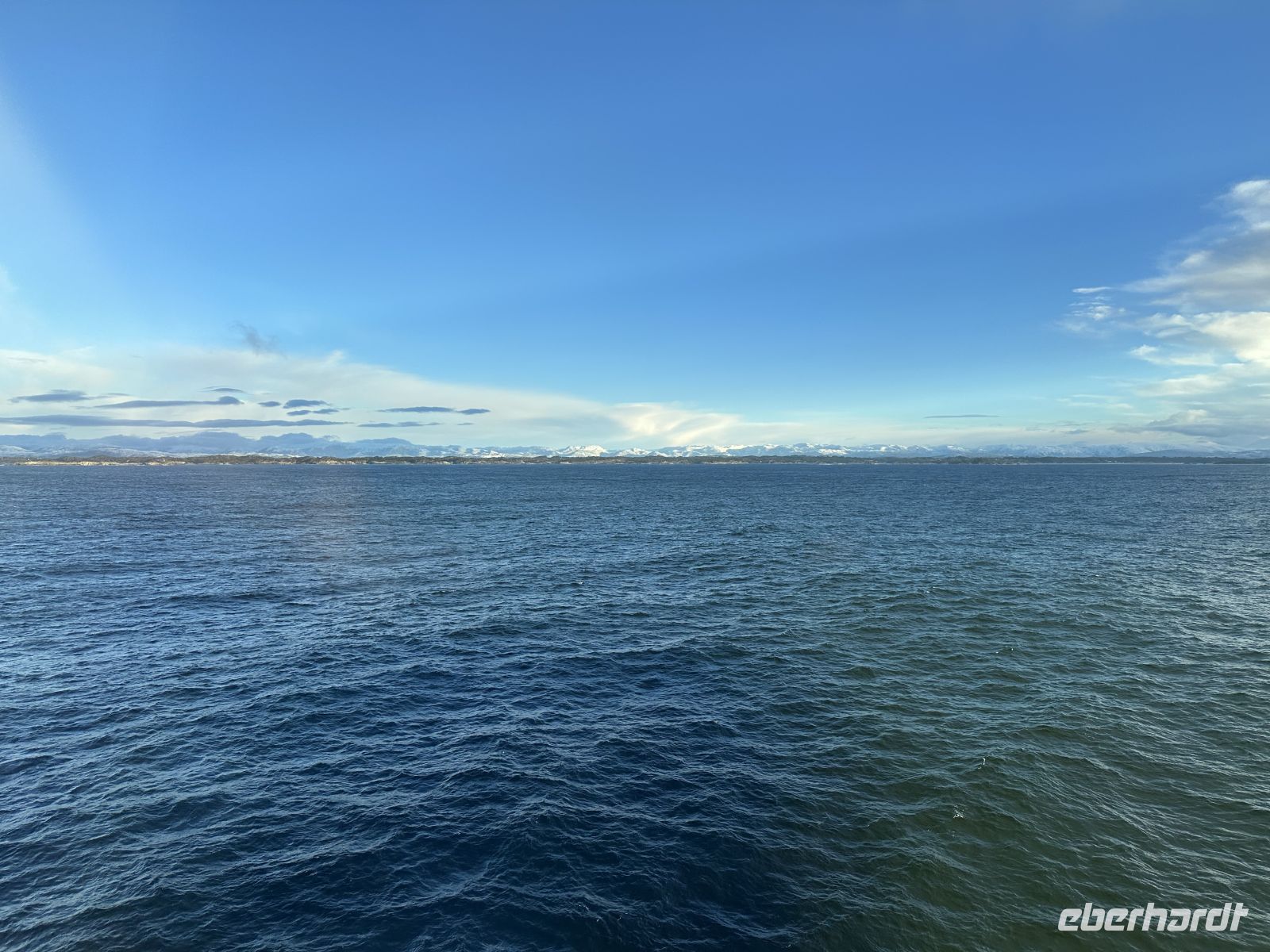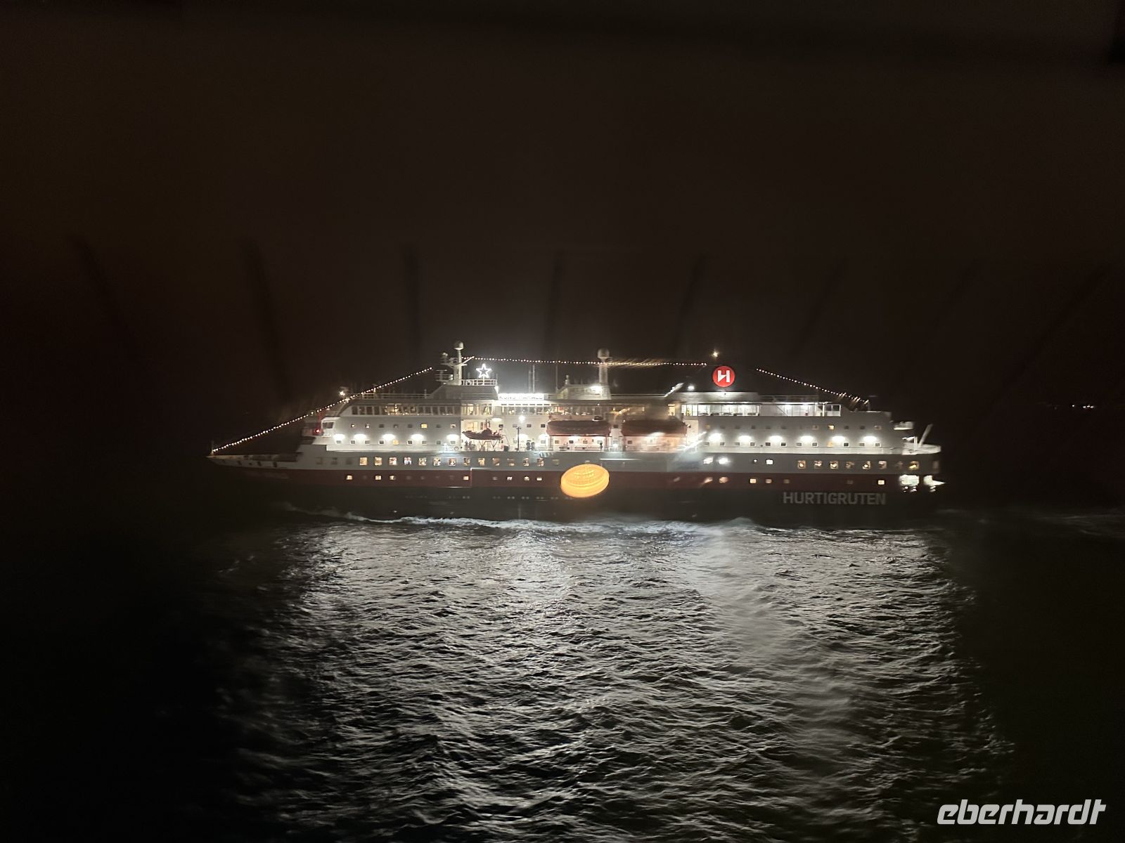 Nach dem Ablegen wartet eine Passage auf offener See auf uns. Das Wetter fordert seinen Tribut: Das Restaurant bleibt am Abend halb leer, da viele Mitreisende mit Seekrankheit kämpfen. Zudem macht ein Erkältungsvirus an Bord die Runde. Wer standhaft geblieben ist, genießt ein opulentes Weihnachtsbuffet: Viel Fleisch (wie das typische Pinnekjøtt) und der berühmte Stockfisch. Meeresfrüchte-Satt: Lachs, feine Fischspezialitäten, Muscheln und beeindruckende Krabbenbeine.