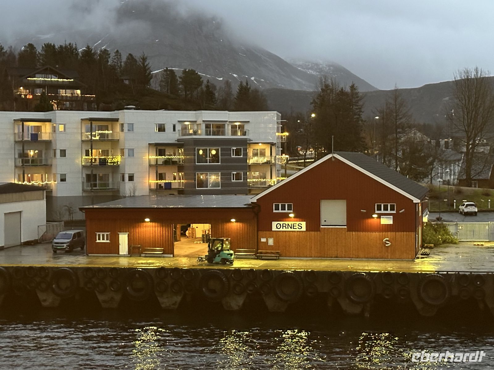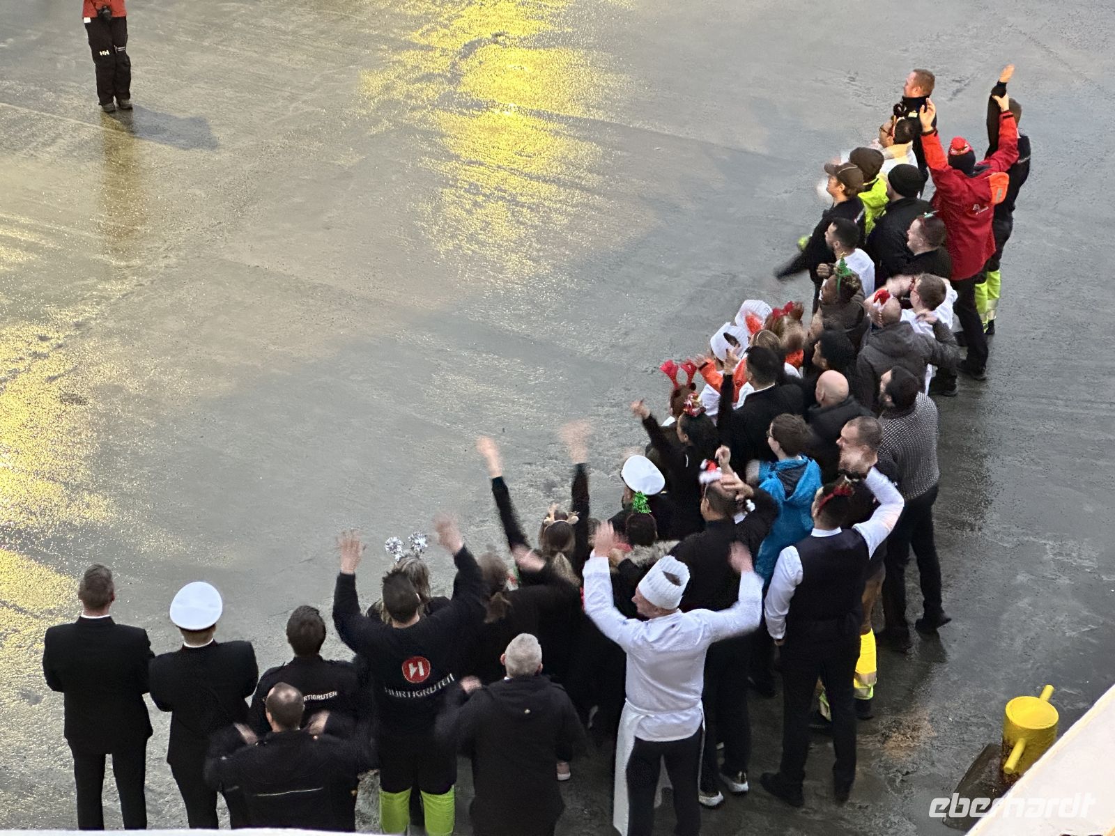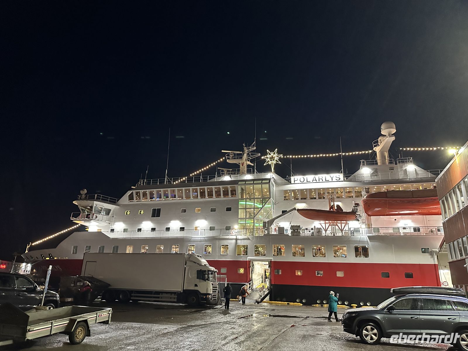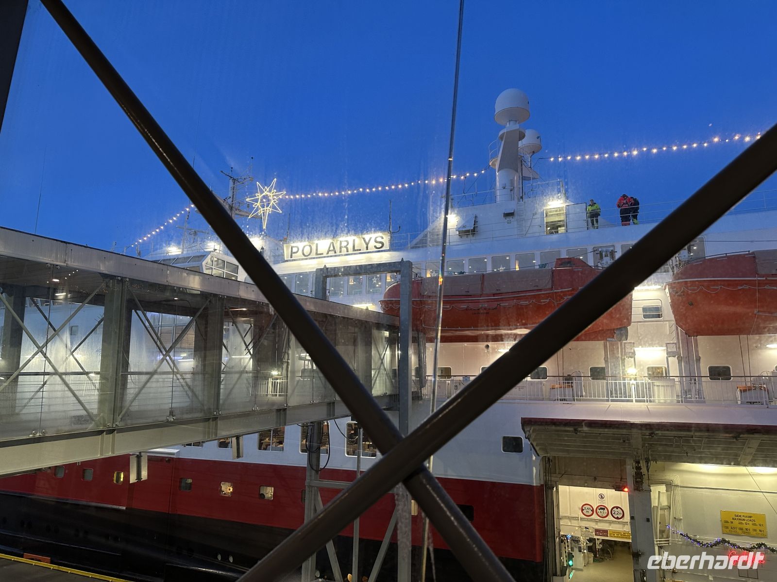 Der heutige Heiligabend beginnt mit einem echten Spektakel: Um 10:30 Uhr findet die Polarkreistaufe statt. Meeresgott Njord persönlich gibt uns die Ehre. Wer mutig genug ist, lässt sich eine Kelle Eiswürfel in den Nacken schütten – eine Tradition, die wir mit einem anschließenden Schnaps und viel Spaß feiern. Auch für die Post ist gesorgt: Der Postmann kommt extra an Bord, damit wir unsere Weihnachtskarten mit dem begehrten Polarkreis-Sonderstempel versehen können. Wer möchte, hilft danach beim Schmücken des Weihnachtsbaums, während das Schiff langsam auf Bodø zusteuert. Um 13:00 Uhr laufen wir in den Hafen ein. Die geplante Fackelwanderung zur Kirche gestaltet sich als Herausforderung: Es ist extrem windig, und die Flammen haben gegen die Böen einen schweren Stand. Dennoch machen wir uns auf den Weg. Der Gottesdienst um 14:00 Uhr ist so gut besucht, dass die Kirche aus allen Nähten platzt – nicht jeder findet einen Platz im Inneren.