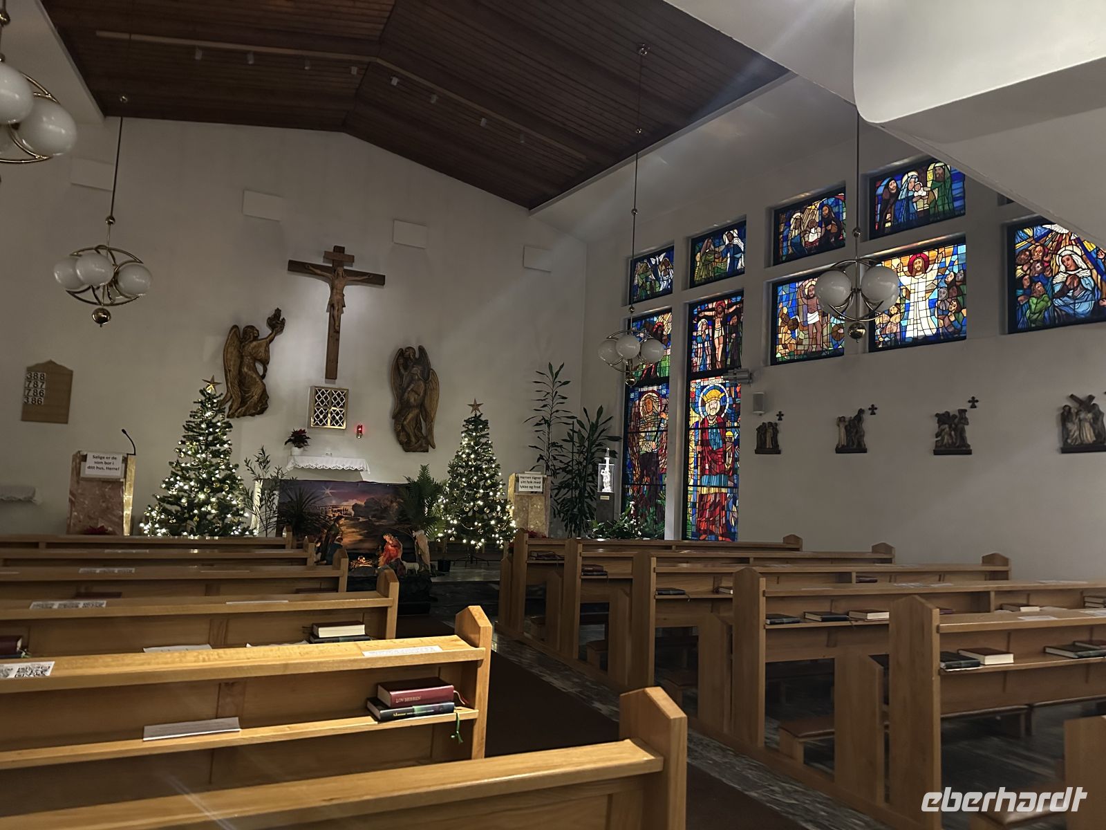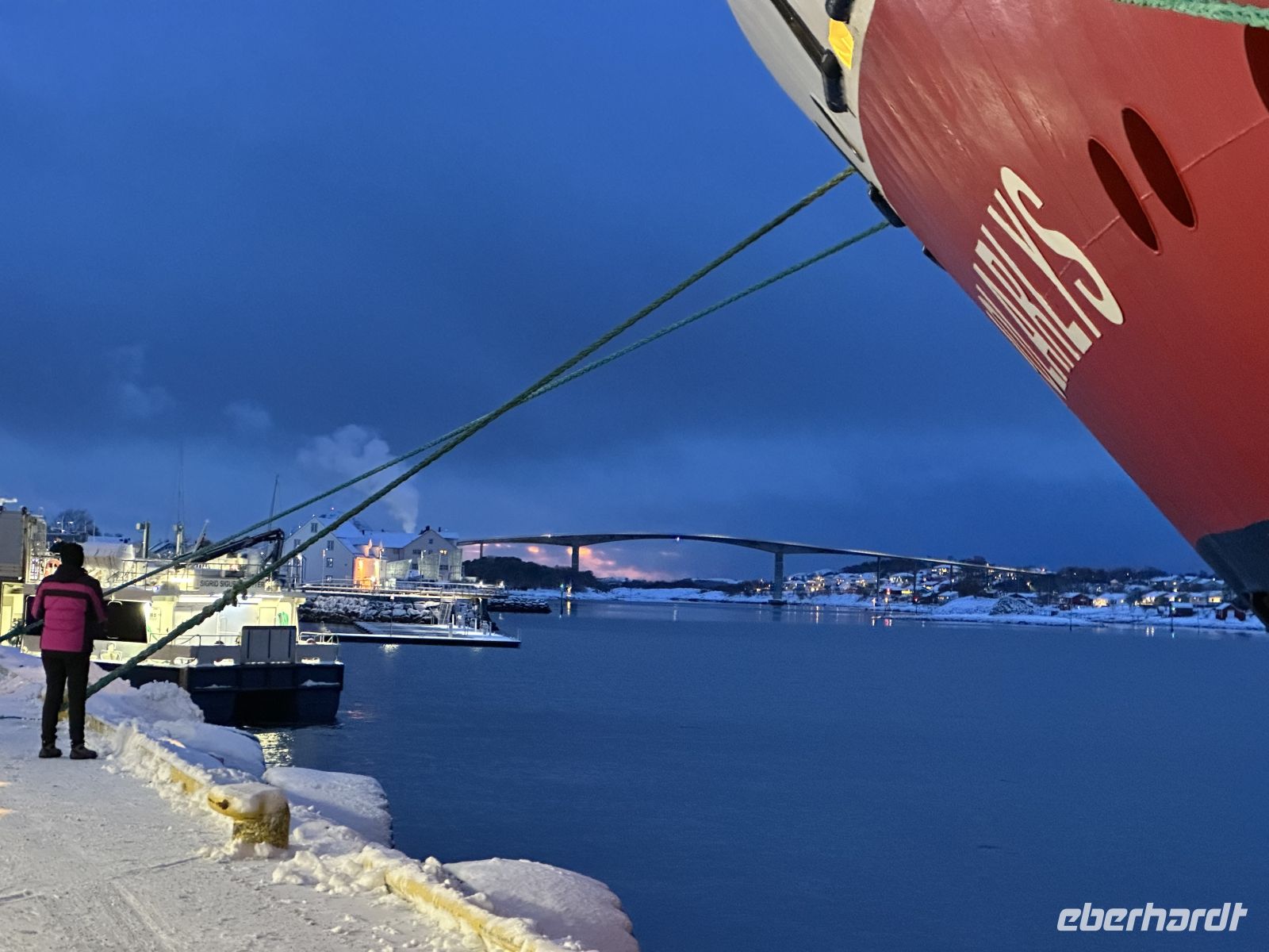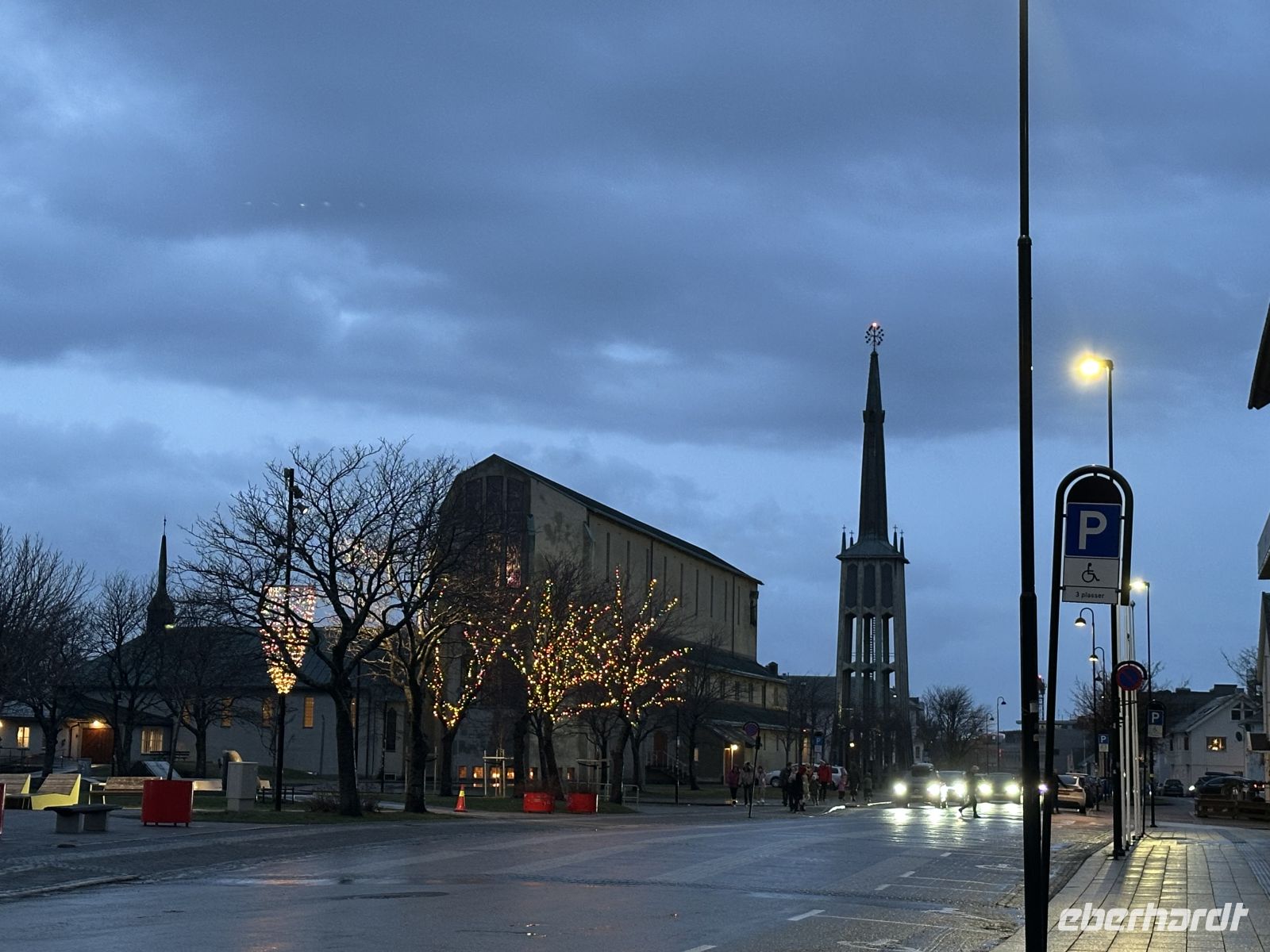 Der heutige Heiligabend beginnt mit einem echten Spektakel: Um 10:30 Uhr findet die Polarkreistaufe statt. Meeresgott Njord persönlich gibt uns die Ehre. Wer mutig genug ist, lässt sich eine Kelle Eiswürfel in den Nacken schütten – eine Tradition, die wir mit einem anschließenden Schnaps und viel Spaß feiern. Auch für die Post ist gesorgt: Der Postmann kommt extra an Bord, damit wir unsere Weihnachtskarten mit dem begehrten Polarkreis-Sonderstempel versehen können. Wer möchte, hilft danach beim Schmücken des Weihnachtsbaums, während das Schiff langsam auf Bodø zusteuert. Um 13:00 Uhr laufen wir in den Hafen ein. Die geplante Fackelwanderung zur Kirche gestaltet sich als Herausforderung: Es ist extrem windig, und die Flammen haben gegen die Böen einen schweren Stand. Dennoch machen wir uns auf den Weg. Der Gottesdienst um 14:00 Uhr ist so gut besucht, dass die Kirche aus allen Nähten platzt – nicht jeder findet einen Platz im Inneren.
