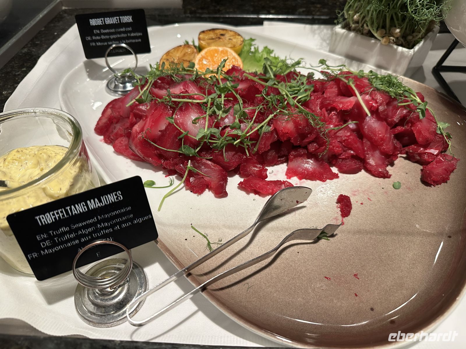 Wir beginnen mit Heilbutt-Ceviche & Sanddorn: Ein frischer Auftakt mit mariniertem Heilbutt, serviert mit Gurke, roten Zwiebeln, Küstenkräutern und einer Emulsion aus kaltgepresstem Rapsöl, garniert mit knusprigen Roggenchips. Gefolgt von Sellerie & Trüffel-Alge: Ein cremiges Selleriepüree mit gerösteten Haselnüssen, Trüffelalgen-Vinaigrette und eingelegten Waldpilzen, verfeinert mit Kräuterkresse und getrocknetem Sellerie. Zum Hauptgang wird ein Kalbsfilet mit Arktischer Preiselbeere, Roter Bete und Rahmwirsing aus der Region Helgeland gereicht. Zum Abschluss gibt es Blauschimmelkäse aus Tingvoll, eine feine Käsespezialität, kombiniert mit karamellisierter Birne, gerösteten Walnüssen und Honig von lokalen Imkern sowie eine Schokoladenterrine mit Whisky und Vanille, ein krönender Abschluss, mit norwegischem Whisky aromatisiert, serviert mit Vanillecreme und kandierten Nüssen. Passend dazu werden edle Tropfen gereicht – vom Champagner Ayala als Empfehlung zum Start über Sancerre und Barbera bis hin zum Portwein Kopke LBV als Begleitung zum Dessert. Gut gestärkt und in feierlicher Stimmung bereiten wir uns nach diesem Schlemmermahl auf die Hutparade und das nahende Feuerwerk in Ålesund vor.