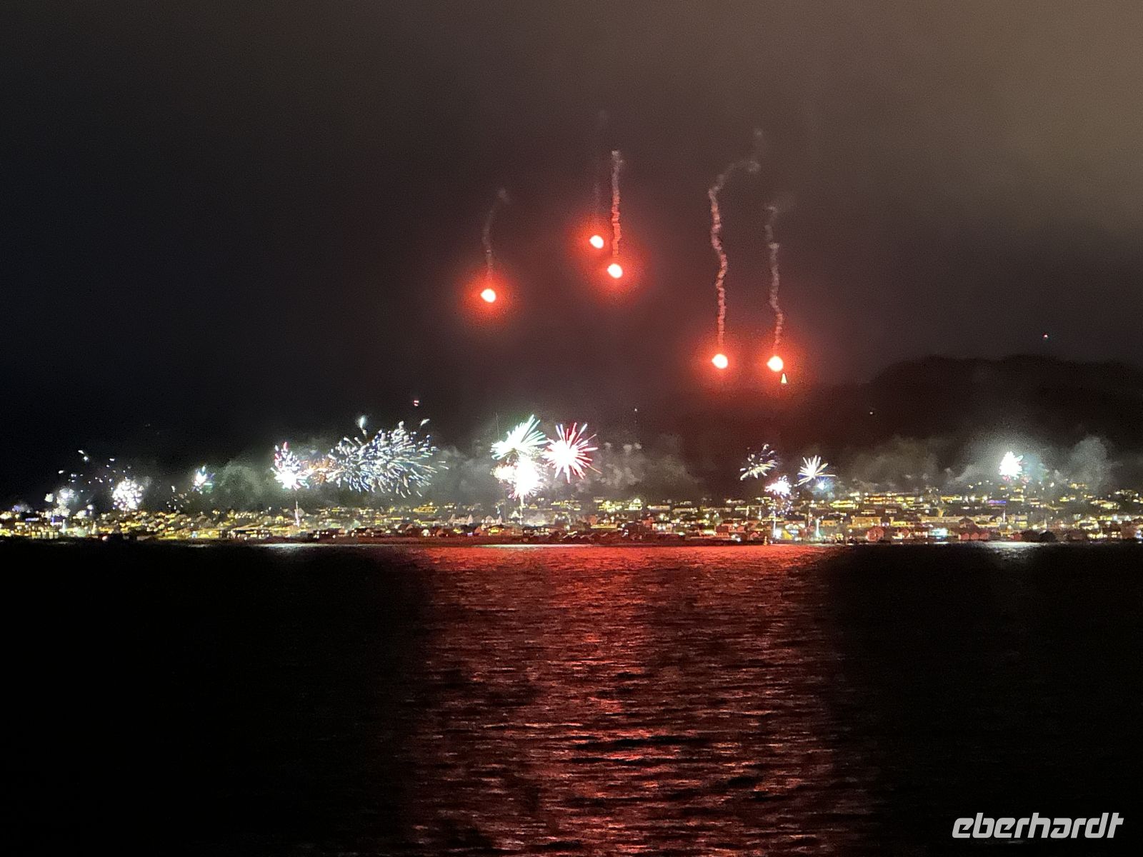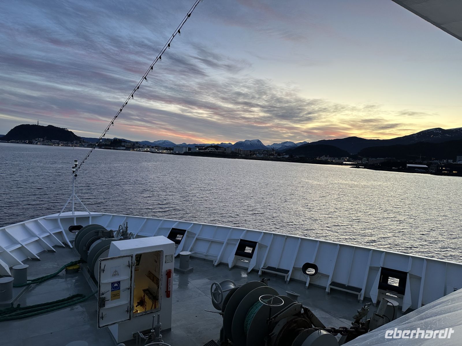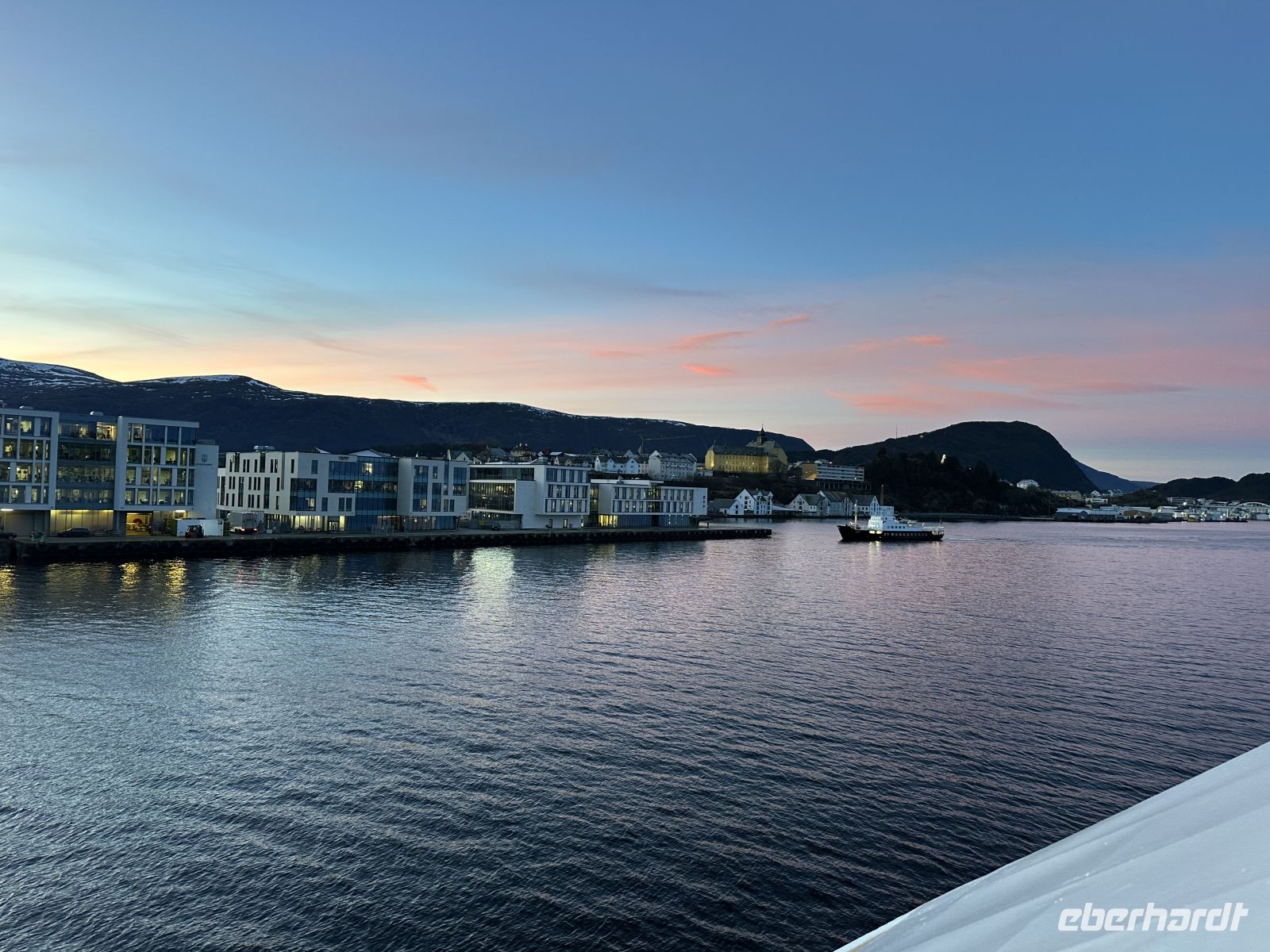 Der späte Abend bietet noch einmal geistige Nahrung. Um 21:00 Uhr erfahren wir Spannendes über die Sami-Mythologie (auf Englisch). Um 21:15 Uhr legen wir kurz im „Rosendorf“ Molde an. Eine Stunde später – begleitet von einer Schiffsbegegnung – folgt der große Auftritt: Bei der Hutparade werden die kunstvoll gebastelten Kopfbedeckungen präsentiert und prämiert. Ein herrlich fröhlicher Programmpunkt. Kurz vor Mitternacht erreichen wir schließlich Ålesund. Wir stehen an Deck und haben den Logenplatz schlechthin: Das Silvesterfeuerwerk über den Jugendstilhäusern ist ein atemberaubender Anblick. Wenn das Horn der MS Nordlys das neue Jahr 2026 begrüßt und die Raketen den Himmel über dem Hafen erleuchten, wissen wir: Dieser Jahreswechsel bleibt unvergesslich.