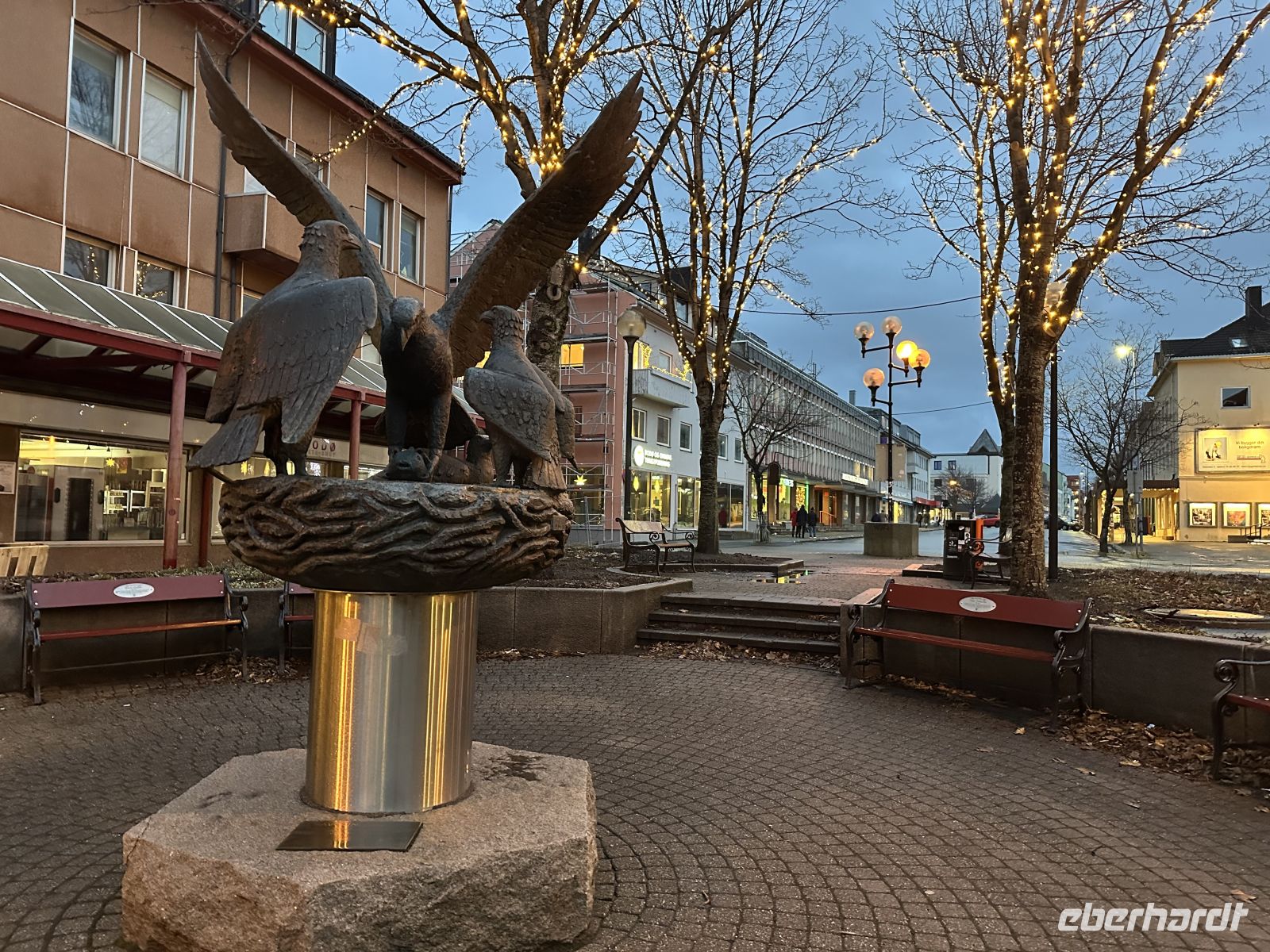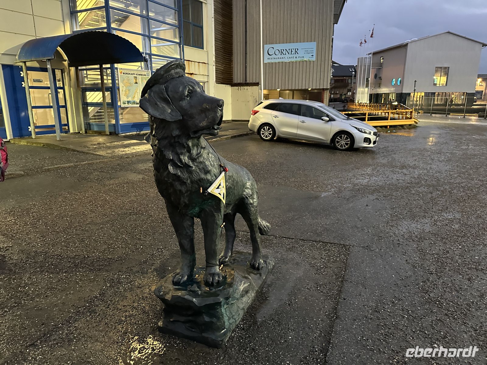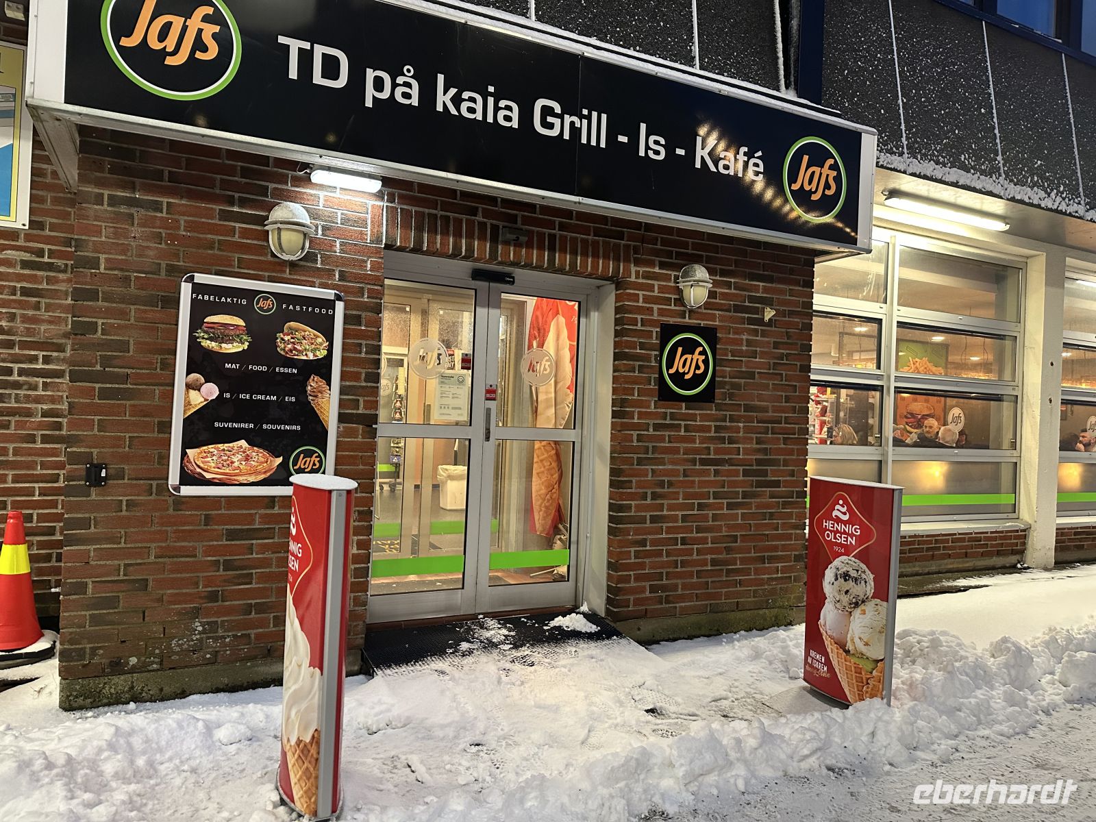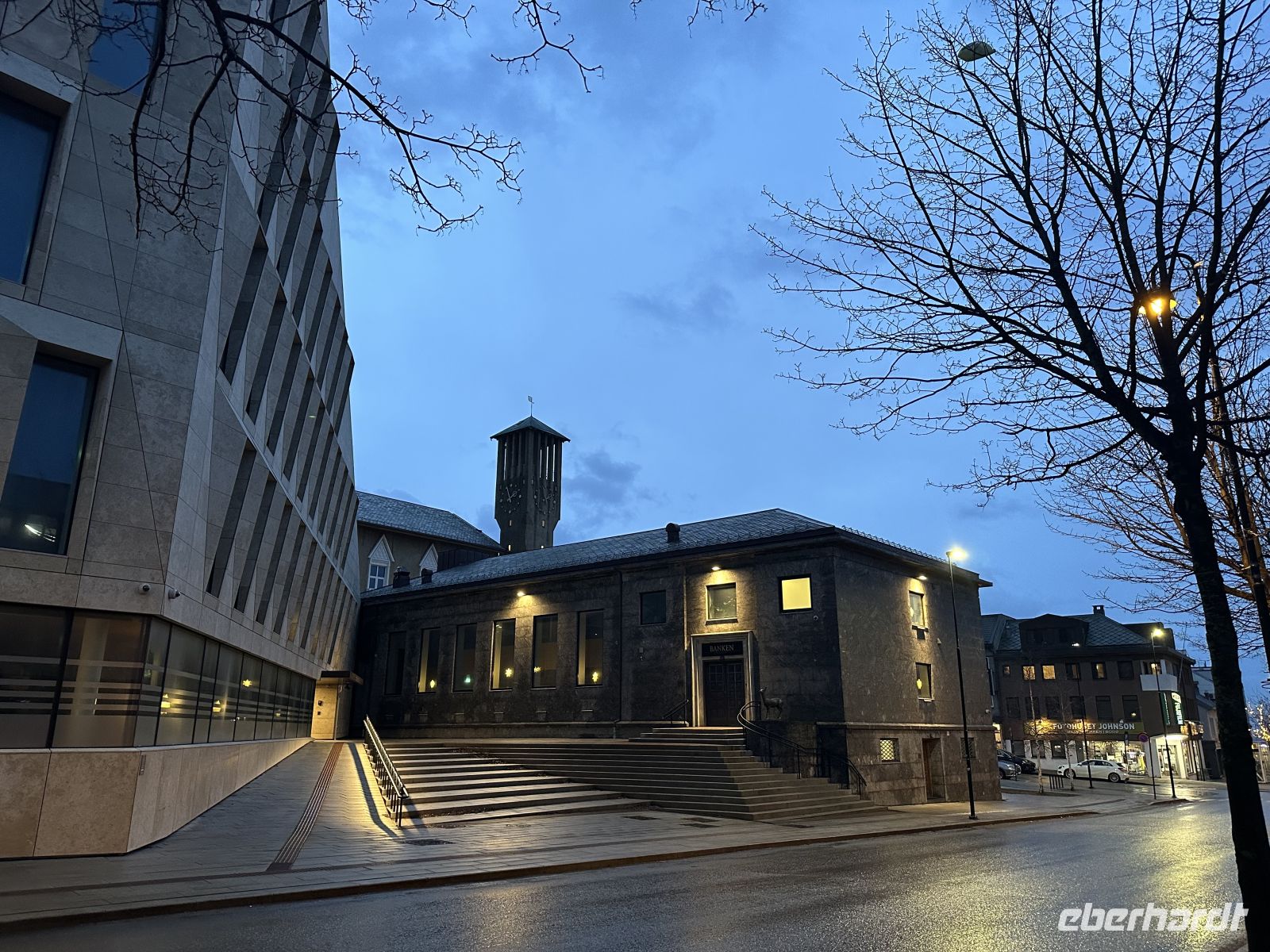 Von 15:00 bis 17:25 Uhr liegen wir im Hafen von Brønnøysund. Während die organisierten Ausflüge starten, begeben sich andere auf einen individuellen Spaziergang durch die tief verschneite Stadt. Es schneit und die Eiskristalle beißen förmlich. Trotzdem macht es Spaß, durch die verschneite Stadt zu stapfen. Direkt am Anleger kommen wir am berühmten Eisladen vorbei. Er ist weit über die Stadtgrenzen hinaus bekannt, und auch wenn das Thermometer winterliche Temperaturen zeigt, ist es ein Muss, diesen charmanten Anlaufpunkt kurz zu bewundern oder tatsächlich ein Eis zu schlemmern. Unser Weg führt uns weiter zum berühmten Schild, das Brønnøysund als die „Mitte Norwegens“ markiert. Es ist ein faszinierendes Gefühl, hier zu stehen: wir befinden uns genau am Schnittpunkt, 840 km vom Nordkap entfernt und ebenso weit weg vom südlichsten Punkt des Landes, dem Kap Lindesnes. Wir halten inne für Fotos an diesem markanten Meilenstein, der uns bewusst macht, wie weit wir auf dieser Reise bereits gekommen sind. Unser nächstes Ziel ist die Brønnøy Kirke, ein imposantes Bauwerk aus Stein und Holz. Die Kirche hat eine lange Geschichte, die bis ins 12. Jahrhundert zurückreicht, wurde aber nach Bränden im 19. Jahrhundert in ihrer heutigen, kreuzförmigen Gestalt wiederaufgebaut. Inmitten des hohen Schnees wirkt das historische Gebäude besonders erhaben. Auch wenn die schweren Türen heute geschlossen bleiben und uns der Blick in das Innere verwehrt bleibt (nur durch ein kleines Fenster scheint ein Weihnachtsbaum), genießen wir die friedliche Atmosphäre auf dem kirchlichen Gelände, das wie ein Ruhepol in der kleinen Stadt wirkt. Etwas durchgefroren, aber glücklich über diese persönlichen Eindrücke abseits der großen Touren, machen wir uns auf den Rückweg zur MS Nordlys. Um 18:00 Uhr erwartet uns der kulinarische Höhepunkt der Reise: das Farewell-Dinner. In festlicher Atmosphäre genießen wir ein exquisites 4-Gänge-Menü: