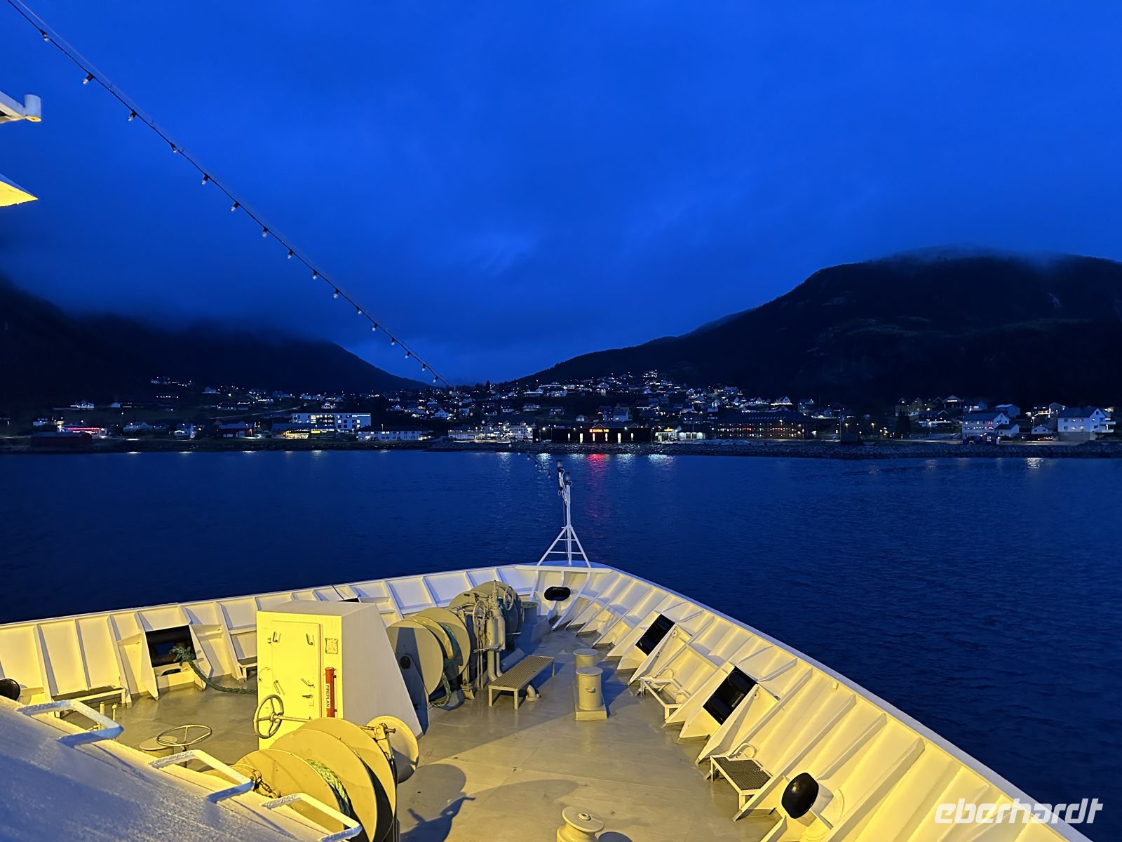 Nach dem Essen legen wir um 21:00 Uhr noch kurz in Rørvik an, bevor uns um 21:35 Uhr die letzte Schiffsbegegnung des Tages grüßt. Wir lassen den Abend in der Lounge ausklingen und blicken wehmütig auf die letzten Tage im hohen Norden zurück.