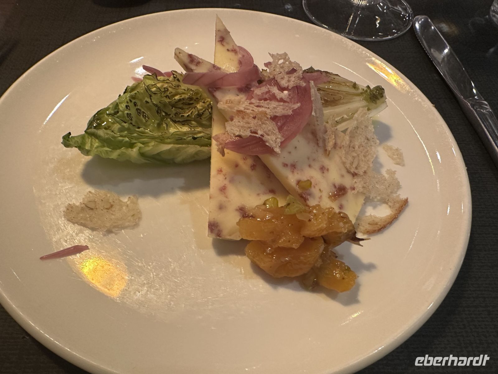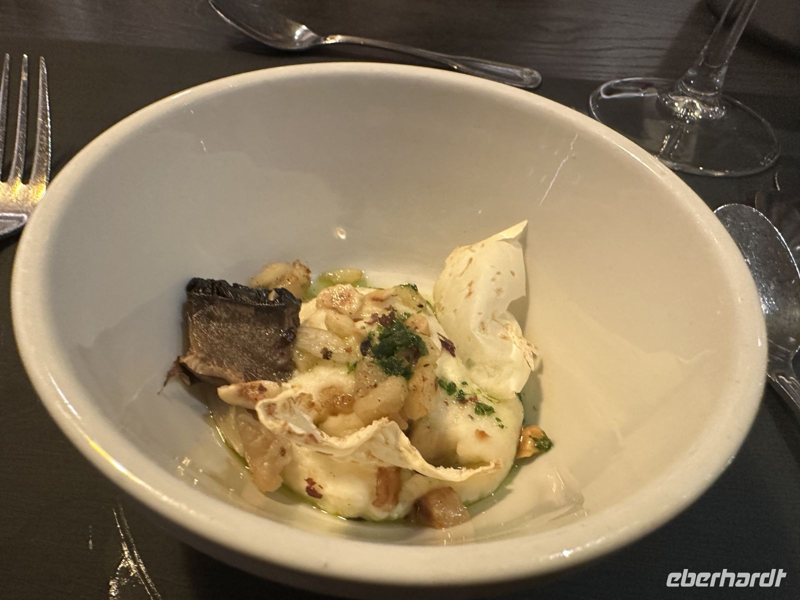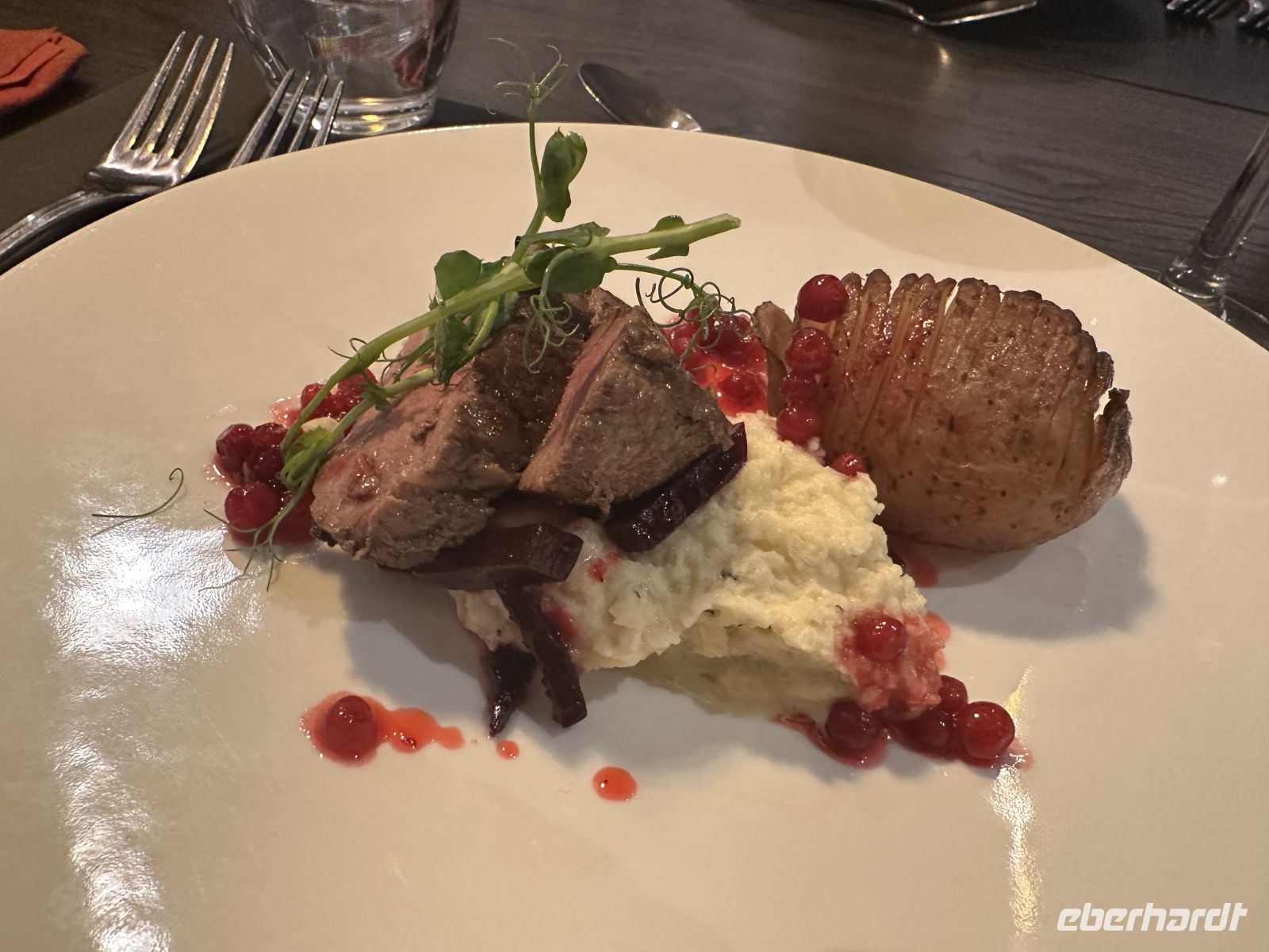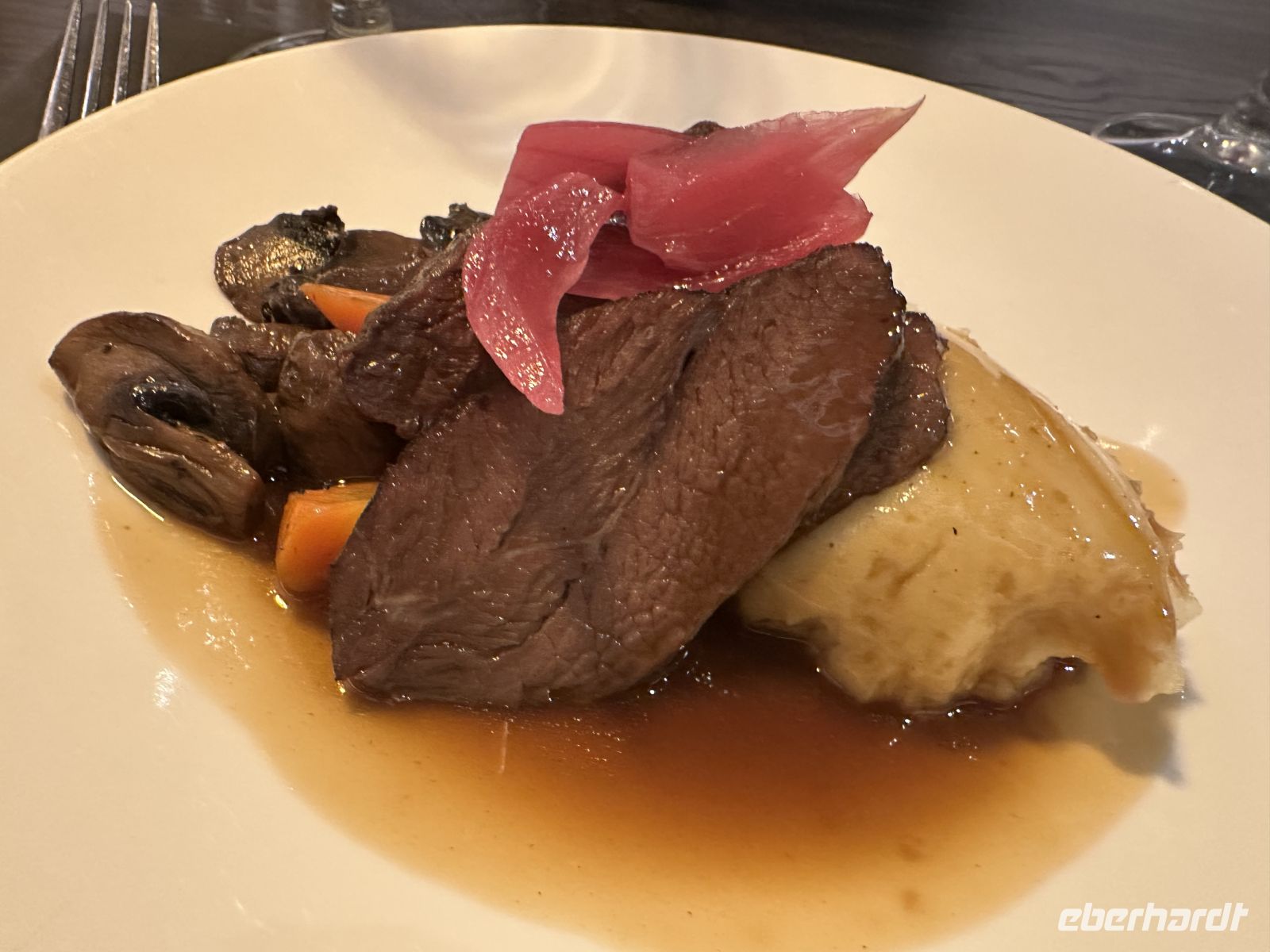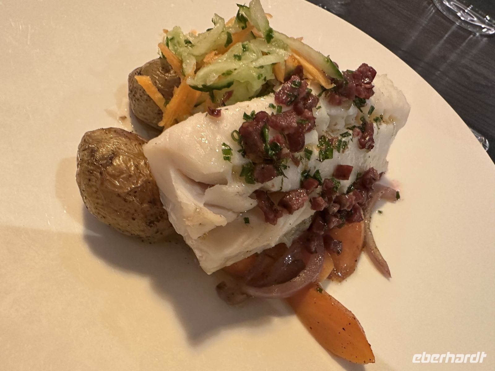 • Hauptspeise: Wir haben die Wahl zwischen perfekt gegartem Kabeljau oder zarten Rinderbäckchen.