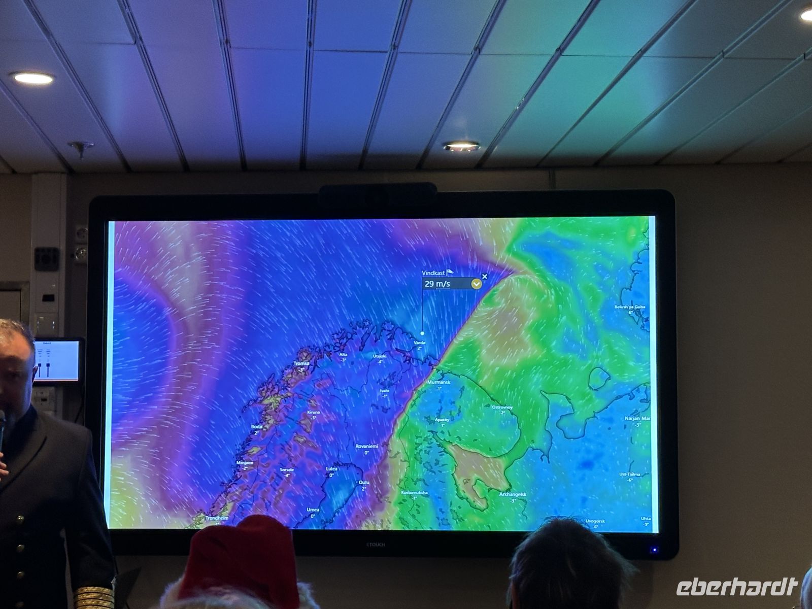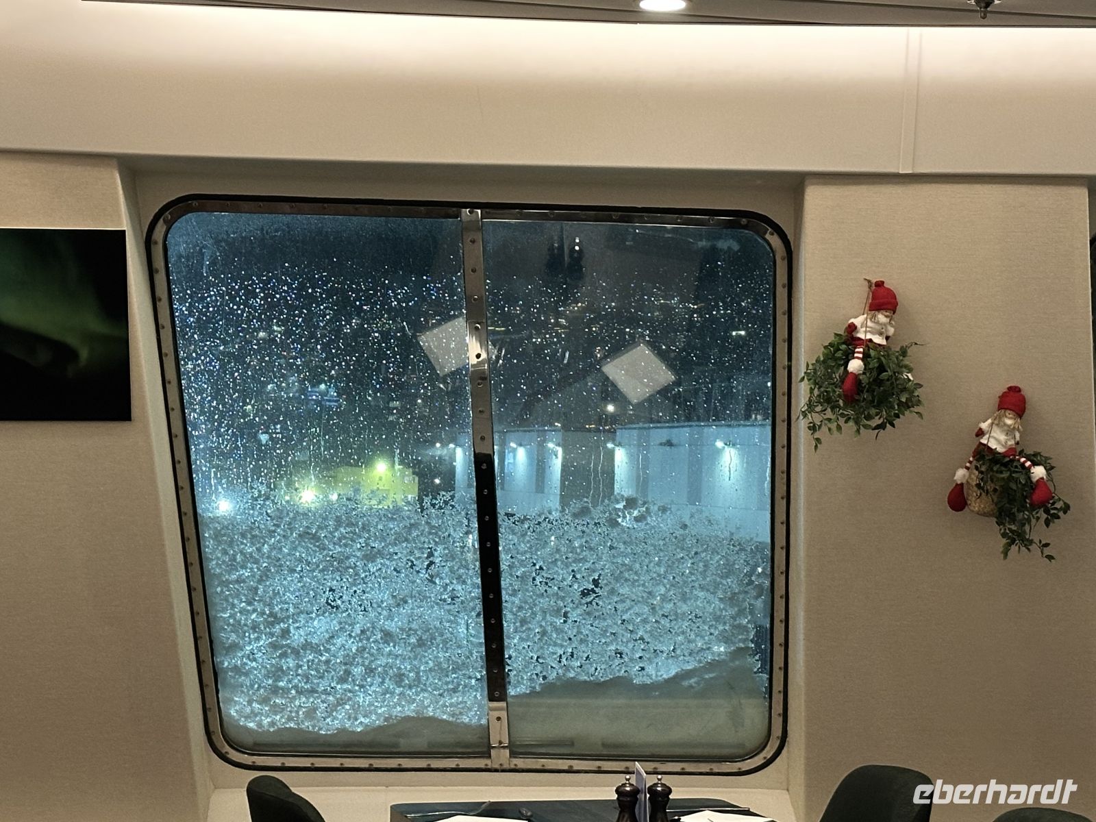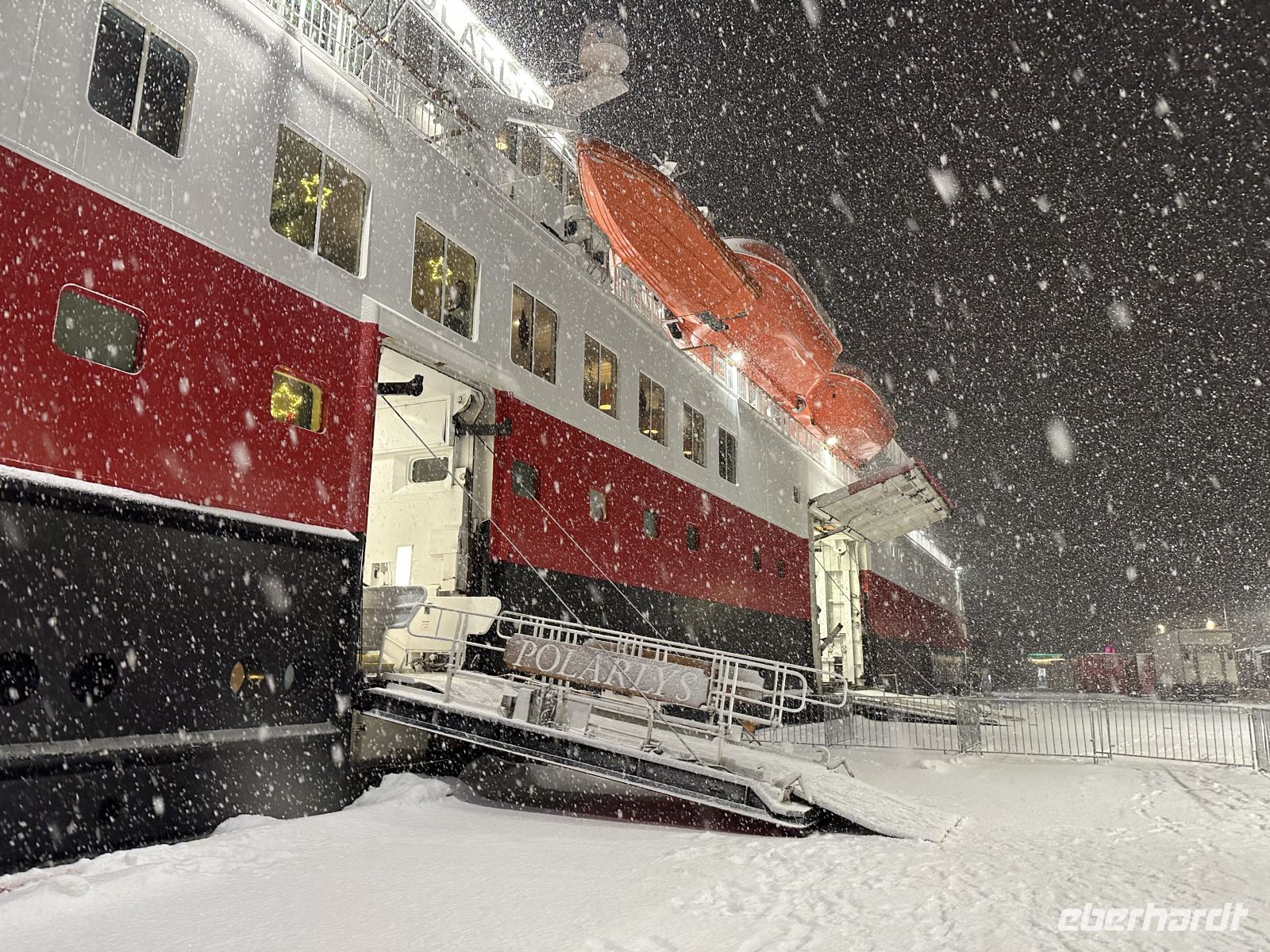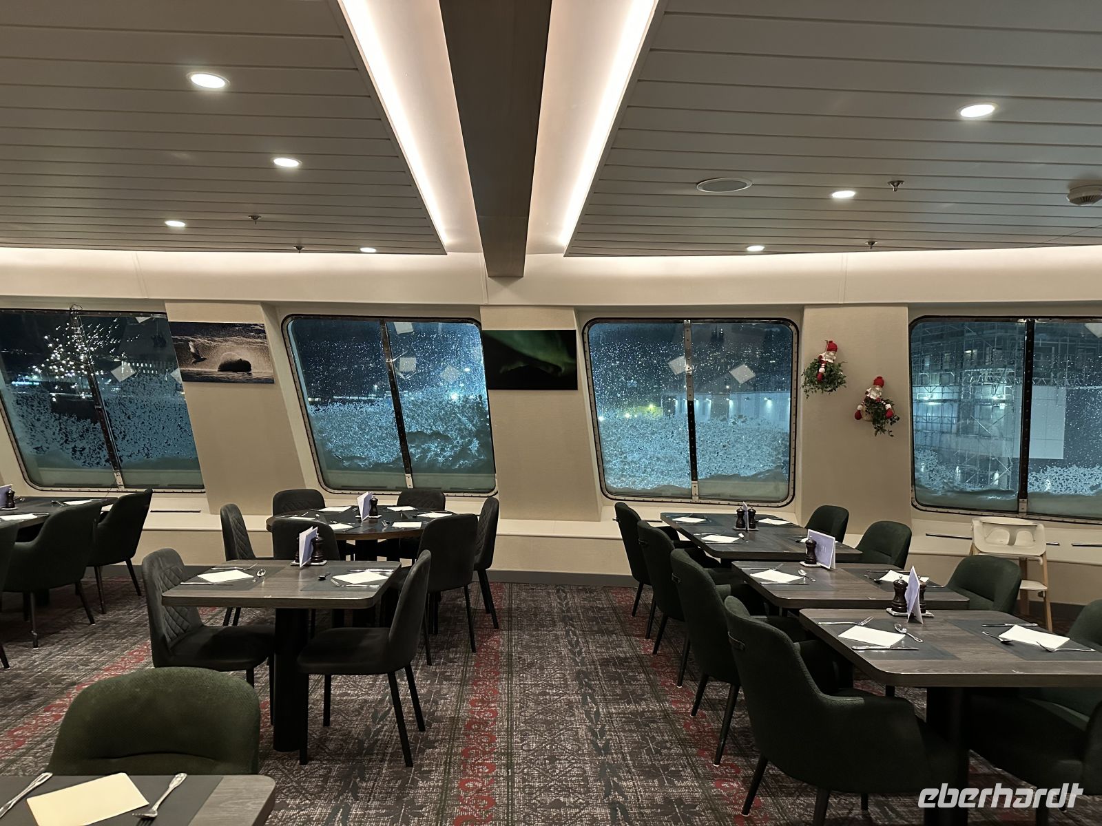 Der erste Weihnachtsfeiertag beginnt maritim: Gegen 11:00 Uhr legen wir einen kurzen Stopp in Finnsnes ein, bevor wir uns um 11:30 Uhr an Bord die faszinierende Präsentation der Riesenkrabben ansehen. Kurz darauf folgt eine wichtige Durchsage: Um 12:30 Uhr laden der Kapitän und der Expeditionsleiter zu einer außerordentlichen Versammlung ein. Die Natur hat ihre eigenen Pläne – wegen einer massiven Unwettergefahr wird die Route geändert. Statt Kirkenes wird unser nördlichstes Ziel nach dem Halt in Honningsvåg nun Alta sein.