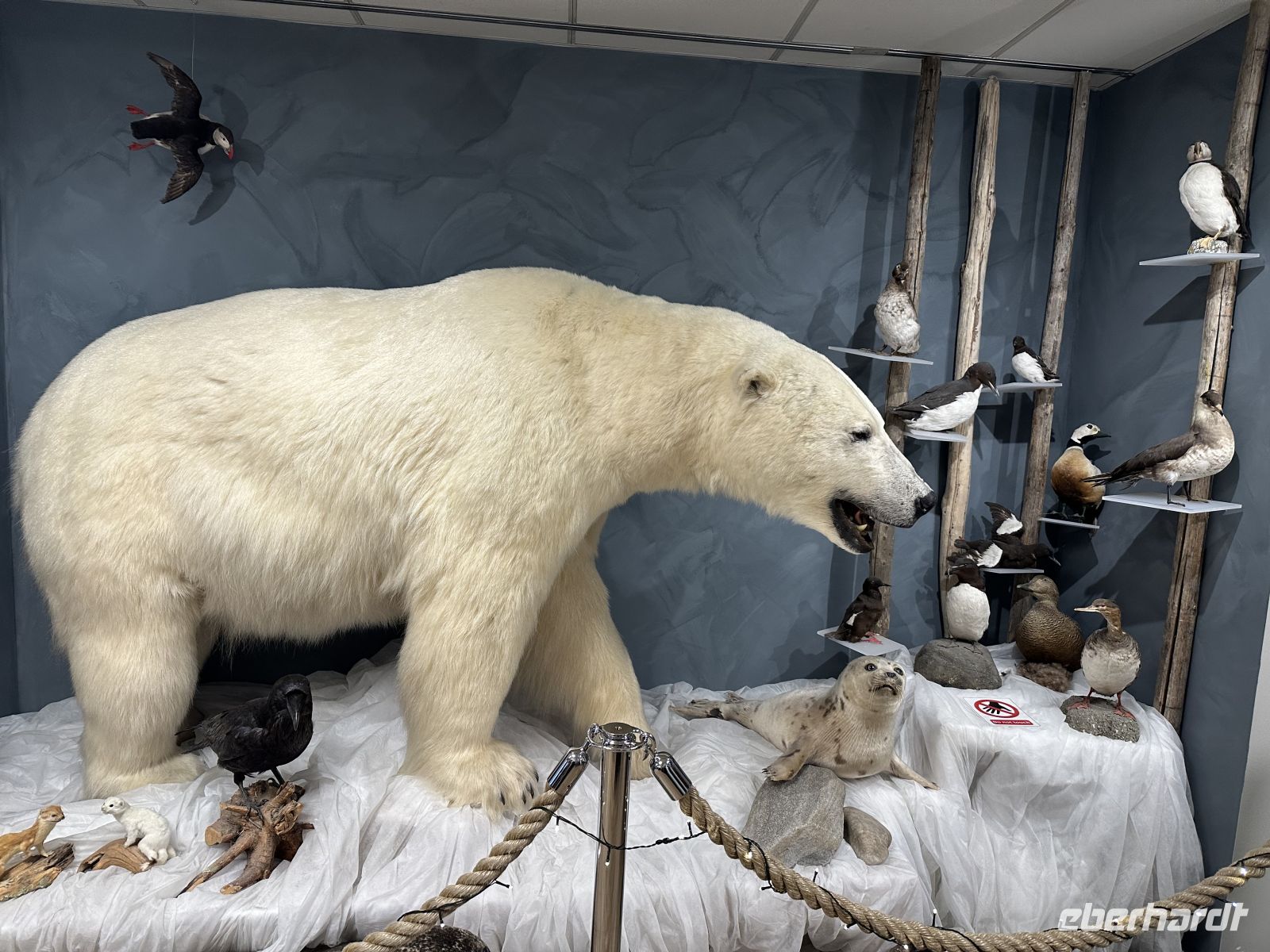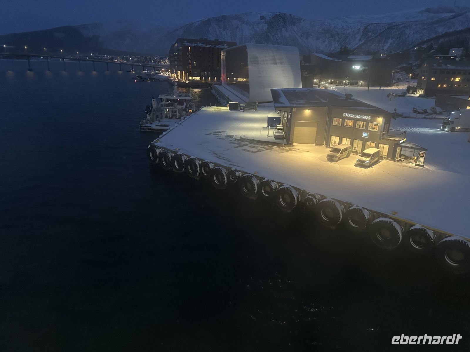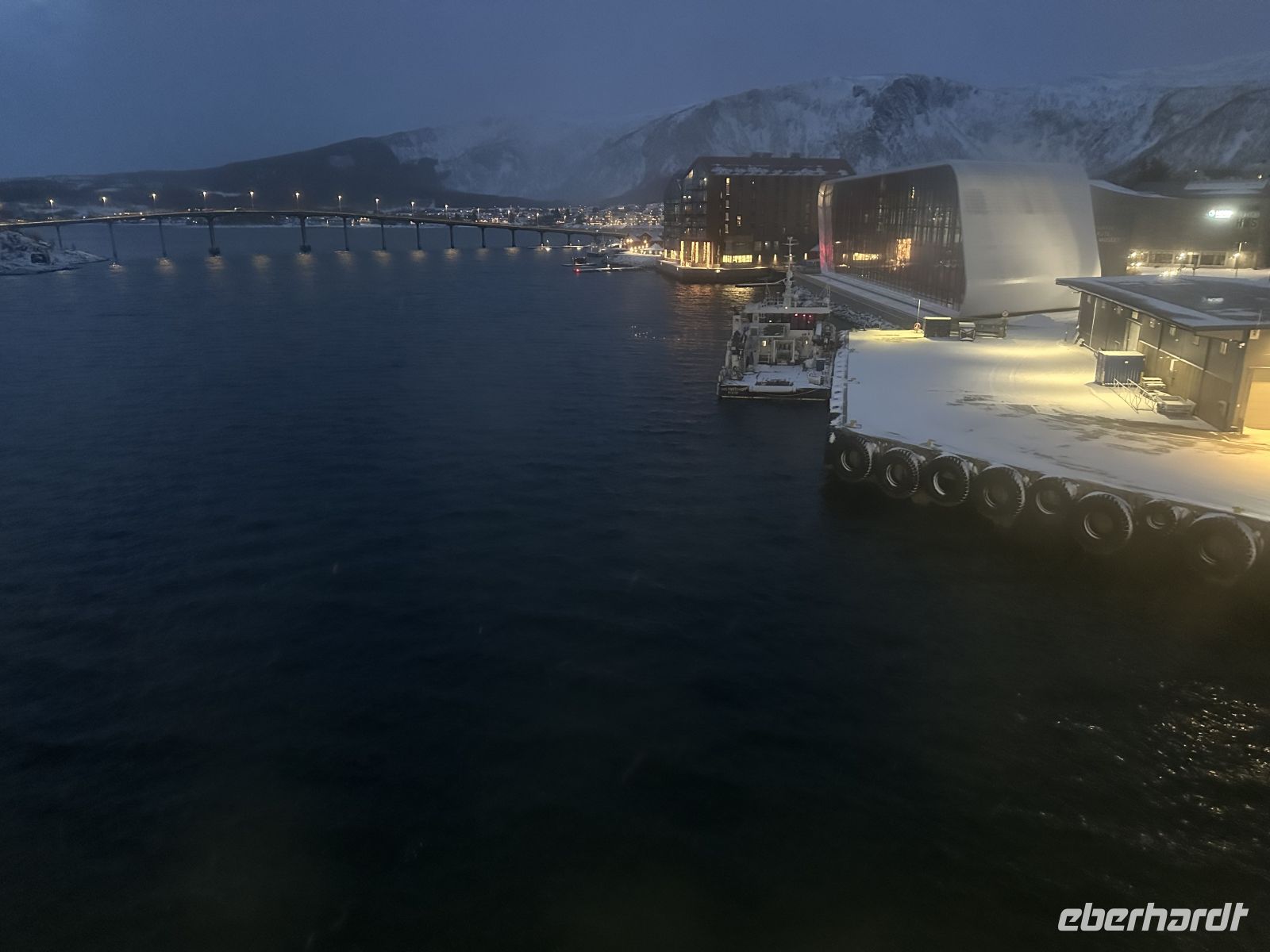 Am Nachmittag steht für uns ein Eberhardt Ausflug auf dem Programm, das bedeutet, wir sind unter uns, nur mit Eberhardt Gästen unterwegs. Unser erstes Ziel ist die beeindruckende Tromsøbrücke, über die wir zur berühmten Eismeerkathedrale fahren. Nach einem kurzen Fotostopp geht es weiter zum Polarmuseum. Wir erkunden insgesamt neun Räume auf drei Etagen, die uns die Welt der Pioniere und Pelzjäger näherbringen. Am Eingang erhalten wir deutschsprachige Broschüren, die uns als Wegweiser durch die Ausstellungen dienen. Wir sehen originalgetreue Nachbildungen von Fangschiffen und Werkzeugen. Die Ausstellungen zeigen ungeschönt, wie hart und gefährlich das Leben der Männer war, die monatelang im Eis überwinterten. Ein großer Teil ist den legendären Entdeckern Roald Amundsen und Fridtjof Nansen gewidmet. Wir bestaunen Ausrüstungsgegenstände, Karten und Fotos von ihren bahnbrechenden Reisen zum Nord- und Südpol. Es ist beeindruckend zu sehen, mit wie wenig technischem Schutz diese Menschen der extremen Kälte trotzten. Beeindruckende Exponate von Eisbären, Walrossen und Polarfüchsen vermitteln uns ein Bild der tierischen Bewohner dieser Region, die sowohl Lebensgrundlage als auch Gefahr für die Menschen waren. Es gibt auch Nachbildungen von kleinen Jagdhütten, die wir sogar betreten können. Hier wird deutlich, auf wie wenig Raum die Trapper lebten – oft war eine solche Hütte der einzige Schutz gegen die tobenden Winterstürme. Nach dem Besuch des Polarmuseums fahren wir zur Südspitze der Insel, einem bekannten Aussichtspunkt für Nordlichter. Die Wolken sind heute leider zu dicht für die Aurora, aber der Blick über den Fjord von einem kleinen Steg aus ist dennoch wunderschön. Zur Stärkung und zum Spaß gibt es ein Mini-Picknick aus Keksen und Schokolade. Auf dem Rückweg passieren wir die Fußgängerzone (Storgata) und die alte Brauerei. Da die Gruppe nach den vielen Eindrücken lieber an Bord möchte, fahren wir direkt zurück zum Schiff, wo uns am Abend wieder ein reichhaltiges Buffet erwartet.