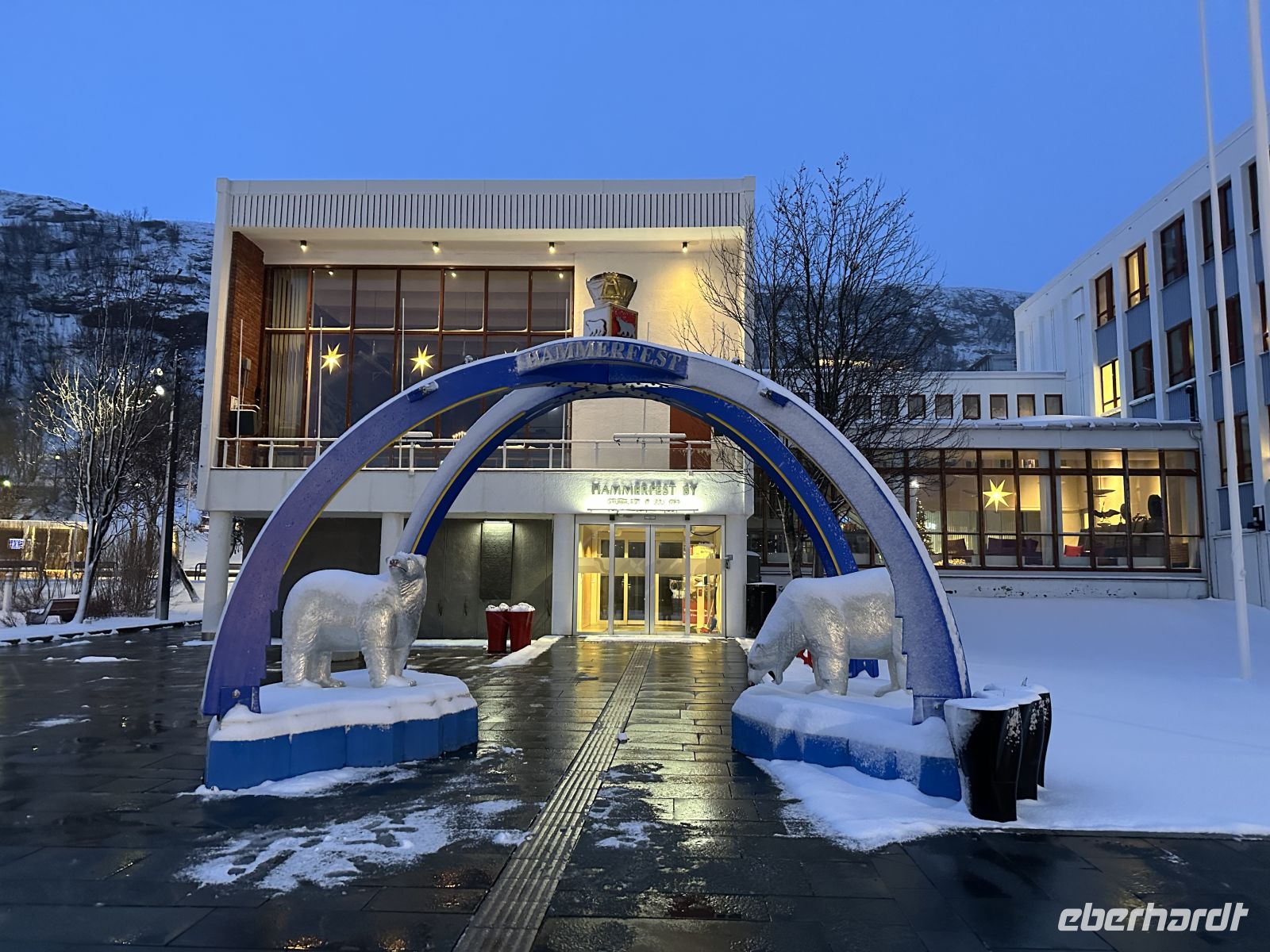 Da die Route wetterbedingt angepasst wurde, liegt die MS Nordlys heute im Hafen von Alta. Die Stadt empfängt uns festlich geschmückt und in ein wunderbares Winterlicht getaucht. Da der Weg vom Hafen ins Zentrum zu Fuß gut 40 Minuten dauern würde, nutzen wir den praktischen kostenlosen Shuttle-Service. Die Busse pendeln am Vormittag regelmäßig (hin ab 11:00 Uhr alle 30 Minuten, zurück letzte Fahrt um 13:00 Uhr), was uns den Landgang sehr erleichtert.