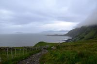 Am Morgen fahren wir zur Fähre Sulesund-Hareid, mit der wir übersetzen. Über mehrere mit Dämmen und Brücken verbundene Inseln geht es zur Insel Runde hinüber. Die Wetteraussichten sind mal wieder nicht berauschend. Als wir am Parkplatz am Ortsausgang von Runde ankommen, prasselt ein Regenschauer hernieder. Also heißt es Regenbekleidung anlegen, bevor wir unsere Wanderung zum Vogelfelsen beginnen können. Zum Glück lässt der Regen bald nach und oben auf dem Fjell stören nur noch tiefhängende Wolken das Bild.