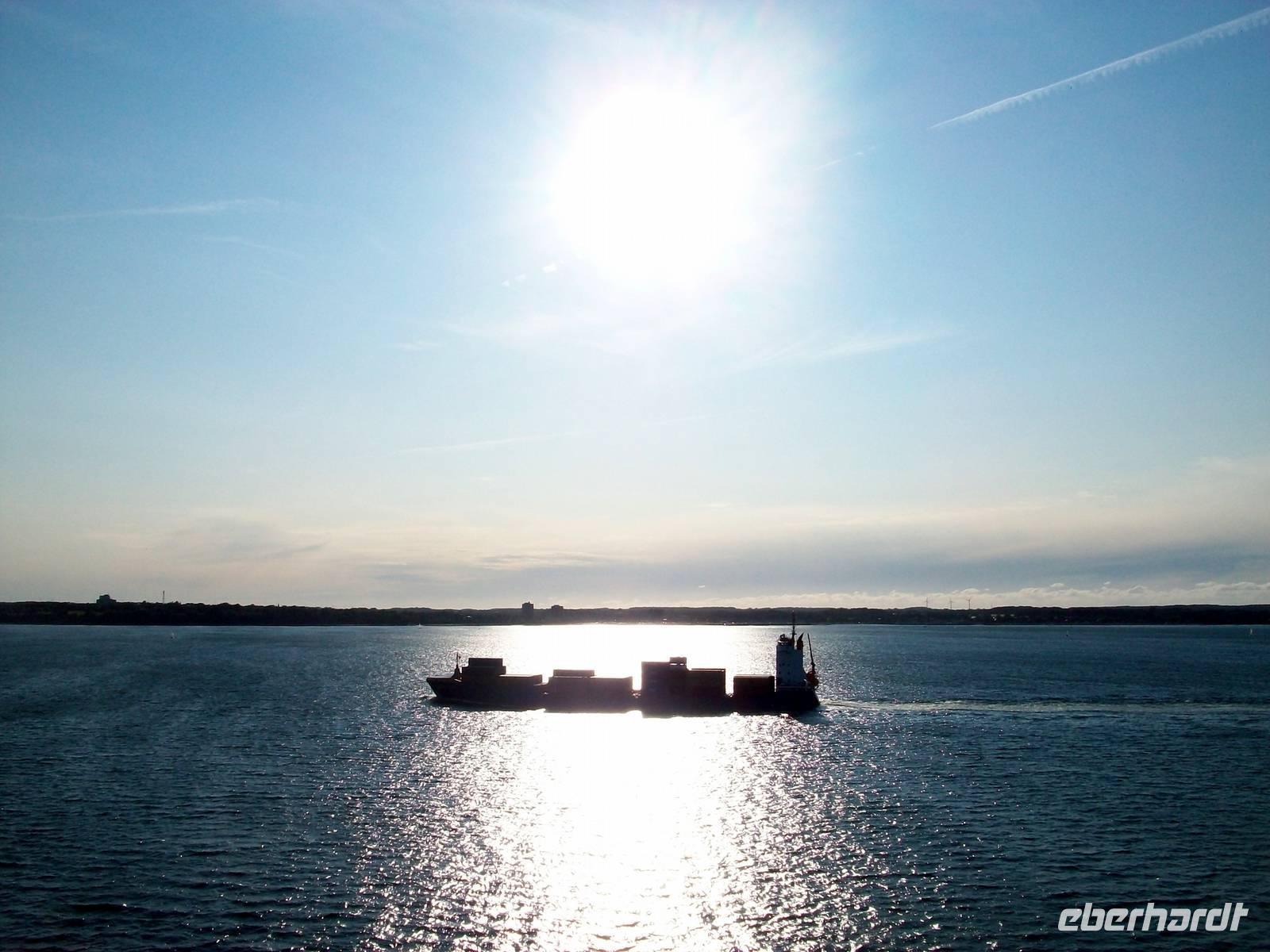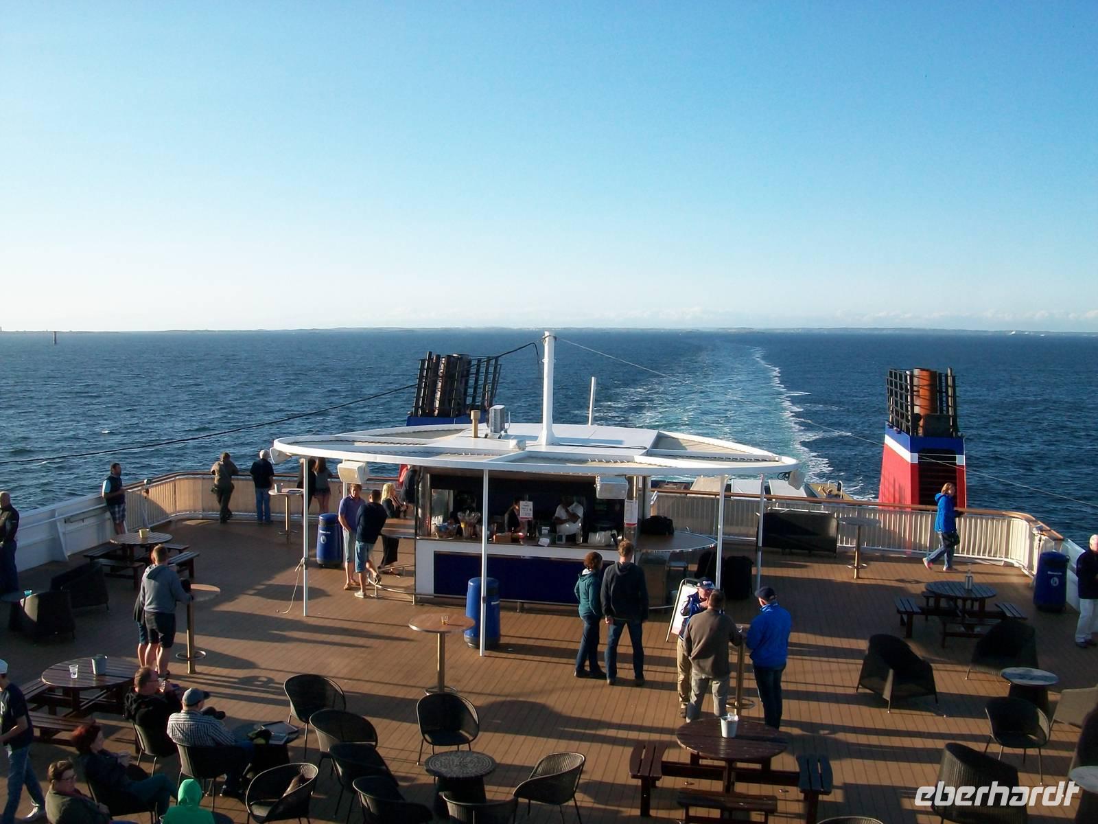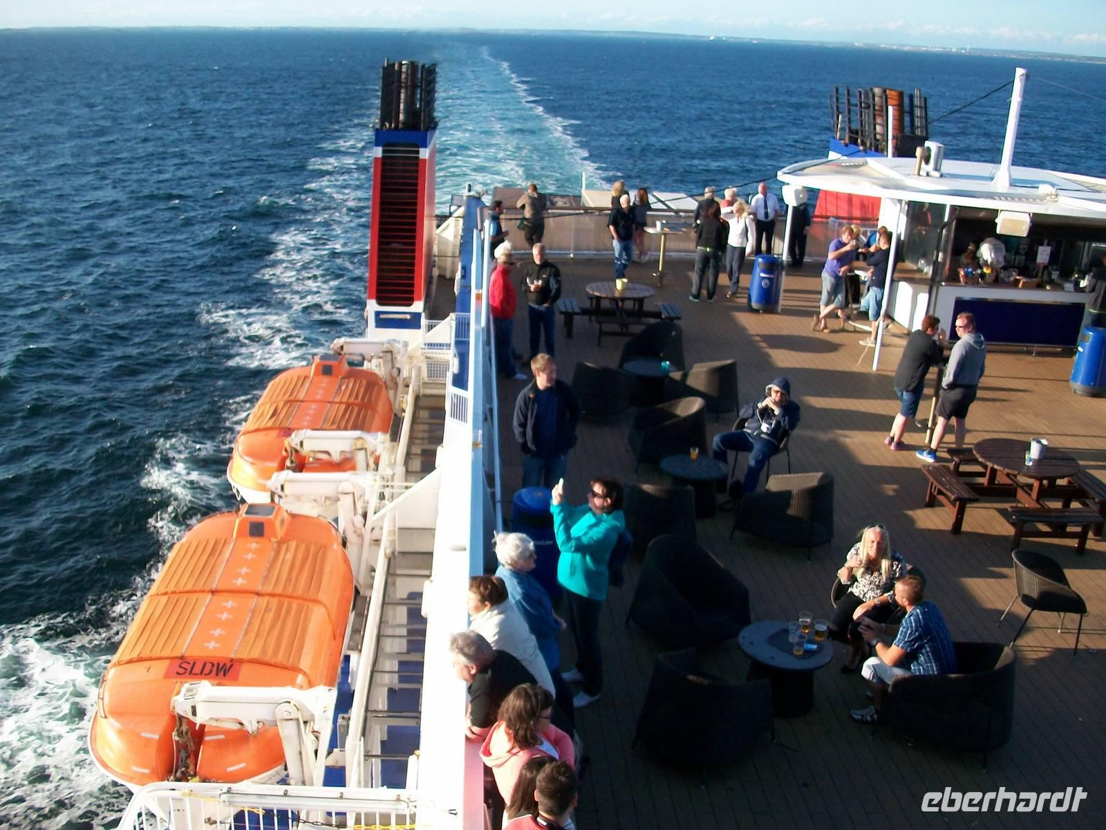 Dann sind wir in Schweden unterwegs; weiterhin begleitet uns die Sonne, auch als wir im Großraum von Göteborg anlangen. Unsere Fähre steht schon bereit; über die Gangway gelangen wir in das Innere und bis zum Abendessen verbleibt noch etwas Zeit zum Bummel auf dem Sonnendeck was heute seinem Namen volle Ehre macht.