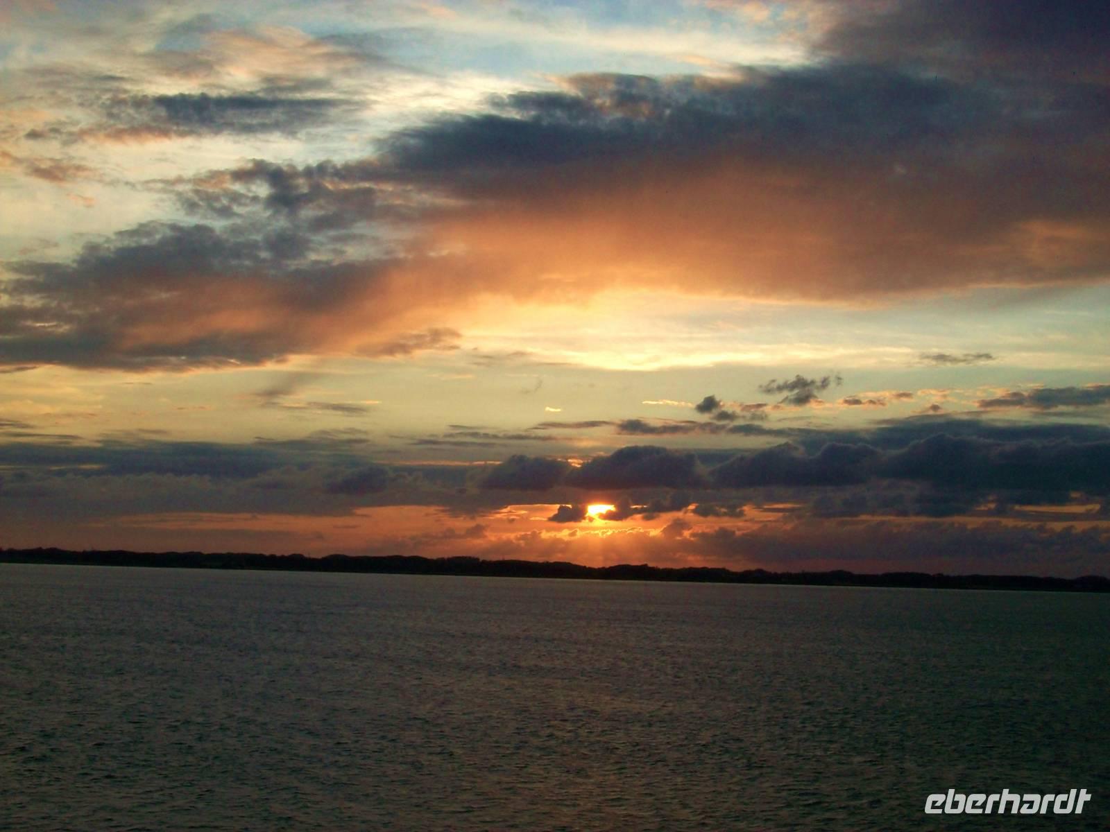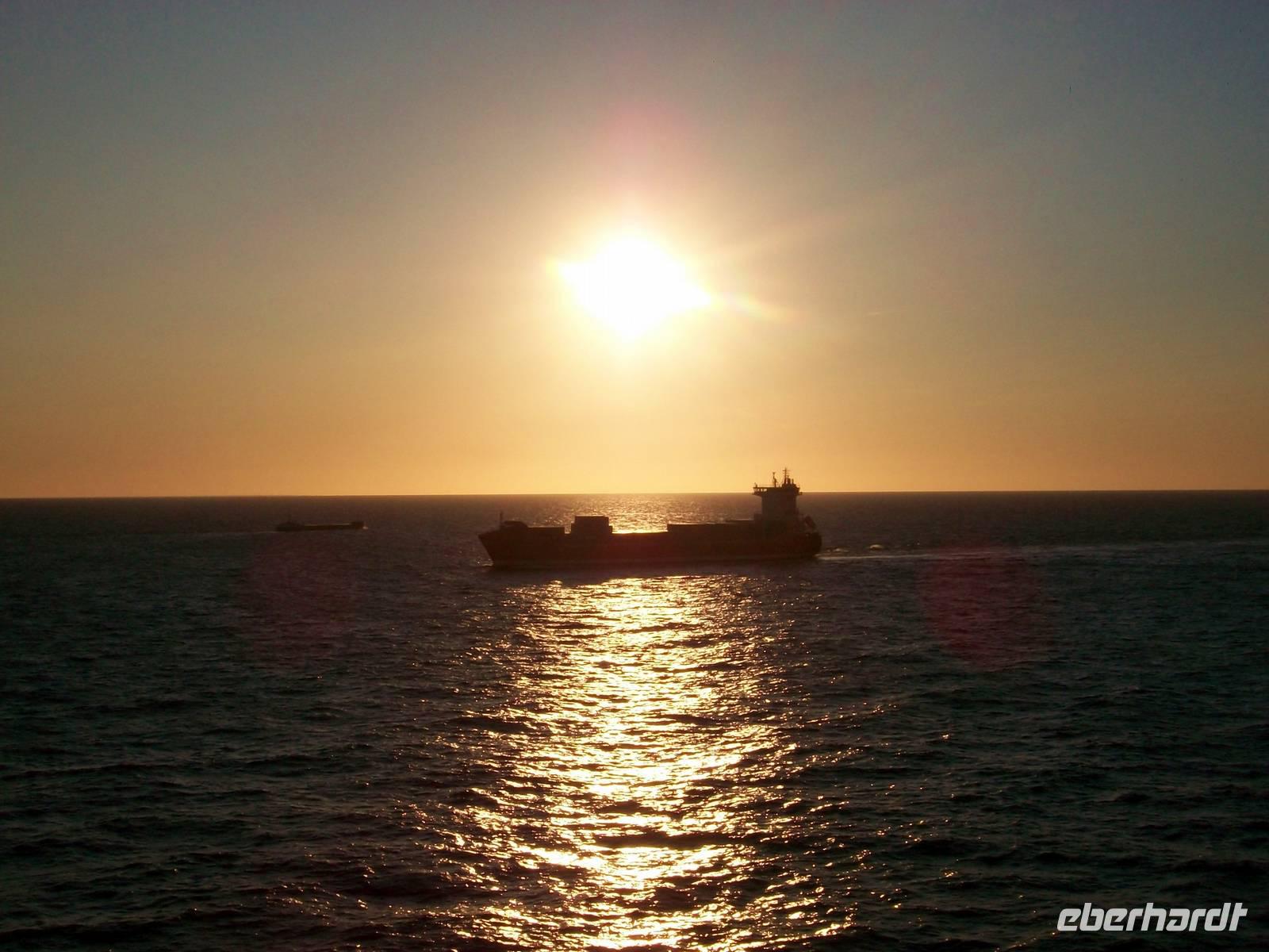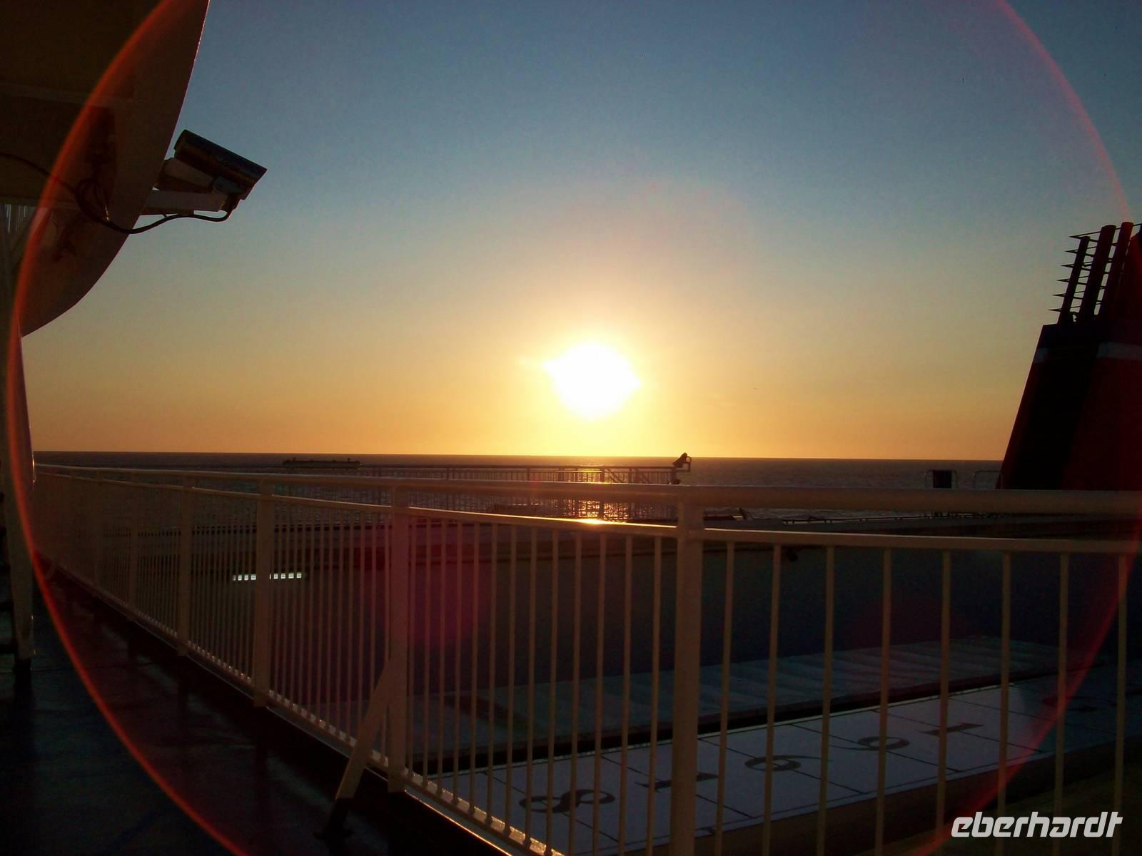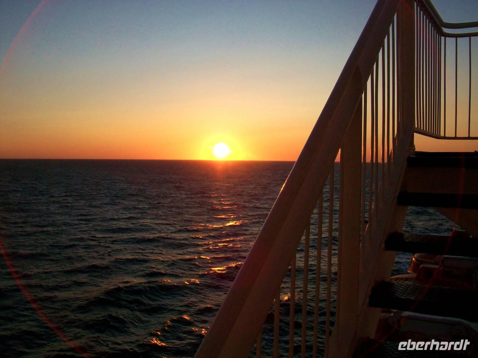 Während wir es uns schmecken lassen legt die Fähre ab, die Kieler Förde mit zahlreichen Segelbooten zieht an den Fenstern des Restaurants vorbei und später genießen wir noch einen schönen Blick vom Oberdeck auf die im Meer versinkende Sonne.