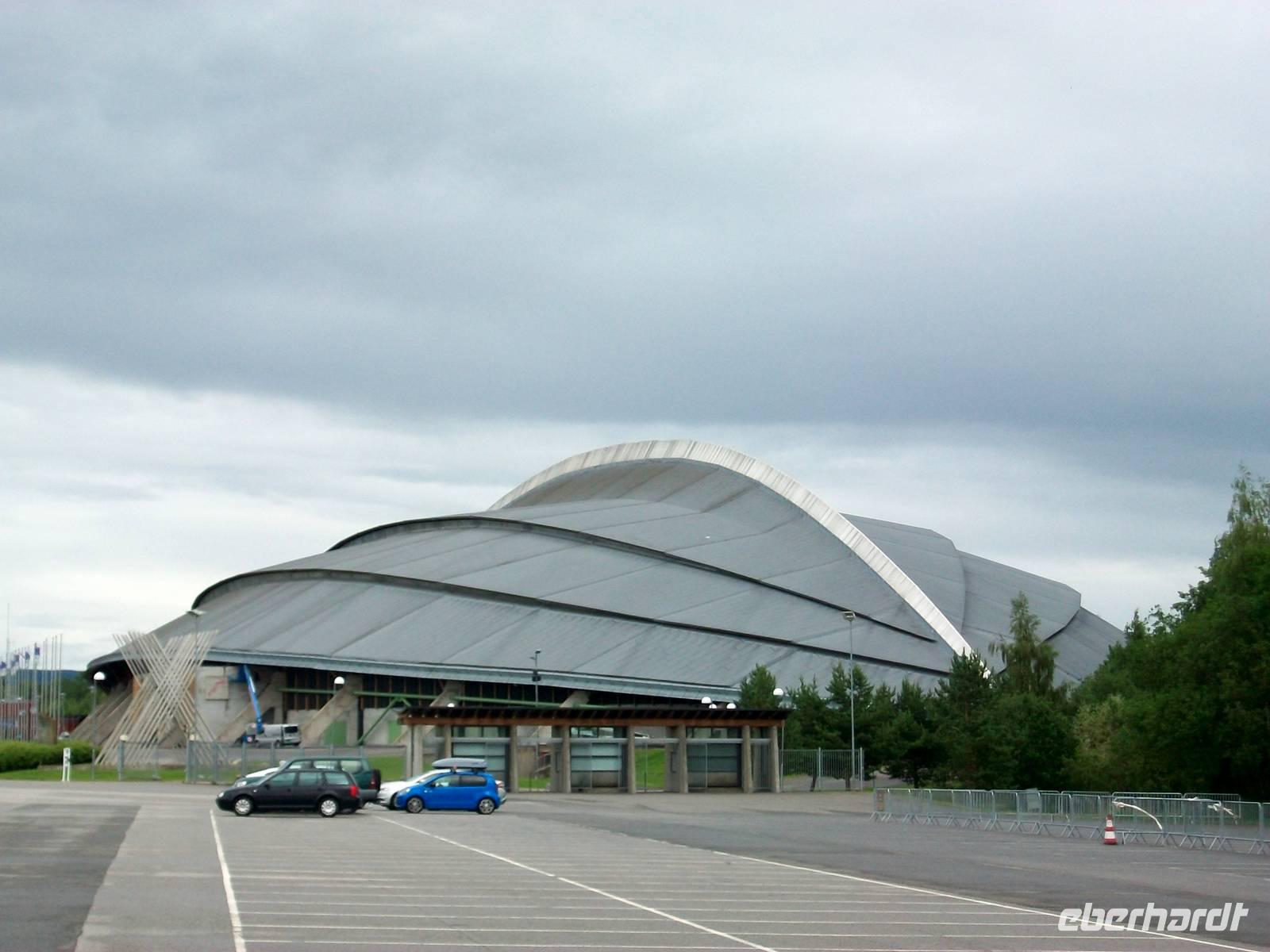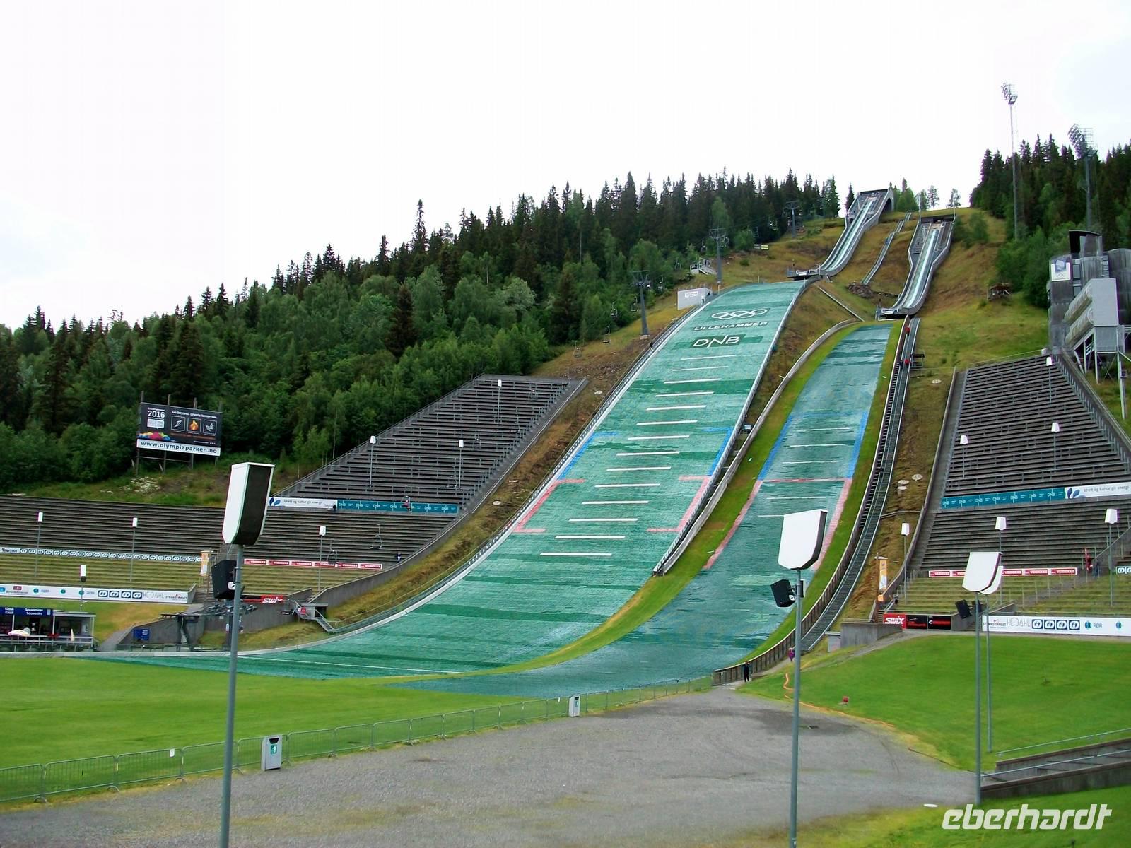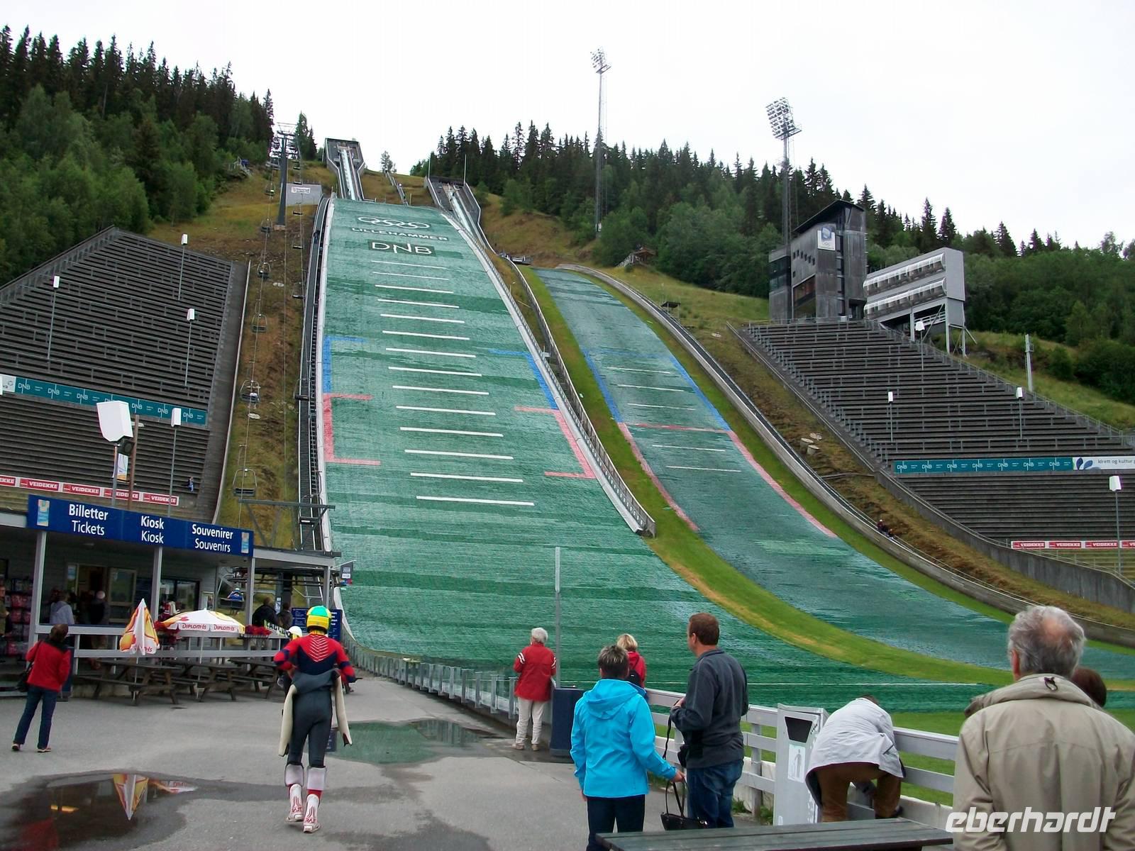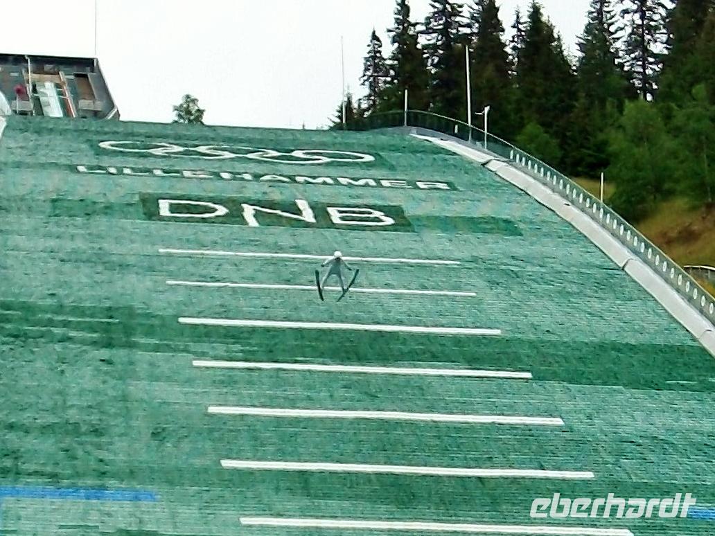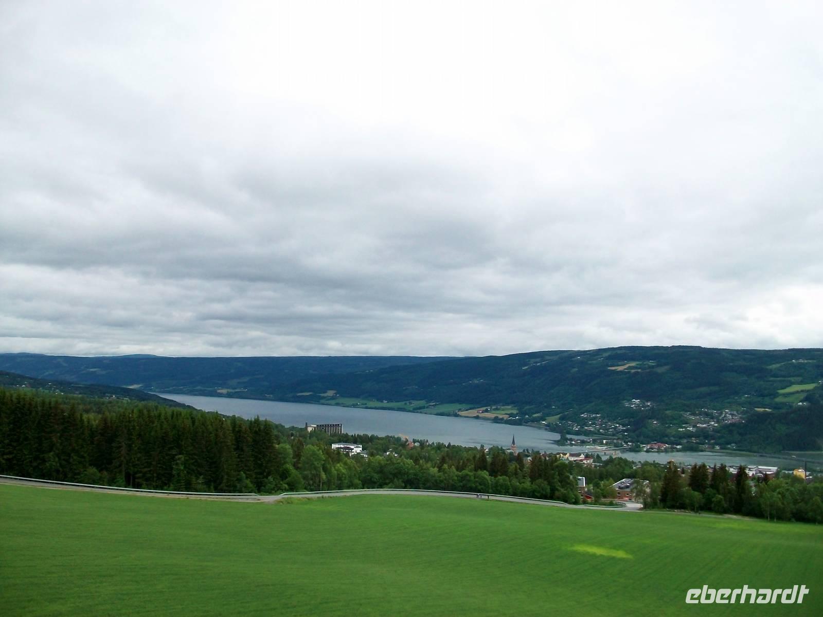 Wir gelangen entlang einer ruhigen Natur und bald breitet sich vor unseren Augen eine große Wasserfläche aus, es ist der Mjøsasee. An seinem Ufer entlang gelangen wir nach Lillehammer; hier fanden im Jahr 1994 die Olympischen Winterspiele statt und wir schauen zunächst erst einmal bei den Sprungschanzen vorbei. Hier erwartet uns eine besondere Überraschung, wir werden Zeuge von einem Trainingsspringen, denn die Schanzen sind im Sommer mit Matten ausgelegt.