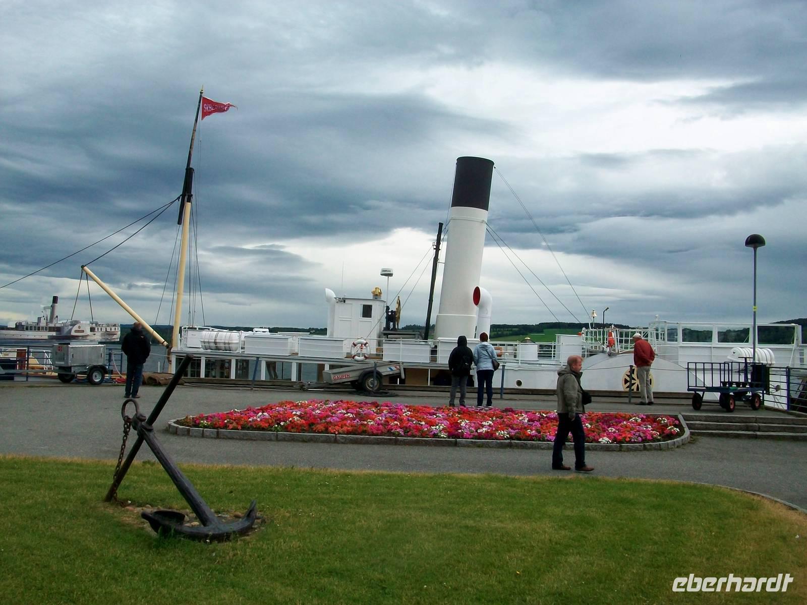 Rechtzeitig langen wir im Ort Gjøvik an und fahren hinunter zum Anleger. Hier hat das Schiff schon festgemacht und nach einer kurzen Zeit können wir an Bord gehen.