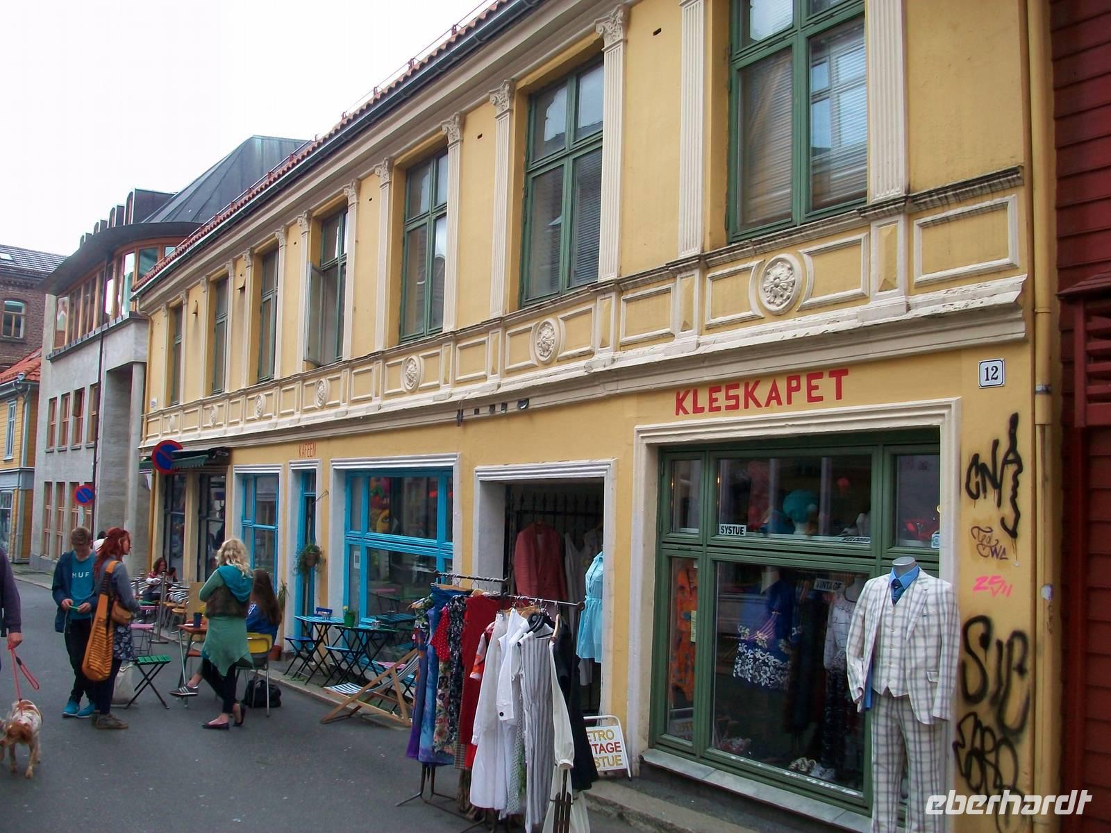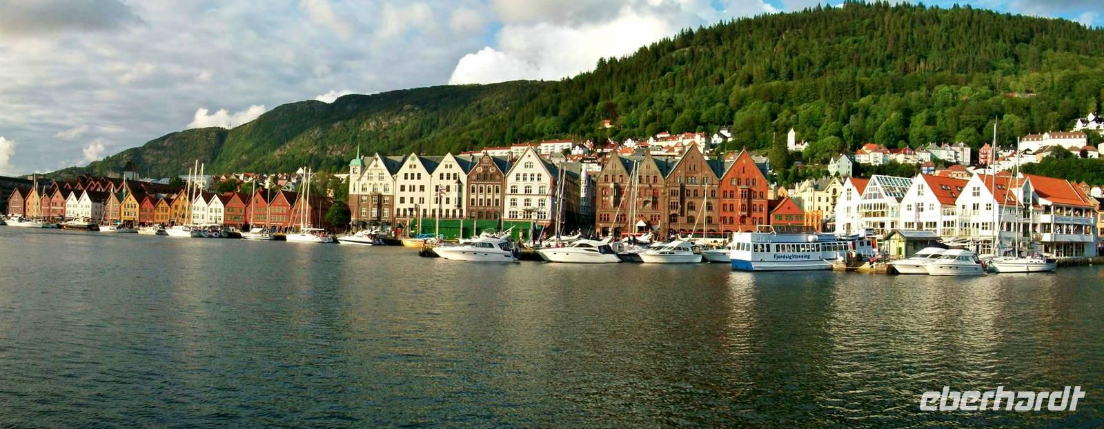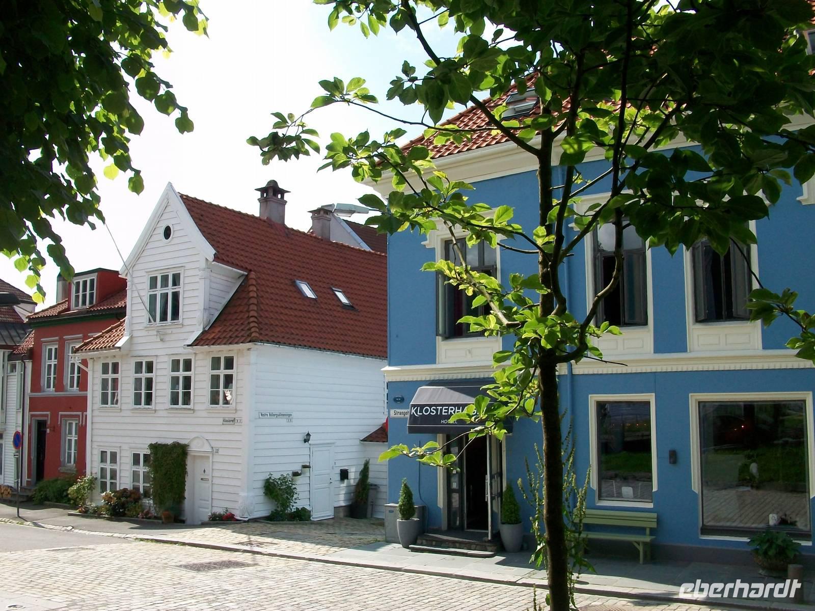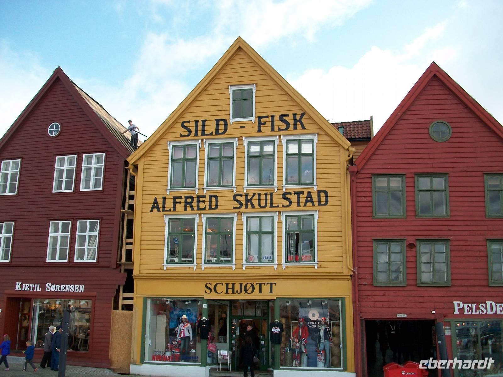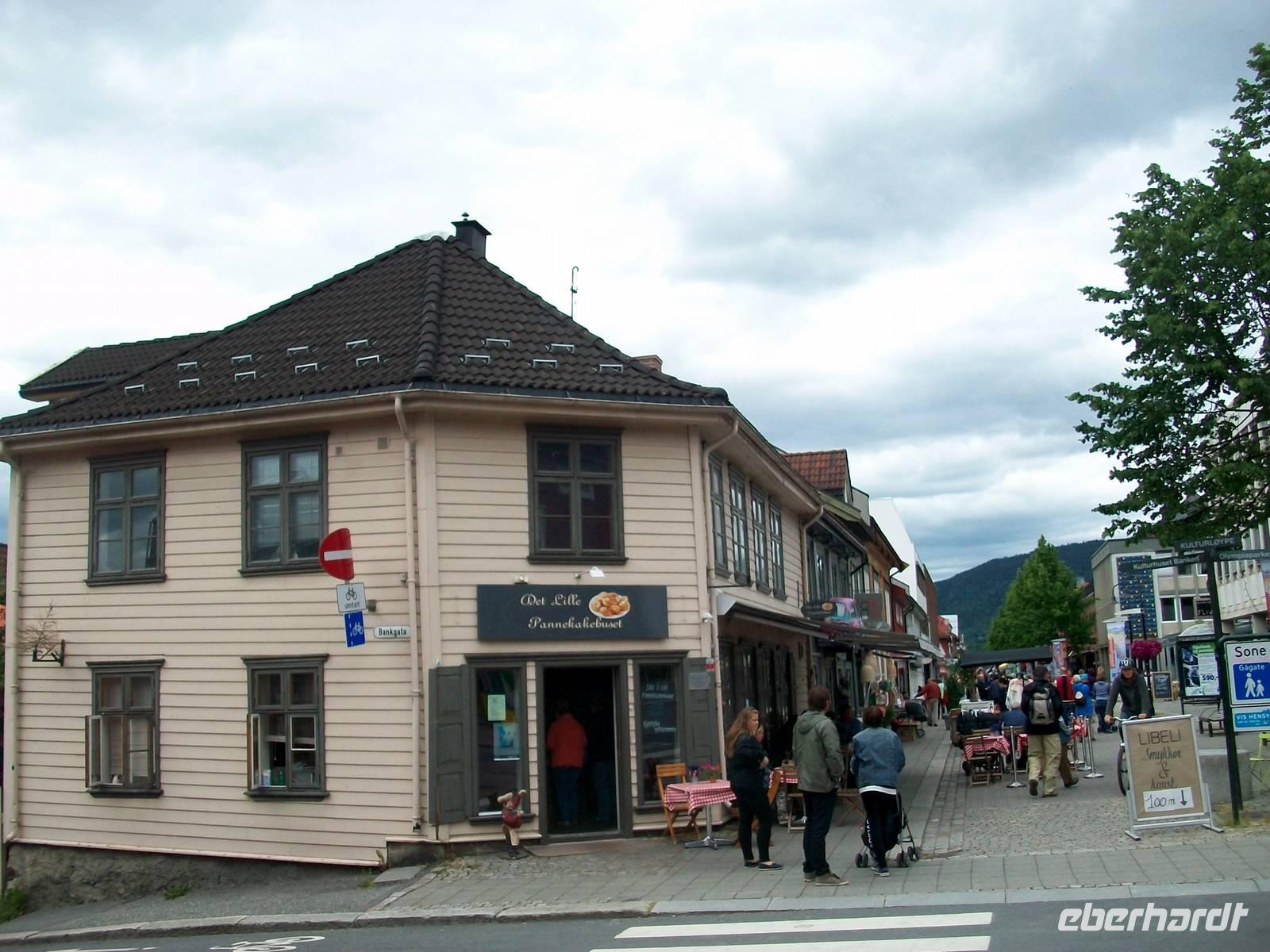 Zunächst schauen wir uns die im Vorort gelegenen schönen Villen an; hier gibt es auch ein kleines Schloss, es dient der königlichen Familie oft als Residenz. Dann geht es wieder in Richtung Innenstadt; direkt am Hafenbecken steigen wir aus dem Bus aus um das alte hanseatische Viertel Bryggen zu erkunden. Wir verschwinden in einem schmalen Gang zwischen den bunten Holzhäusern, hier atmet der Hauch der Geschichte und Katrin weiß viel über die alten Zeiten und so einige raue Sitten zu berichten. Hier wurde seinerzeit viel Geld verdient; heute ist dieses Viertel eine Shoppingmeile uns so manch urige Kneipe hat sich zwischen den ehemaligen Kontoren und Lagerhäusern versteckt.