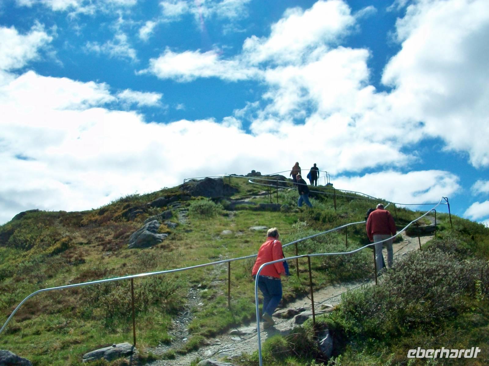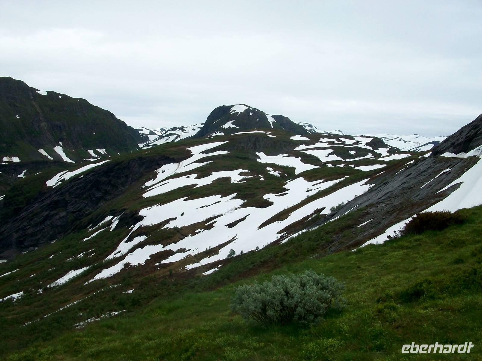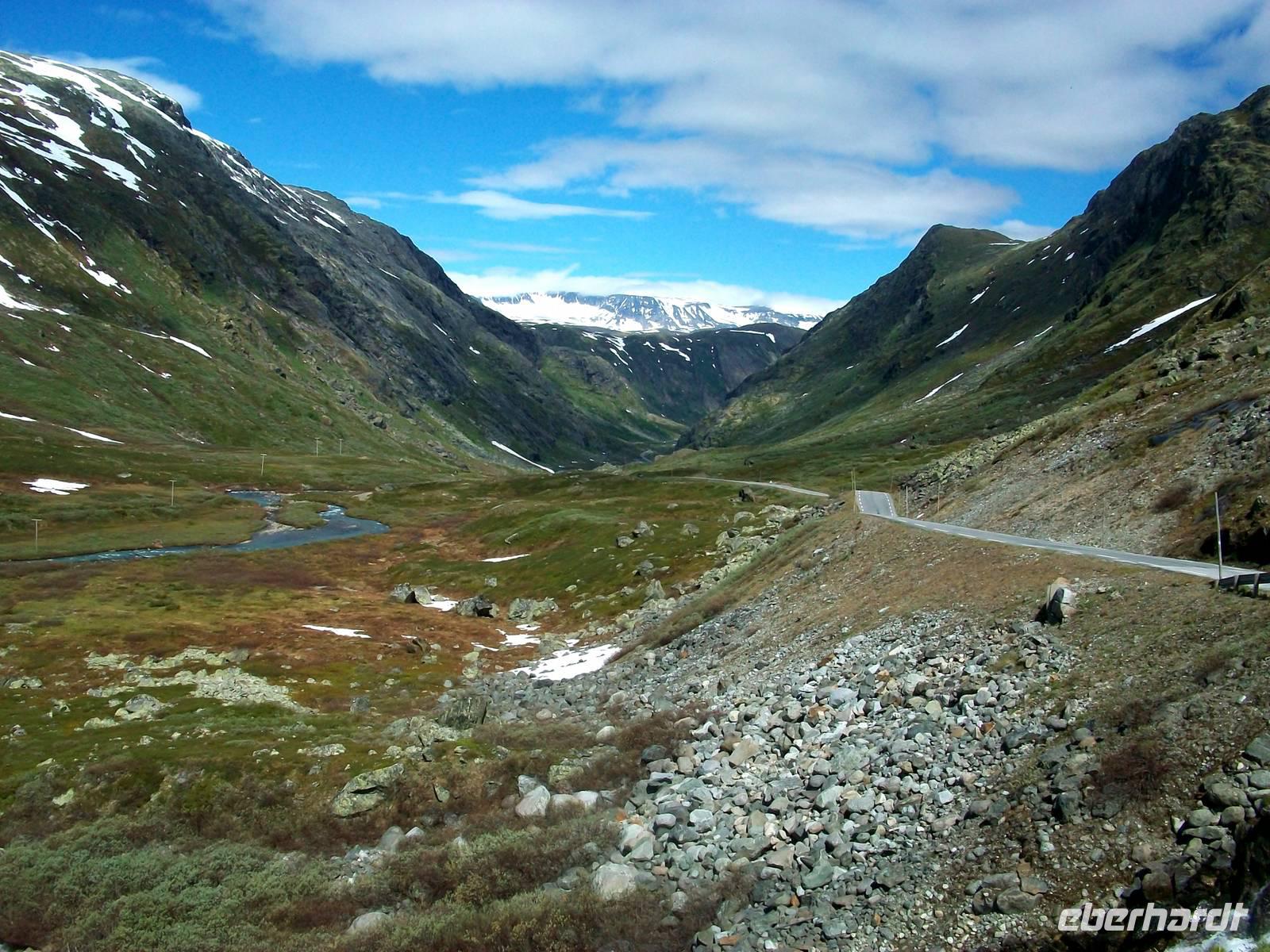 Dann geht es weiter und wir erreichen den Jutonheimen- Nationalpark. Hier entlang der Strecke befinden sich auch die höchsten Erhebungen Skandinaviens. Langsam gewinnen wir an Höhe, die Bäume verschwinden und machen einem tundraartigen Bewuchs Platz. Noch ein wenig höher und wir sind im Winter angelangt; unglaublich, hier sind Mitte Juli gespurte Loipen zu sehen auf denen Skifahrer unterwegs sind!