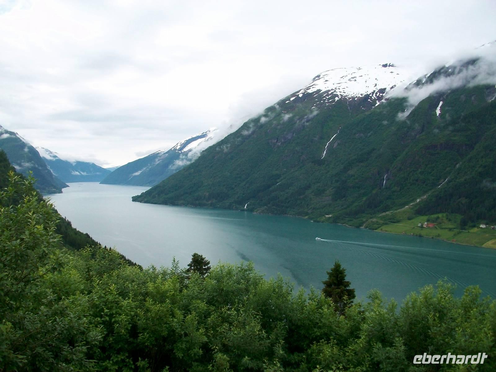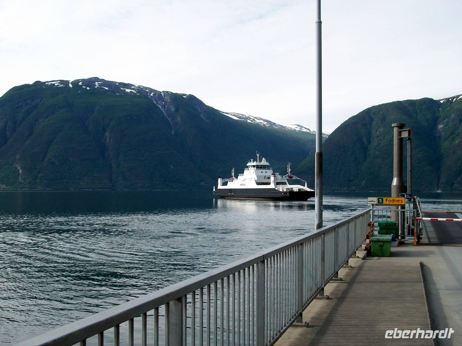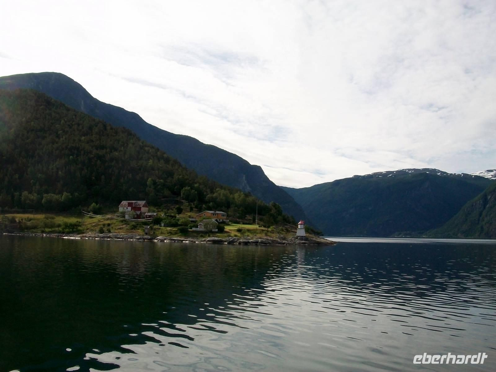 Pünktlich legt das Schiff ab und wir genießen die beschauliche Fahrt entlang der grünen Berge und der tief ins Land einschneidenden Fjorde.