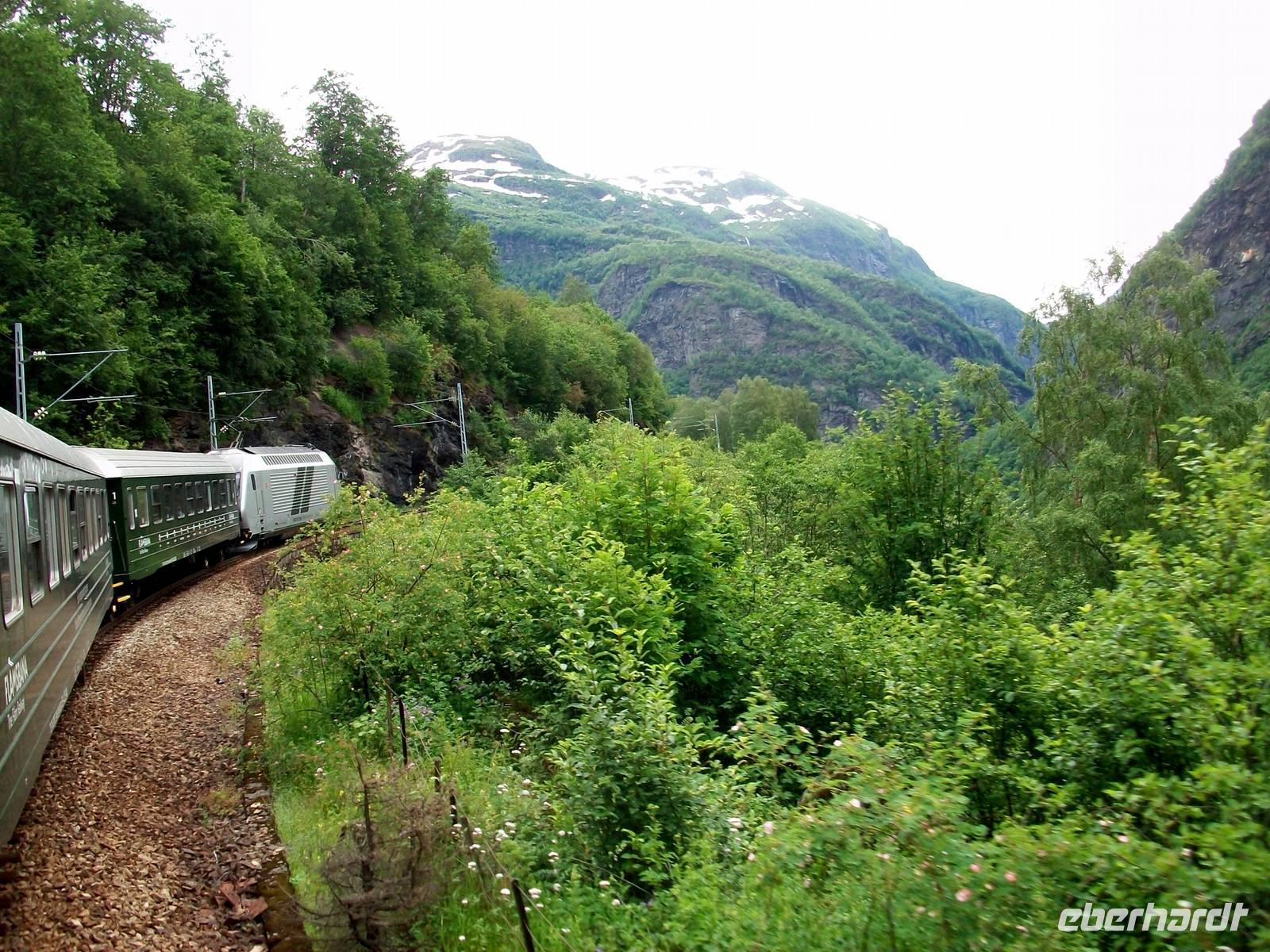 Dann verschwinden wir erst einmal in einem unendlich langen Tunnel der uns mit fast 25 Kilometern dem Ziel rasch näher bringt. Beim Ort Flåm langen wir am Bahnhof an und schauen uns zunächst einmal das schöne Museum an. Dann fährt unser Zug in den Bahnsteig ein und wir gelangen zu den für uns reservierten Plätzen. Ein Pfiff, der Zug ruckt an, und die eindrucksvolle Fahrt beginnt. Sie verläuft zunächst im Tal doch dann gewinnen wir durch Kehrtunnels an Höhe. Am Kjosfossen legen wir einen Stopp ein und unter mystischen Klängen sehen wir dem Tanz der Huldra zu, einem geheimnisvollen Wesen der norwegischen Berge. Der Endpunkt ist dann bei Myrdal erreicht und nach einem kurzen Stopp treten wir die Rückreise nach Flåm an. Noch einmal können wir die schönen Impressionen genießen, die Wasserfälle, den Wildfluss mit den zahlreiche Stromschnellen und die steil von der Bahnstrecke ansteigenden Berge.