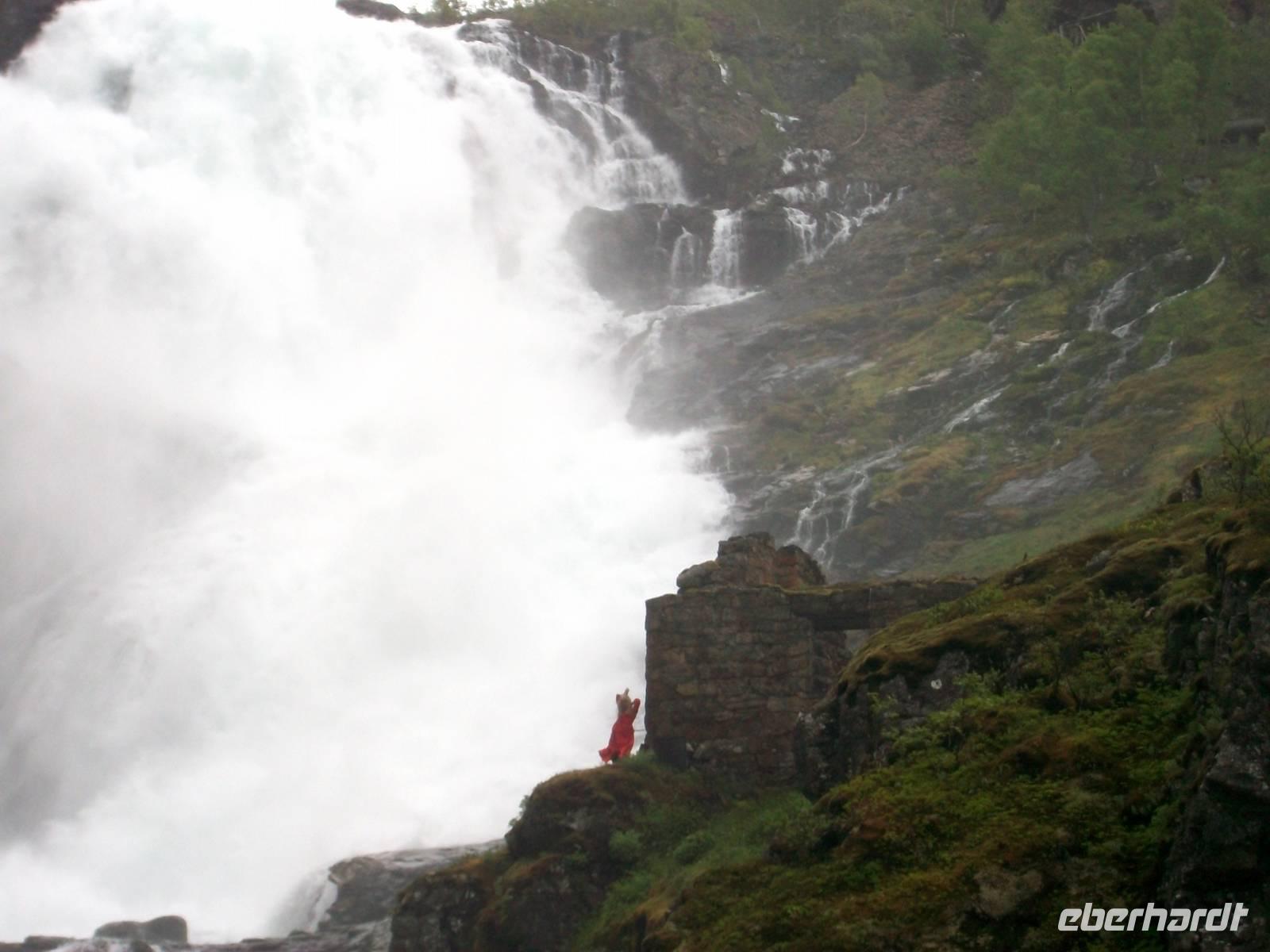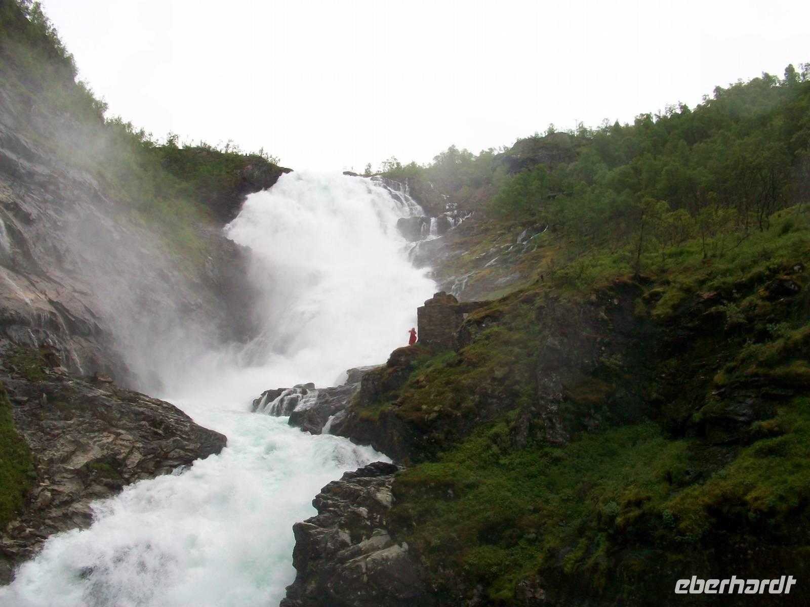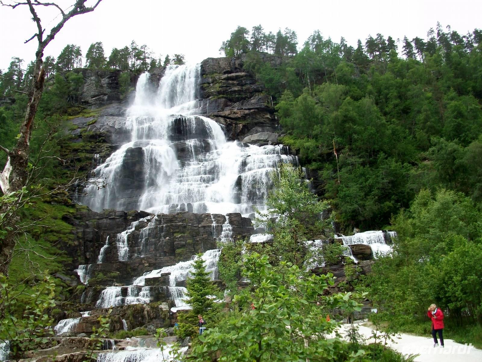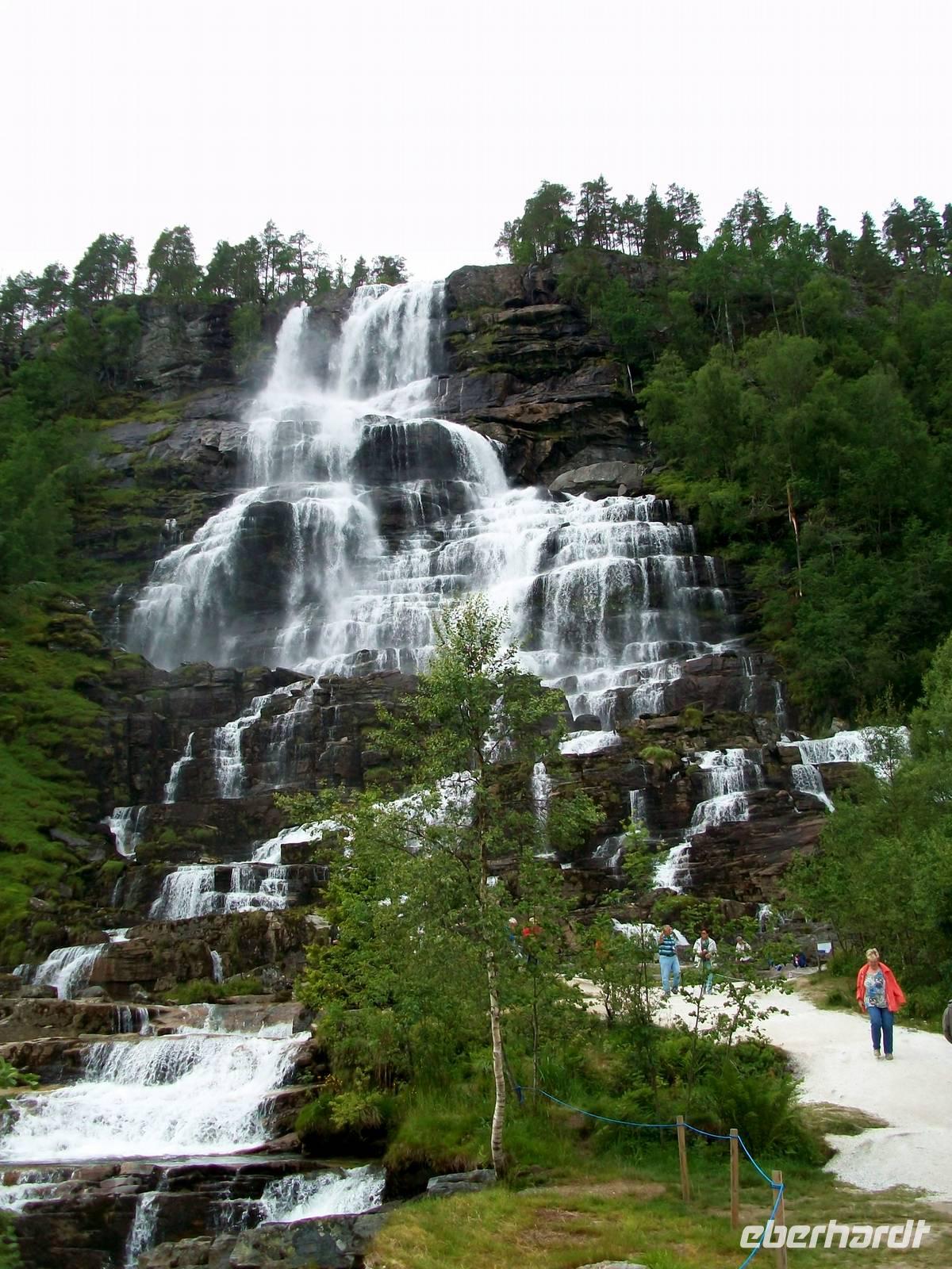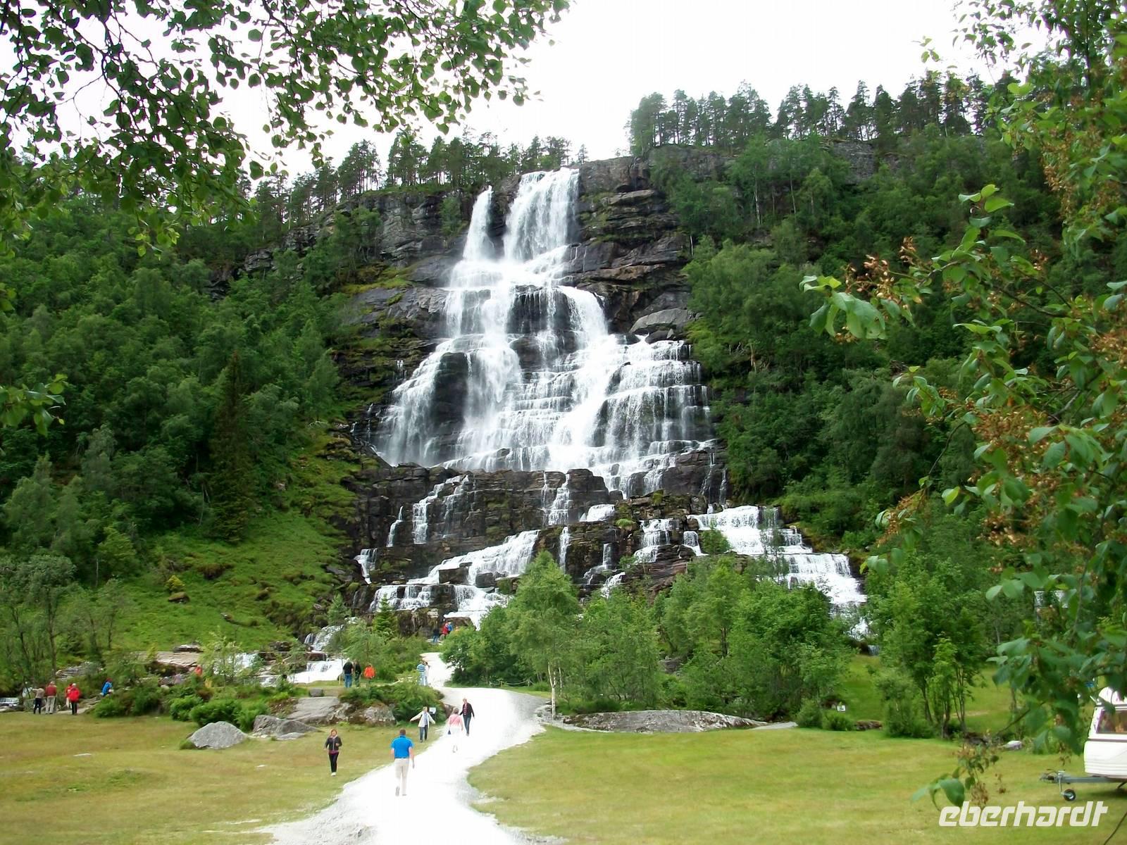 Bald taucht auf unserer rechten Seite ein weiterer beeindruckender Wasserfall auf der in zahlreiche Kaskaden sein Wasser dem Boden zusendet. Es ist der Tvindefossen, ihm spricht man Wunderdinge zu. Selbstverständlich gönnen wir uns diesen Genuss und legen hier einen Stopp ein.