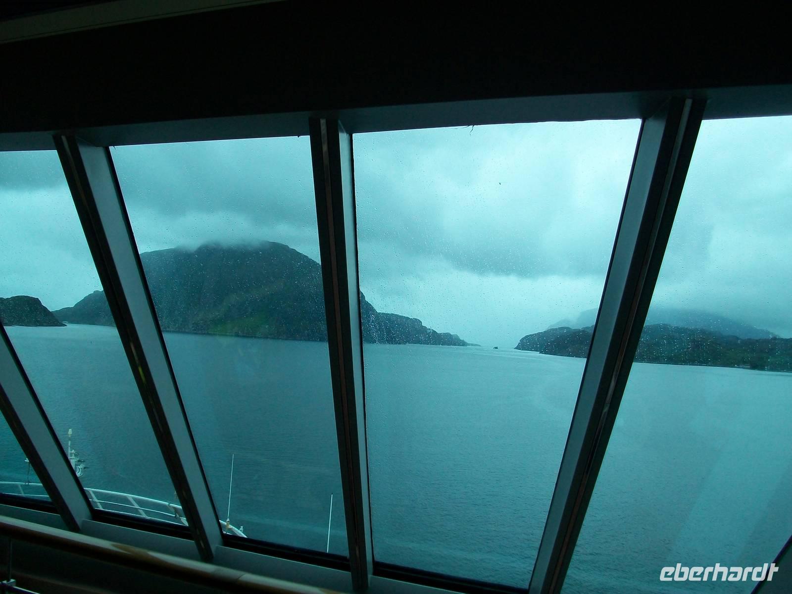 Doch bald sind wir vollständig in den Wolken verschwunden; Nieselregen schlägt an die Fenster und wir sind in einem undurchdringlichen Gebräu unterwegs welches uns vorerst den Blick zur Küste und den Inseln verwehrt.