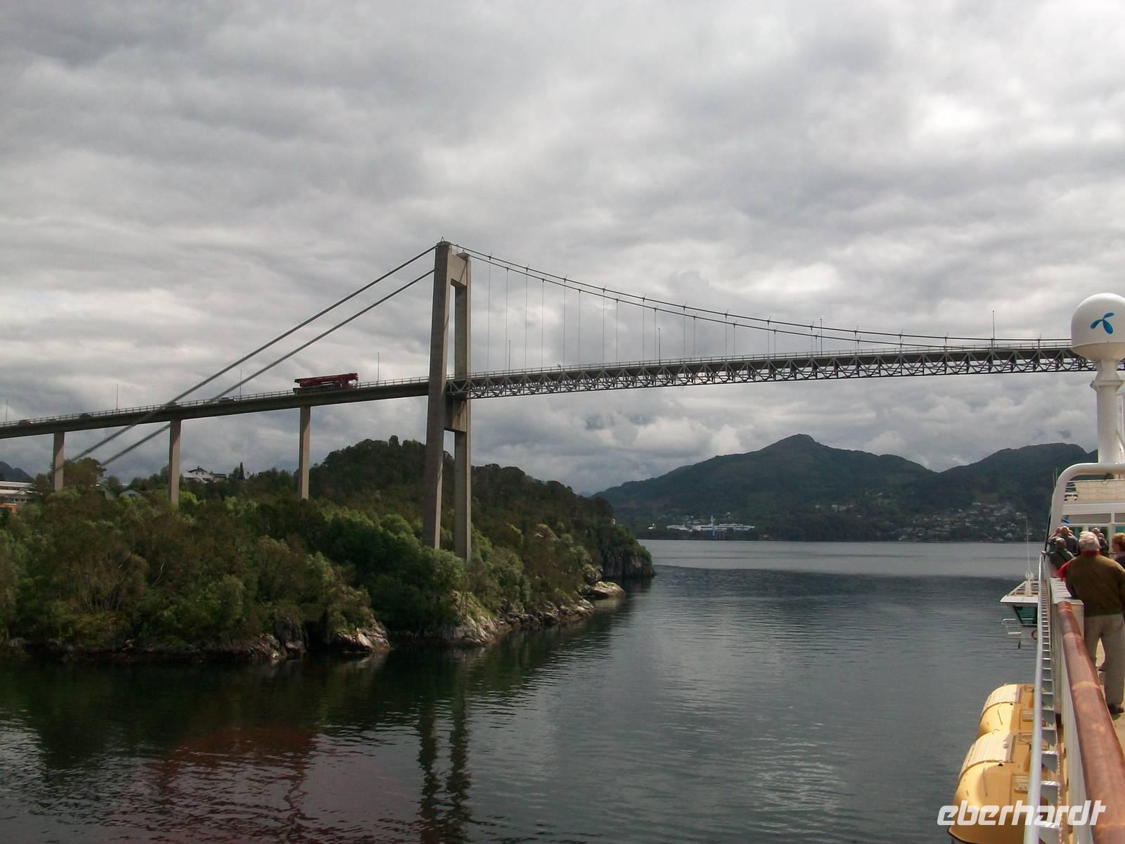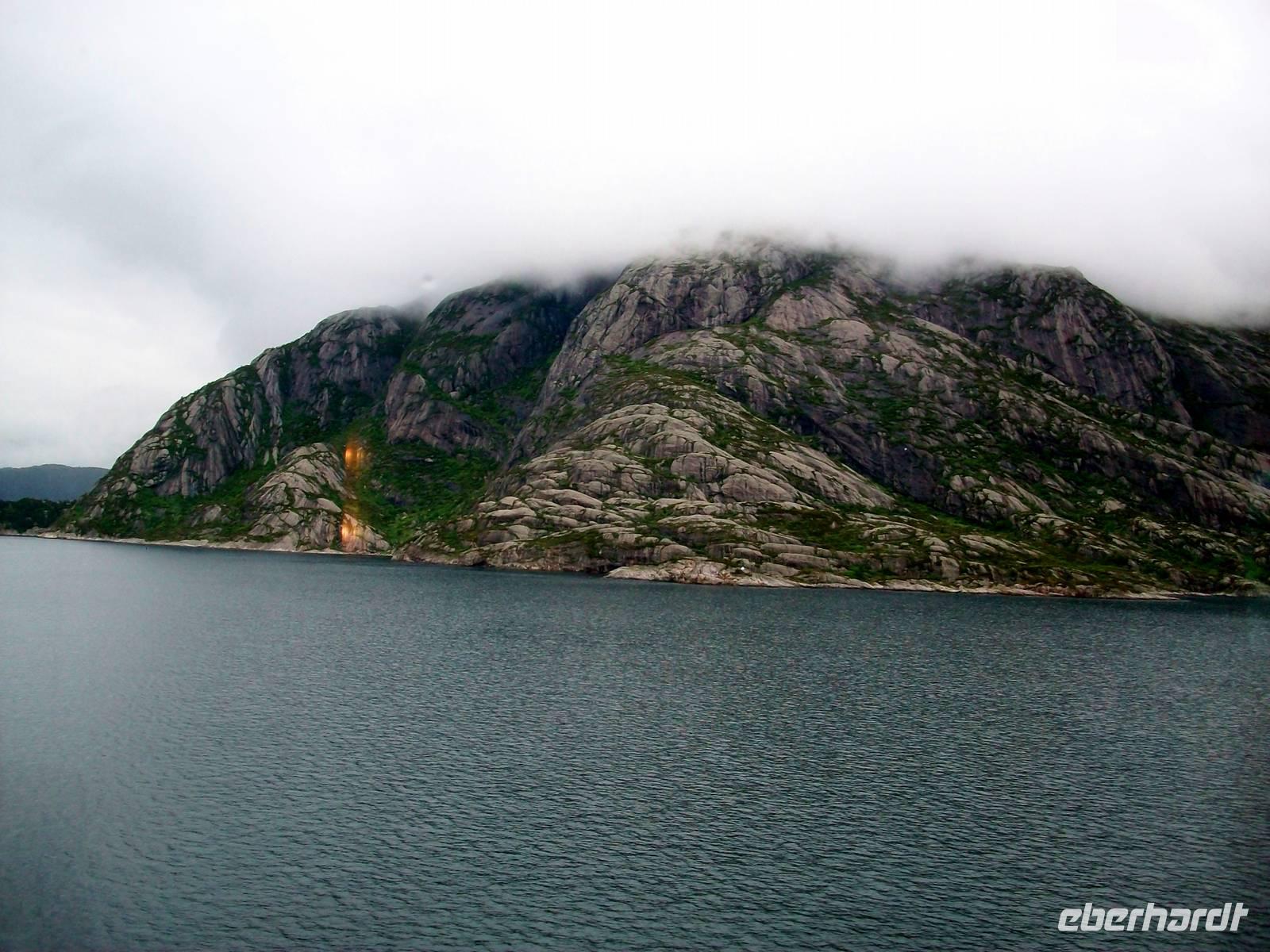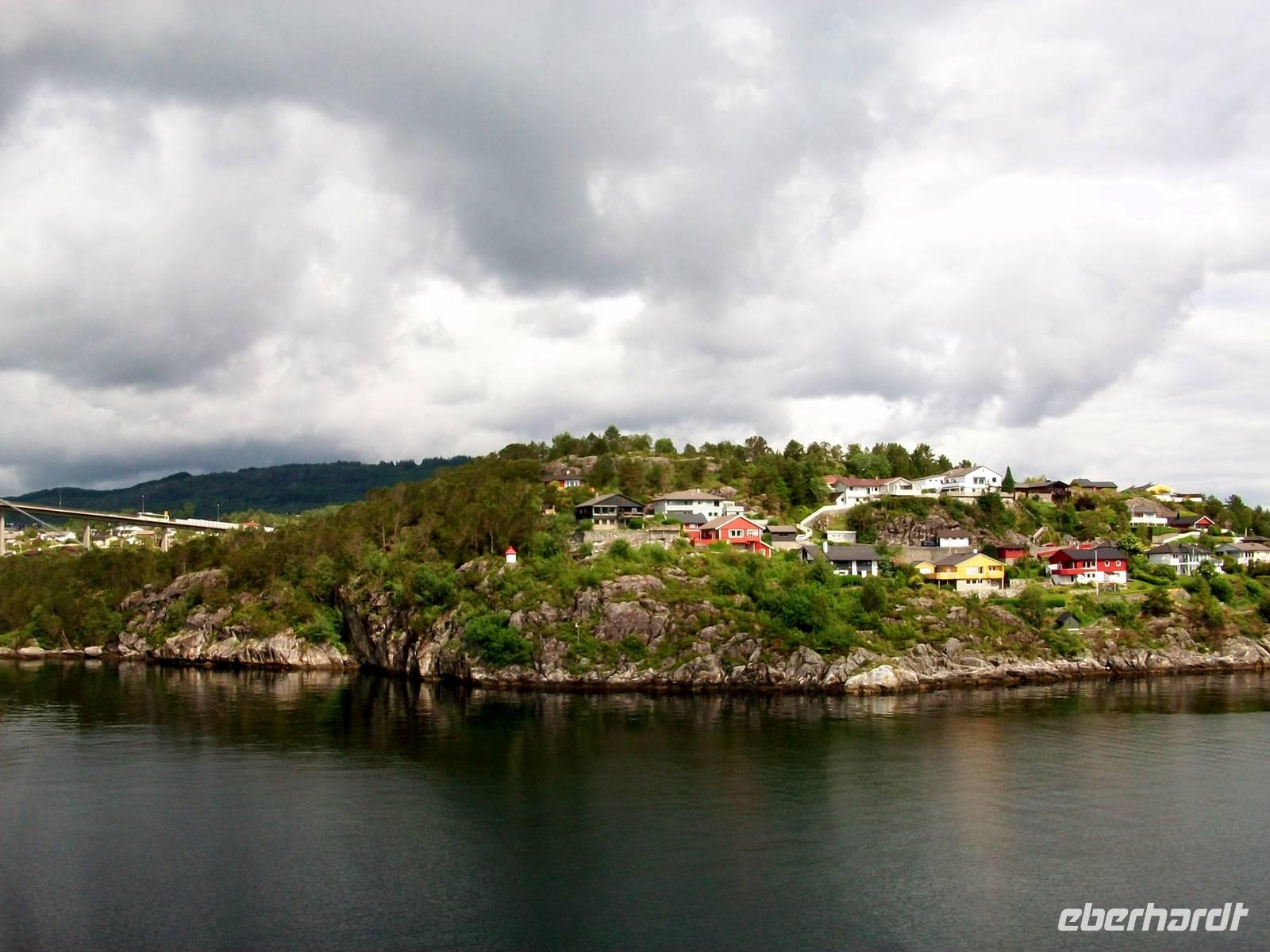 Doch dann wird es wieder hell und von den Panoramafenstern im Oberdeck sehen wir eine schöne Landschaft vorüberziehen. Nur dünnbesiedelt ist die Gegend hier; so manch malerisches aber einsames Haus steht an der Küste oder auf den kleinen Inseln und erfreut unser Auge. Nun kommt auch vorsichtig die Sonne heraus und die Fahrt nach Bergen verläuft fortan angenehm.