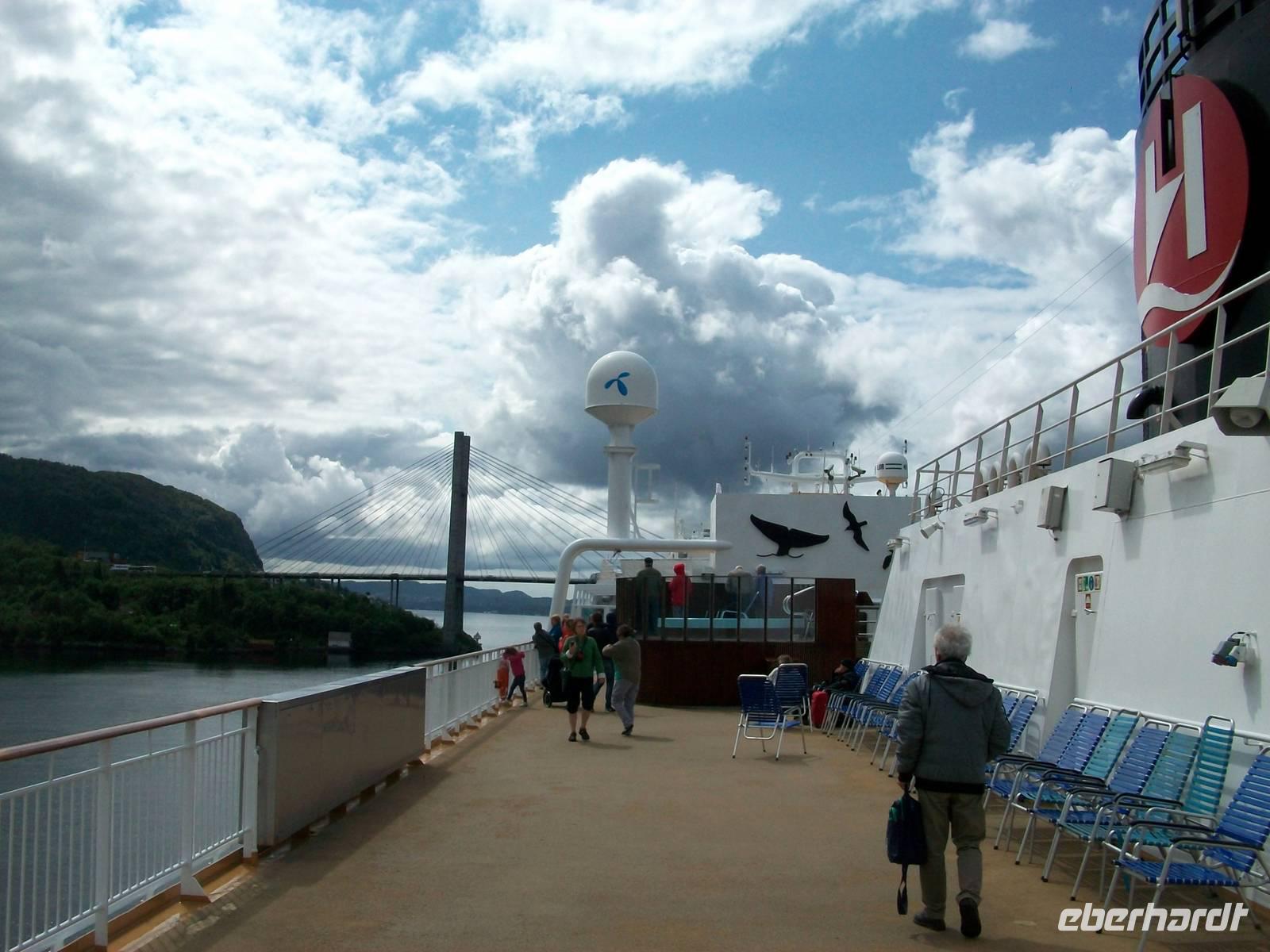Die Taue werden ausgeworfen, die Gangway herausgefahren und bald gelangen wir an Bord dieses schönen Schiffes. Hier ist nun auf den verschiedenen Decks genügend Platz um bei dieser Fahrt entlang der Küste in Ruhe ein weiteres Mal die schönen norwegischen Landschaften zu bewundern.