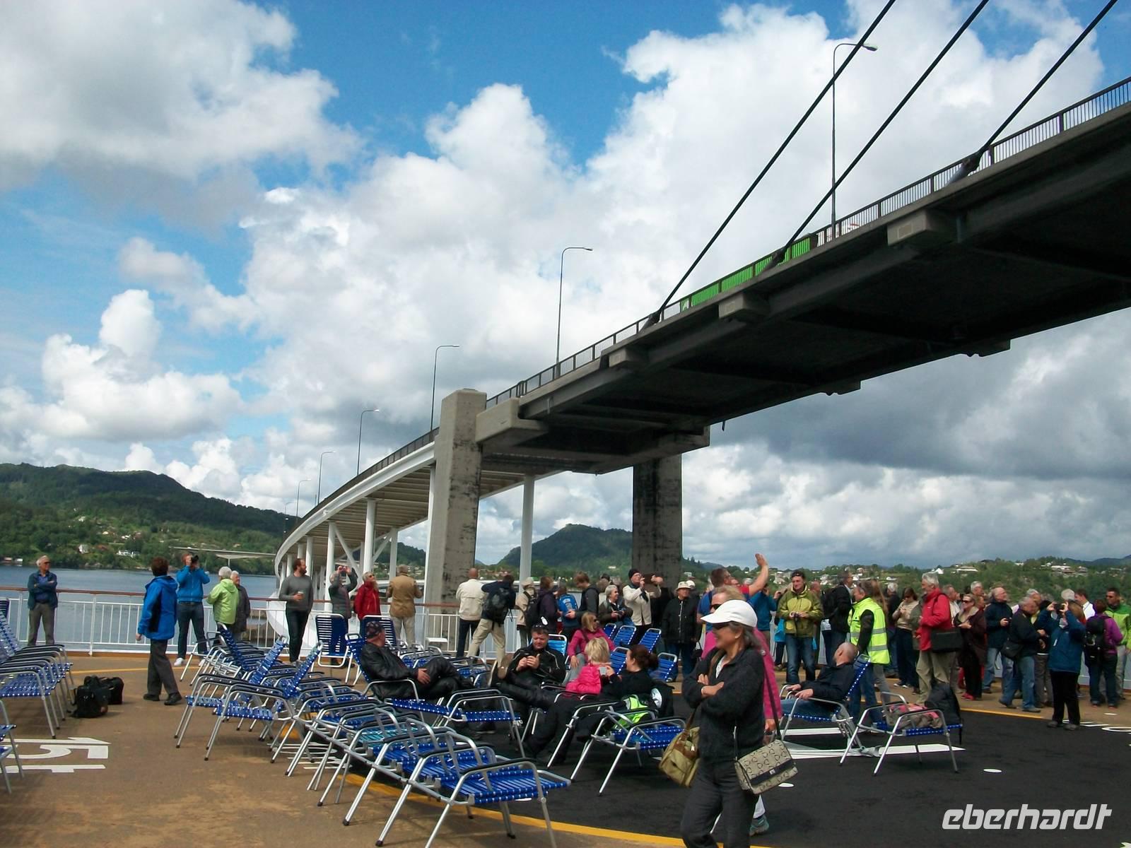 Tief schneidet der Svinesund in das Land ein; wir gelangen mehr als fünfzig Meter über dieser Wasserstraße nach Norwegen und gönnen uns bei angenehmen Temperaturen und Sonnenschein unsere Mittagspause.