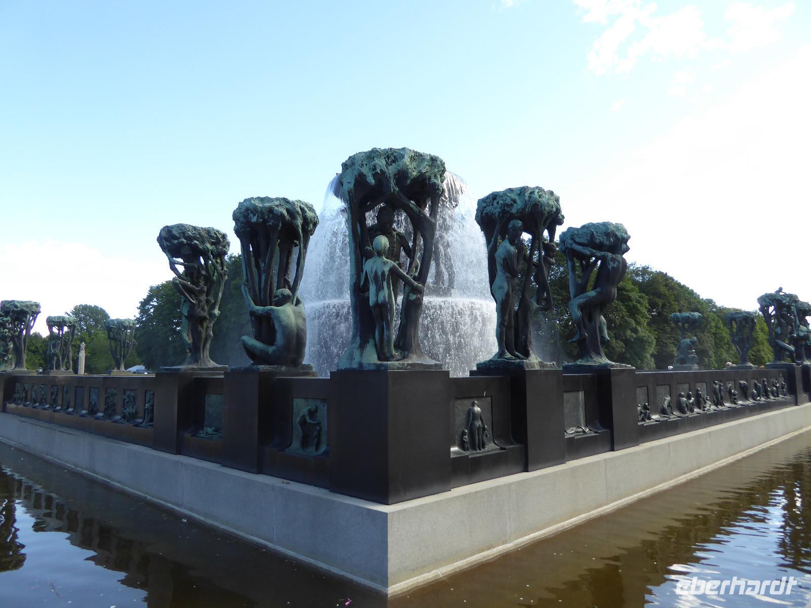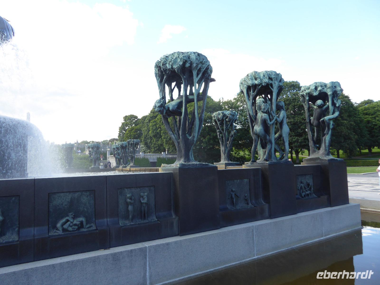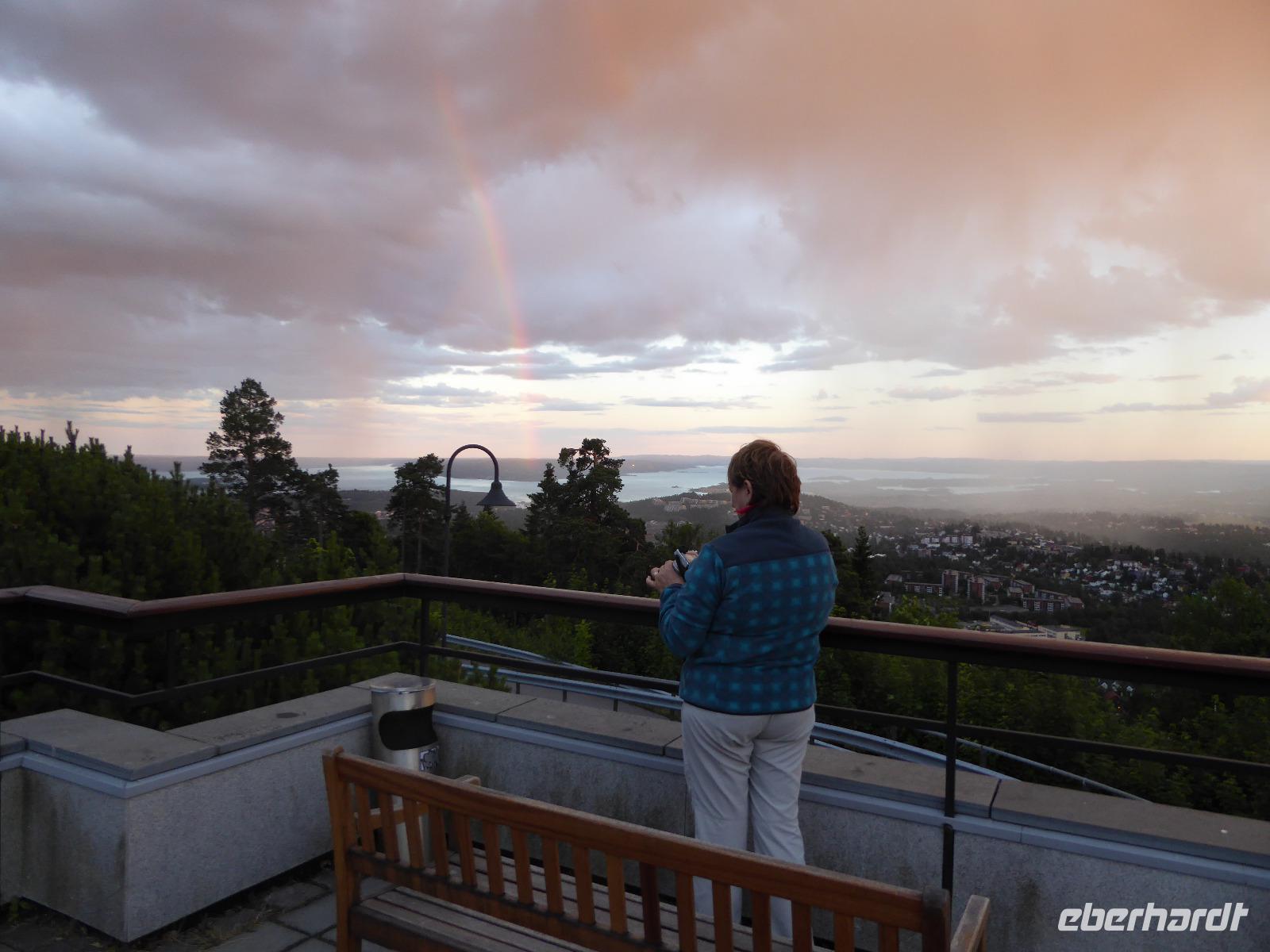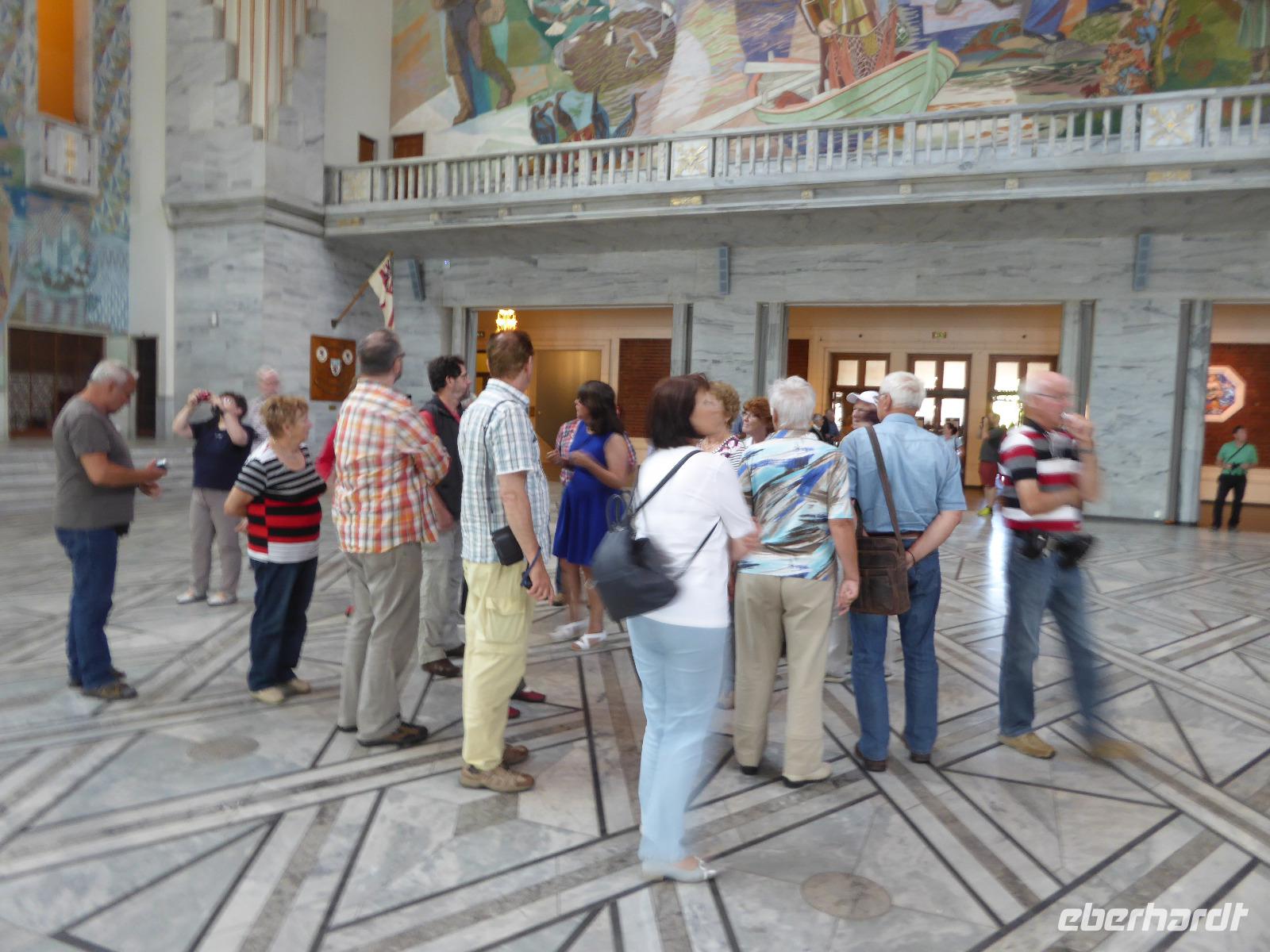 Nach dem Genuss eines üppigen Frühstücksbuffets, legt unser Schiff - die Stena Line Germanica - um 9.15 Uhr in Göteborg an. Wir checken aus und stehen schon an unserem Bus - Lutz war schneller als wir. Über Haby, wo wir einen Stopp einlegen, fahren wir bis zur Svinesundbrücke. In Halden trinken wir Kaffee und verspeisen unsere Würstchen. Gegen 14 Uhr kommen wir in Oslo an. Hier warten noch zwei Gäste und eine Stadtführerin auf uns. Bei unserer Rundfahrt durch Oslo sehen wir, wie die Stadt quasi neu entsteht, überall wird gebaut. Am Rathaus steigen wir aus und besichtigen viele Räume. Die wunderschönen Wandbilder sind beeindruckend. Alle erzählen von der norwegischen Geschichte. Anschließend kommen wir am Königspalast vorbei. Unser nächster Halt findet am Vigeland-Park statt. Faszinierend, was ein einzelner Bildhauer so veranlassen kann. Lebensechte Figuren lassen den Kreislauf von Geburt bis zum Tod emotional nachempfinden. Liebevoll betrachten wir das berühmte Trotzköpfchen. Die Stadtrundfahrt ist beendet, wir fahren zum Holmenkollen. Hier gönnen wir uns eine halbe Stunde Fotopause, die Aussicht auf den Oslofjord ist großartig. Um 18 Uhr checken wir im Scandic Holmenkollen Park Hotel ein. Nach ersten Irritationen haben alle ihre schönen Zimmer gefunden. Zum Abendessen bedienen wir uns am Buffet (Bier und Wein kosten jeweils 9,80 €). Es ist noch hell, trotzdem ist der Tag schon vorbei.