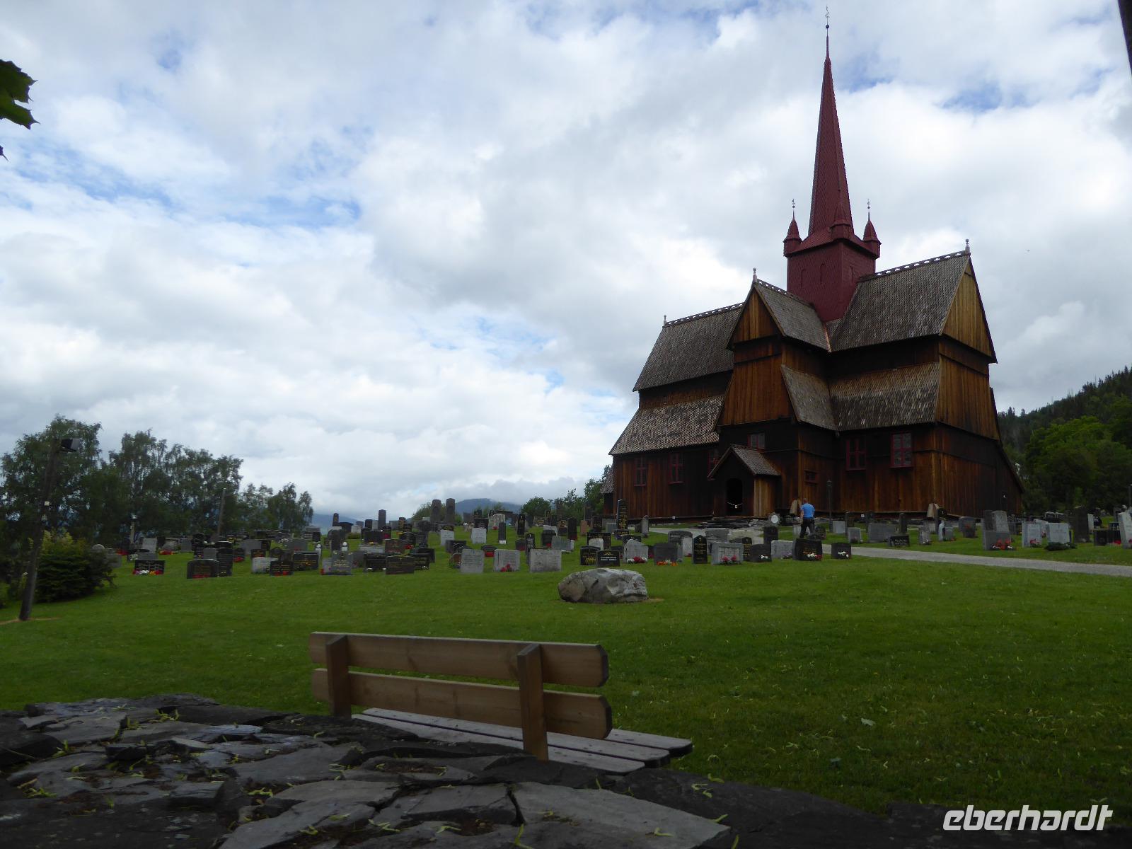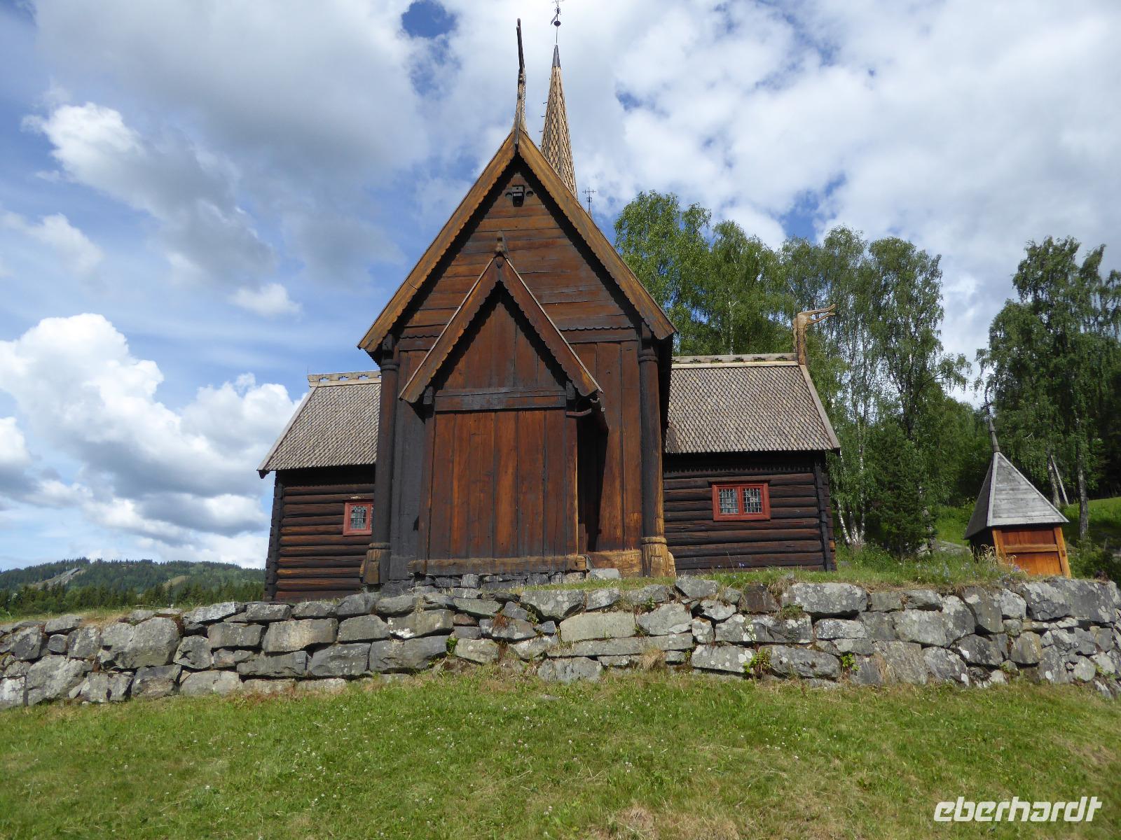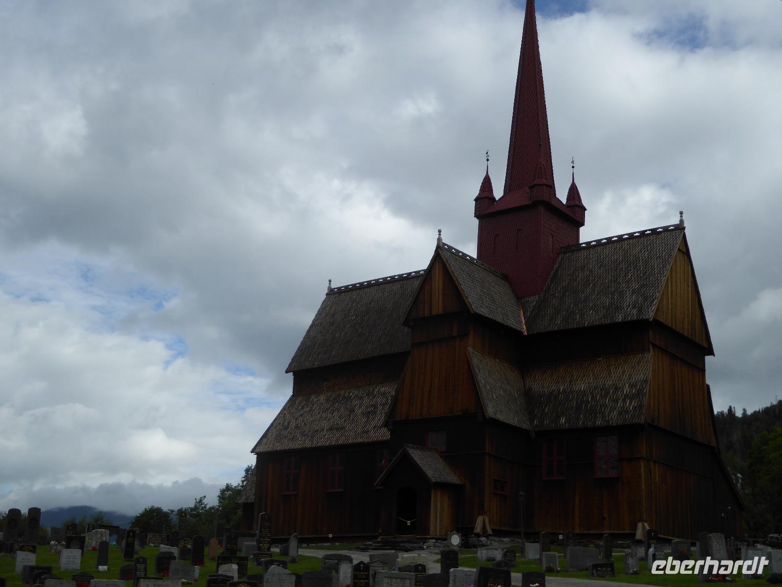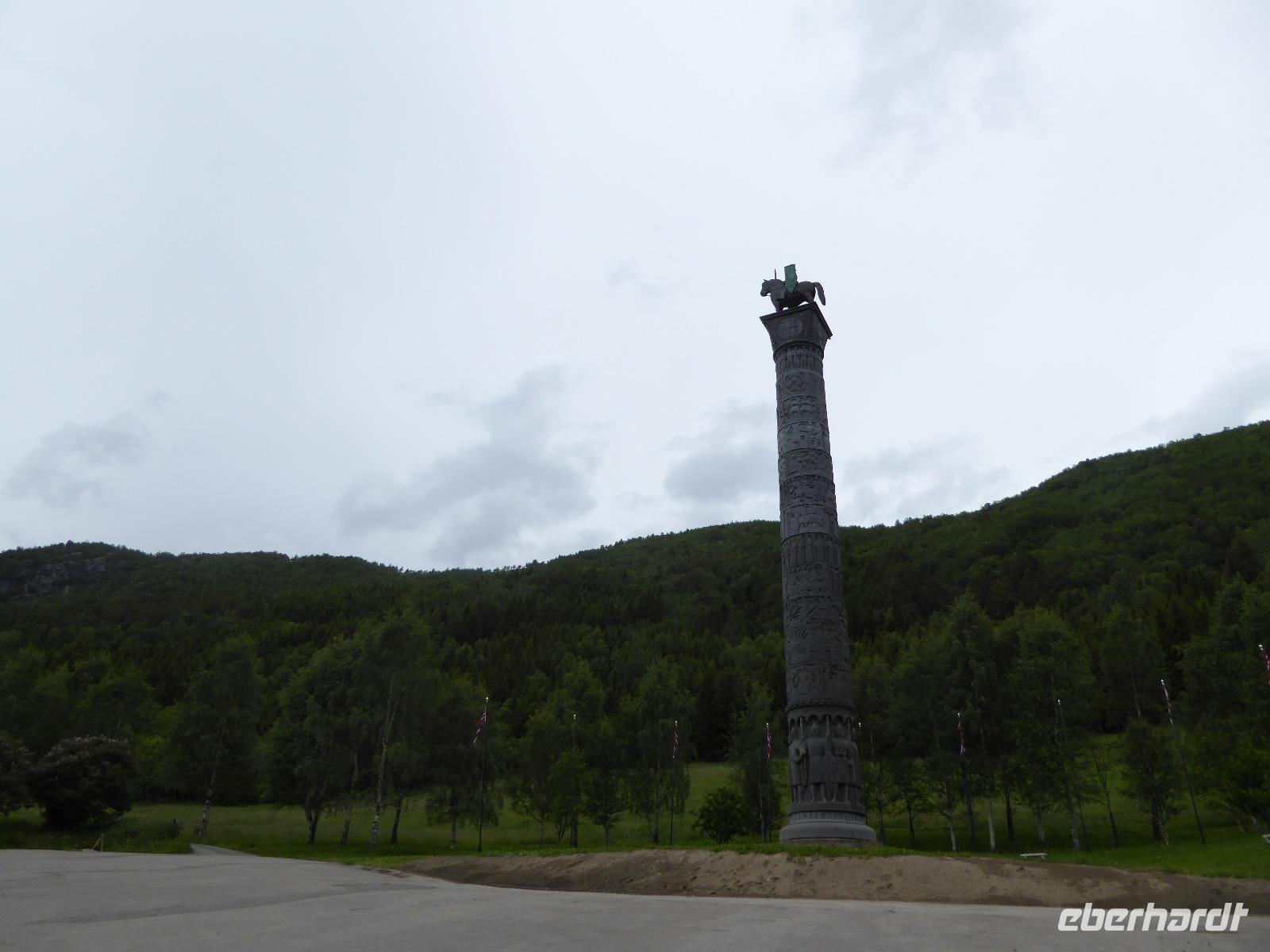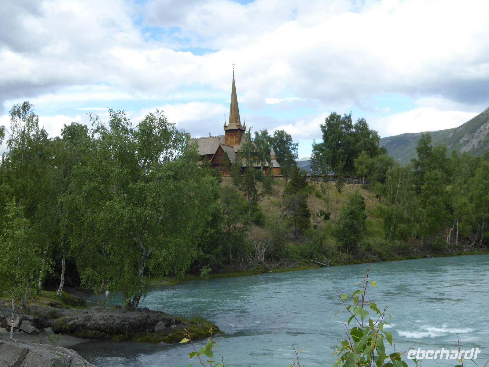 Zweihundertdreißig Kilometer lang ist das Gudbrandsdal, das wir heute durchfahren. Wir starten in Oyer, nördlich von Lillehammer, wo wir übernachtet haben. Traumhaft ist die Landschaft, die das Gudbrandsdal prägt. Im satten Grün leuchten die Hänge, azurblau leuchtet der Fluss, wenn er nicht gerade vor Freude überschäumt. An einigen Stellen bilden sich reißende Strudel. Bald schon haben wir Ringebu erreicht. Eine einheimische Reiseleiterin berichtete uns, dass sich die Kirche in Restaurierung befindet und nicht zu besuchen ist. Trotzdem biegen wir auf den schmalen aufwärts führenden Weg ab, um uns mit eigenen Augen zu überzeugen, dass dem so ist. Und siehe da - die Kirche ist gar nicht abgehängt. Dennoch können wir sie nur von außen besichtigen, da sie wegen einer Amtshandlung geschlossen ist. Just in dem Augenblick, als wir kommen, wird dieses Hinweisschild aufgehängt („Wegen Amtshandlung geschlossen"). Wir vermuten, dass es sich um eine Beerdigung handelt, da ein schwarzer PKW mit einem weißen Kreuz auf dem Dach in das Kirchengelände fuhr. Respektvoll ziehen wir uns zurück. Weiter geht unsere Fahrt durch das romantische Gudbrandsdal. Bei Vinstra wird das Tal enger, die Berge scheinen über unseren Köpfen zusammen zu stoßen. Kein Wunder, dass hier die Geschichte von Peer Gynt entstanden ist. In Otta verlassen wir die E6 und fahren Richtung Südwesten weiter auf der Straße 55. Diese schlängelt sich auf das Sognefjell. Die Aussicht wird immer spektakulärer. Wo es sich anbietet, halten wir zu ausgiebigen Fotostopps. Mittags kommen wir in Lom an. Hier ist eine achthundert Jahre alte Stabkirche zu bewundern. Wir nehmen uns genügend Zeit für jede Menge Fotos. Vor der Kirche ist ein Rasensprenger an. Es macht Spaß, dabei zuzuschauen, wie Touris aller Welt versuchen, das beste Foto zu machen und alles rund um sich ausblenden. Bis der Rasensprenger sie erwischt.(Ach ja, Schadenfreude schönste Freude - ist ja nicht böse gemeint, war nur Wasser und warm wars auch ). Ein paar Kilometer weiter, in Eleveseter, am gleichnamigen Hotel, befindet sich eine 33 Meter hohe Säule - die Sagasäule, die einen Querschnitt der norwegischen Geschichte darstellt und die selbst eine sagenumwobene Geschichte umgibt. Leider ist das Parken hier so ungünstig, dass wir nicht genügend Zeit haben, die Säule in aller Ruhe zu studieren. Wir müssen schnell wieder in den Bus schlüpfen, denn der steht definitiv im Weg. Wir fahren weiter über das Sognefjell, immer höher hinauf. Bald schon sind wir über der Baumgrenze und fahren durch eine schneebedeckte hochalpine Landschaft. Am späten Nachmittag erreichen wir Leikanger, unser heutiges Ziel.