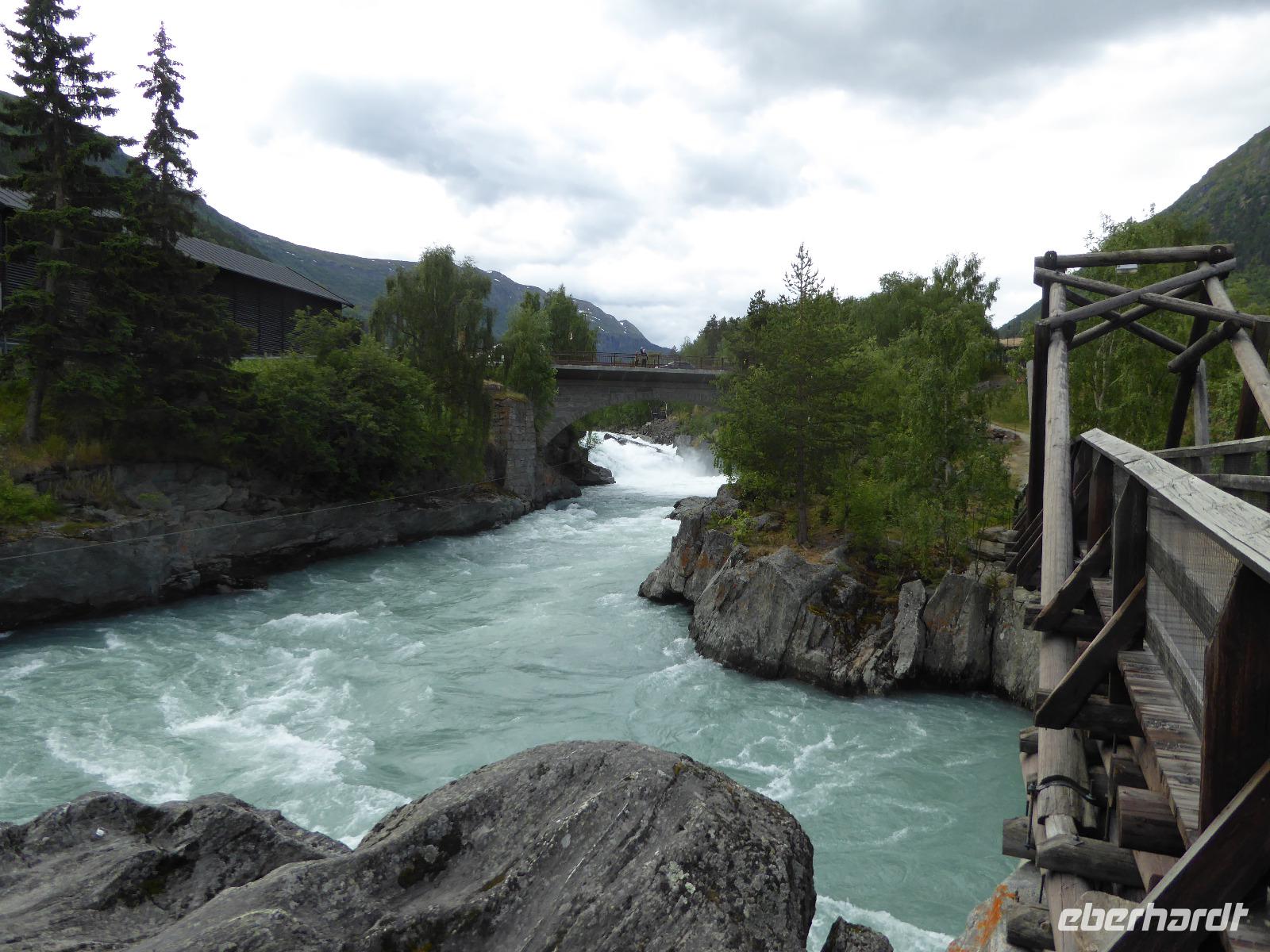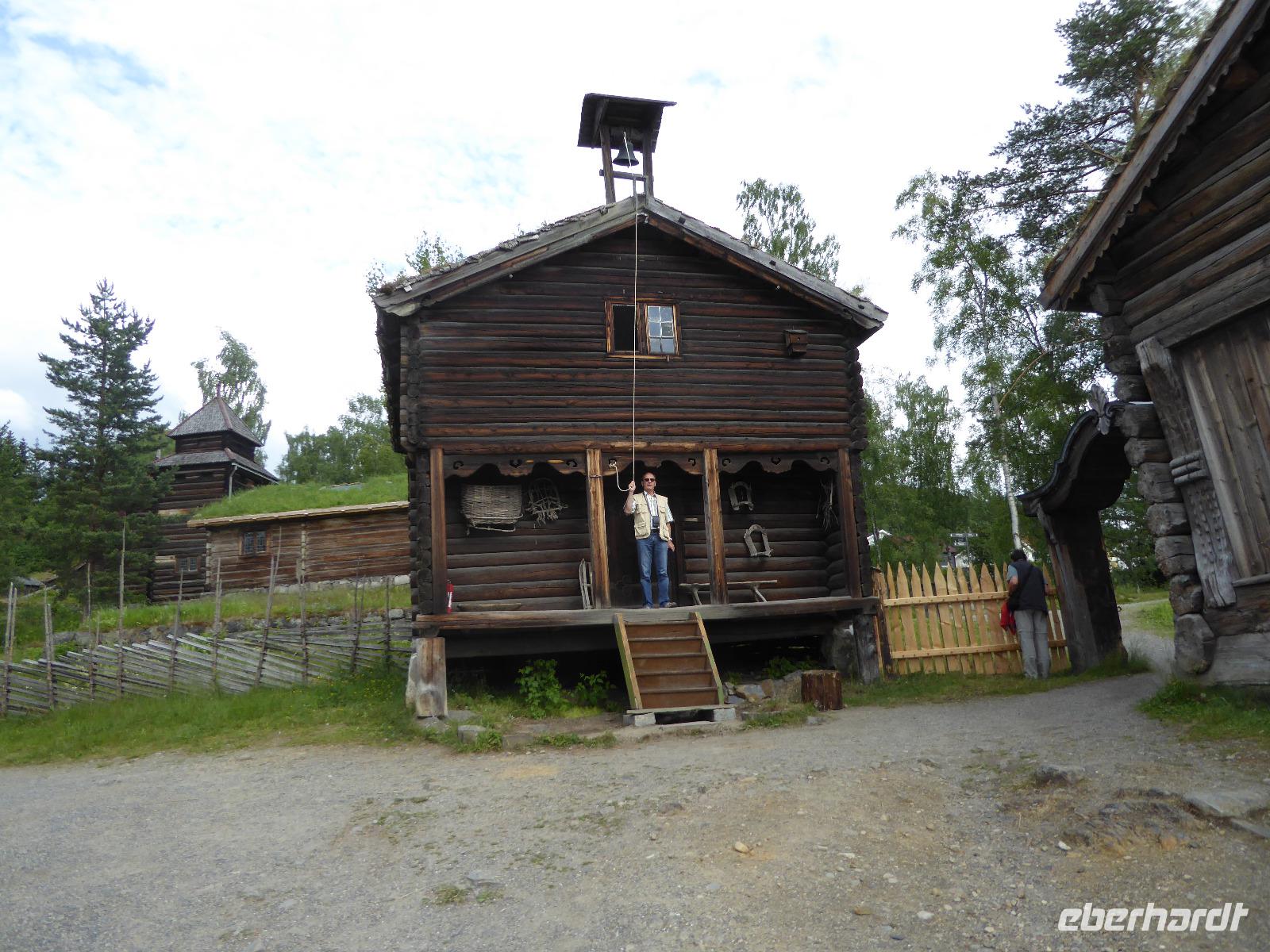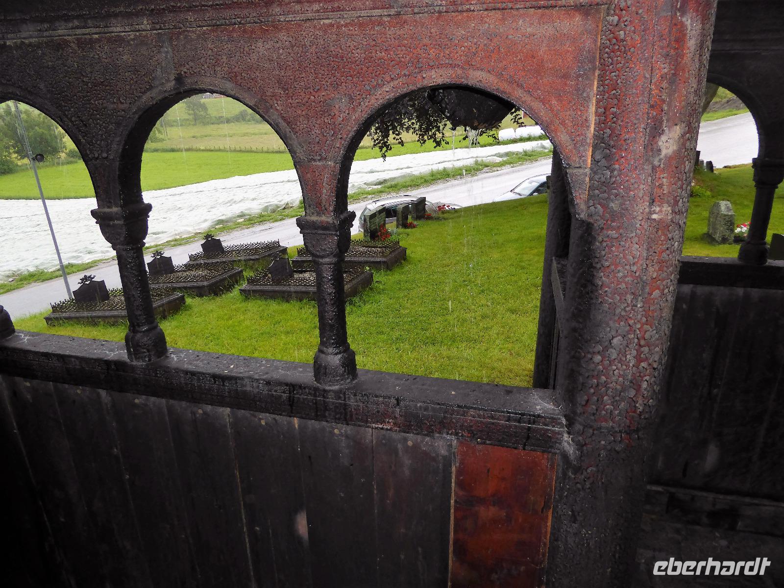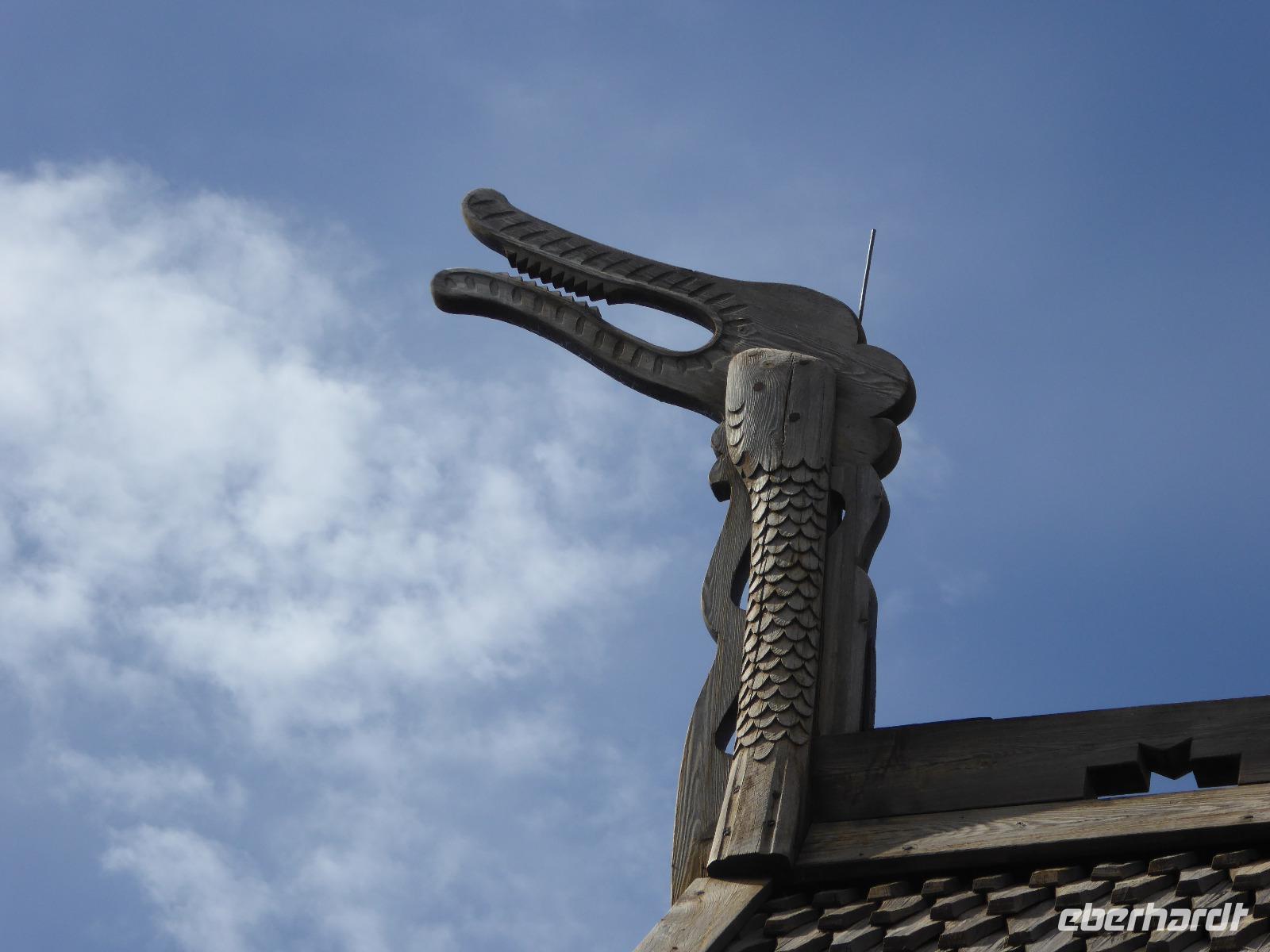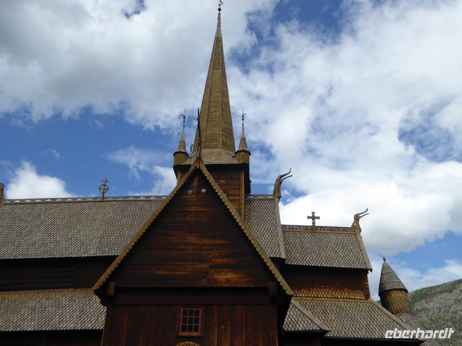 Zweihundertdreißig Kilometer lang ist das Gudbrandsdal, das wir heute durchfahren. Wir starten in Oyer, nördlich von Lillehammer, wo wir übernachtet haben. Traumhaft ist die Landschaft, die das Gudbrandsdal prägt. Im satten Grün leuchten die Hänge, azurblau leuchtet der Fluss, wenn er nicht gerade vor Freude überschäumt. An einigen Stellen bilden sich reißende Strudel. Bald schon haben wir Ringebu erreicht. Eine einheimische Reiseleiterin berichtete uns, dass sich die Kirche in Restaurierung befindet und nicht zu besuchen ist. Trotzdem biegen wir auf den schmalen aufwärts führenden Weg ab, um uns mit eigenen Augen zu überzeugen, dass dem so ist. Und siehe da - die Kirche ist gar nicht abgehängt. Dennoch können wir sie nur von außen besichtigen, da sie wegen einer Amtshandlung geschlossen ist. Just in dem Augenblick, als wir kommen, wird dieses Hinweisschild aufgehängt („Wegen Amtshandlung geschlossen"). Wir vermuten, dass es sich um eine Beerdigung handelt, da ein schwarzer PKW mit einem weißen Kreuz auf dem Dach in das Kirchengelände fuhr. Respektvoll ziehen wir uns zurück. Weiter geht unsere Fahrt durch das romantische Gudbrandsdal. Bei Vinstra wird das Tal enger, die Berge scheinen über unseren Köpfen zusammen zu stoßen. Kein Wunder, dass hier die Geschichte von Peer Gynt entstanden ist. In Otta verlassen wir die E6 und fahren Richtung Südwesten weiter auf der Straße 55. Diese schlängelt sich auf das Sognefjell. Die Aussicht wird immer spektakulärer. Wo es sich anbietet, halten wir zu ausgiebigen Fotostopps. Mittags kommen wir in Lom an. Hier ist eine achthundert Jahre alte Stabkirche zu bewundern. Wir nehmen uns genügend Zeit für jede Menge Fotos. Vor der Kirche ist ein Rasensprenger an. Es macht Spaß, dabei zuzuschauen, wie Touris aller Welt versuchen, das beste Foto zu machen und alles rund um sich ausblenden. Bis der Rasensprenger sie erwischt.(Ach ja, Schadenfreude schönste Freude - ist ja nicht böse gemeint, war nur Wasser und warm wars auch ). Ein paar Kilometer weiter, in Eleveseter, am gleichnamigen Hotel, befindet sich eine 33 Meter hohe Säule - die Sagasäule, die einen Querschnitt der norwegischen Geschichte darstellt und die selbst eine sagenumwobene Geschichte umgibt. Leider ist das Parken hier so ungünstig, dass wir nicht genügend Zeit haben, die Säule in aller Ruhe zu studieren. Wir müssen schnell wieder in den Bus schlüpfen, denn der steht definitiv im Weg. Wir fahren weiter über das Sognefjell, immer höher hinauf. Bald schon sind wir über der Baumgrenze und fahren durch eine schneebedeckte hochalpine Landschaft. Am späten Nachmittag erreichen wir Leikanger, unser heutiges Ziel.